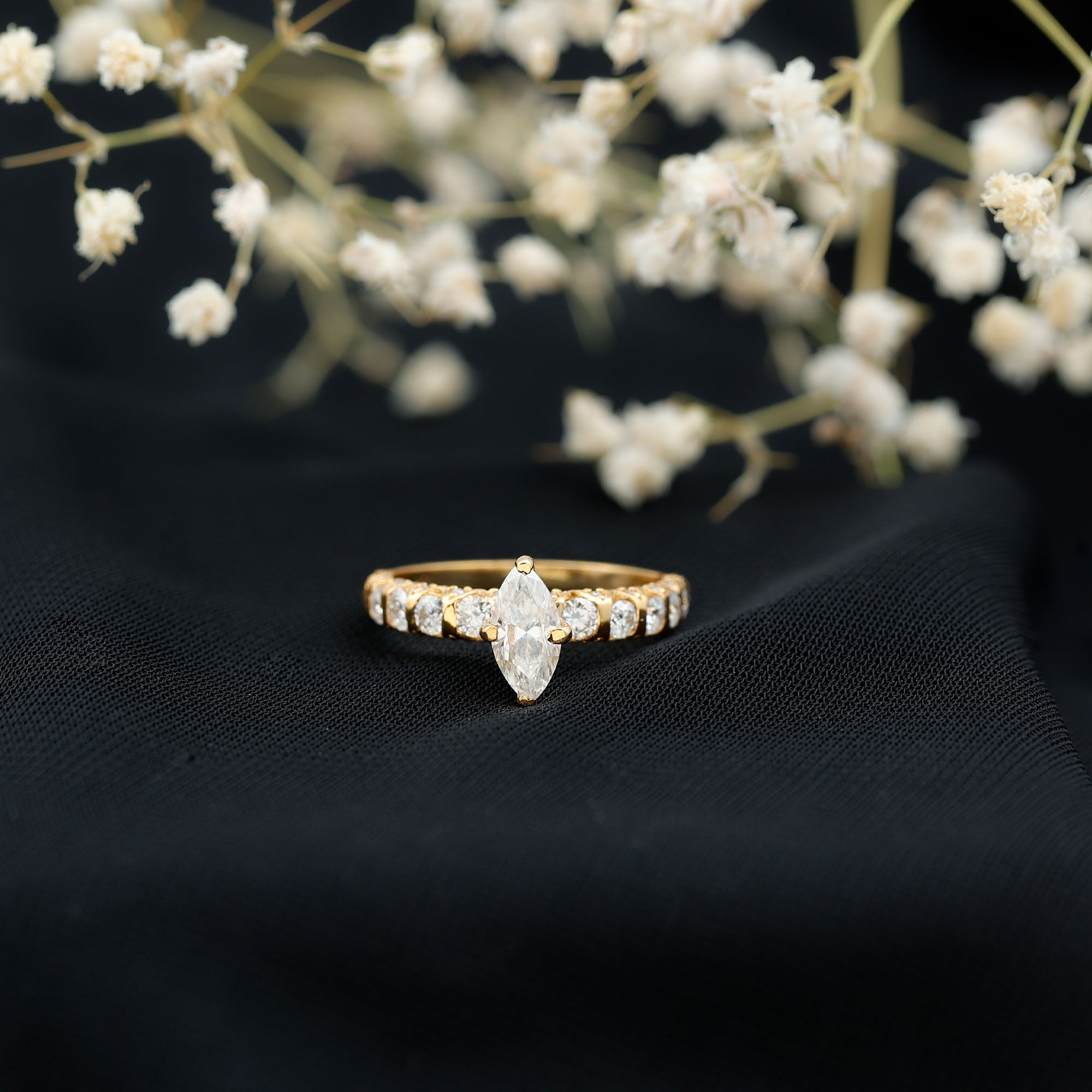 A Moissanite Solitaire Engagement Ring is defined by a Sparkling Centerpiece of Moissanite that is meant to stand out all solo (with an enormous size of 6 MM or more). While it may be the most classic and timeless token of love for any bride-to-be, it also speaks to many senses of style. A Round or Oval Moissanite Engagement Ring resonates with an understated and conventional aesthetic, while one fashioned with a Pear, Marquise, or Princess Cut Moissanite is more on the fancier side of the spectrum. On the other hand, if you wish for a grand yet old-school emblem of love, there is nothing better than an Asscher, Emerald, or Cushion Cut Moissanite.