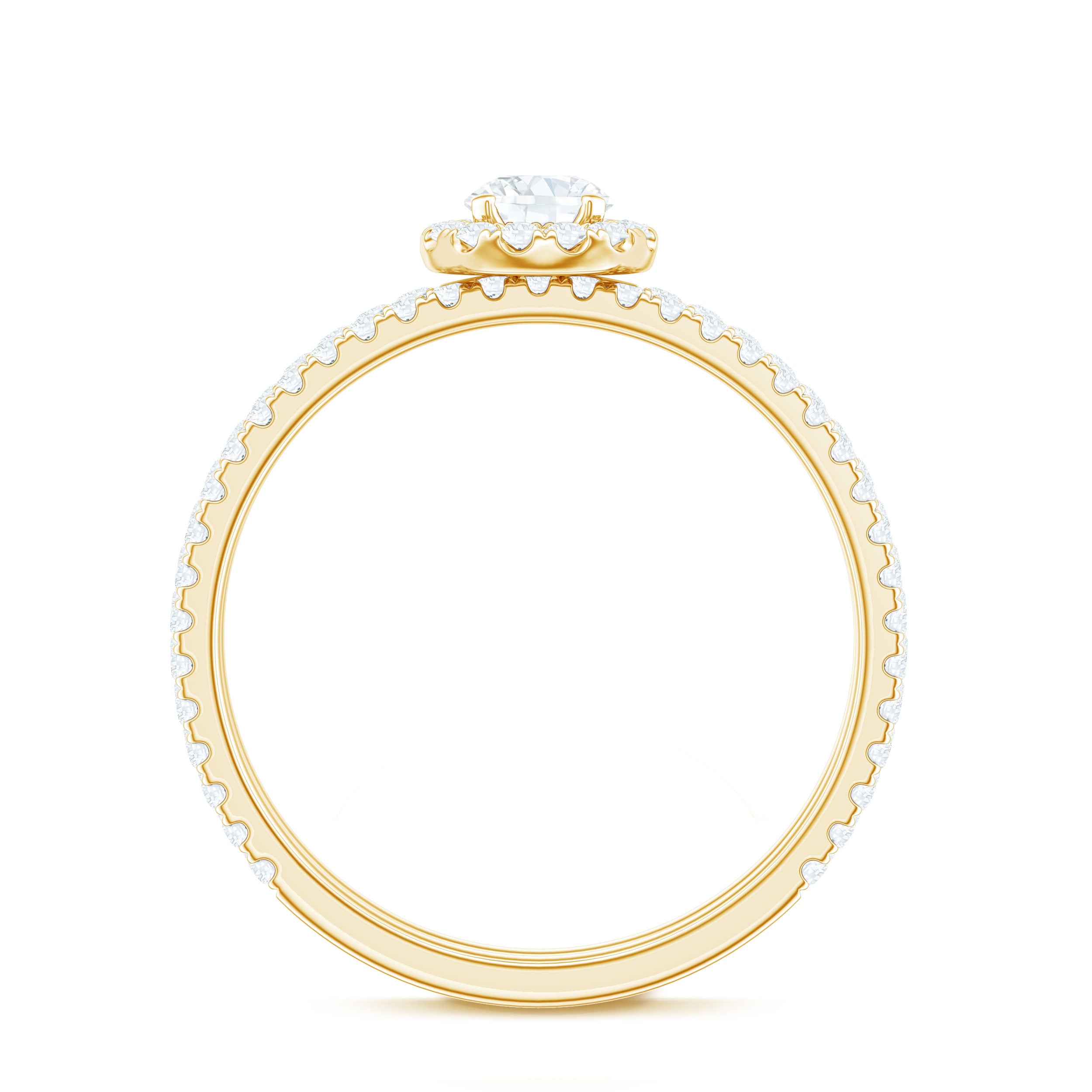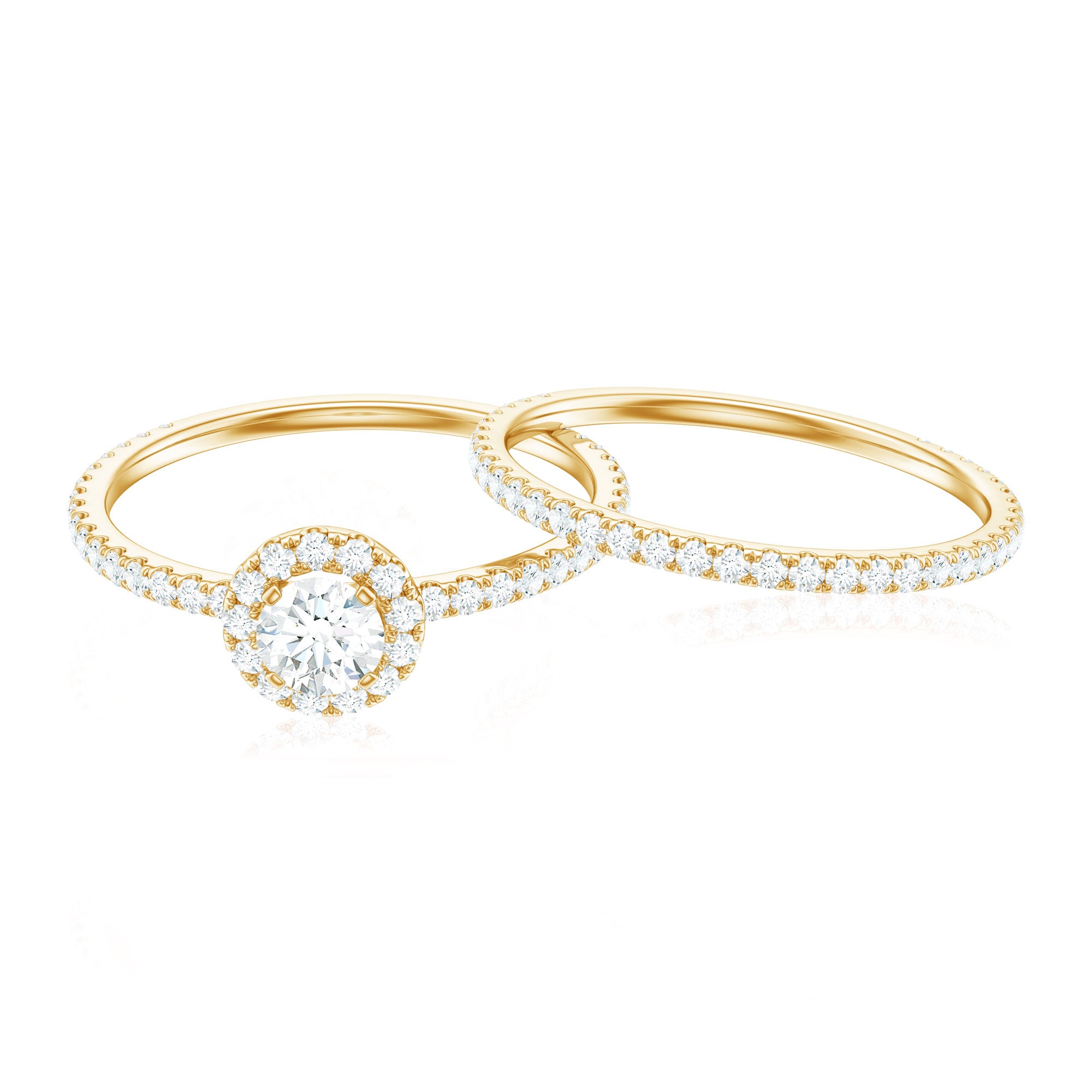 2. Halo moissanite rings: One center moissanite piece is surrounded by small accent moissanite, which is a halo moissanite setting. Halo gemstone settings are more affordable than gemstone solitaire rings, in case of the same total carat weight, and look similar. the side moissanite in yellow gold moissanite rings creates the illusion of a bigger gemstone.