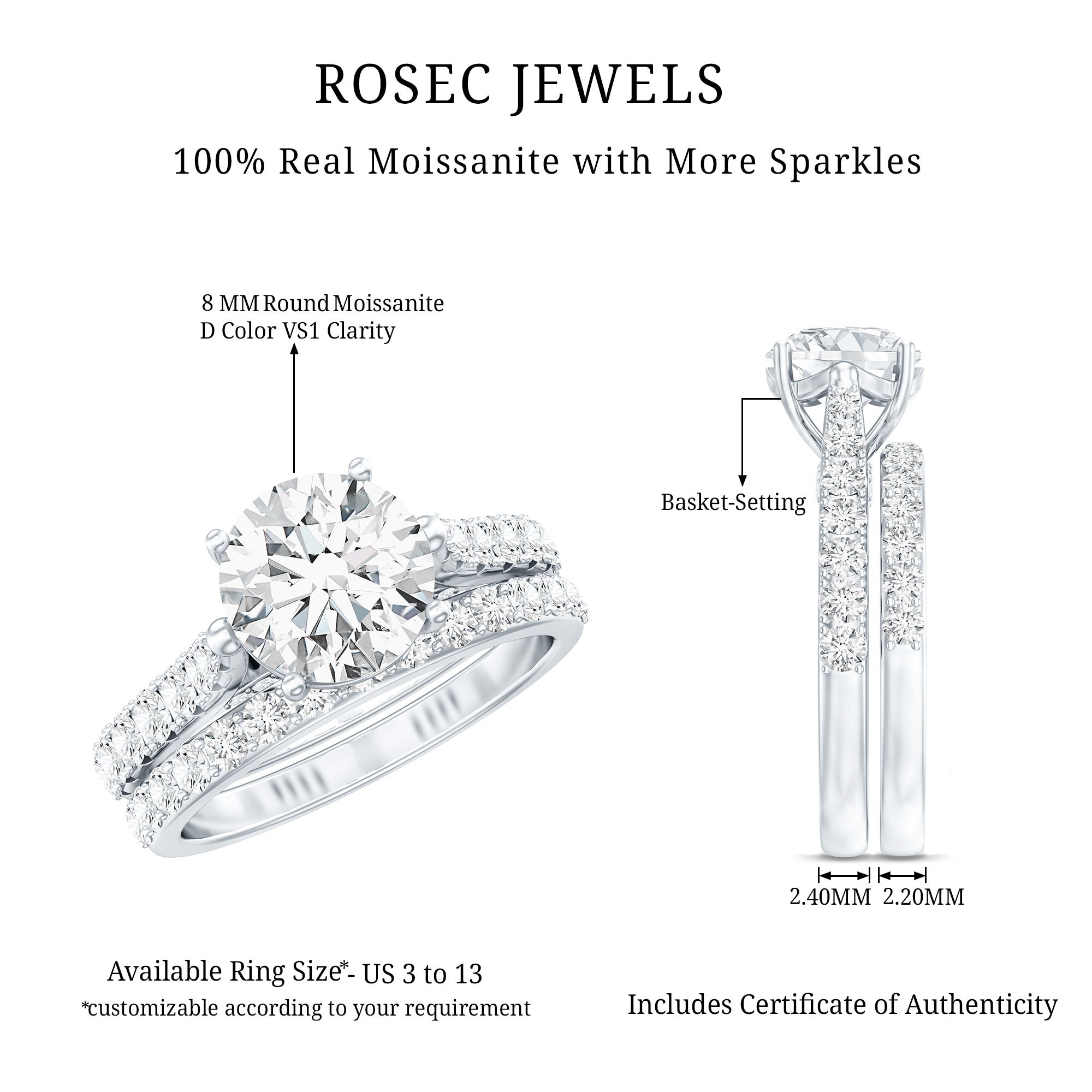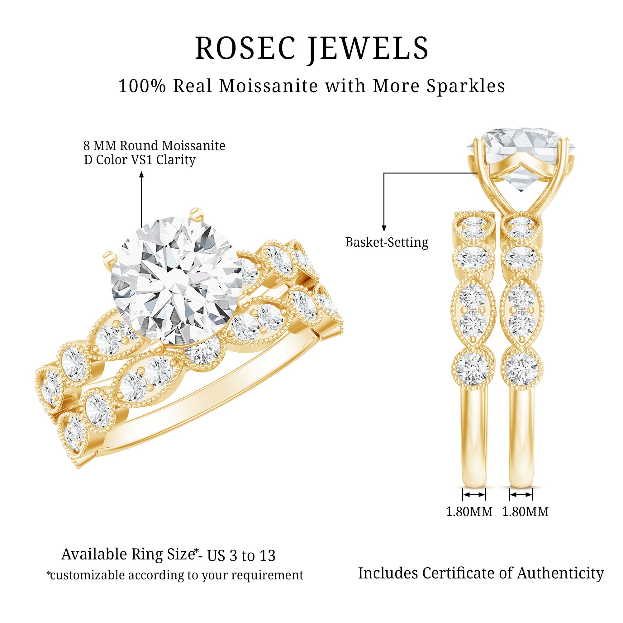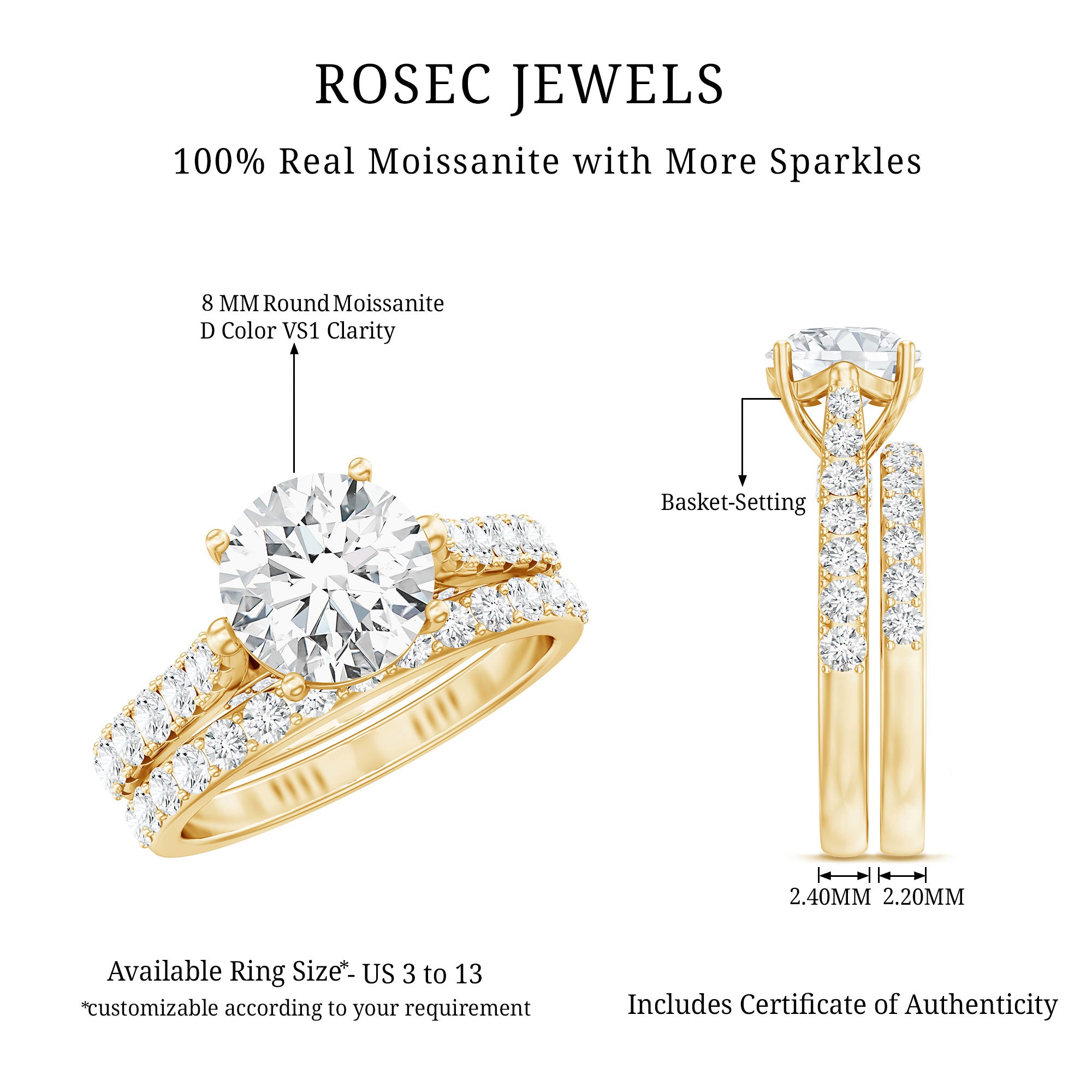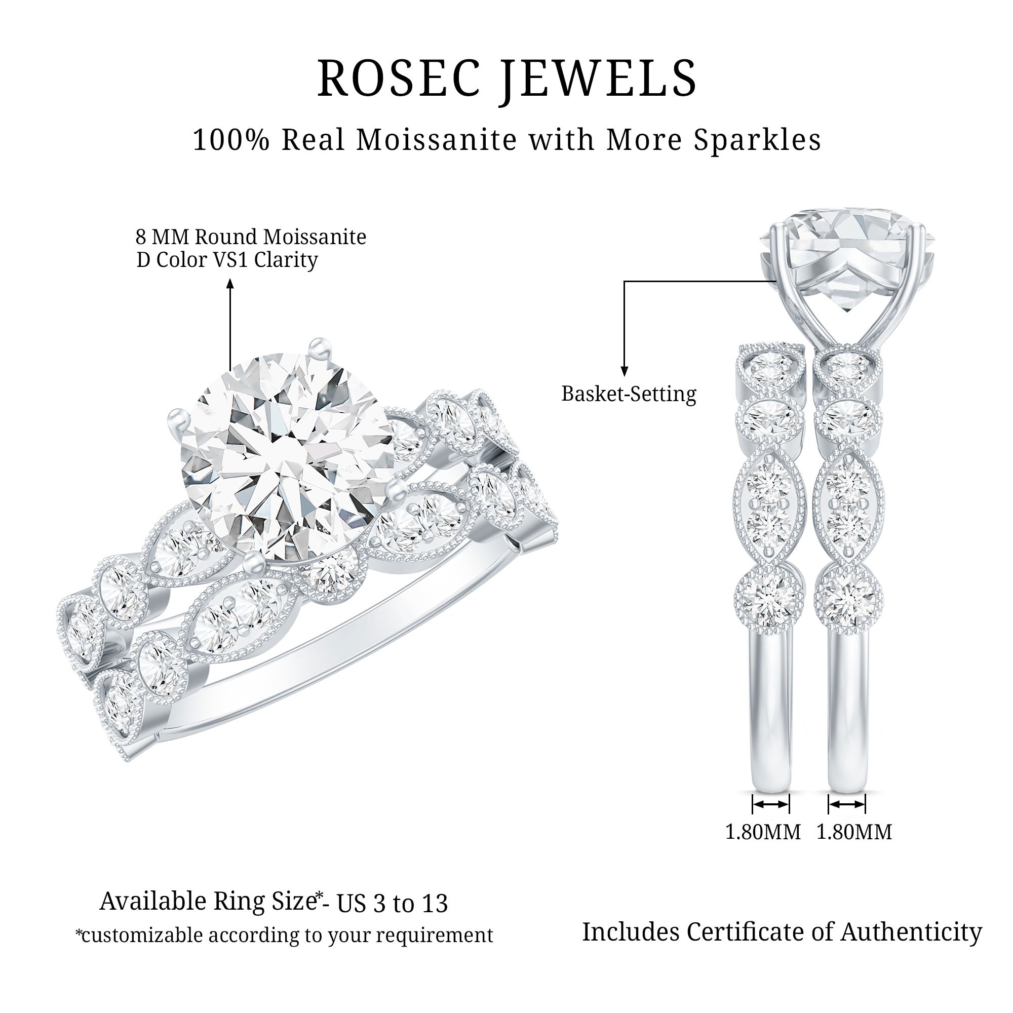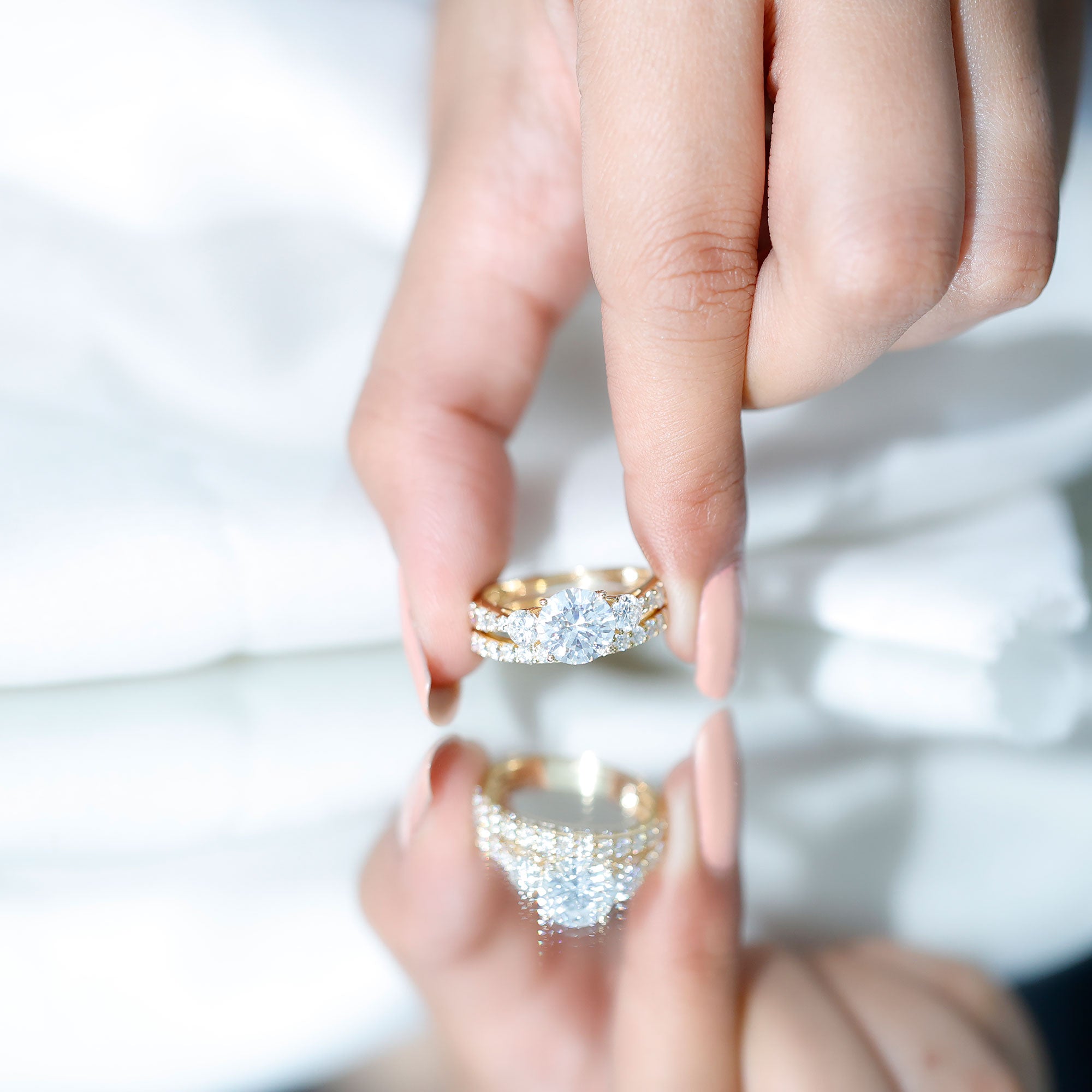 Moissanite Bridal Ring Sets: One of the popular choices for engagements and weddings is you can buy a ring set. The Bridal Ring Set is the perfect stacking combination of engagement rings and moissanite wedding rings. Two different styles create sets of rings that look premium and classy. The wedding band compliments the engagement ring and works as an enhancer.