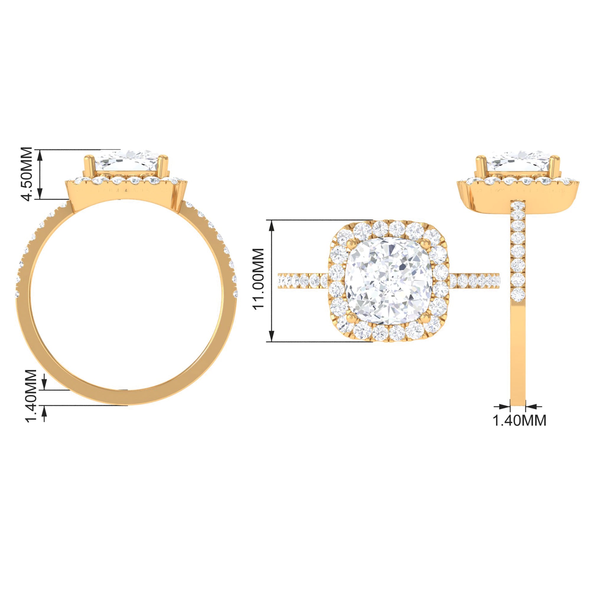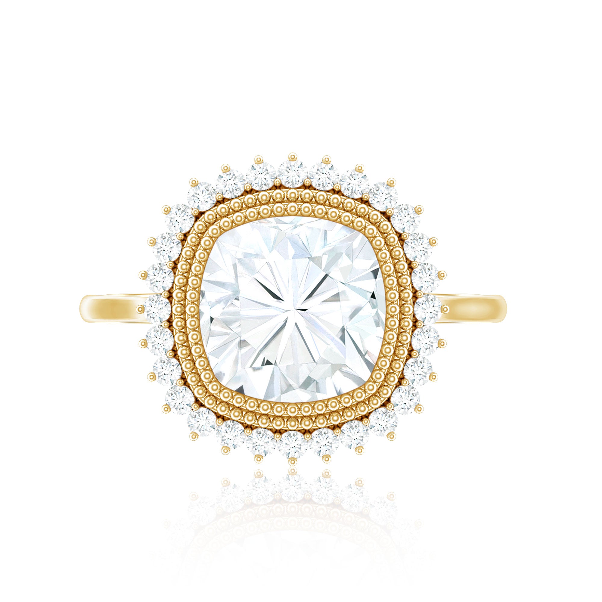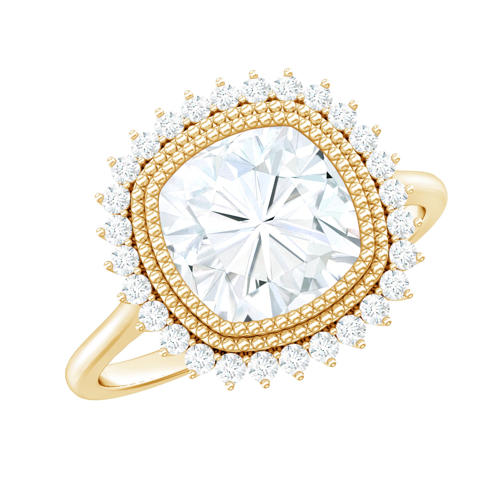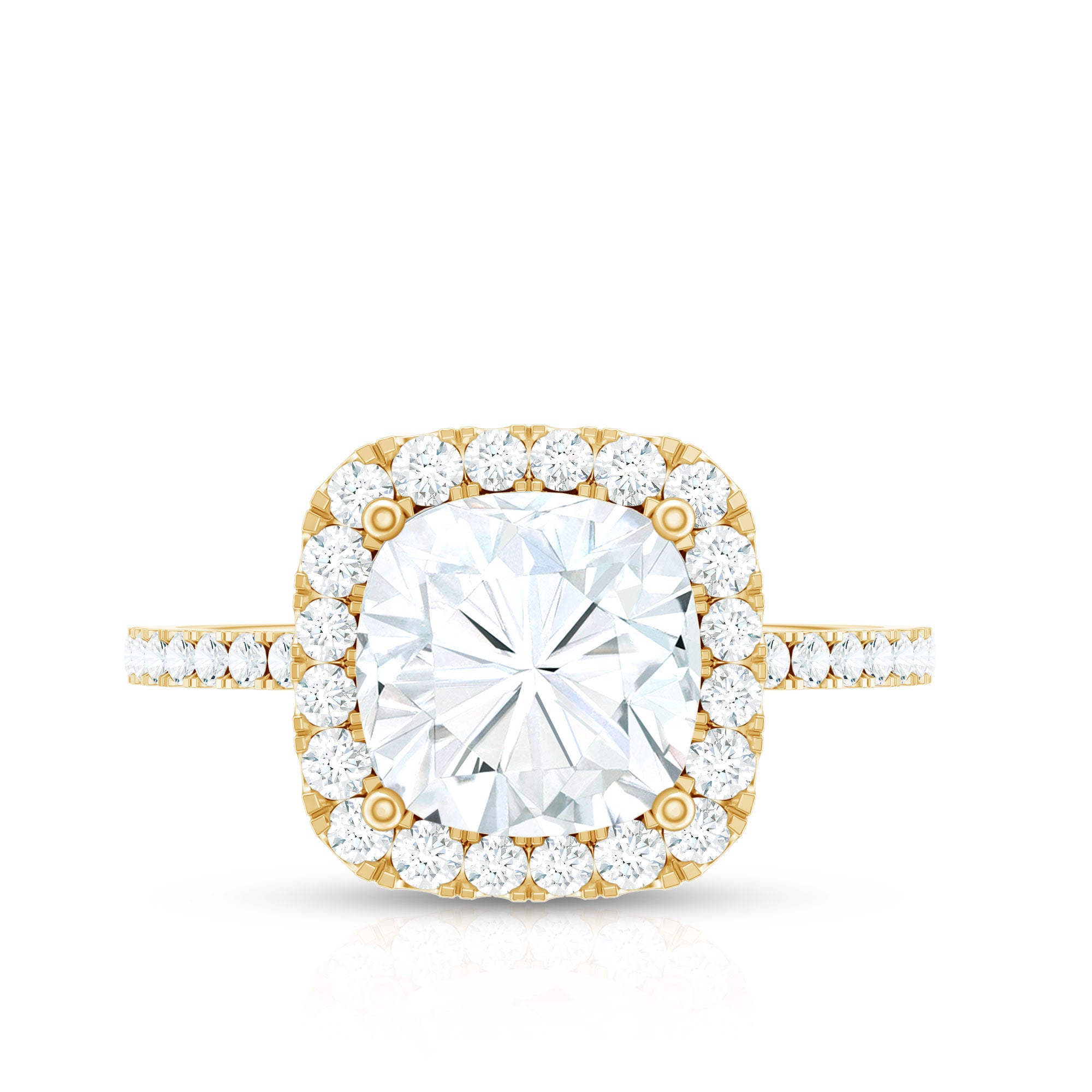 Halo moissanite rings: One center moissanite piece is surrounded by small accent moissanite, which is a halo moissanite setting. Halo gemstone settings are more affordable than gemstone solitaire rings, in case of the same total carat weight, and look similar. the side moissanite in yellow gold moissanite rings creates the illusion of a bigger gemstone.