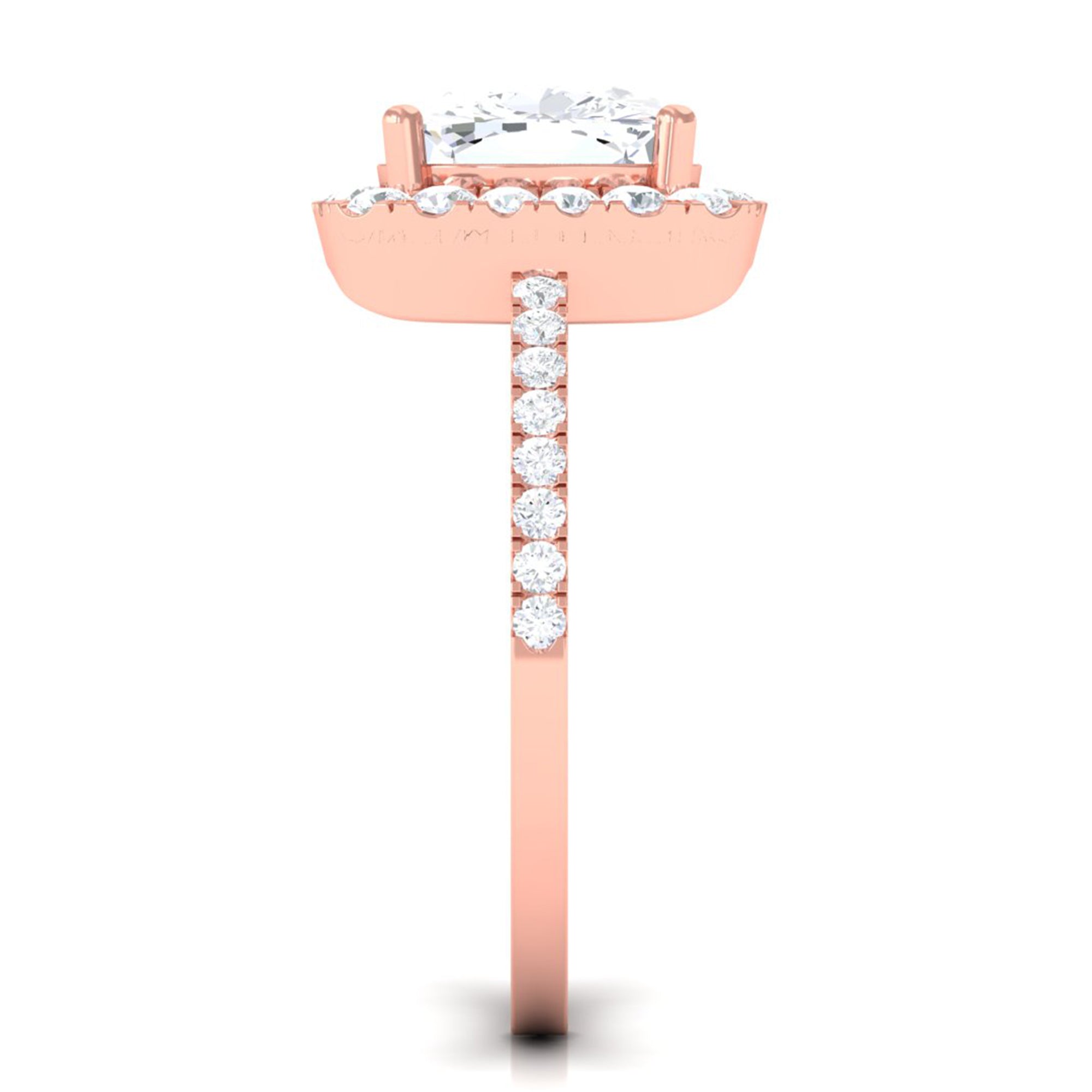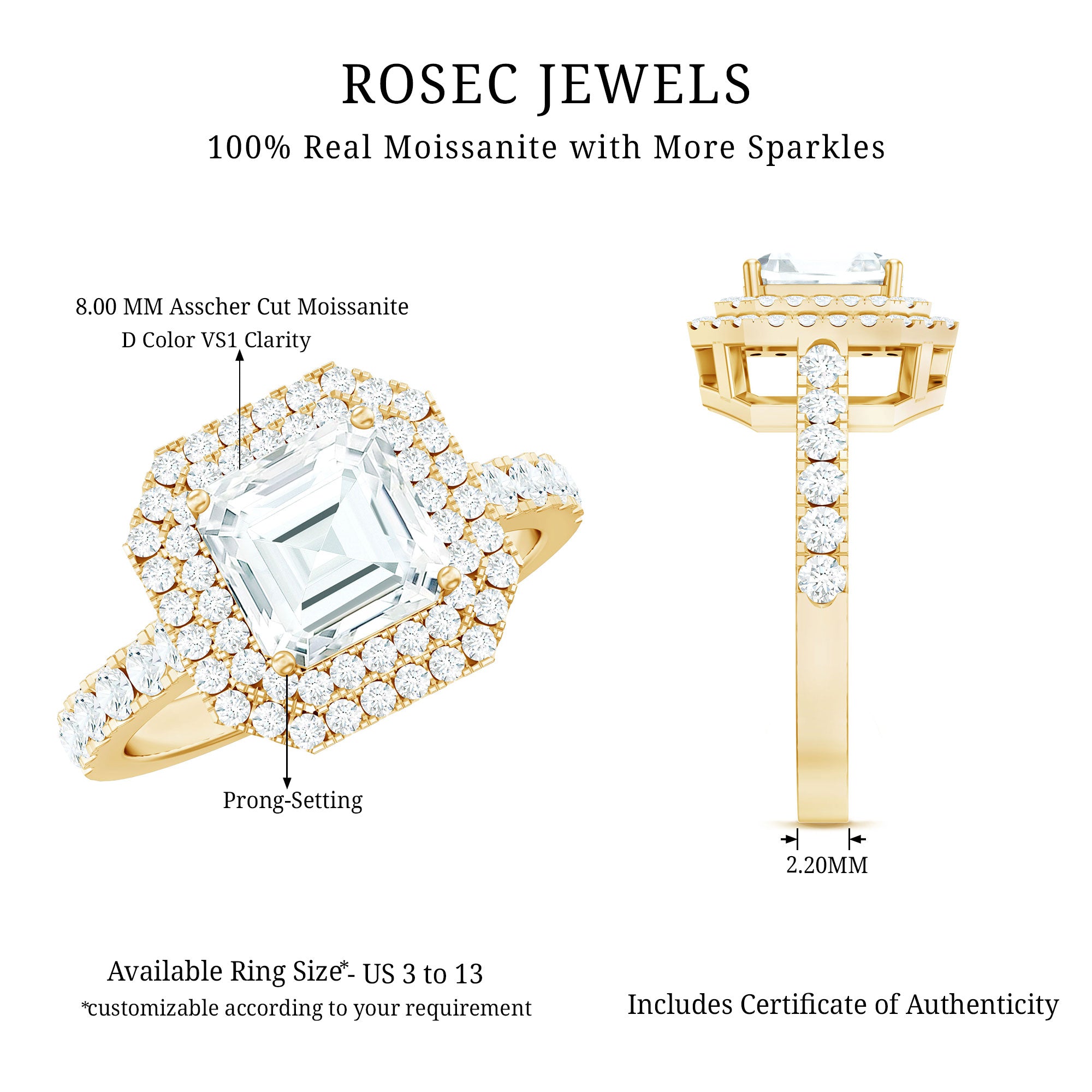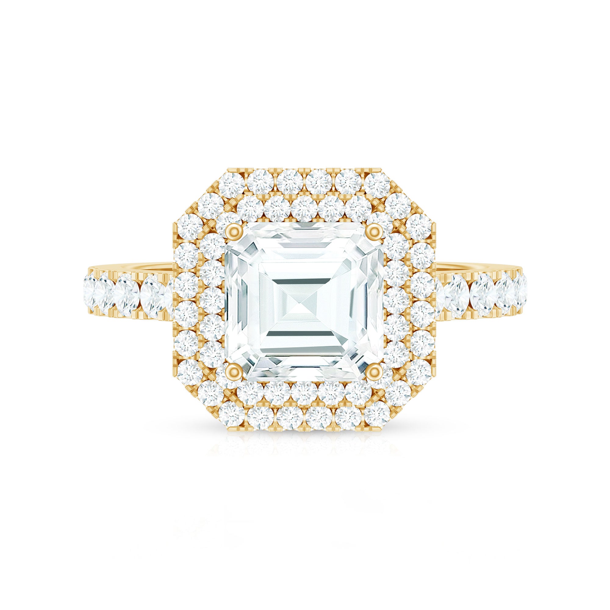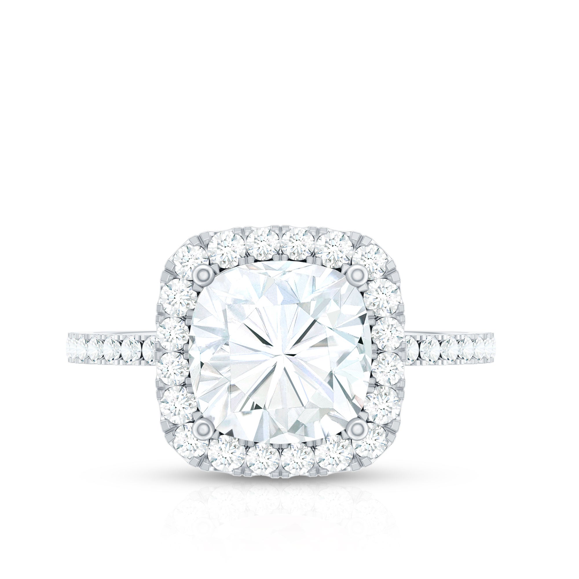 Halo moissanite rings: One center moissanite piece is surrounded by small accent moissanite, which is a halo moissanite setting. Halo gemstone settings are more affordable than gemstone solitaire rings, in case of the same total carat weight, and look similar. the side moissanite in yellow gold moissanite rings creates the illusion of a bigger gemstone.