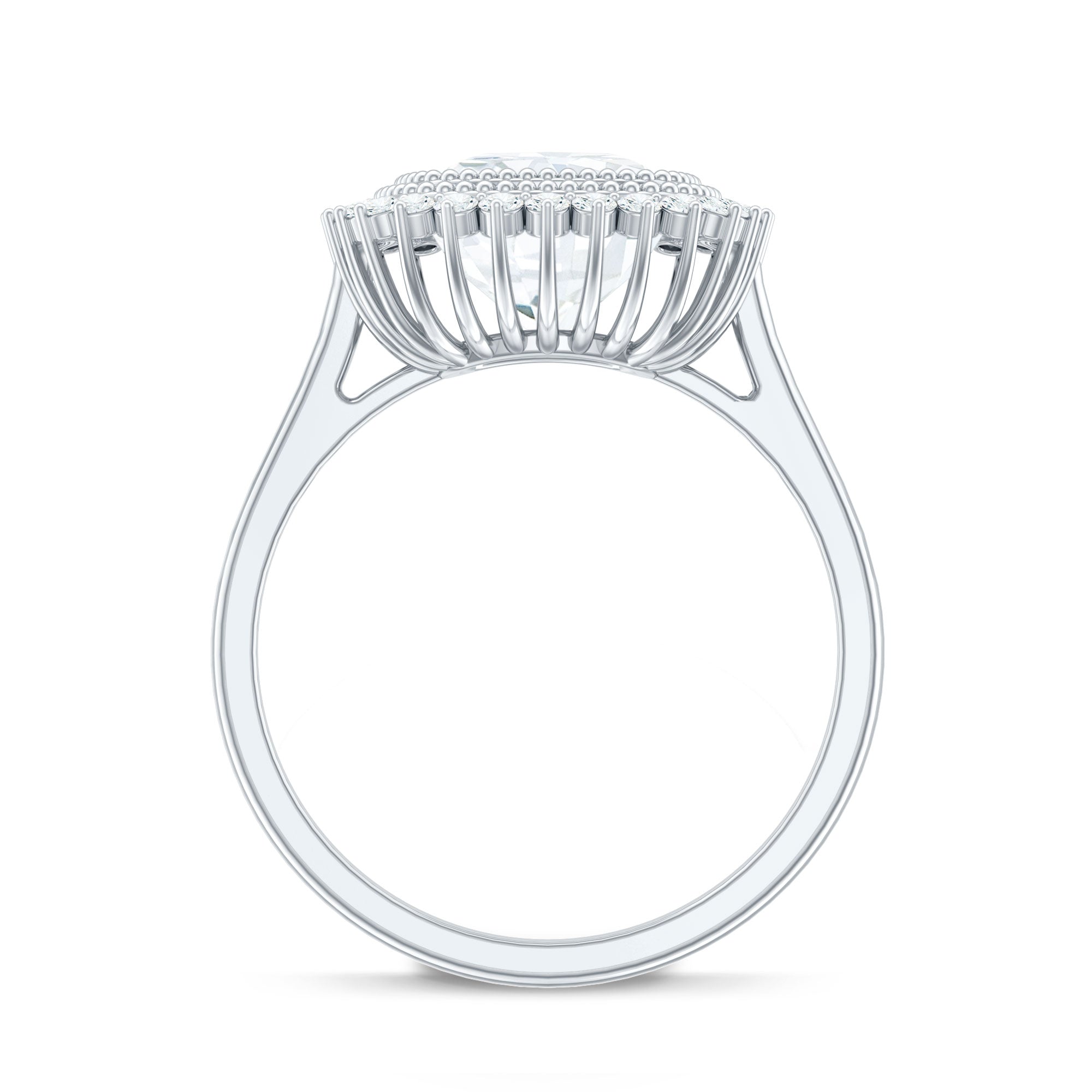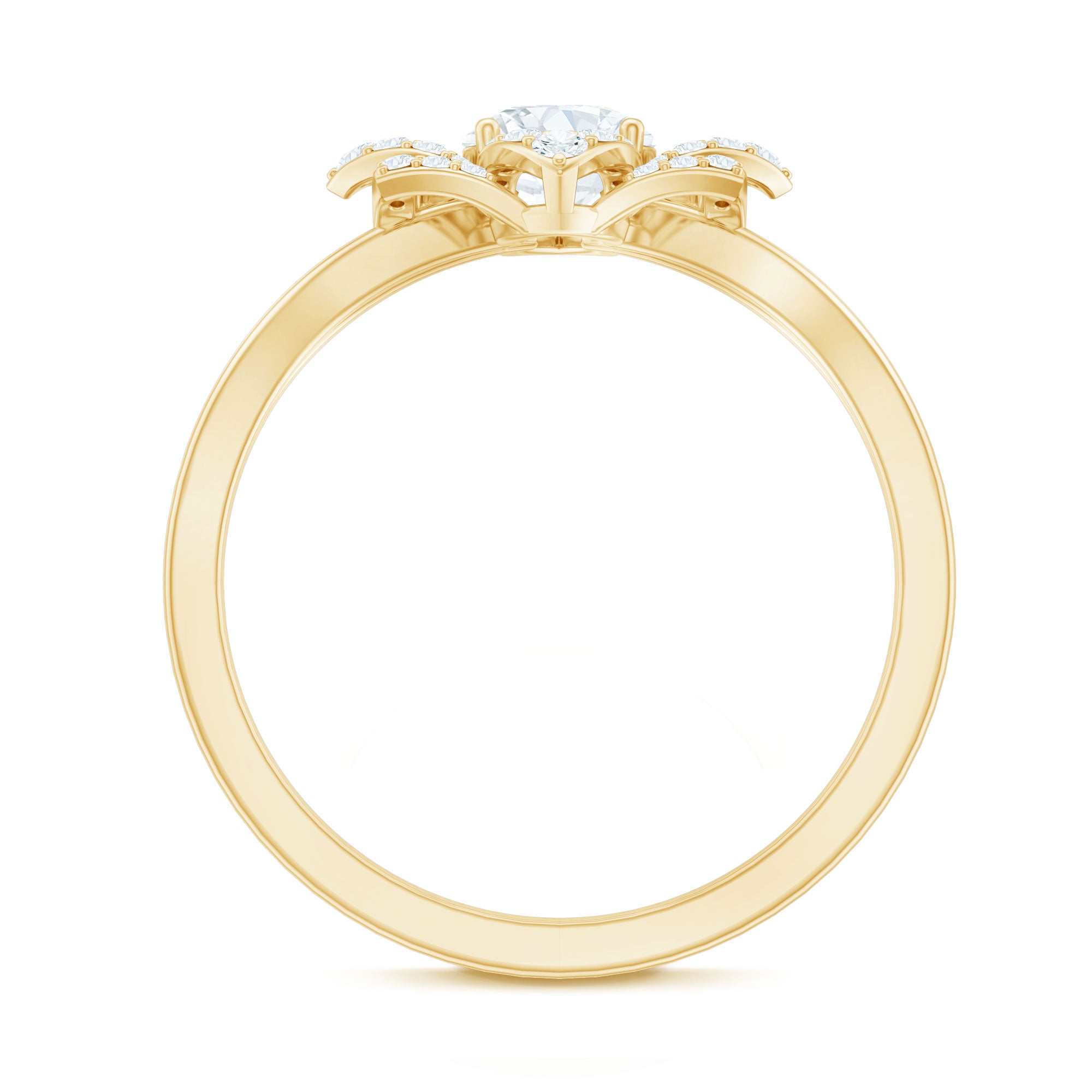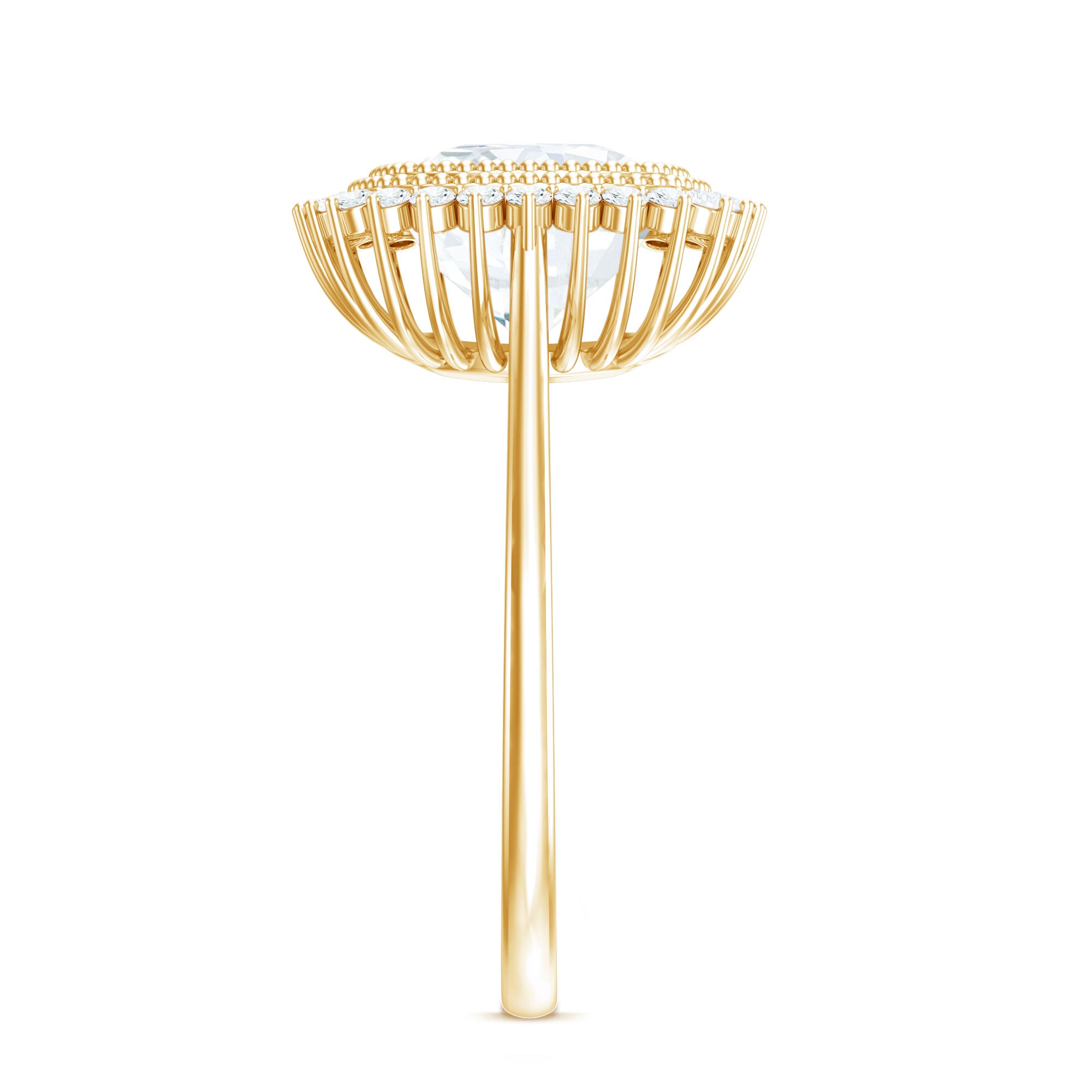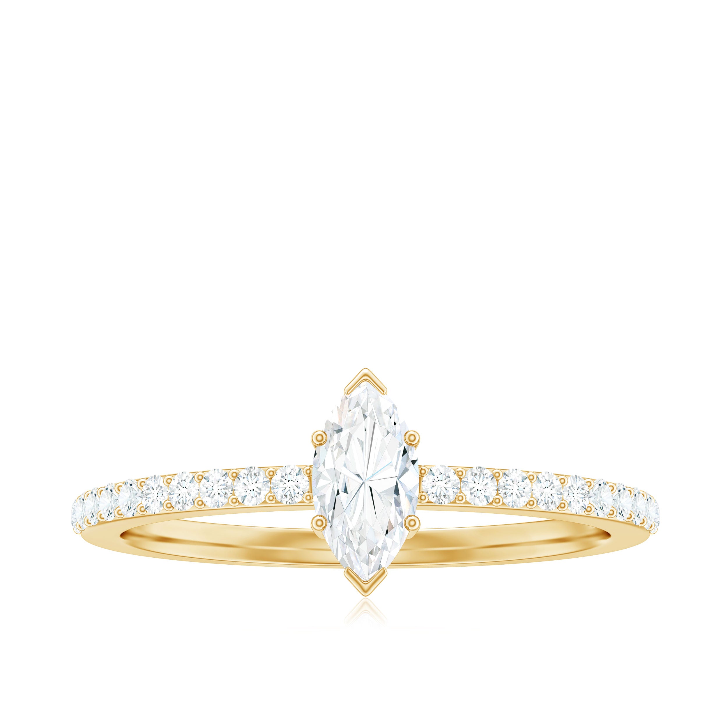 Halo moissanite rings: One center moissanite piece is surrounded by small accent moissanite, which is a halo moissanite setting. Halo gemstone settings are more affordable than gemstone solitaire rings, in case of the same total carat weight, and look similar. the side moissanite in yellow gold moissanite rings creates the illusion of a bigger gemstone.