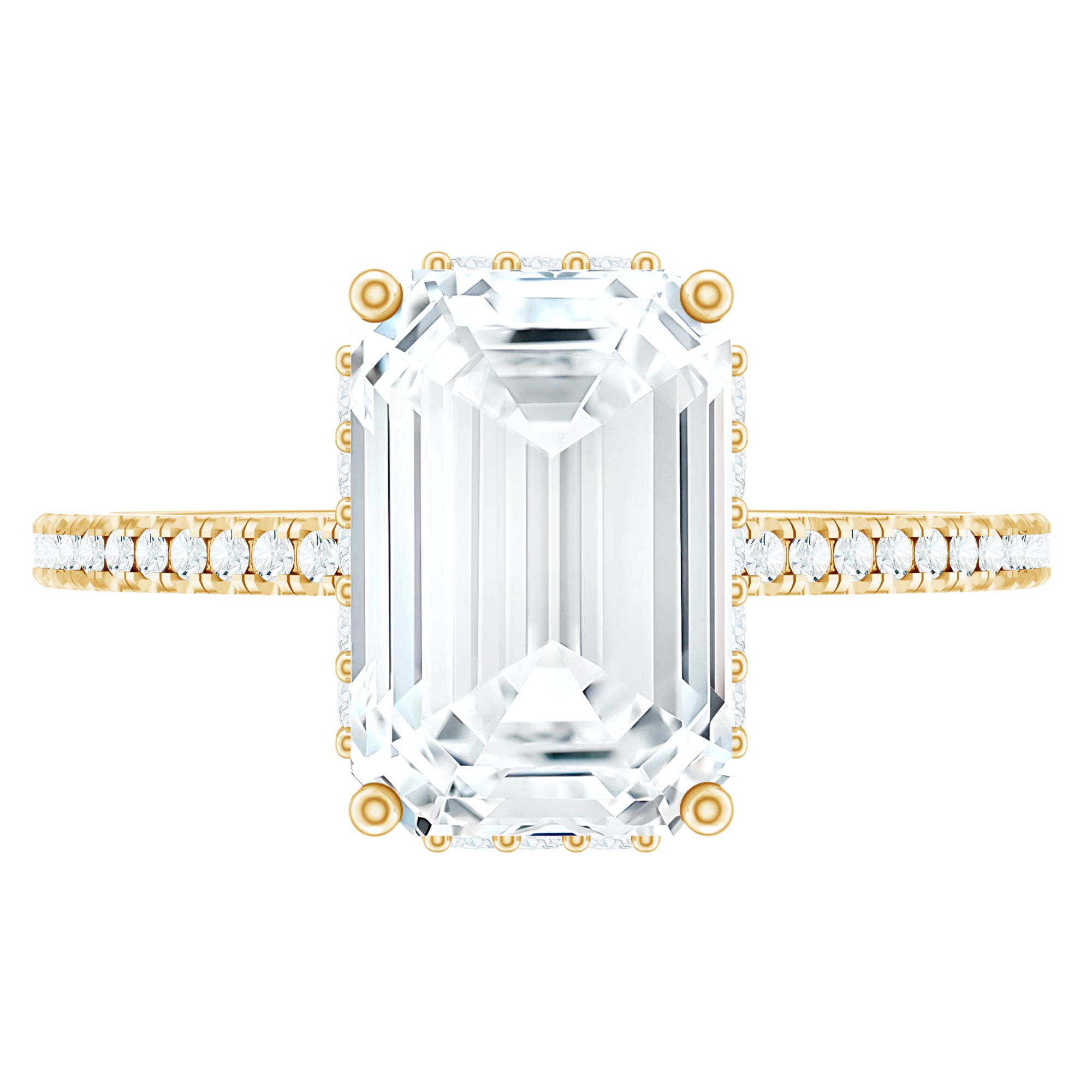 Halo moissanite rings: One center moissanite piece is surrounded by small accent moissanite, which is a halo moissanite setting. Halo gemstone settings are more affordable than gemstone solitaire rings, in case of the same total carat weight, and look similar. the side moissanite in yellow gold moissanite rings creates the illusion of a bigger gemstone.