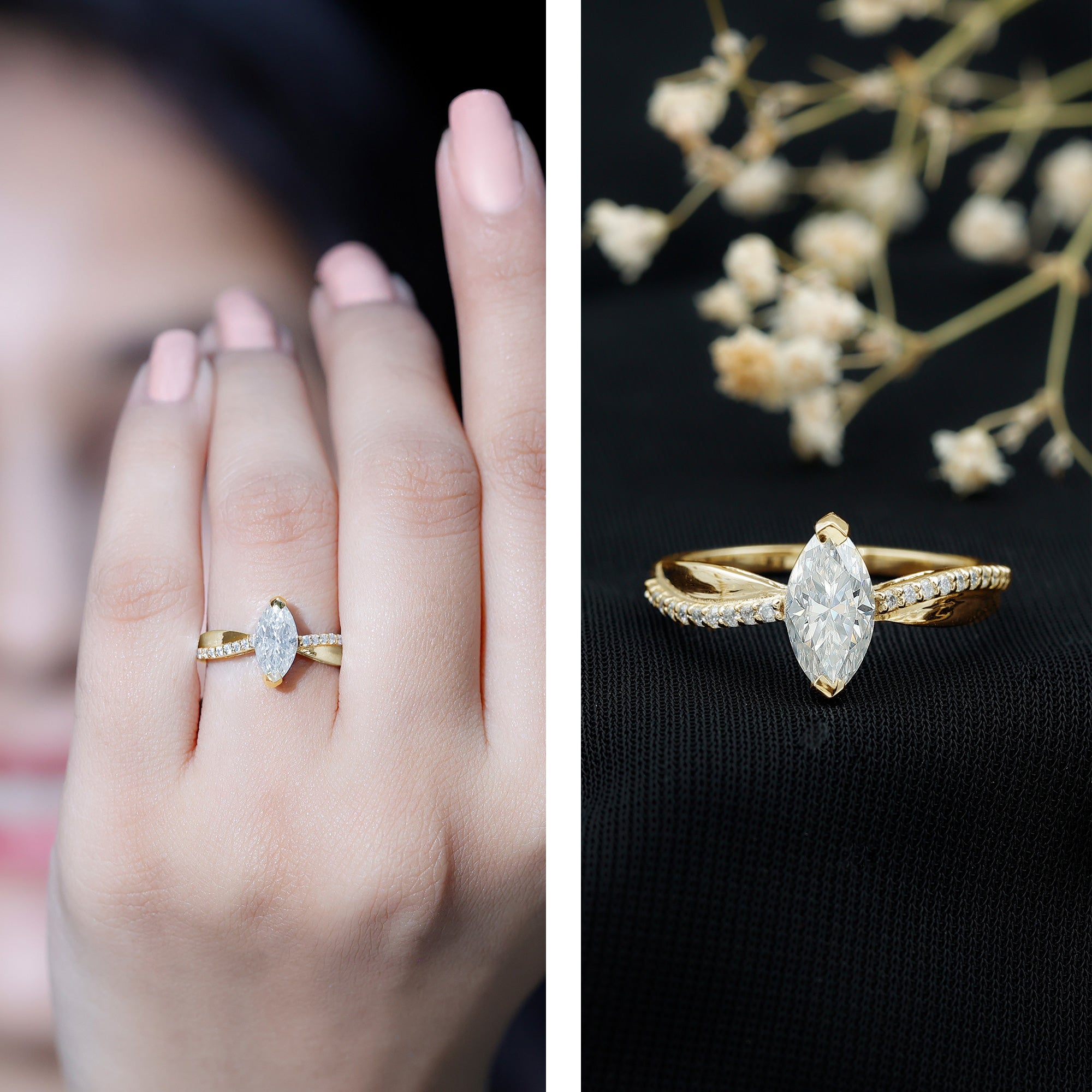 2. Halo moissanite rings: One center moissanite piece is surrounded by small accent moissanite, which is a halo moissanite setting. Halo gemstone settings are more affordable than gemstone solitaire rings, in case of the same total carat weight, and look similar. the side moissanite in yellow gold moissanite rings creates the illusion of a bigger gemstone.