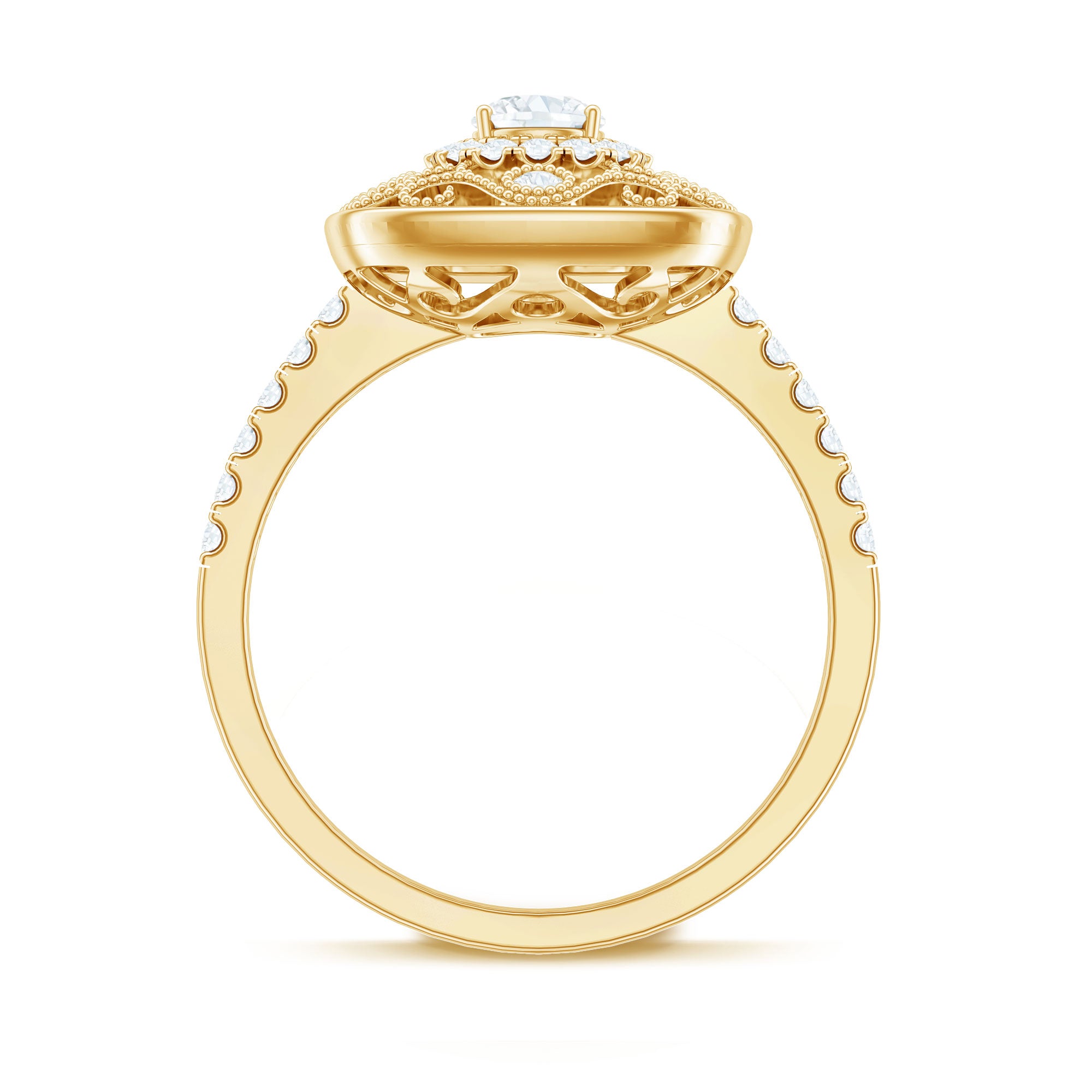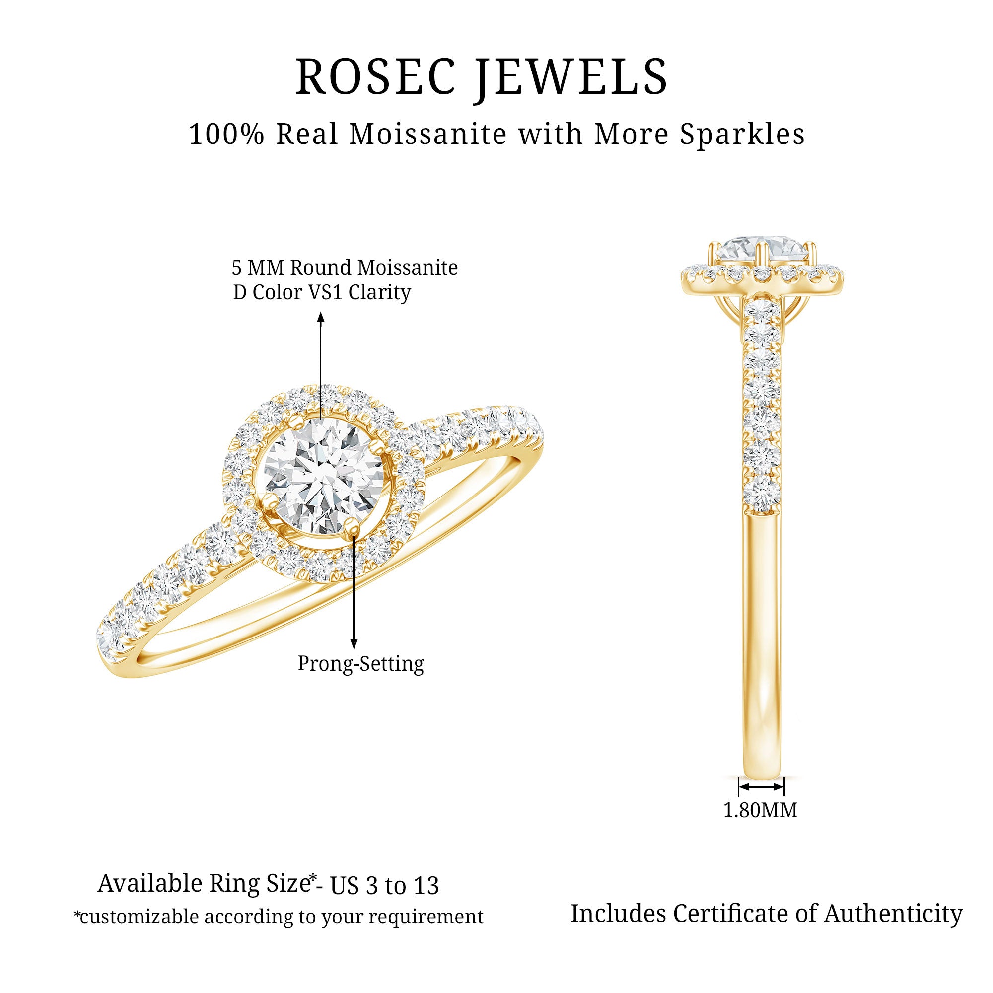 2. Halo moissanite rings: One center moissanite piece is surrounded by small accent moissanite, which is a halo moissanite setting. Halo gemstone settings are more affordable than gemstone solitaire rings, in case of the same total carat weight, and look similar. the side moissanite in yellow gold moissanite rings creates the illusion of a bigger gemstone.