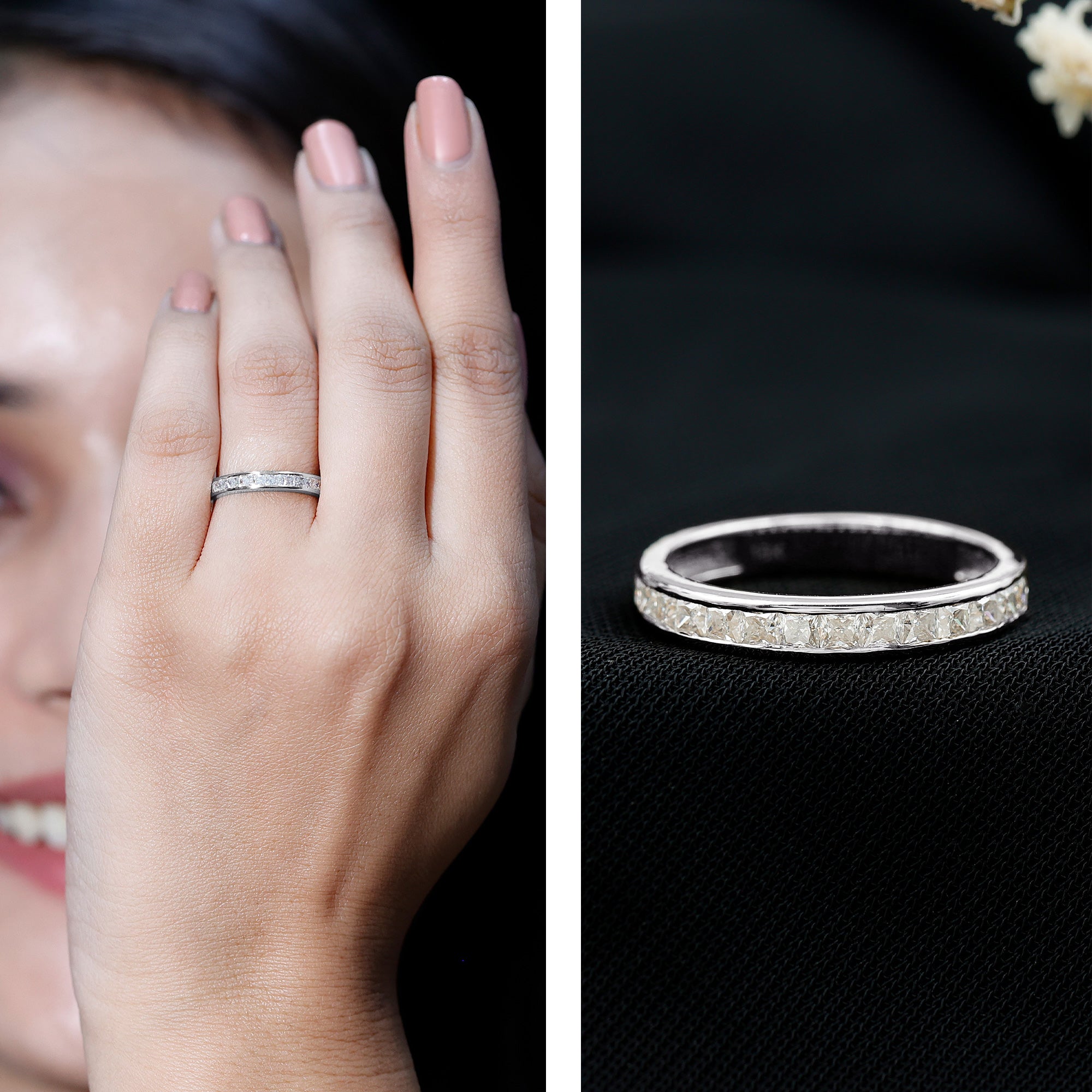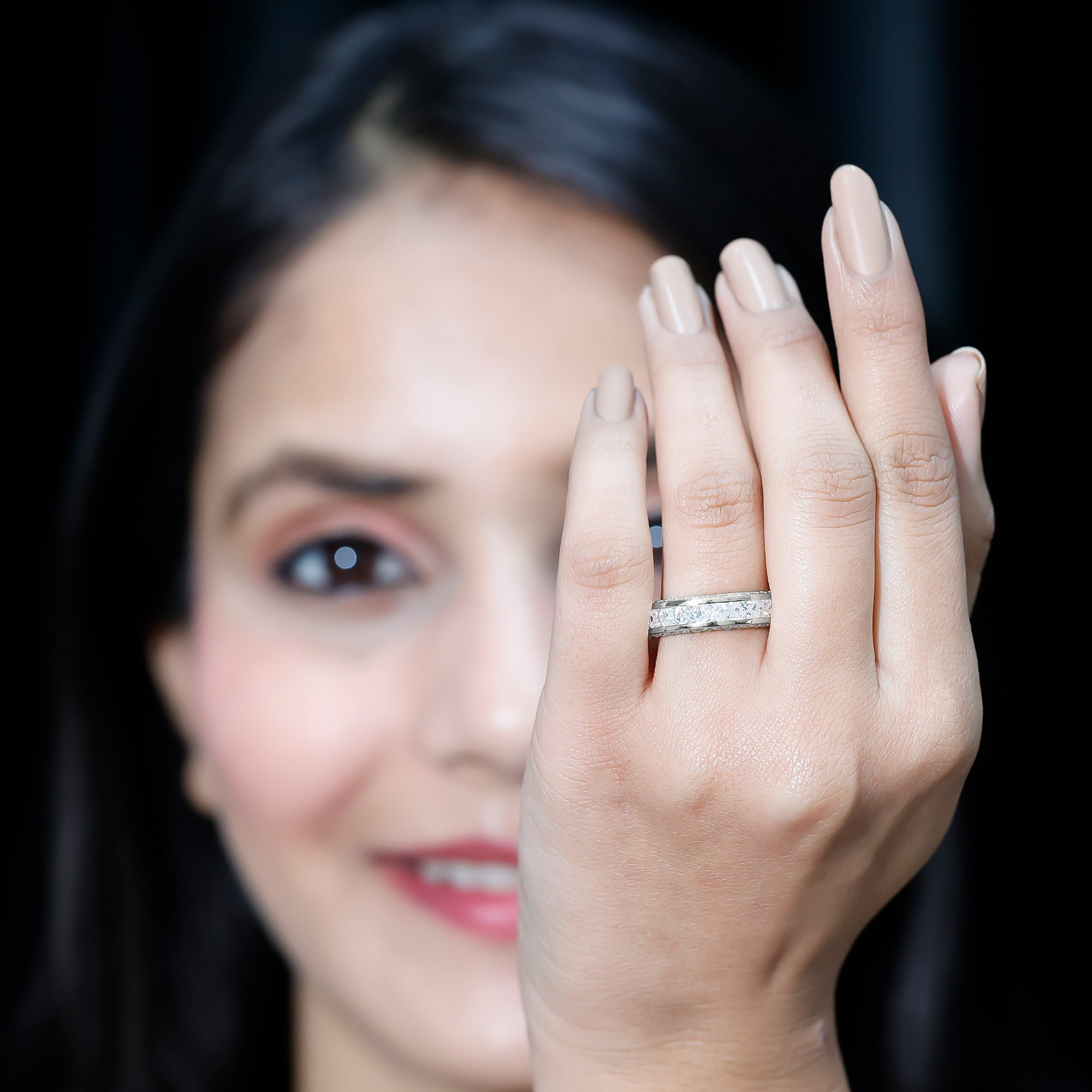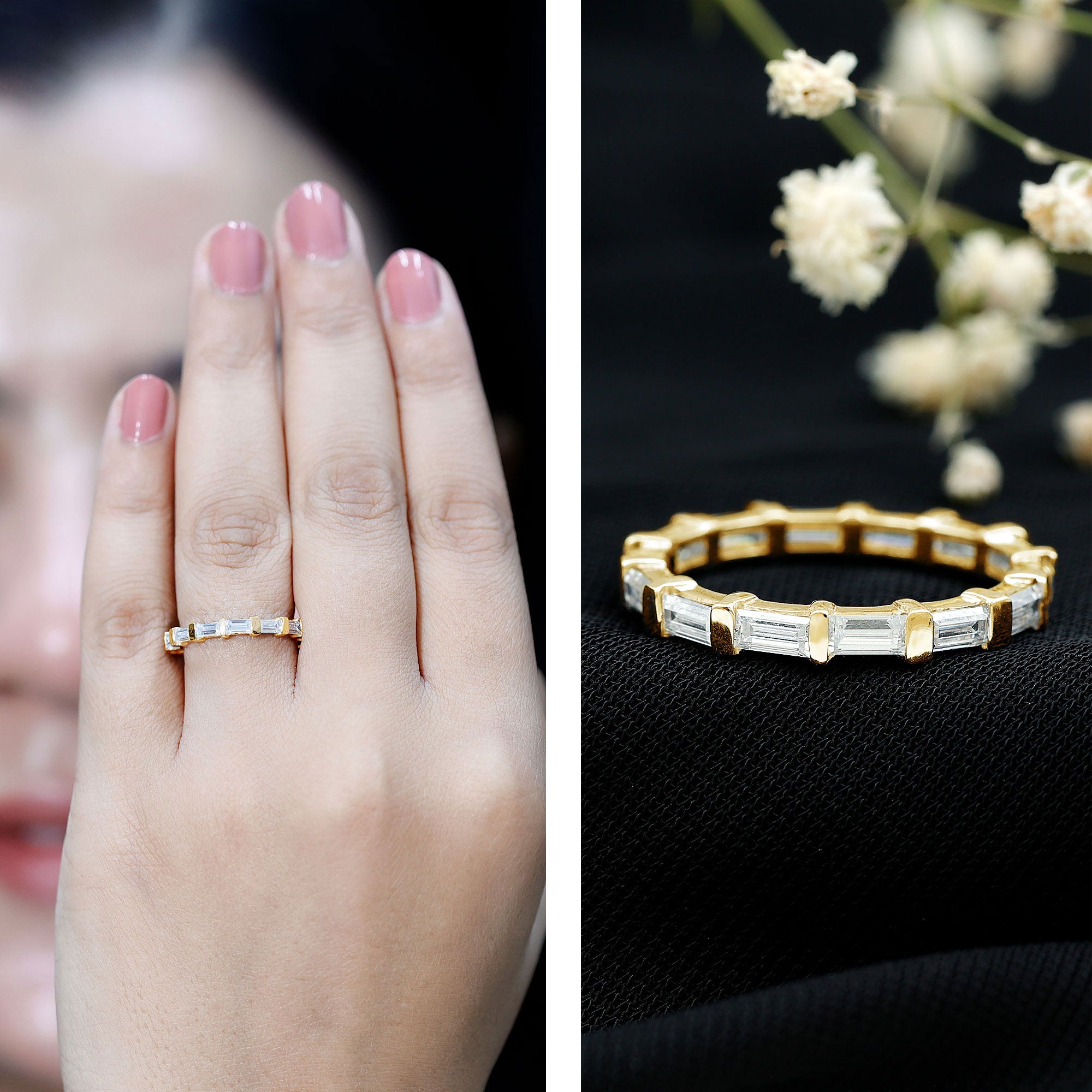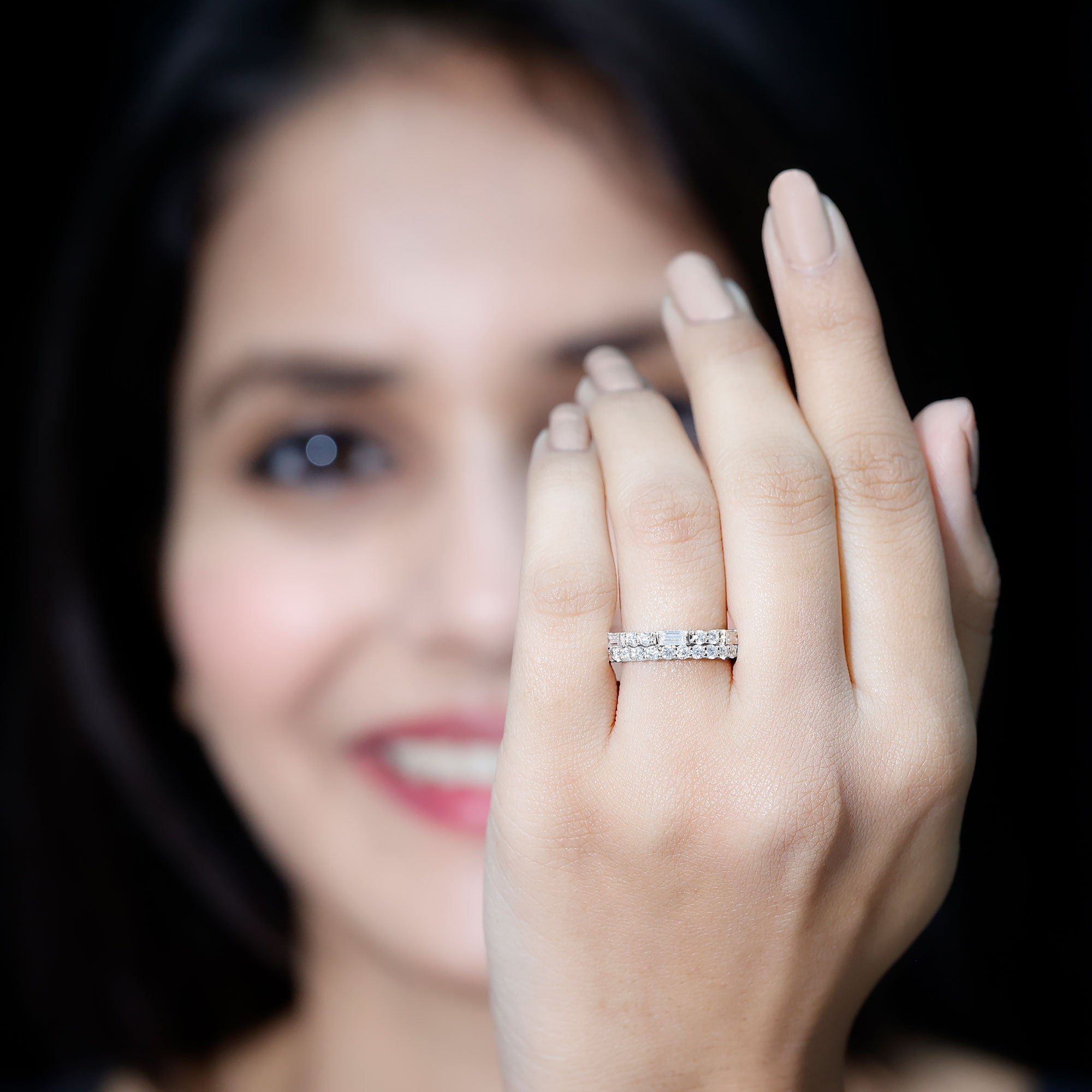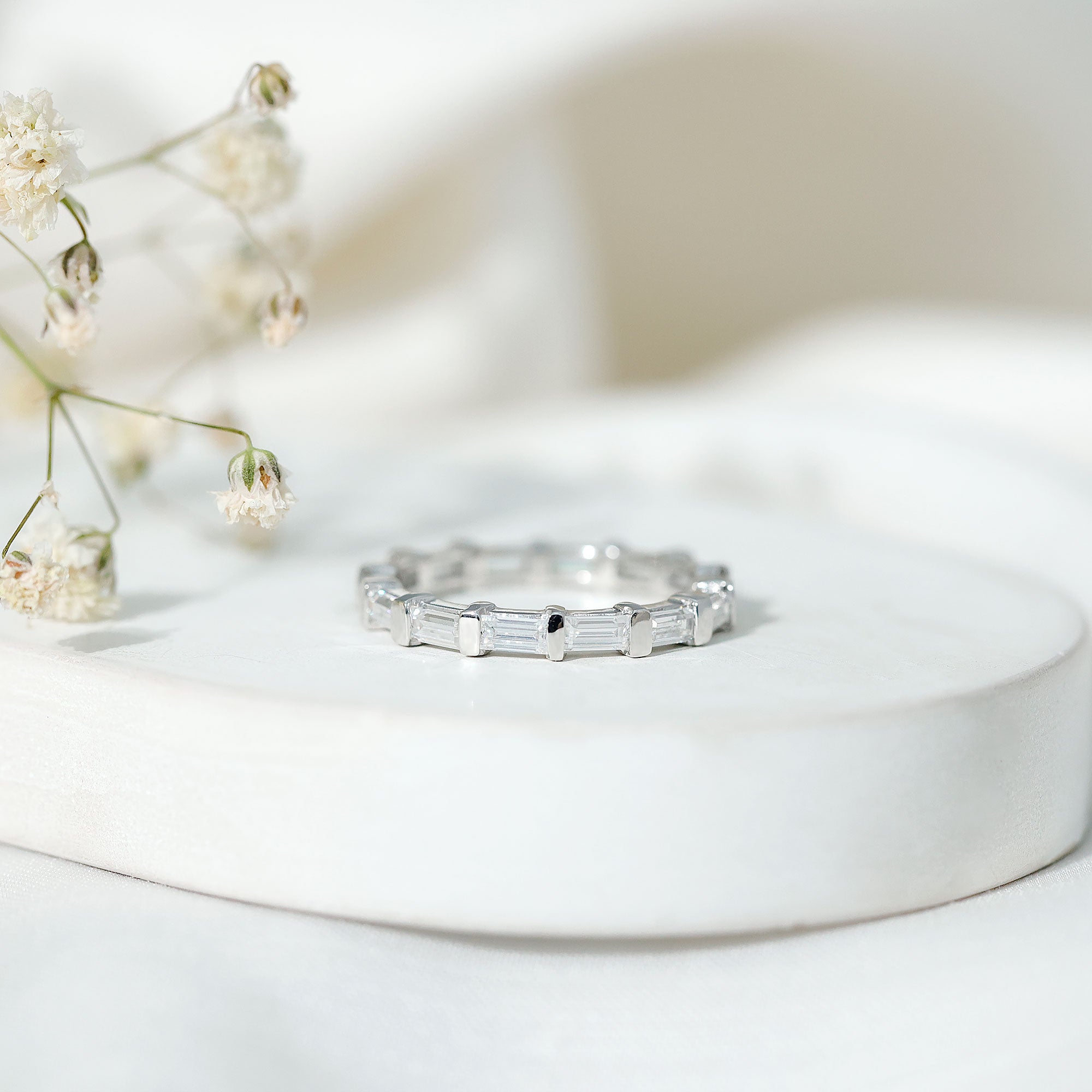 Moissanite is the best alternative to diamond for all the great reasons. The brilliant and fierce moissanite stackable wedding bands can withstand the test of time. Couple are considering moissanite wedding bands leaving behind the diamond ones as moissanite is pretty affordable. Being an Eco-friendly and cruelty-free stone gives moissanite a plus point for sustainability loving brides.