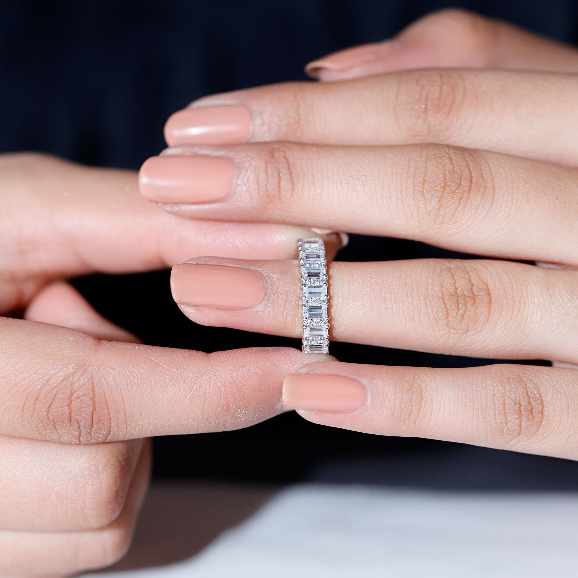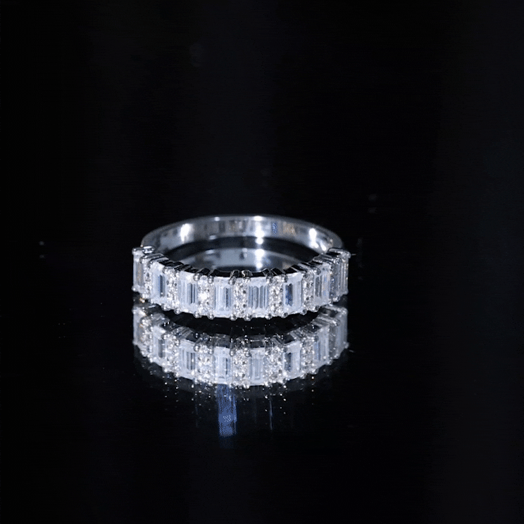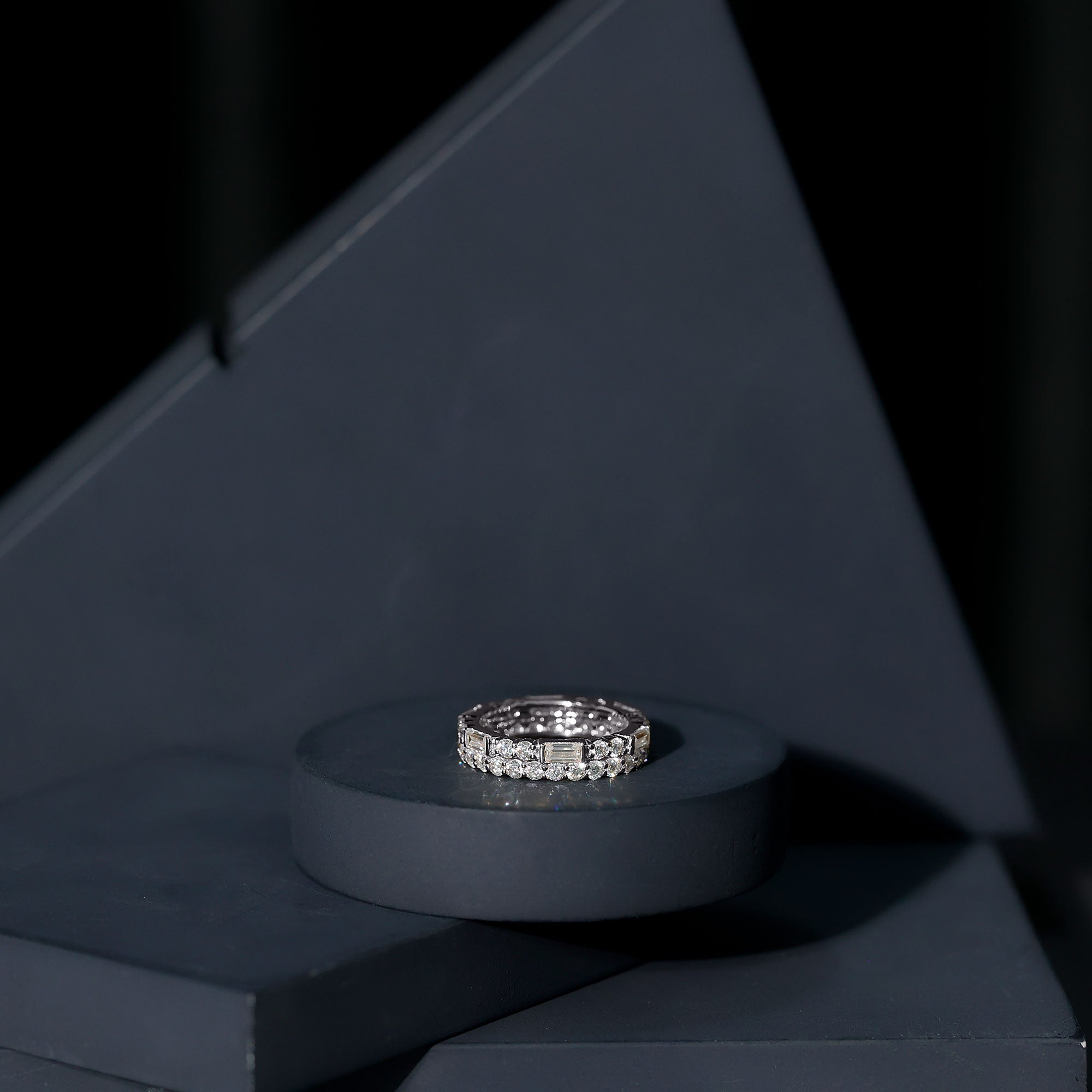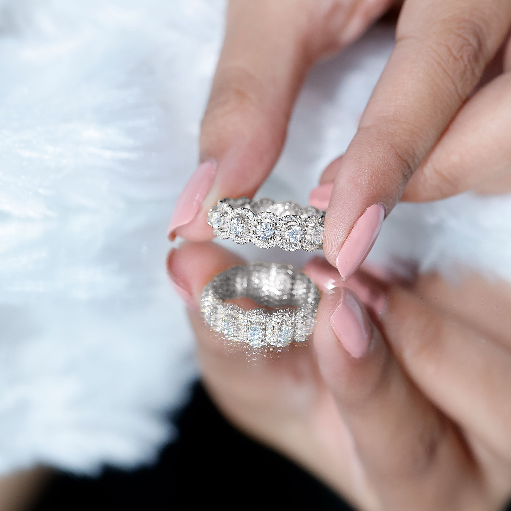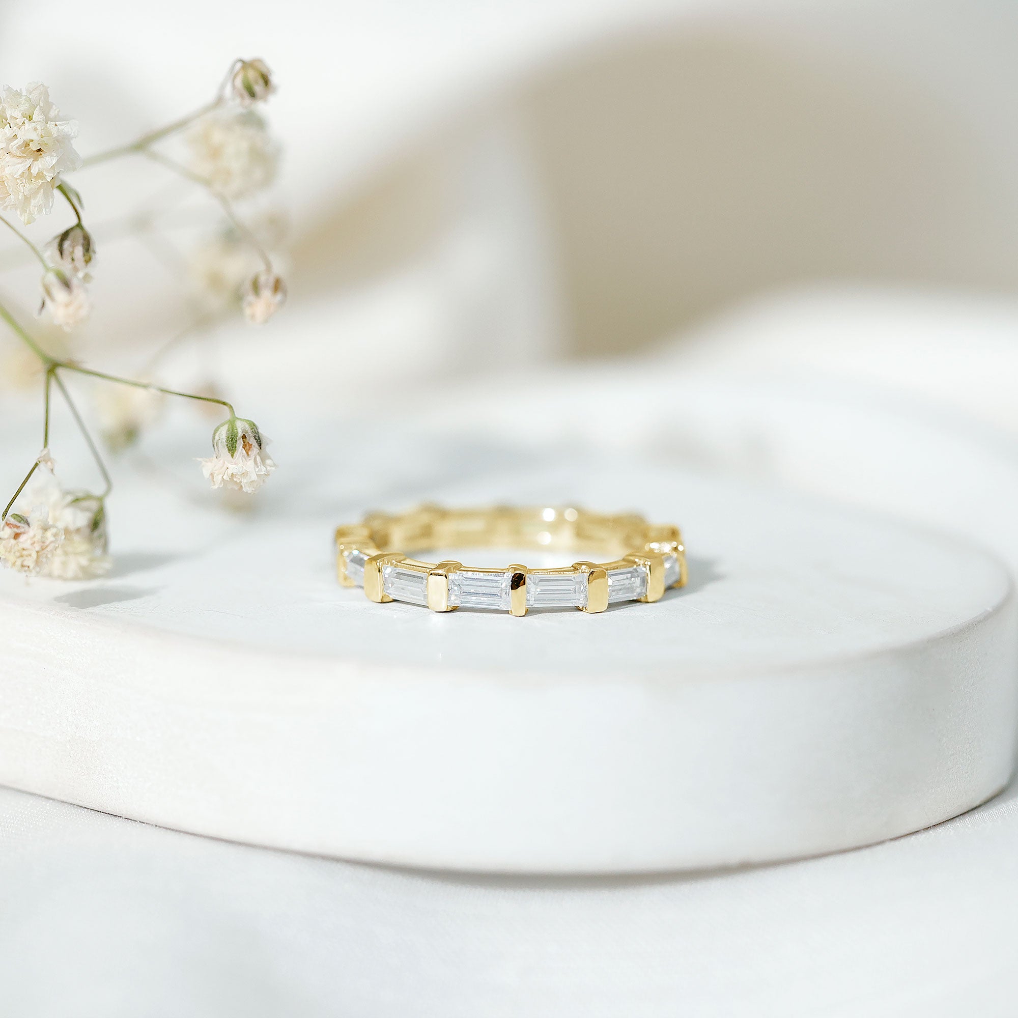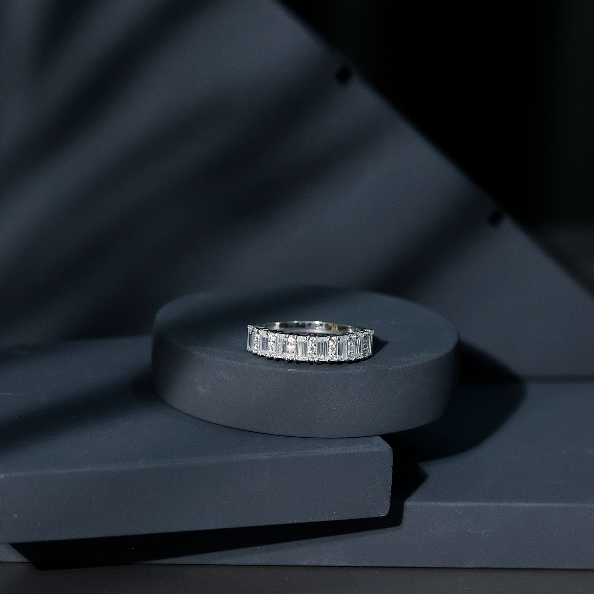 Moissanite is the best alternative to diamond for all the great reasons. The brilliant and fierce moissanite stackable wedding bands can withstand the test of time. Couple are considering moissanite wedding bands leaving behind the diamond ones as moissanite is pretty affordable. Being an Eco-friendly and cruelty-free stone gives moissanite a plus point for sustainability loving brides.