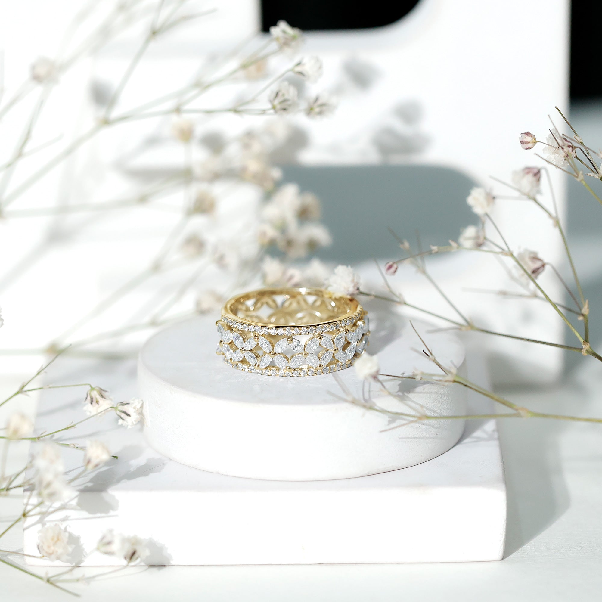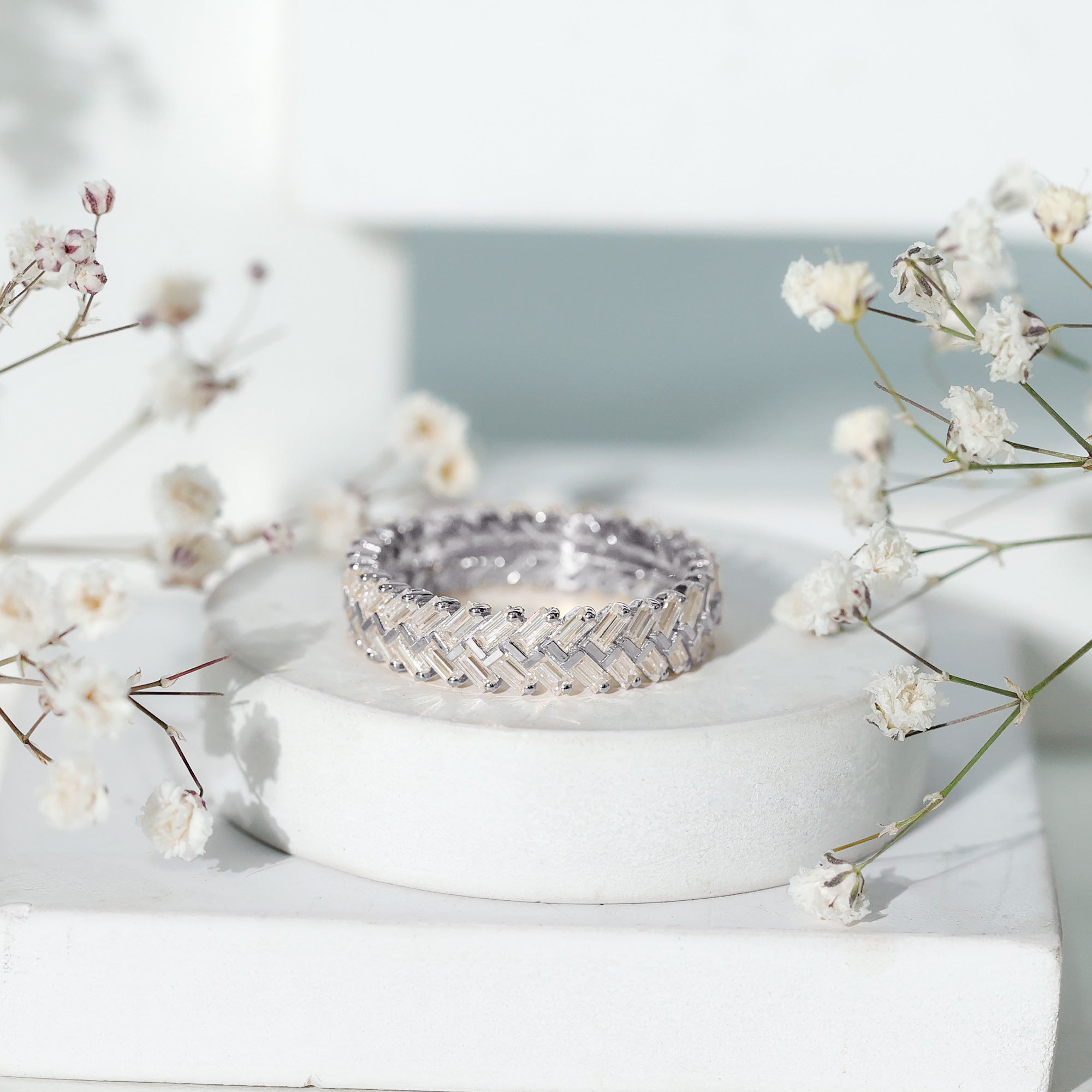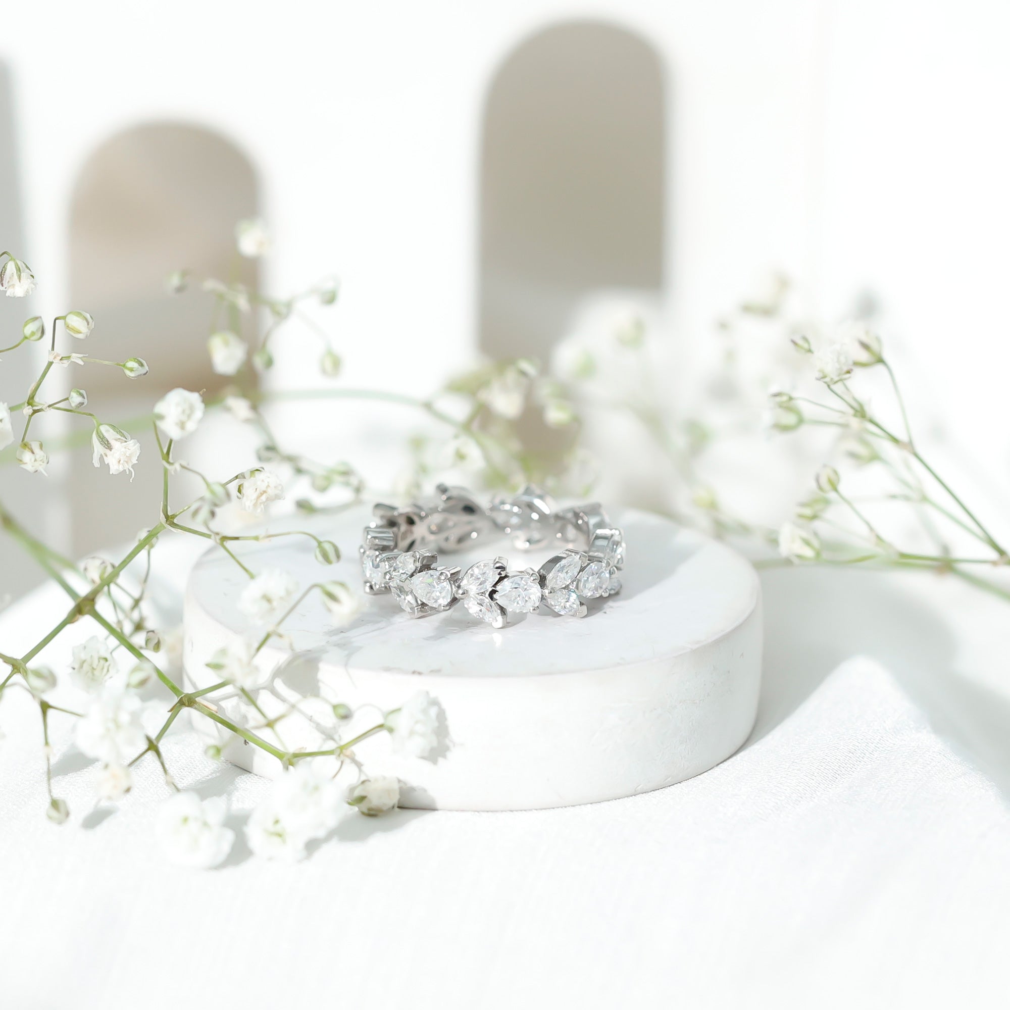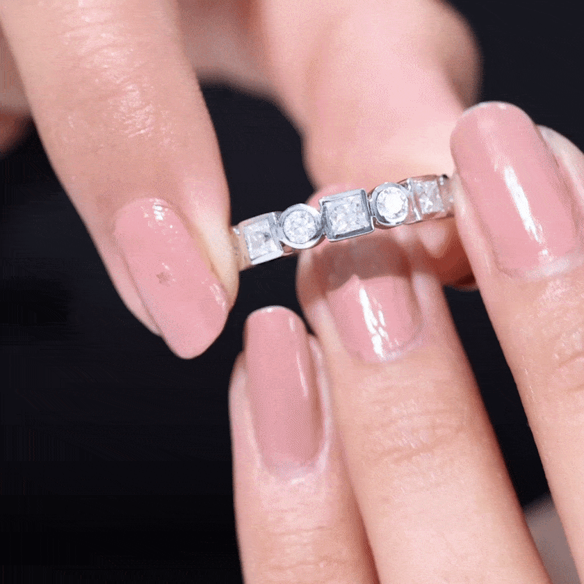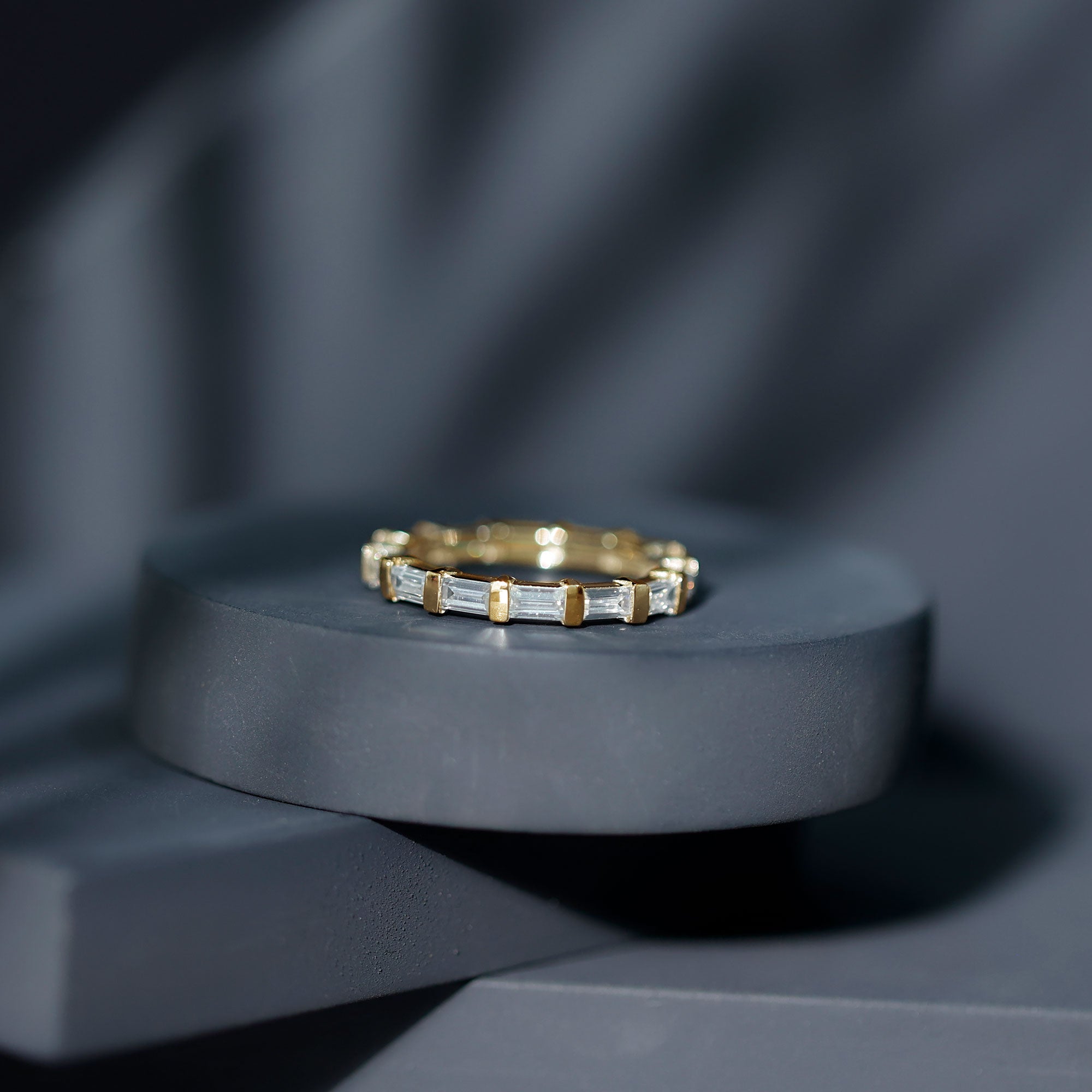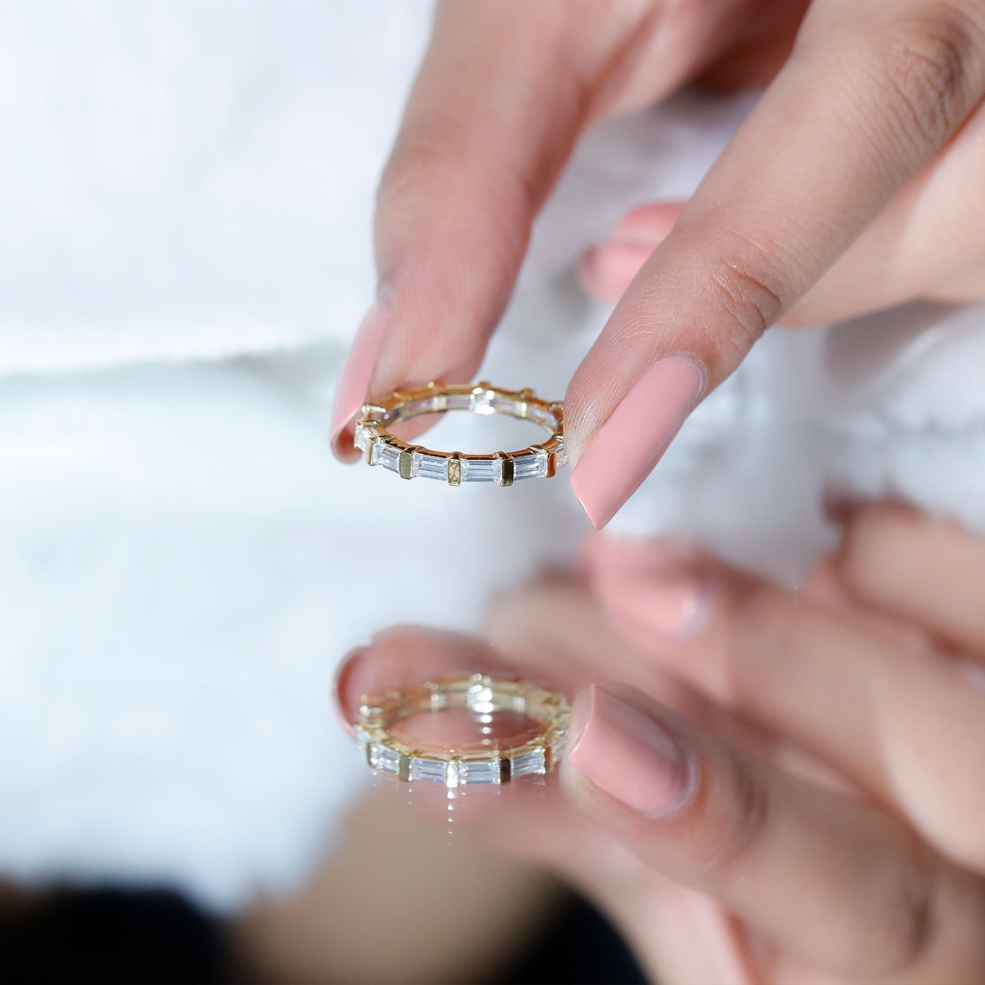 Moissanite is the best alternative to diamond for all the great reasons. The brilliant and fierce moissanite stackable wedding bands can withstand the test of time. Couple are considering moissanite wedding bands leaving behind the diamond ones as moissanite is pretty affordable. Being an Eco-friendly and cruelty-free stone gives moissanite a plus point for sustainability loving brides.