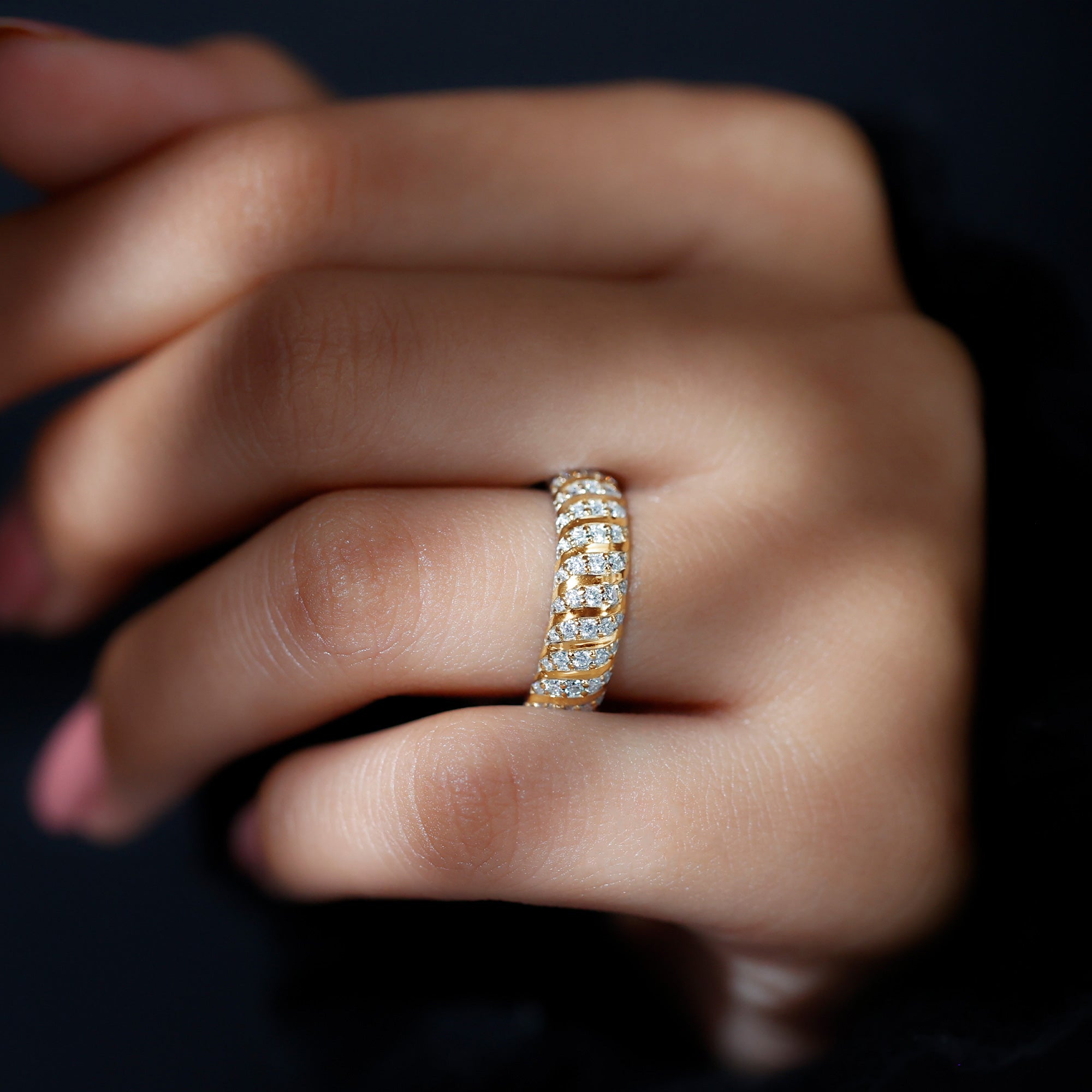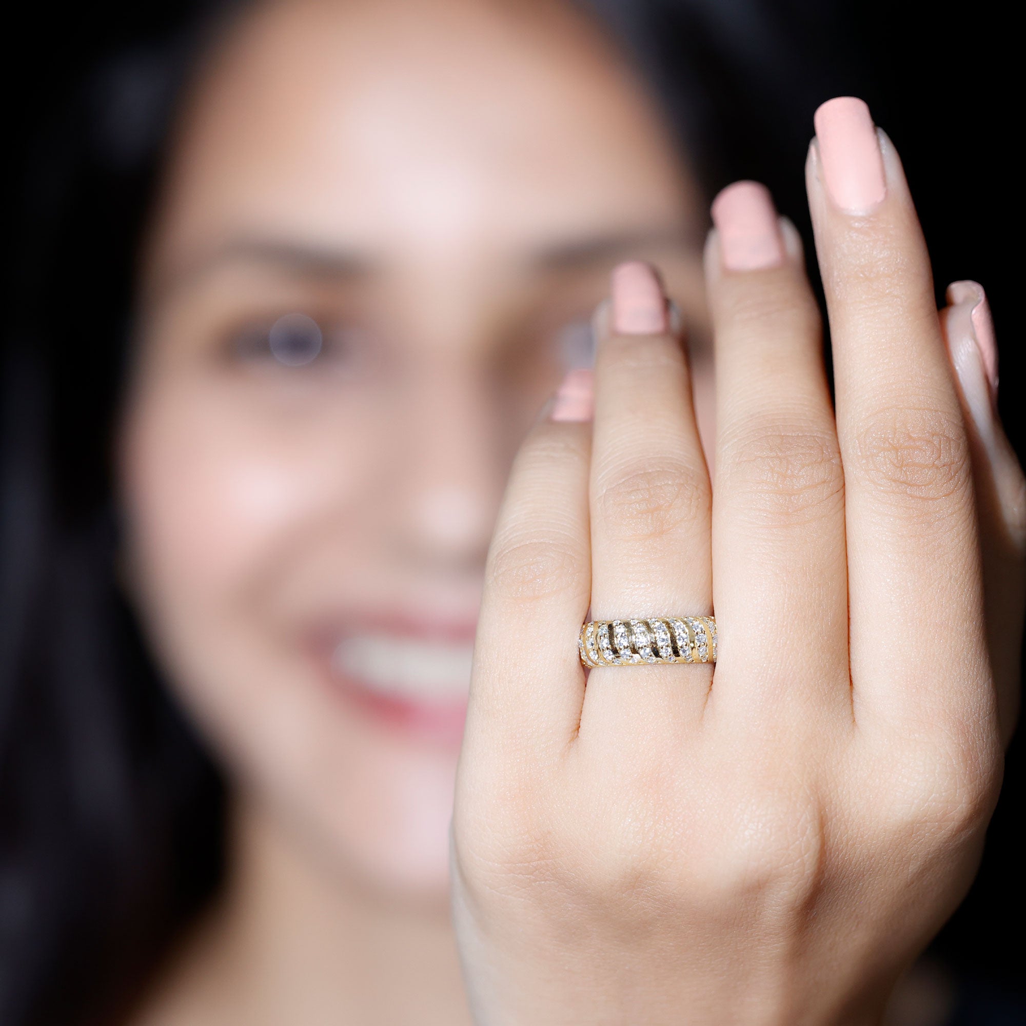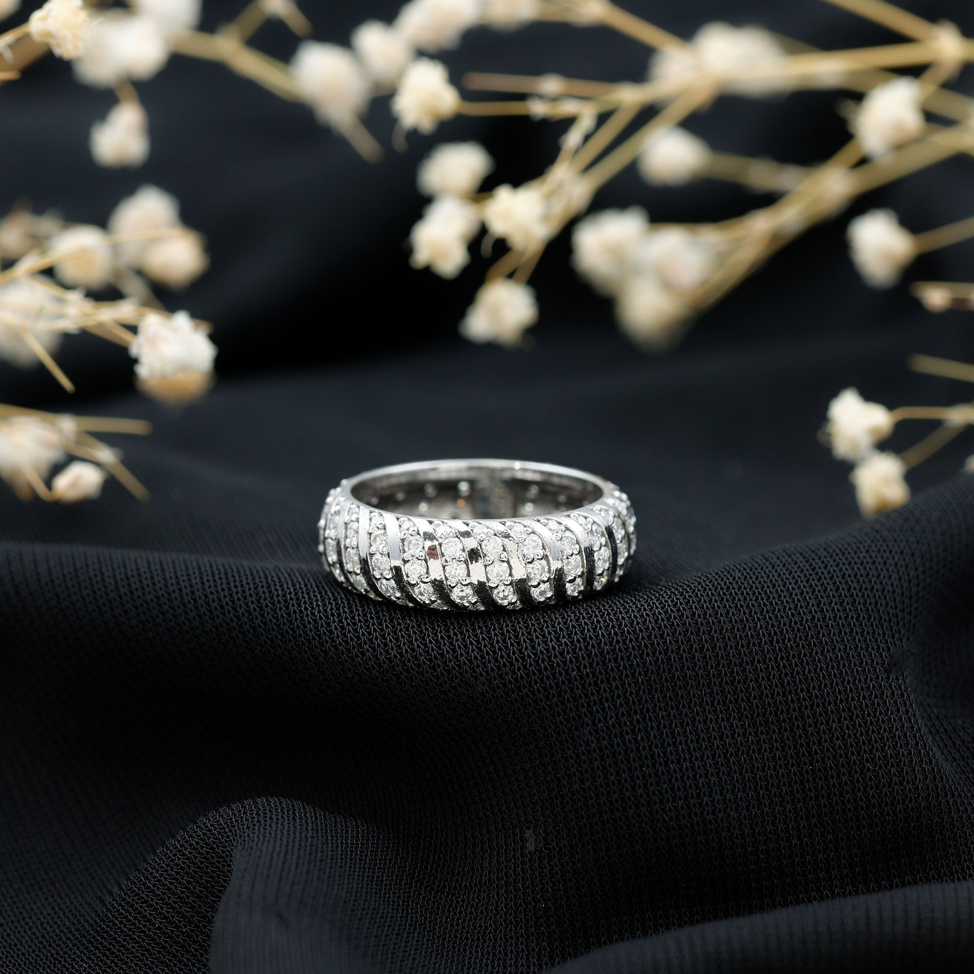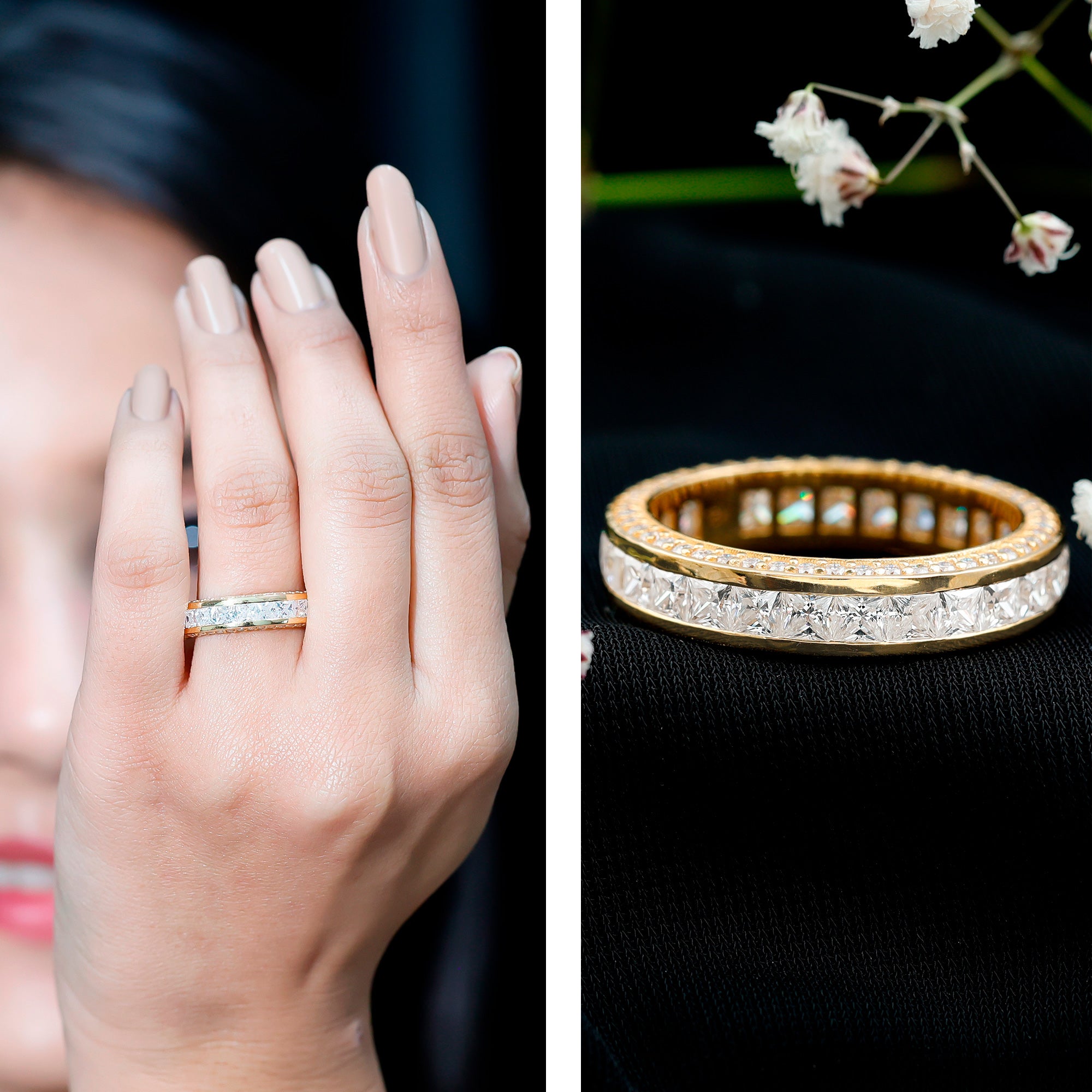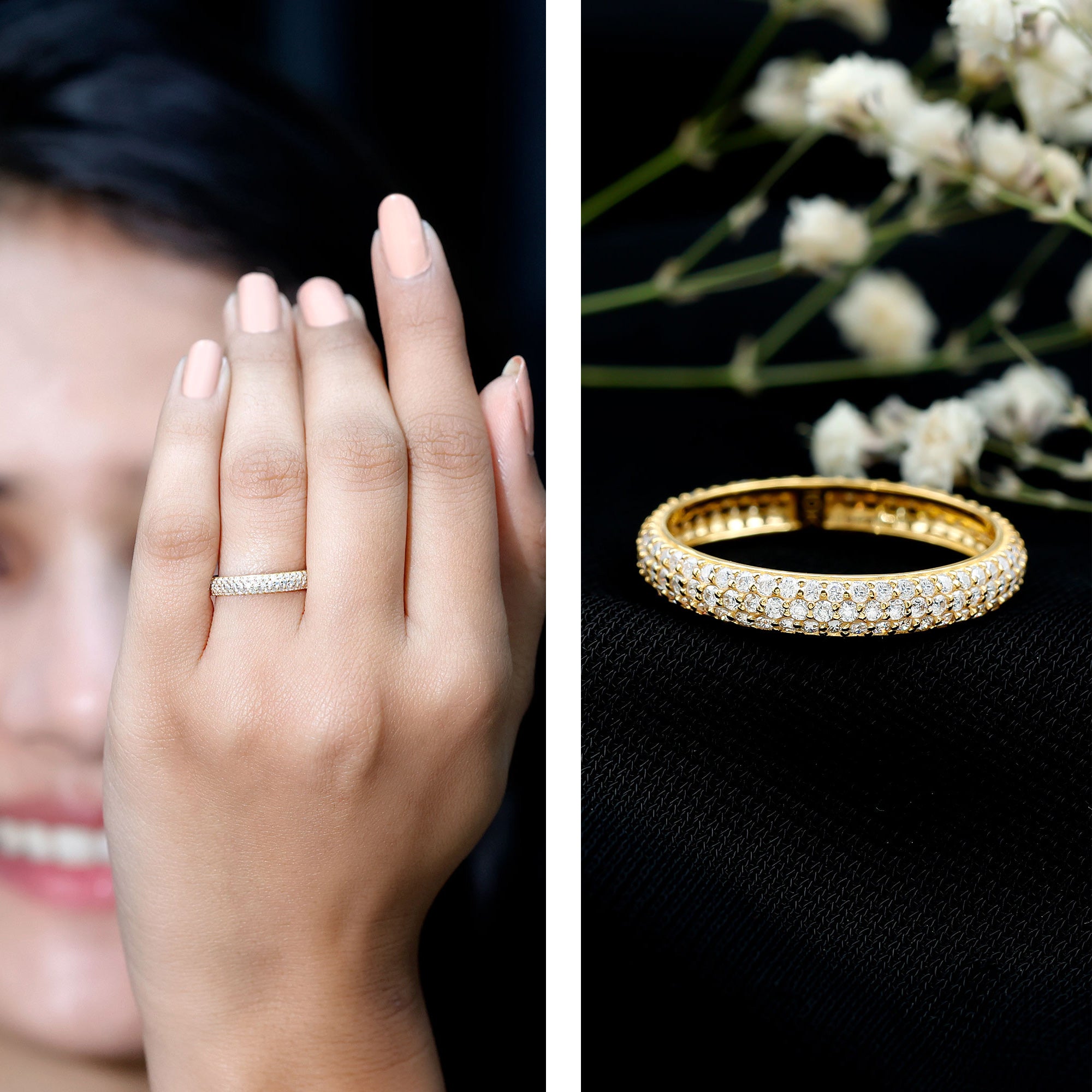 - Decide your sparkle level: Minimal accent bands are subtle; eternity-style bands deliver maximum shine.