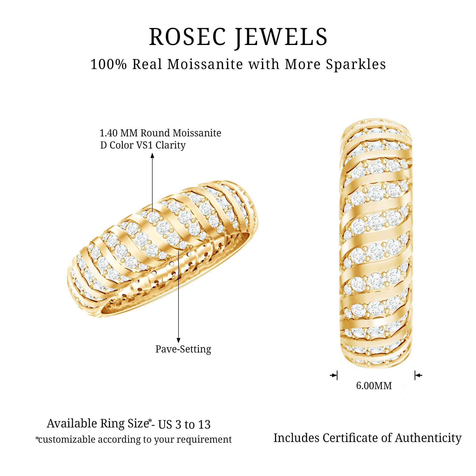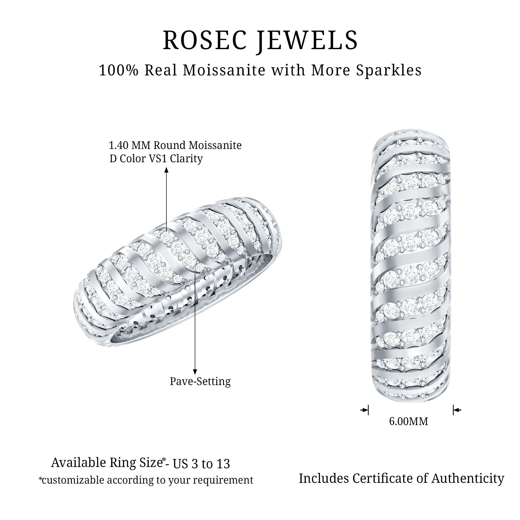 Many shoppers choose moissanite bands for their bright look, everyday practicality, and value. If you want a diamond-alternative wedding band with strong brilliance and modern appeal, moissanite is a popular option.