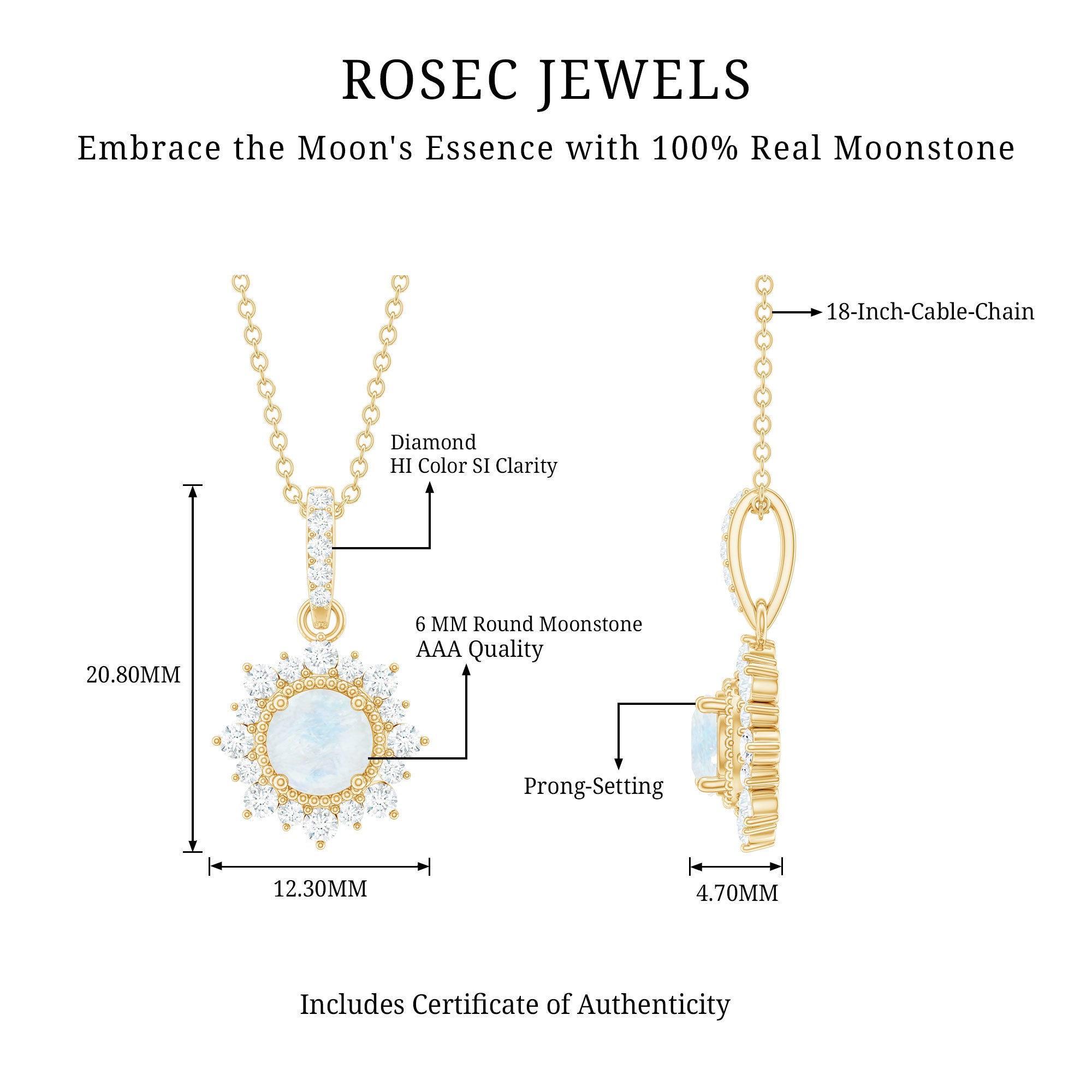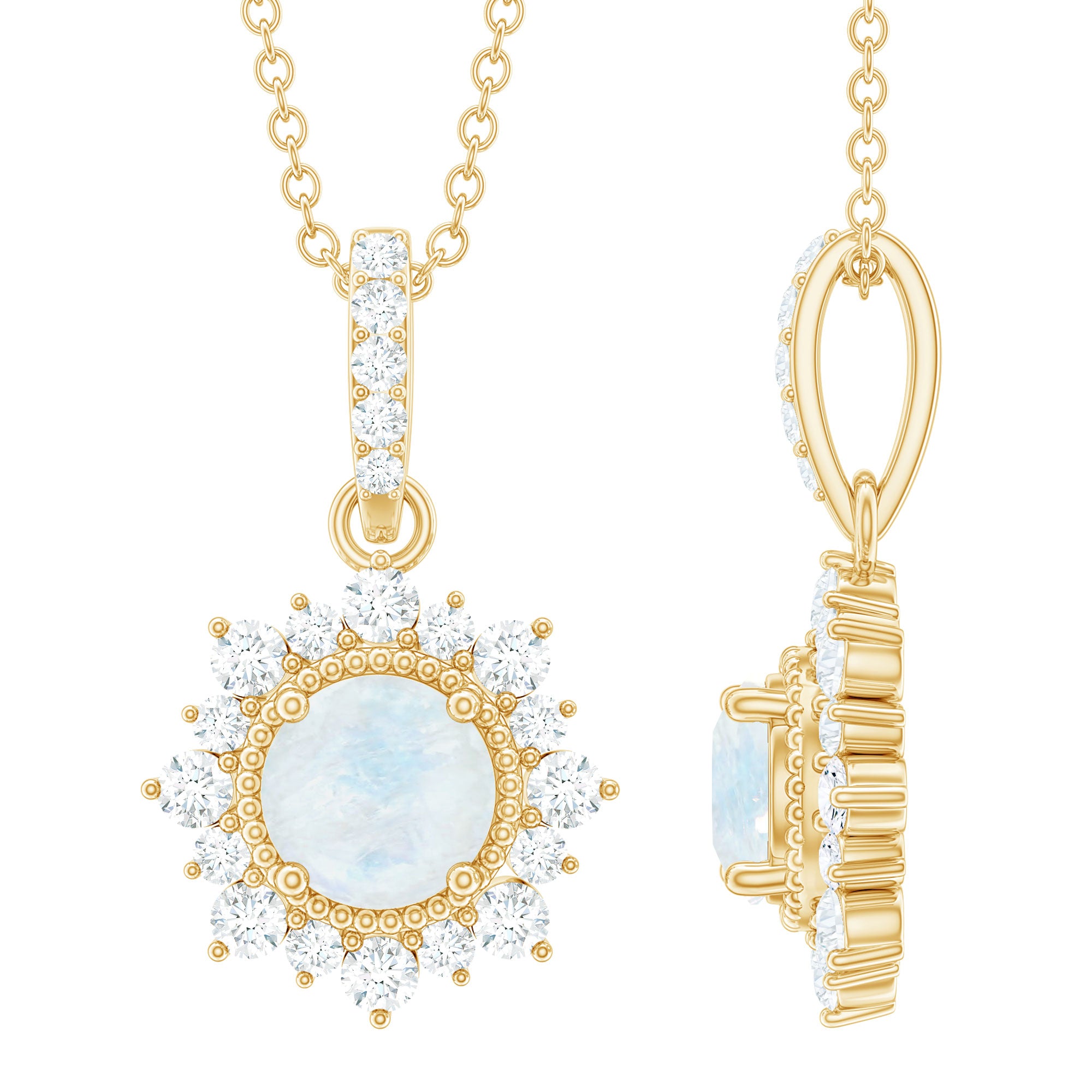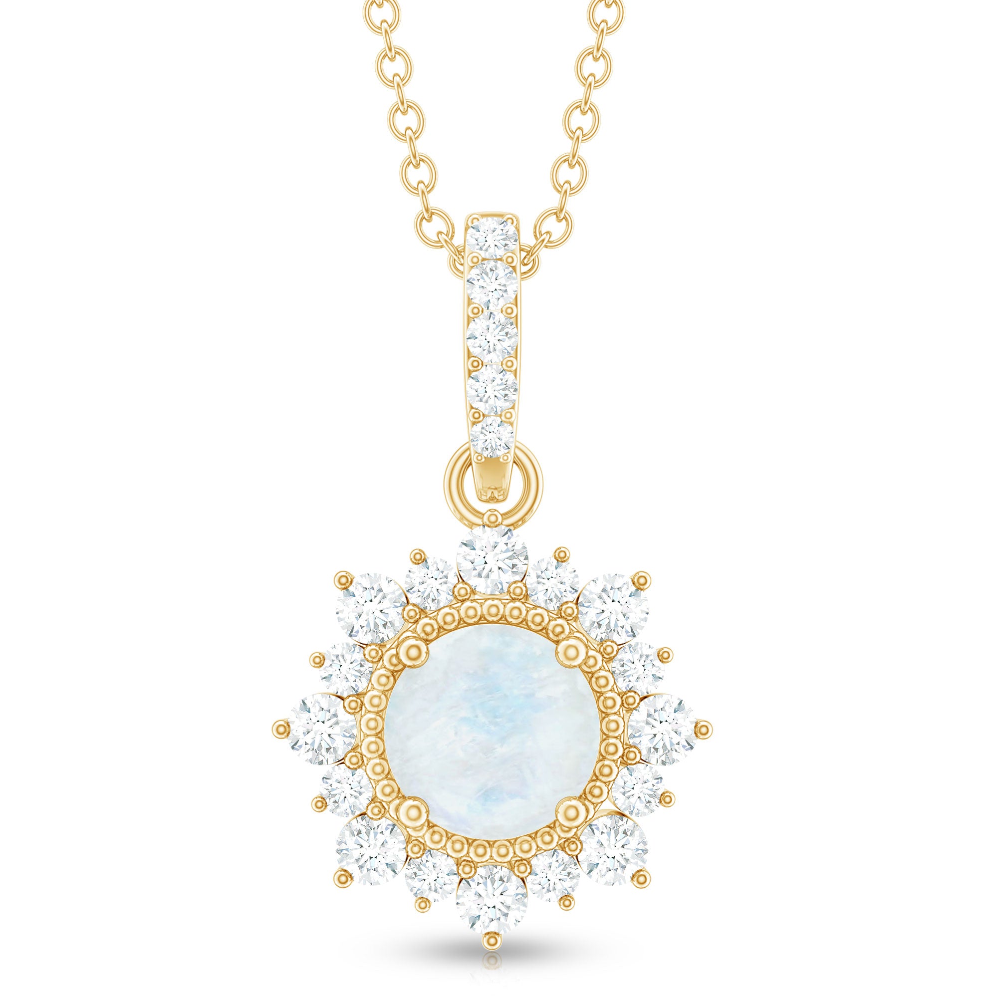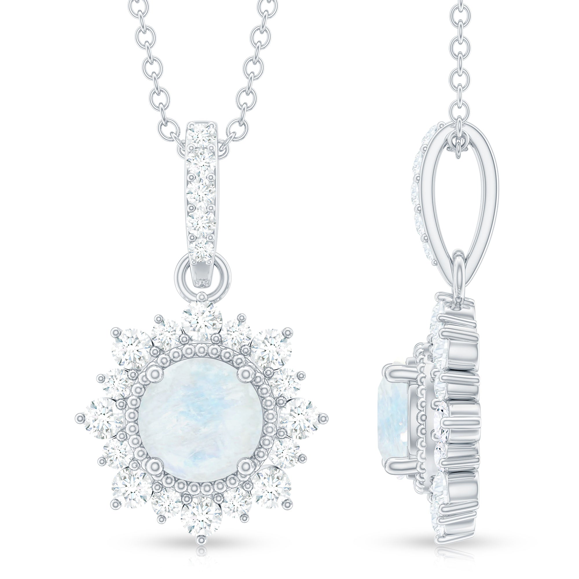 Moonstone Halo Necklaces: - These necklaces involve circling a center moonstone with other small glistening diamonds or other gemstones, enhancing the brilliance of the focal stone without increasing its carat weight. This halo design will forever make a fashion statement. Their versatility is enough to align with any attire, whether it's casual or occasional, it'll look classy.