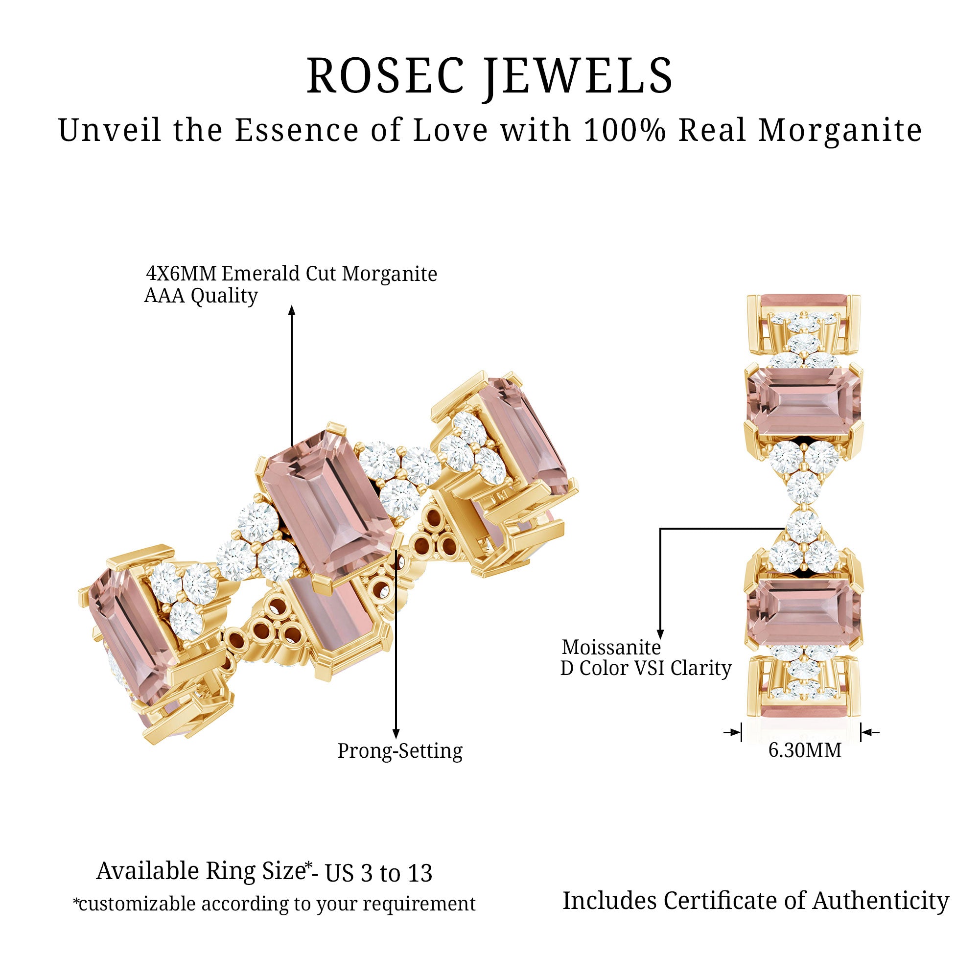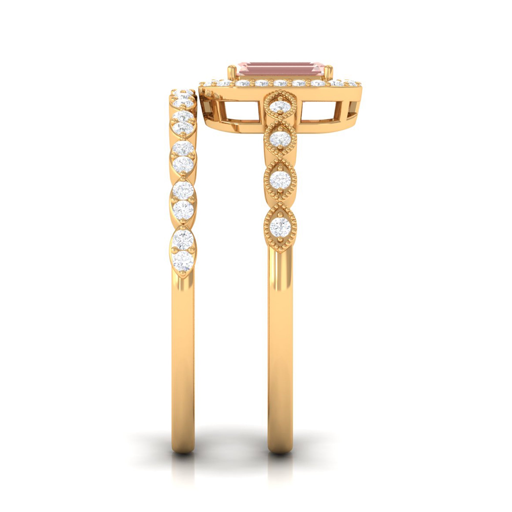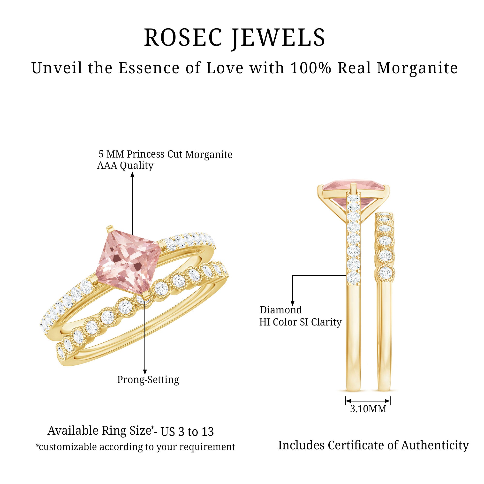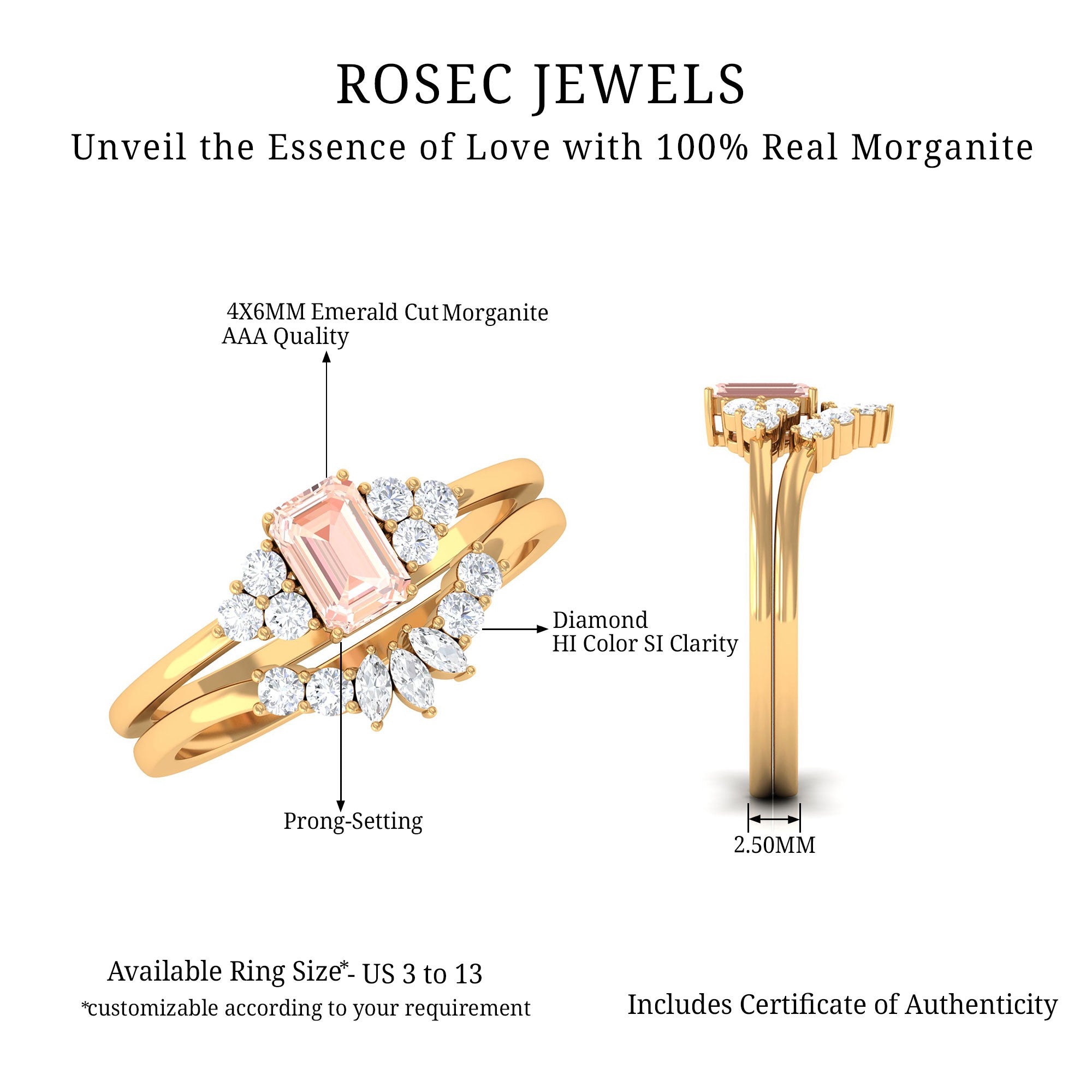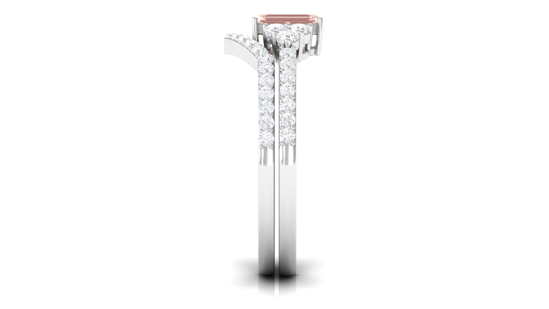 The delicate and romantic pink saturation of morganites enable our craftsmen to combine them with different colors of gold further helping us to curate fantastic morganite wedding band in white gold, yellow gold and rose gold. The great diversity in our engagement and wedding ring collection is achieved by different morganite shapes, settings and metal embellishments. Therefore, Rosec Jewels’ alluring collection of morganite wedding rings will best appeal to the women with an eye for delicate details and romantic pink hues.