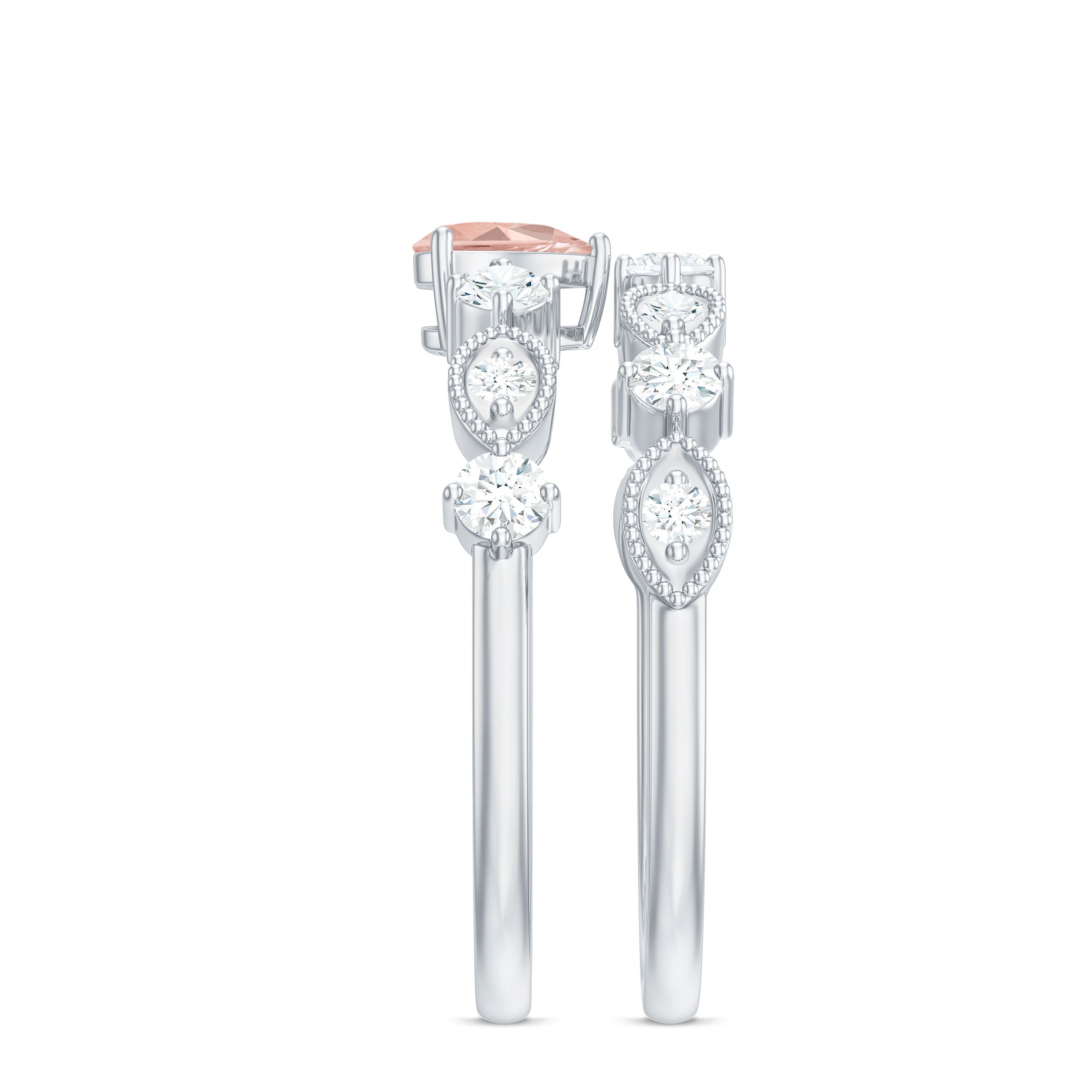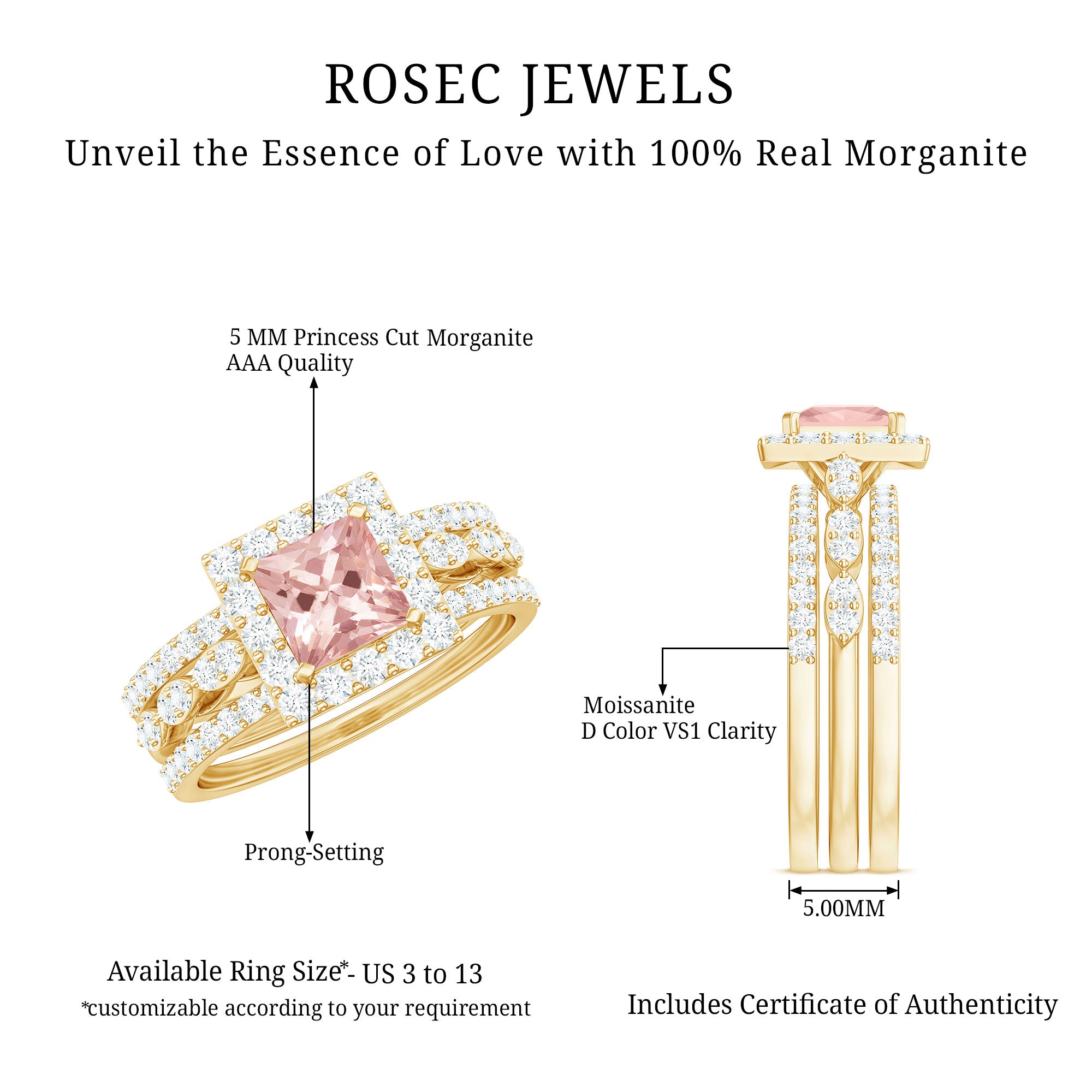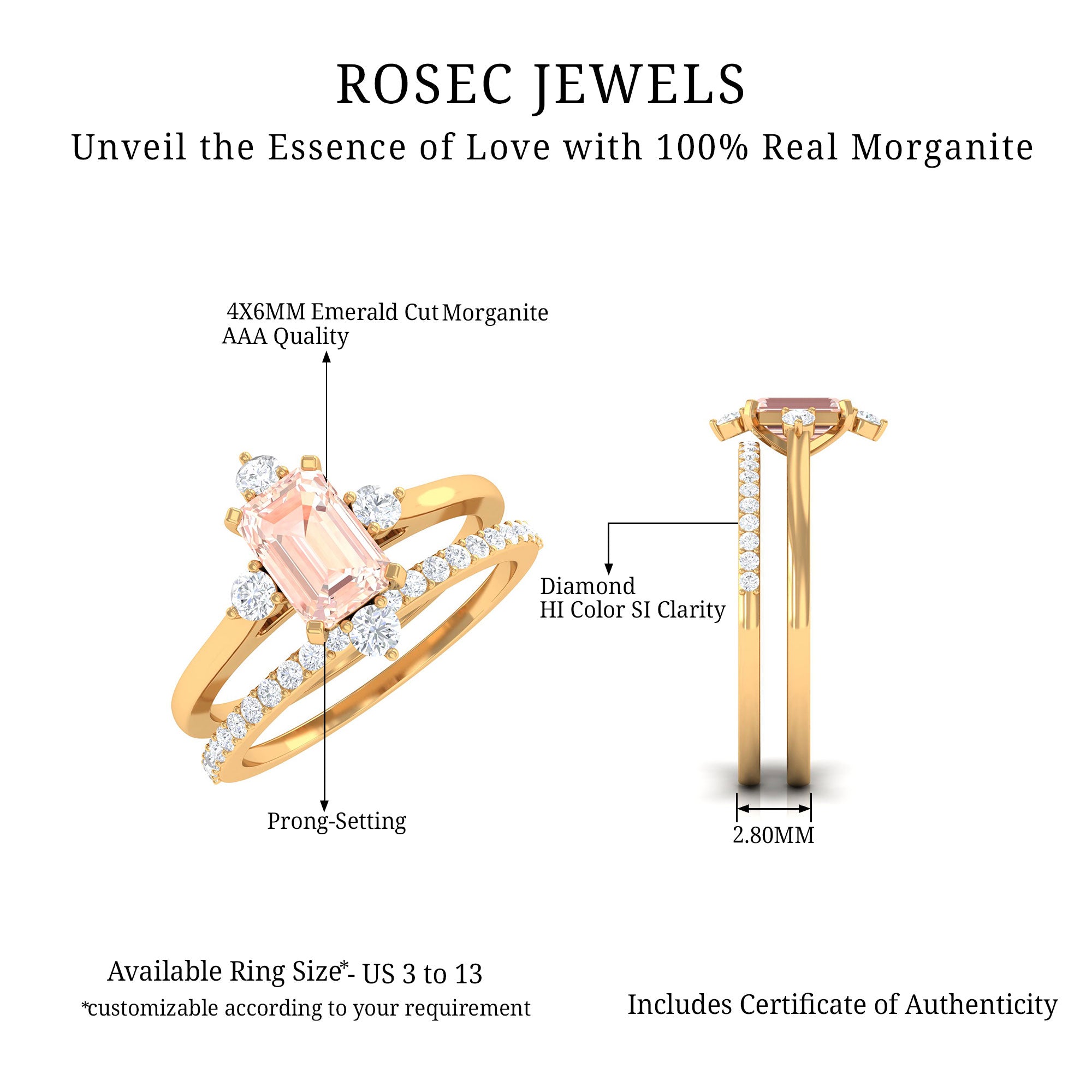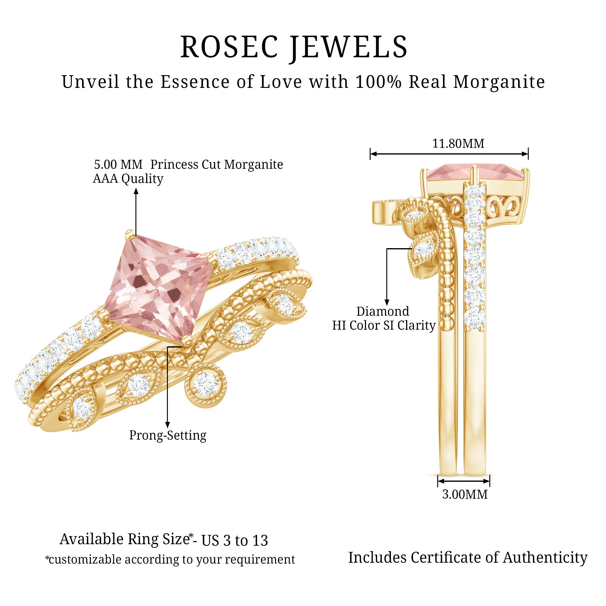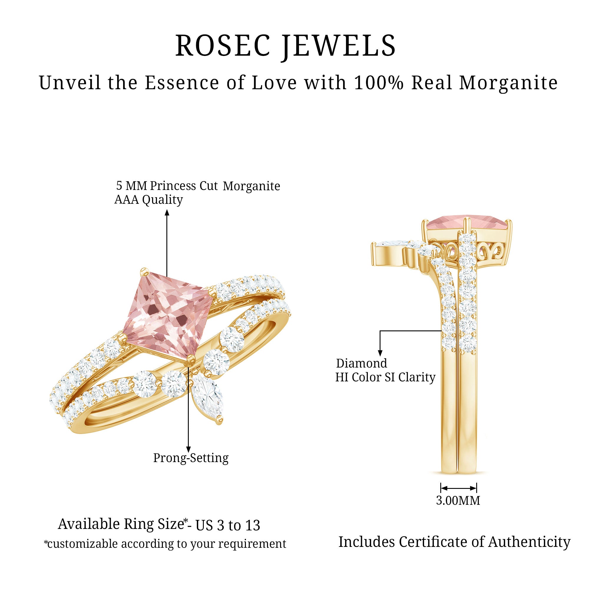 The delicate and romantic pink saturation of morganites enable our craftsmen to combine them with different colors of gold further helping us to curate fantastic morganite wedding band in white gold, yellow gold and rose gold. The great diversity in our engagement and wedding ring collection is achieved by different morganite shapes, settings and metal embellishments. Therefore, Rosec Jewels’ alluring collection of morganite wedding rings will best appeal to the women with an eye for delicate details and romantic pink hues.