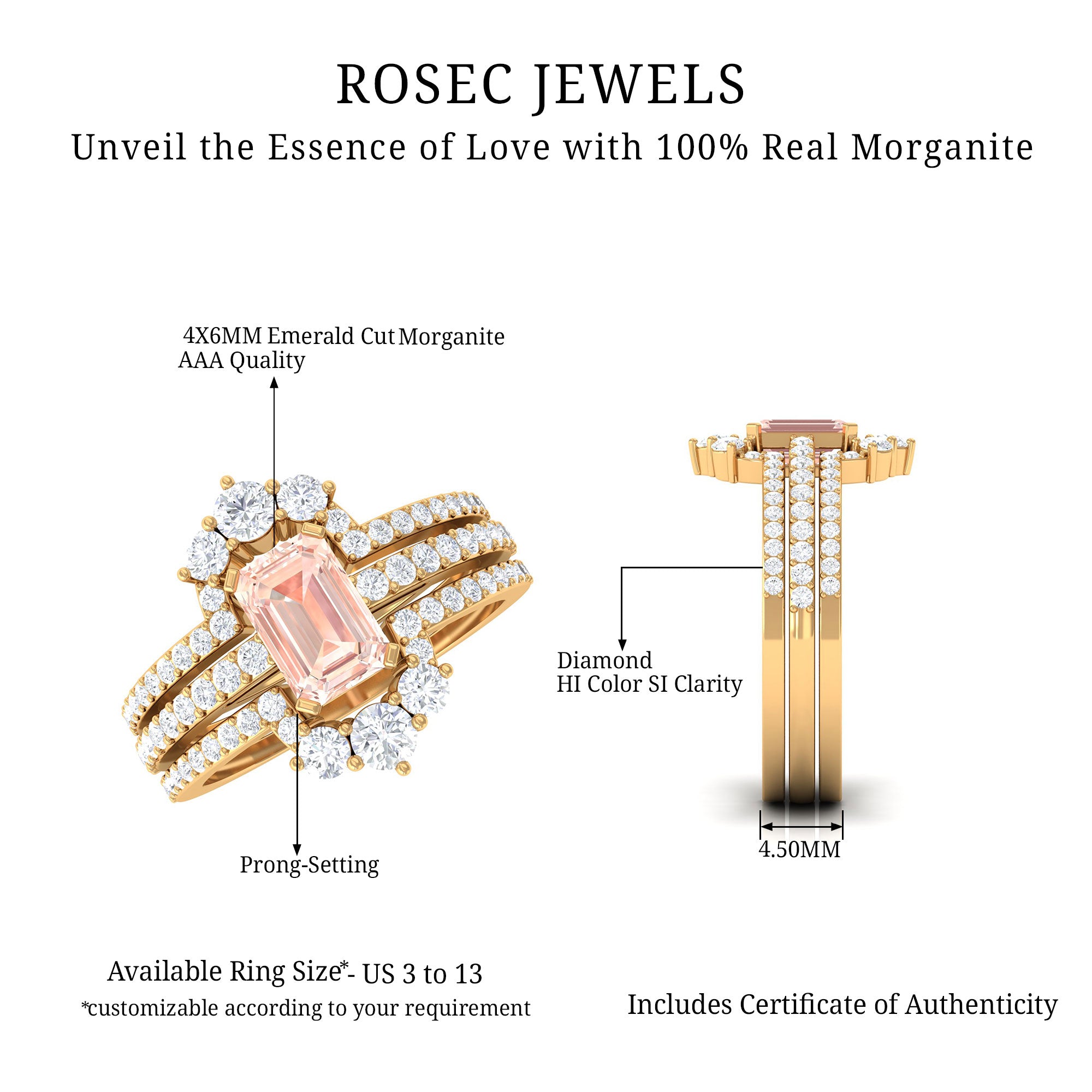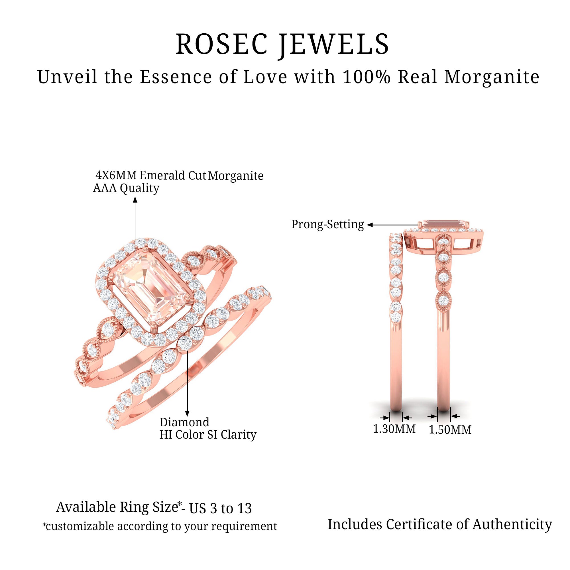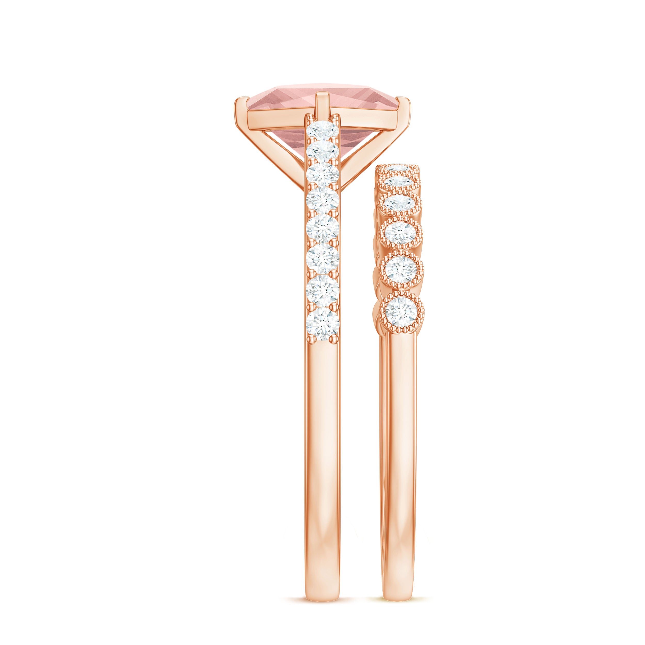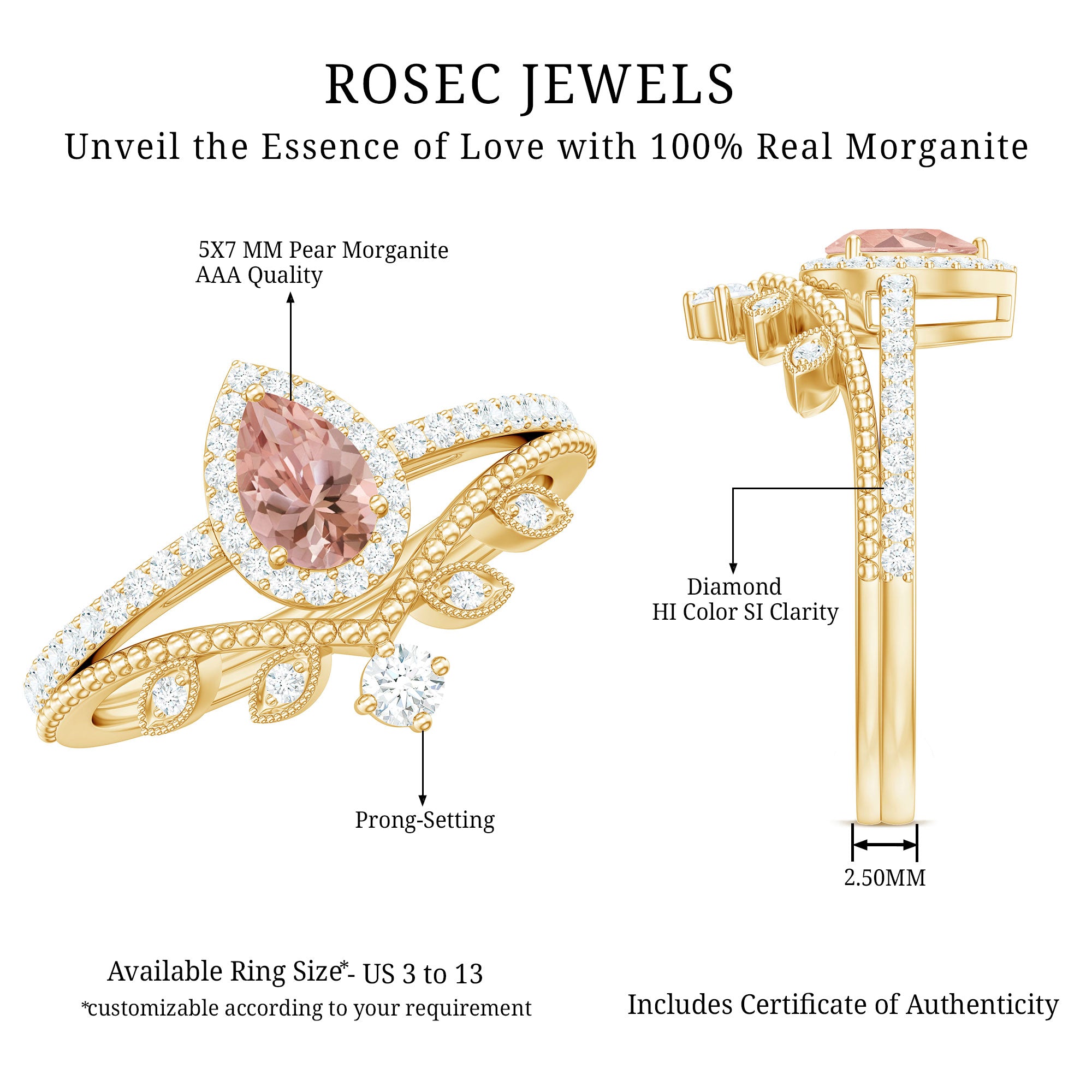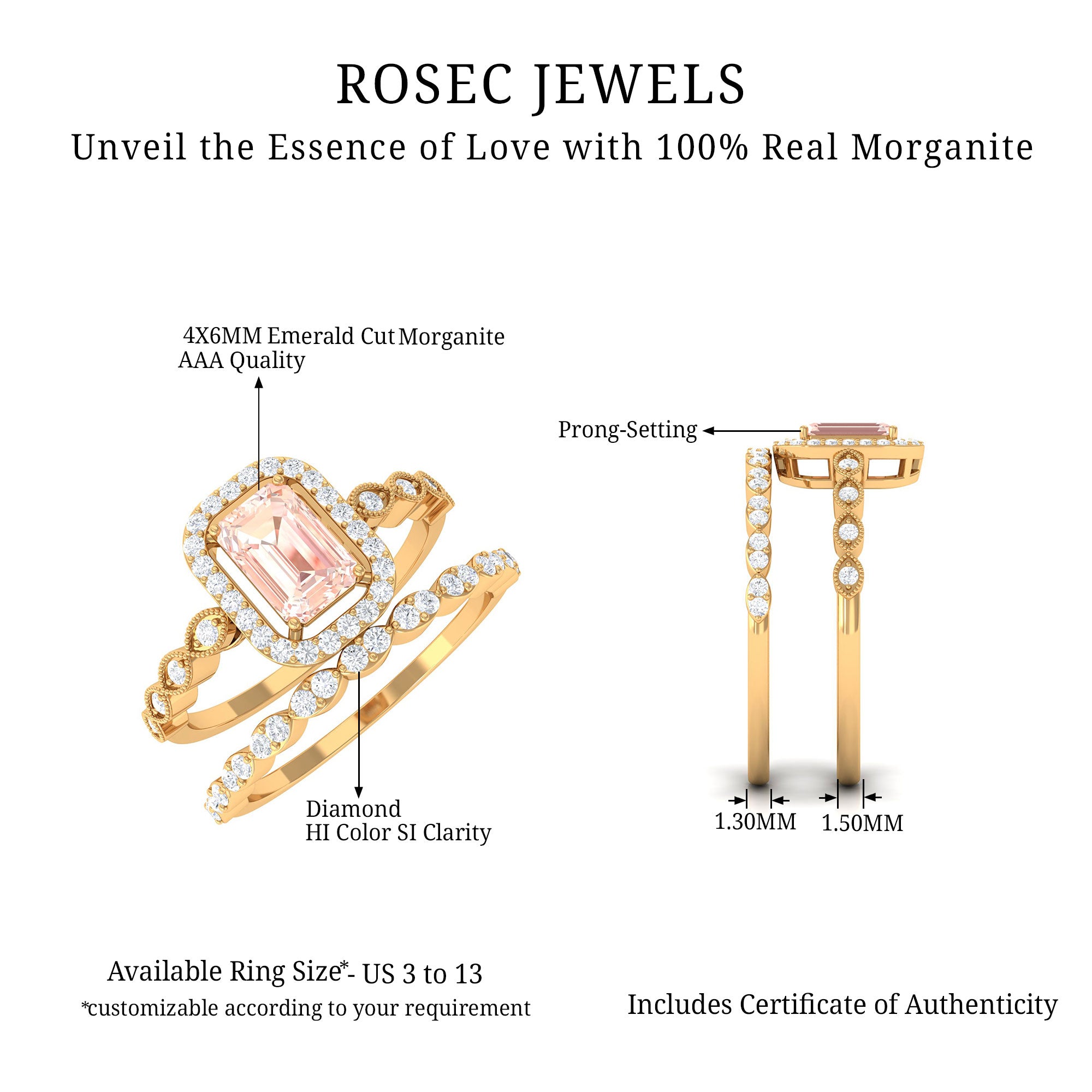 The delicate and romantic pink saturation of morganites enable our craftsmen to combine them with different colors of gold further helping us to curate fantastic morganite wedding band in white gold, yellow gold and rose gold. The great diversity in our engagement and wedding ring collection is achieved by different morganite shapes, settings and metal embellishments. Therefore, Rosec Jewels’ alluring collection of morganite wedding rings will best appeal to the women with an eye for delicate details and romantic pink hues.