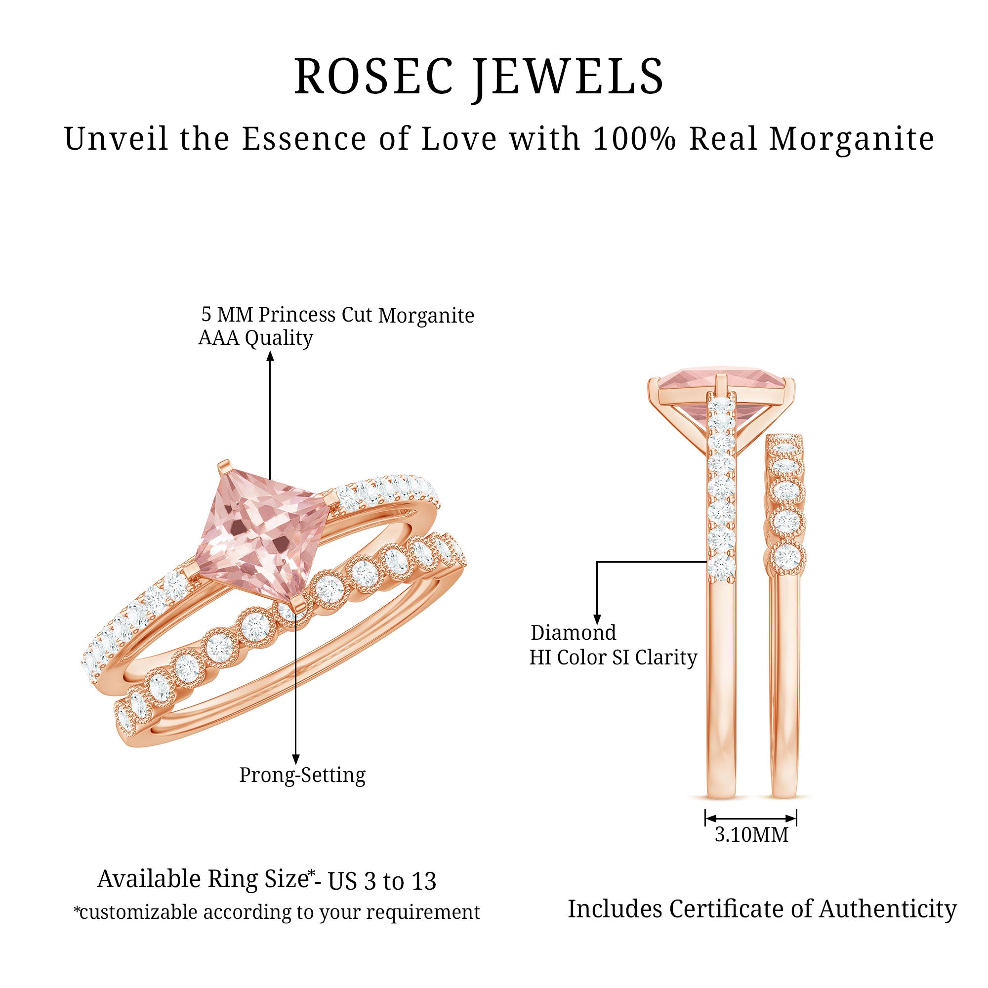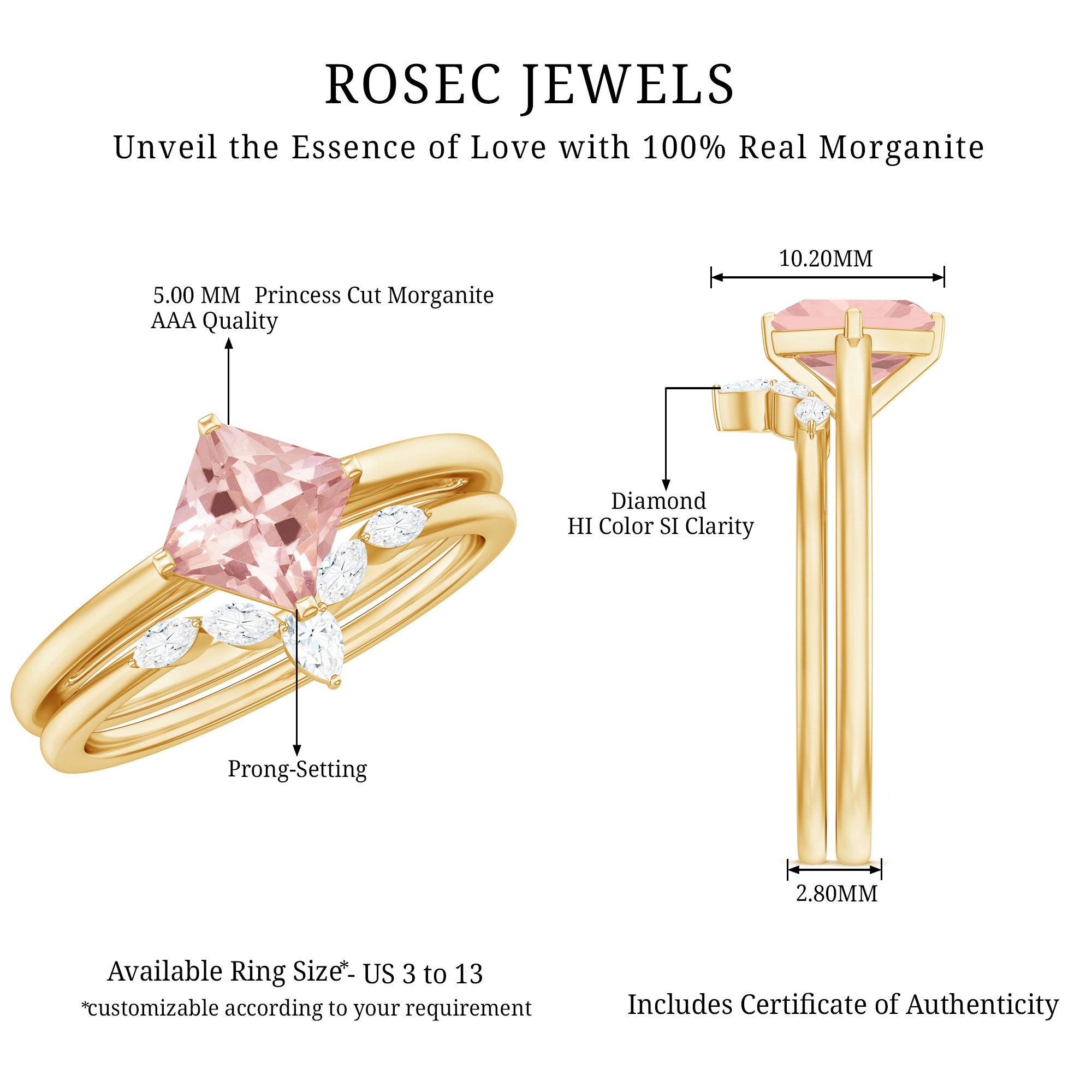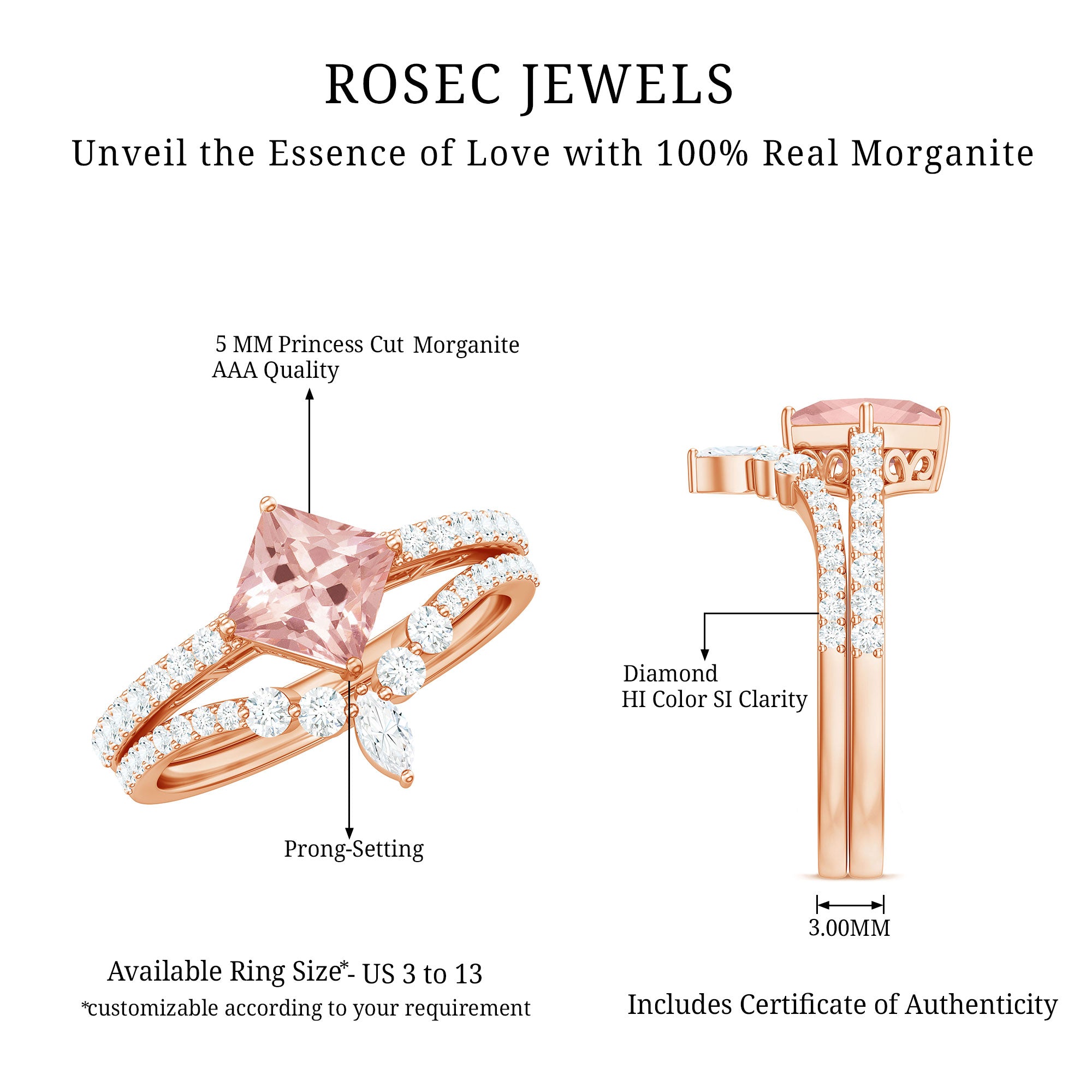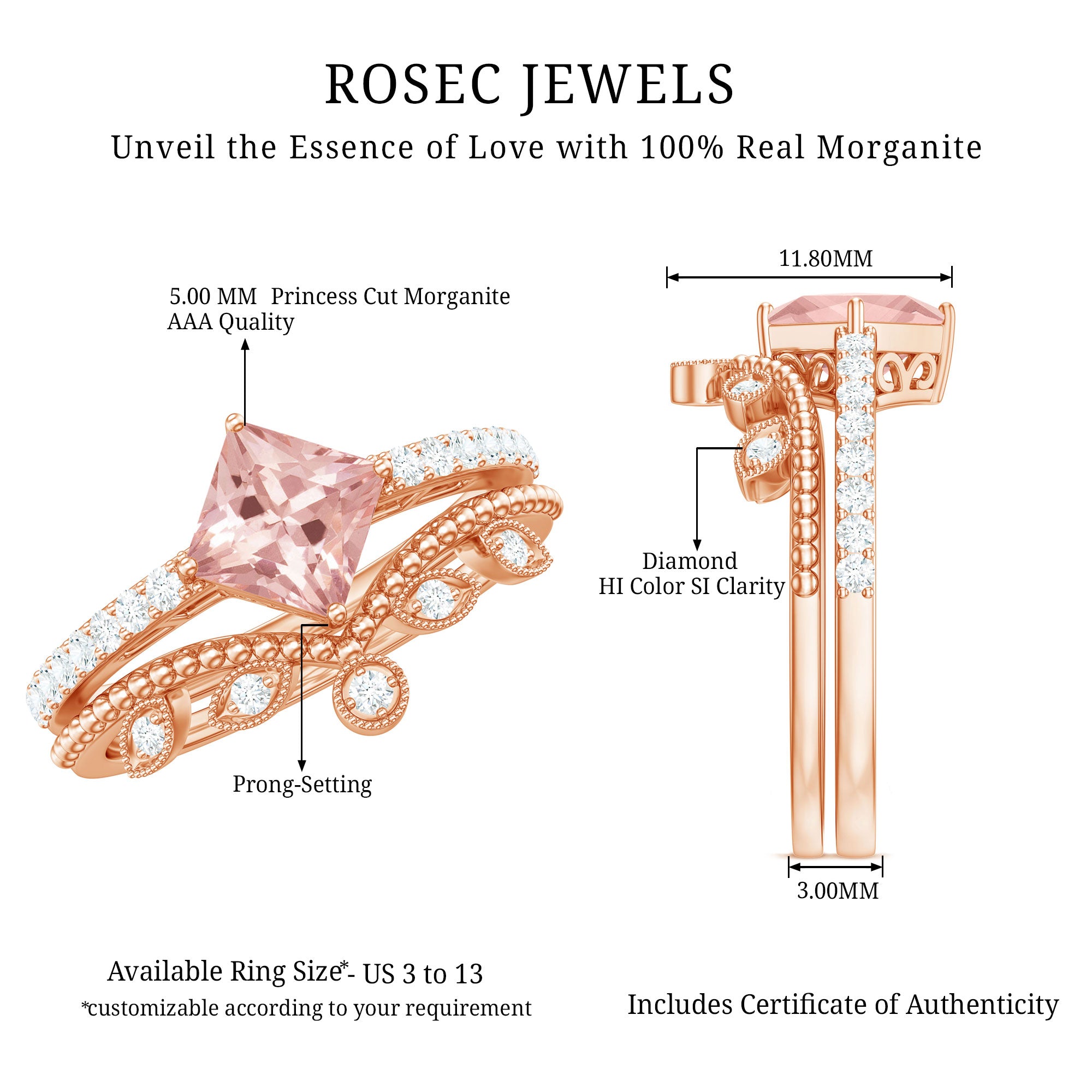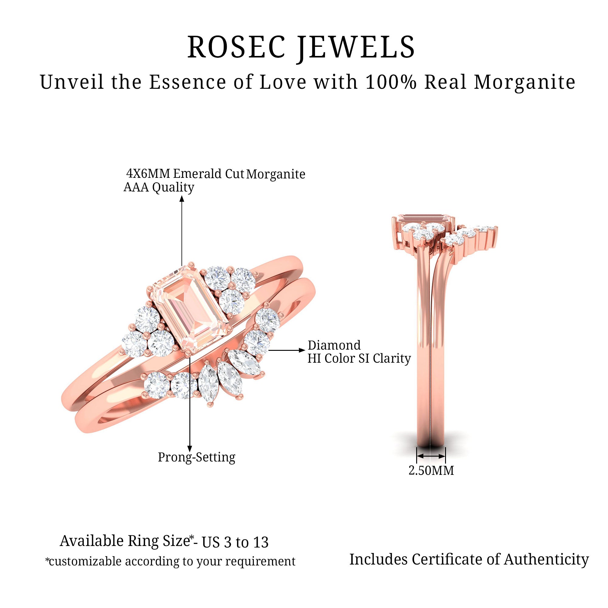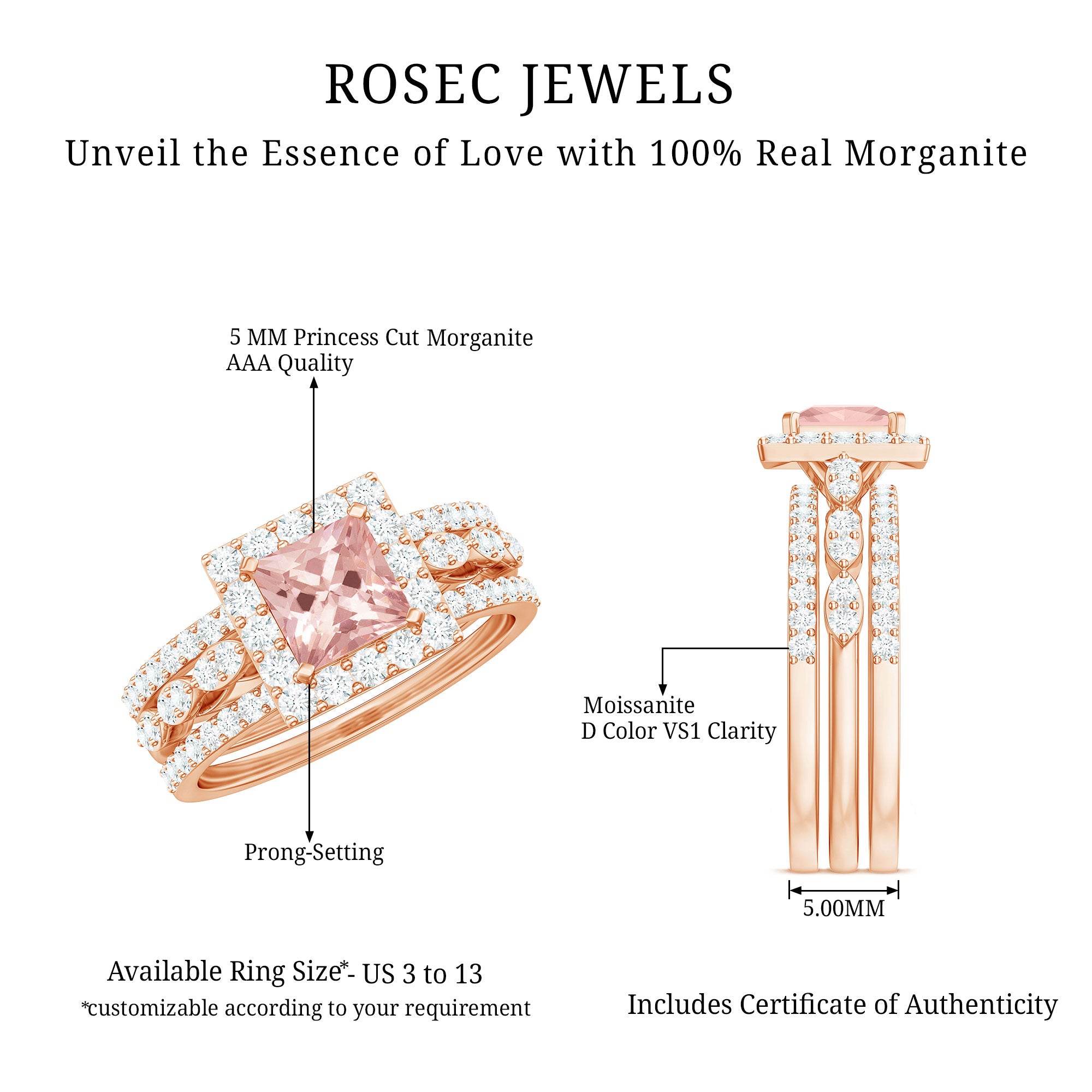 The delicate and romantic pink saturation of morganites enable our craftsmen to combine them with different colors of gold further helping us to curate fantastic morganite wedding band in white gold, yellow gold and rose gold. The great diversity in our engagement and wedding ring collection is achieved by different morganite shapes, settings and metal embellishments. Therefore, Rosec Jewels’ alluring collection of morganite wedding rings will best appeal to the women with an eye for delicate details and romantic pink hues.