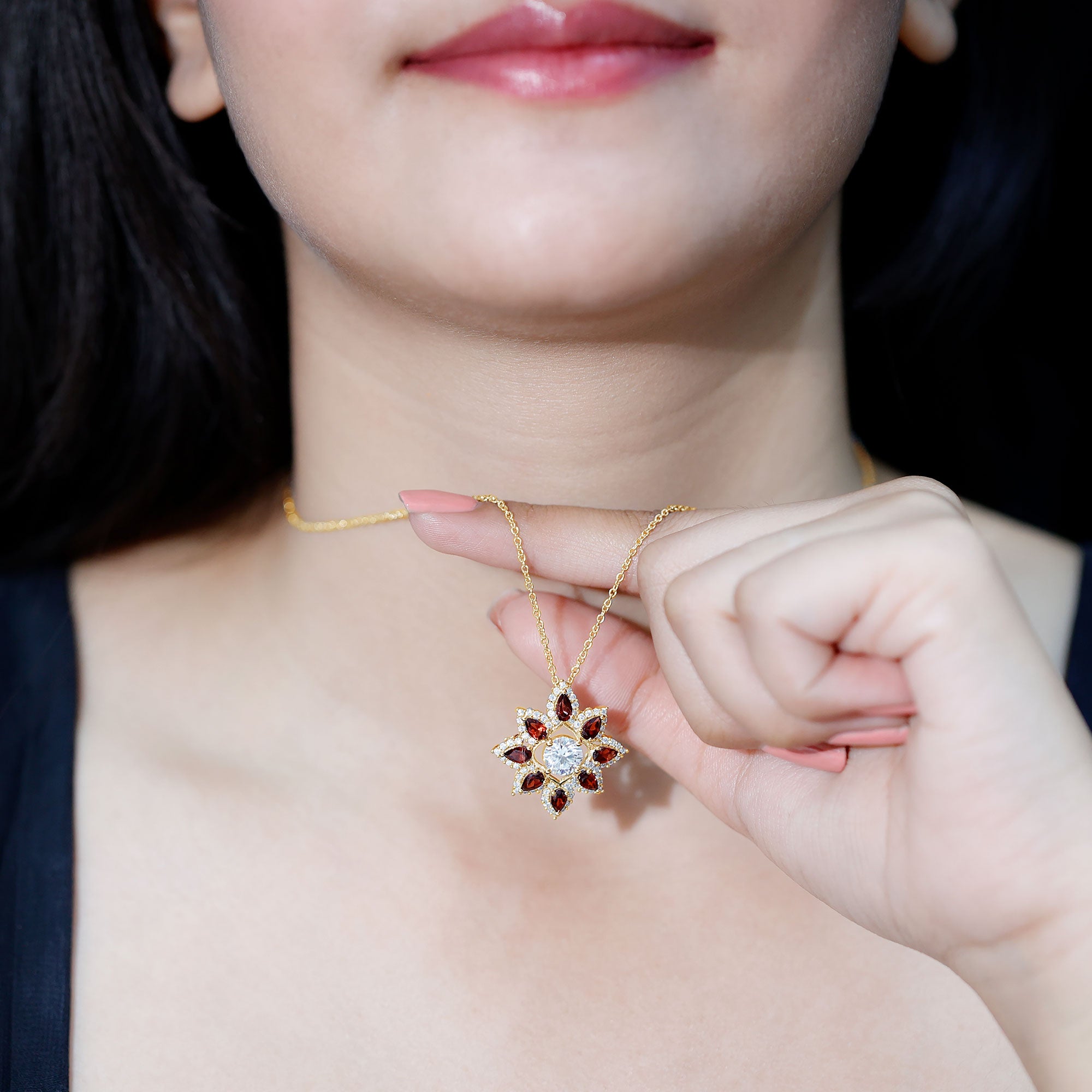 If you are looking for cooler, colorful gemstones then opal, aquamarine, and tanzanite with soft hues, can be good options for your necklaces. The stone of inspiration, or Opal gemstone, is popular for its play of color, while aquamarine, popular as a calming gemstone, is also called the gem of the sea. And if you prefer shimmer with brilliance in your necklace, then affordable and durable moissanite gems can be an apt choice. Amethyst and garnet with royal purple and deep red tone are bold choices in gemstones for your necklace.