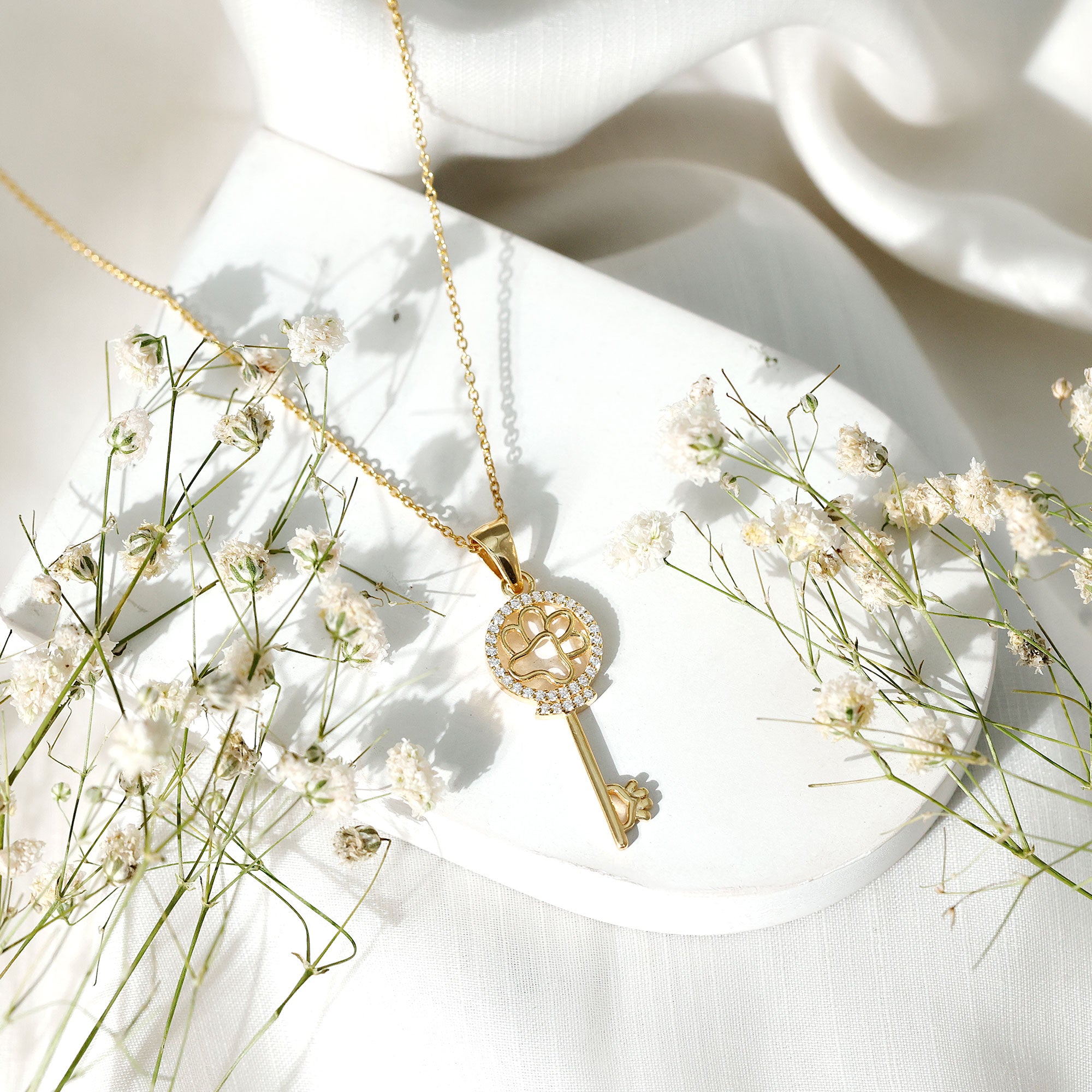 Key Necklace: Key shaped metal frame is adorned with dainty gemstones in necklaces, and is chosen to represent freedom, milestones, unlocking new beginnings.