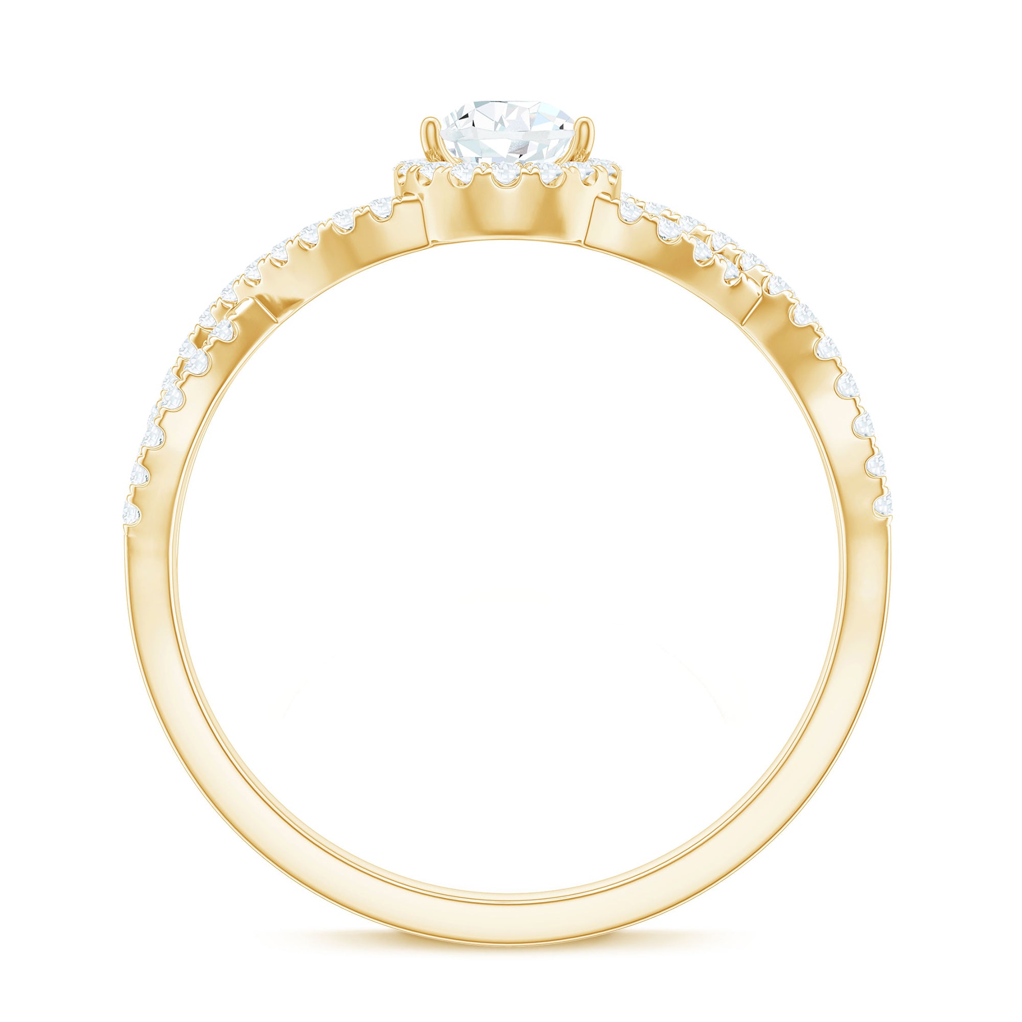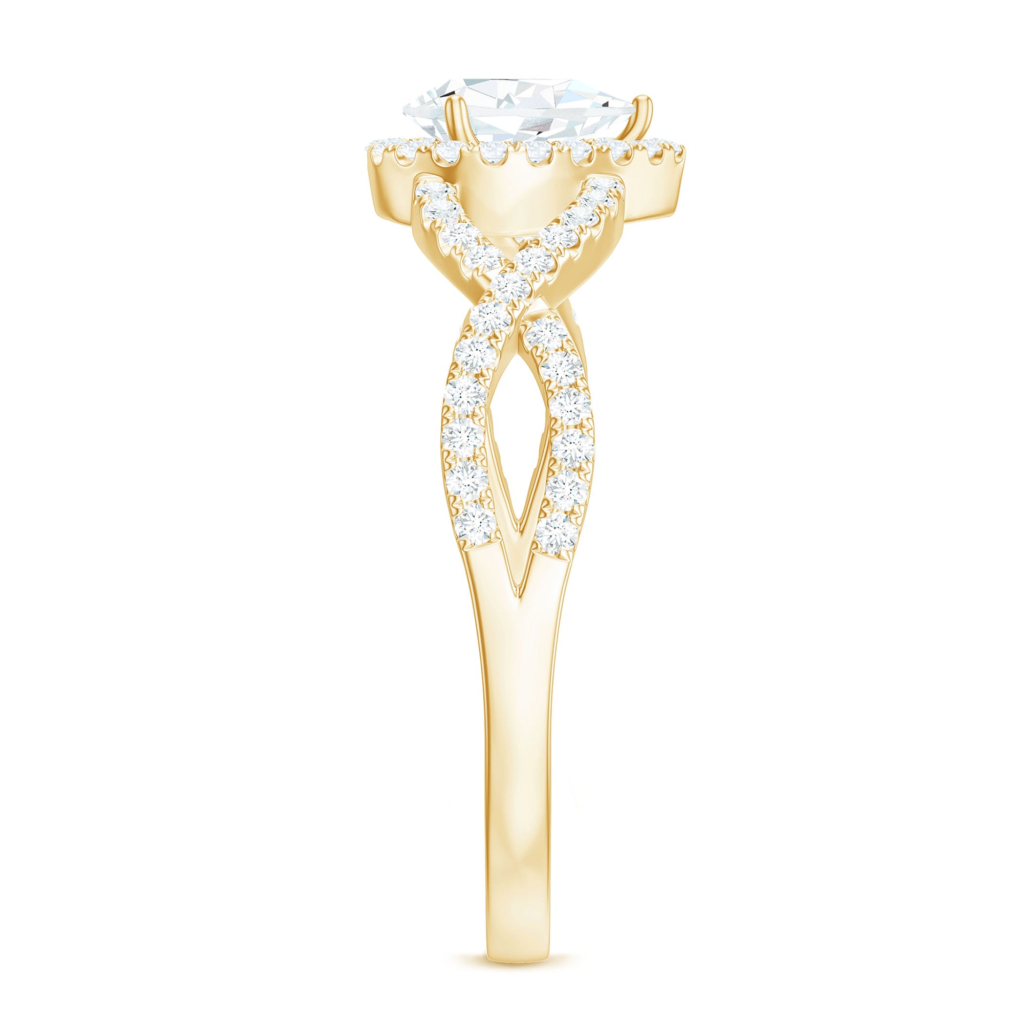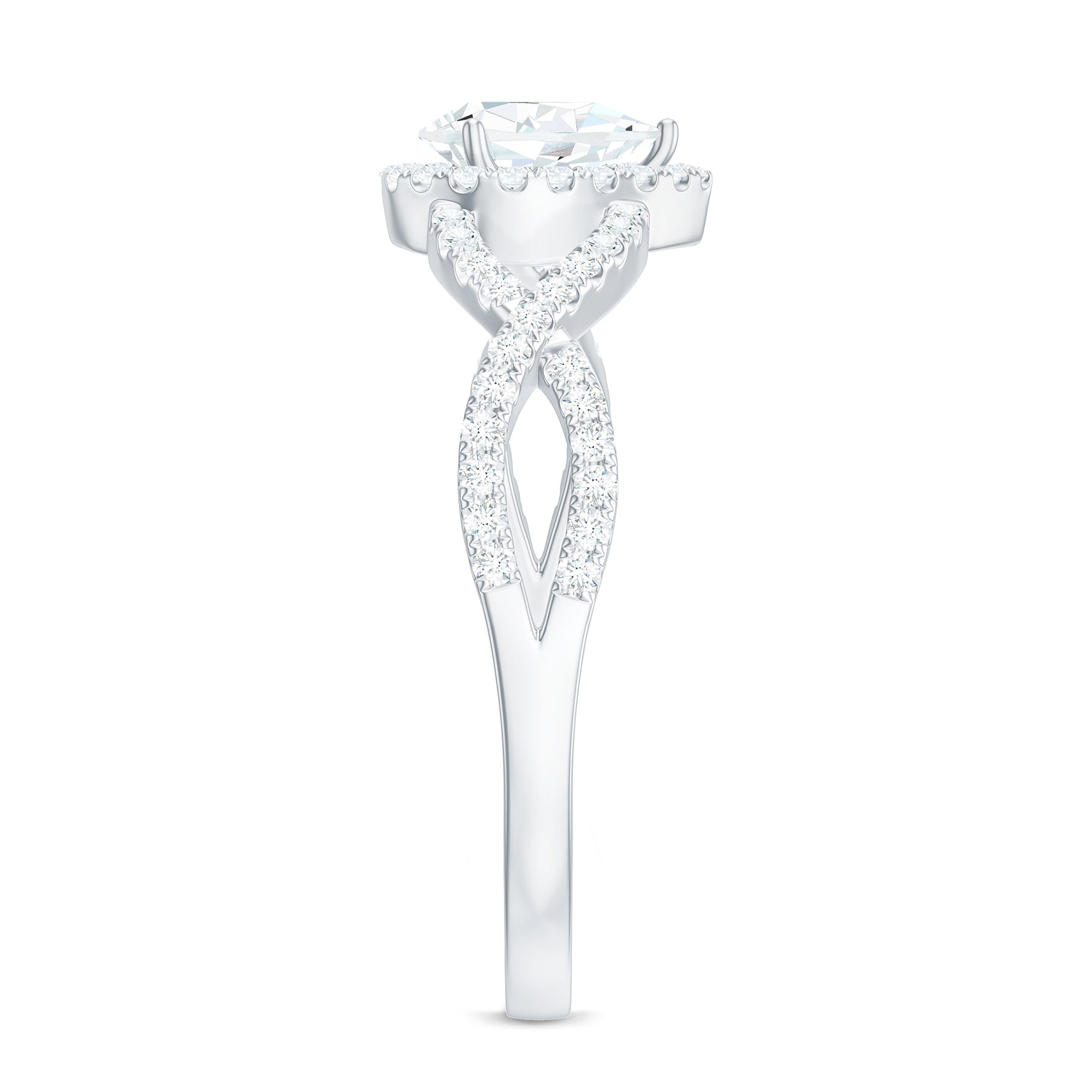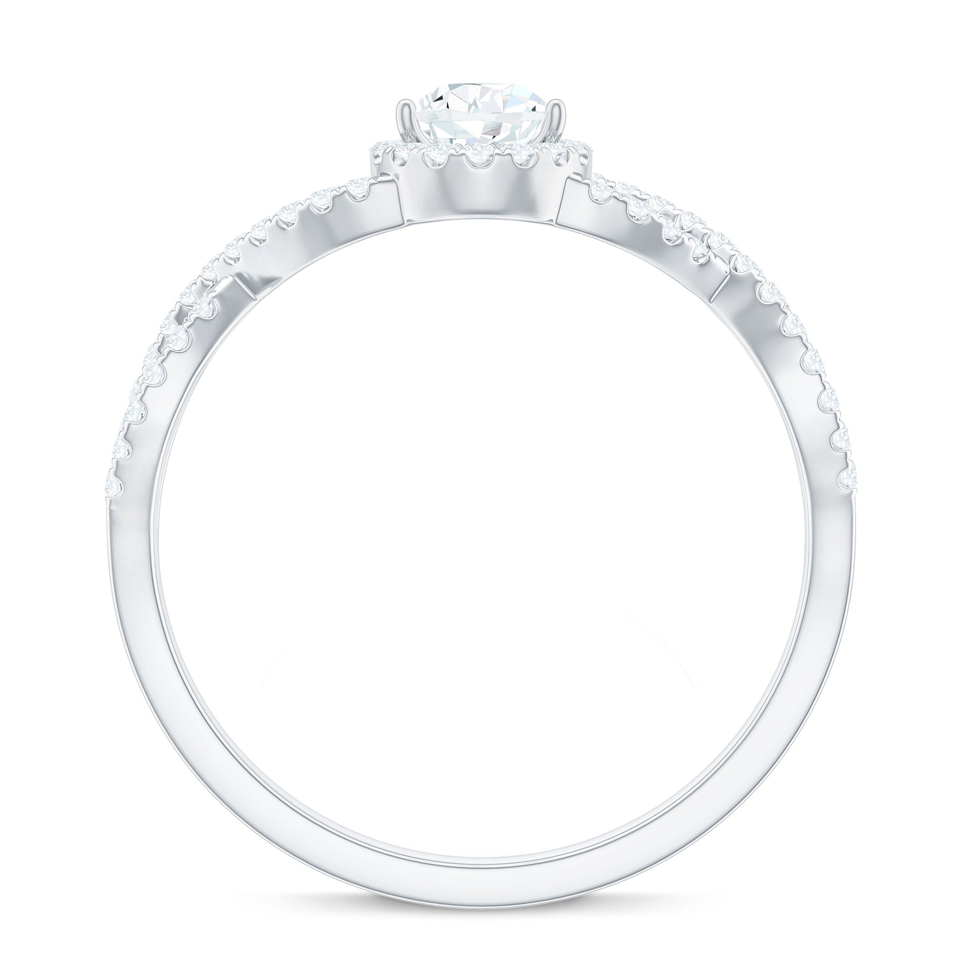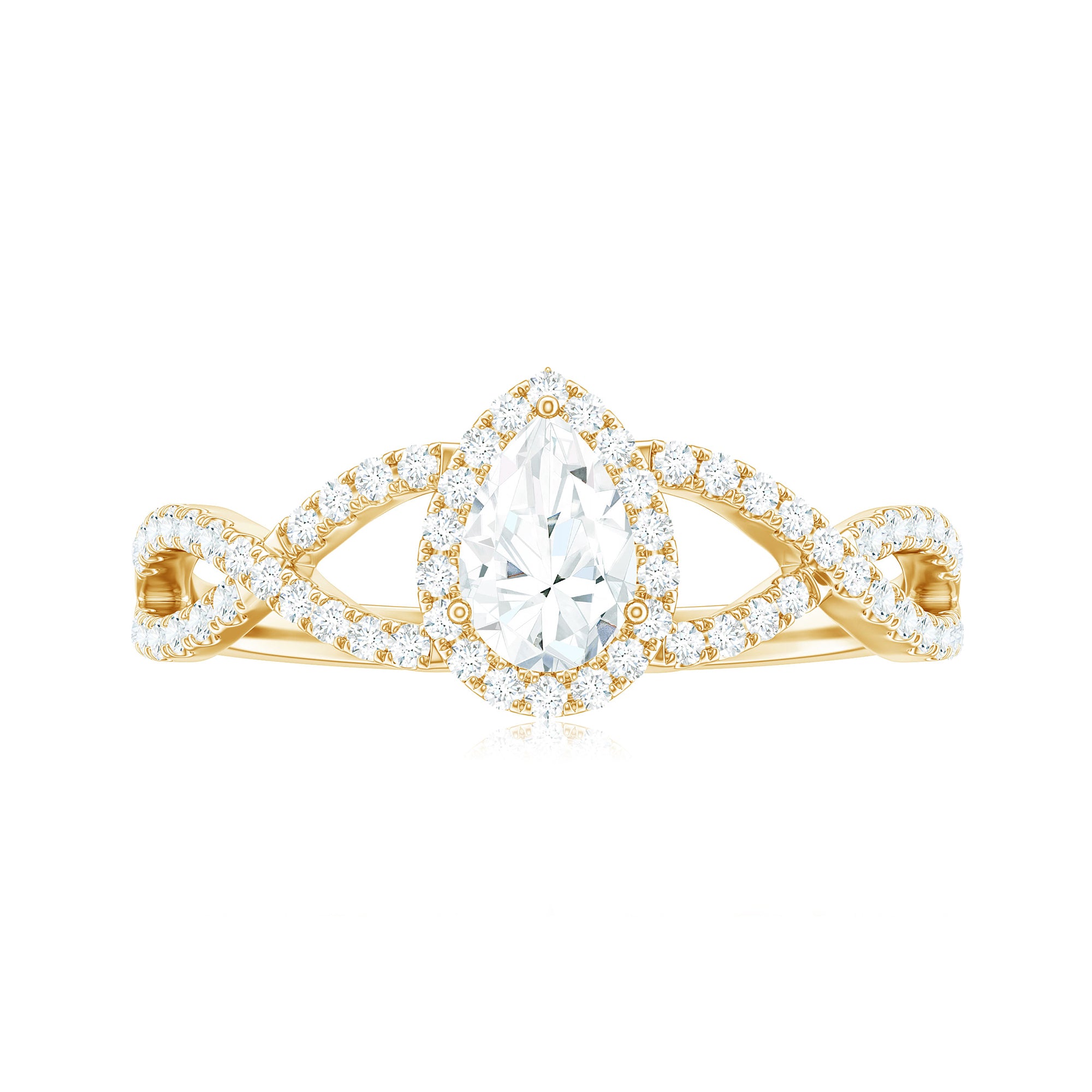 Halo Setting: A halo setting encircles the pear-shaped gem with smaller gemstones, enhancing its sparkle. The halo pattern can be of identical or different gemstones, usually round in shape. It is all about adding an intricate as well as luxurious touch to the gemstone and the overall ring design. In a pear-shaped diamond band, the accent of other gemstones, shining or colored, makes the center stone's shape more beautiful and adds meaning and brilliance to the piece.