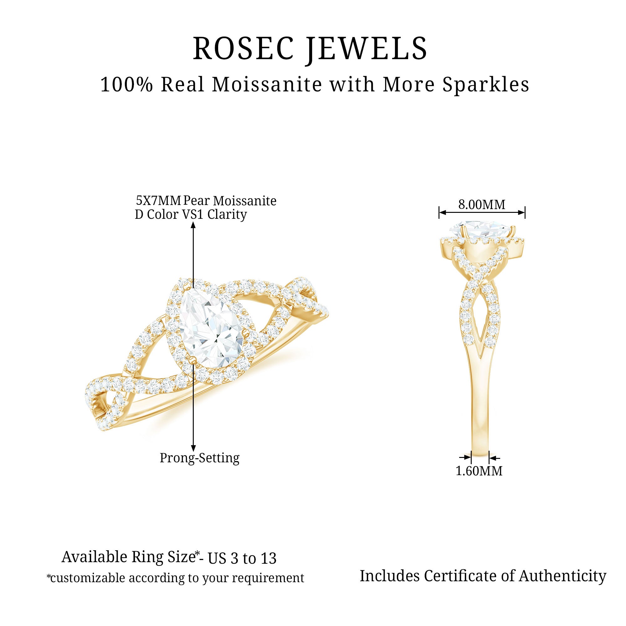 Aim for a balanced shape: When choosing a pear cut wedding ring, ensure that both sides of the gemstone are even. Pear should be not too rounded or too narrow.