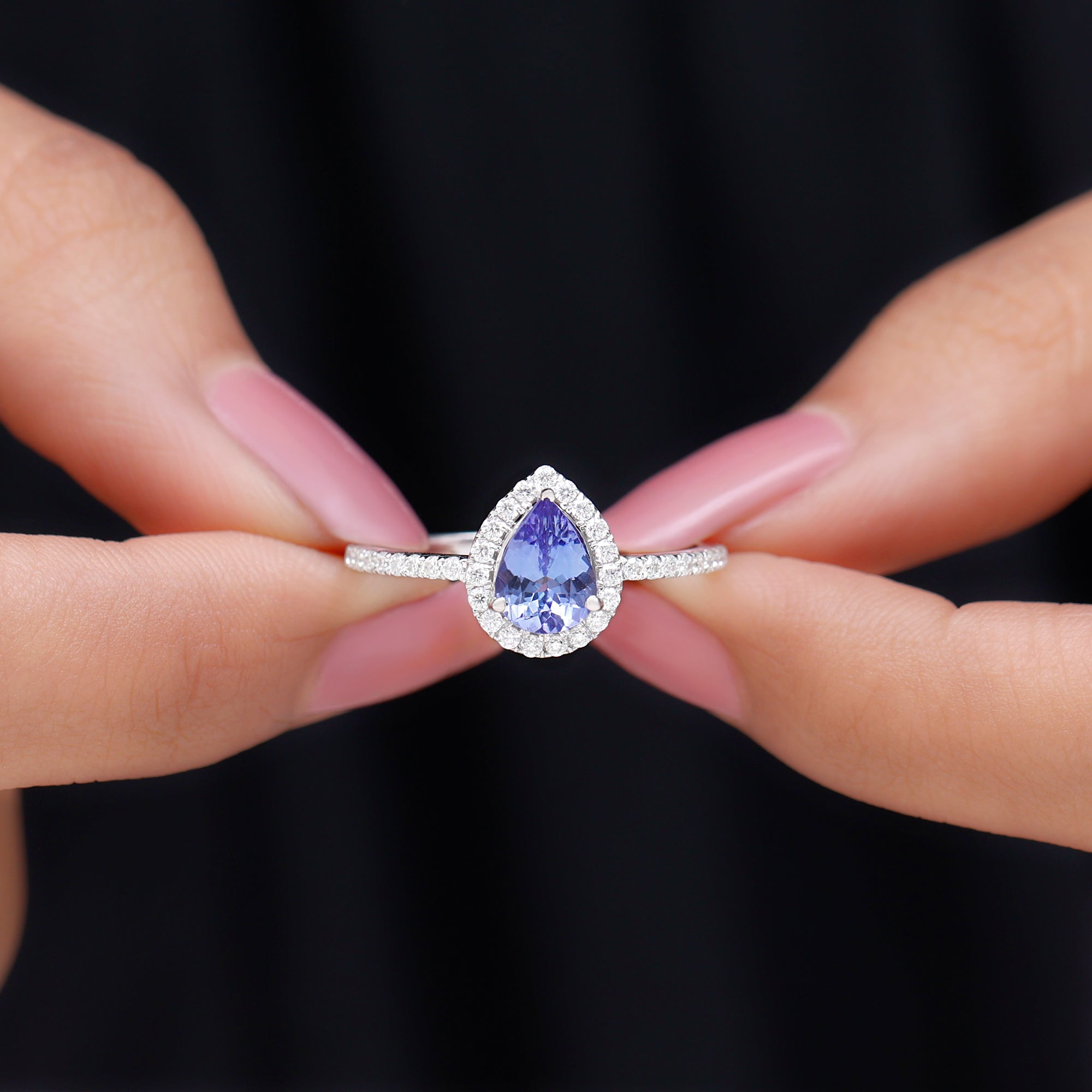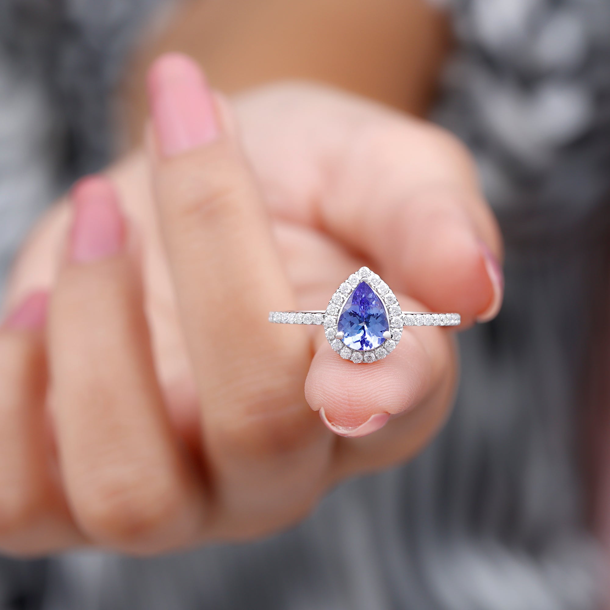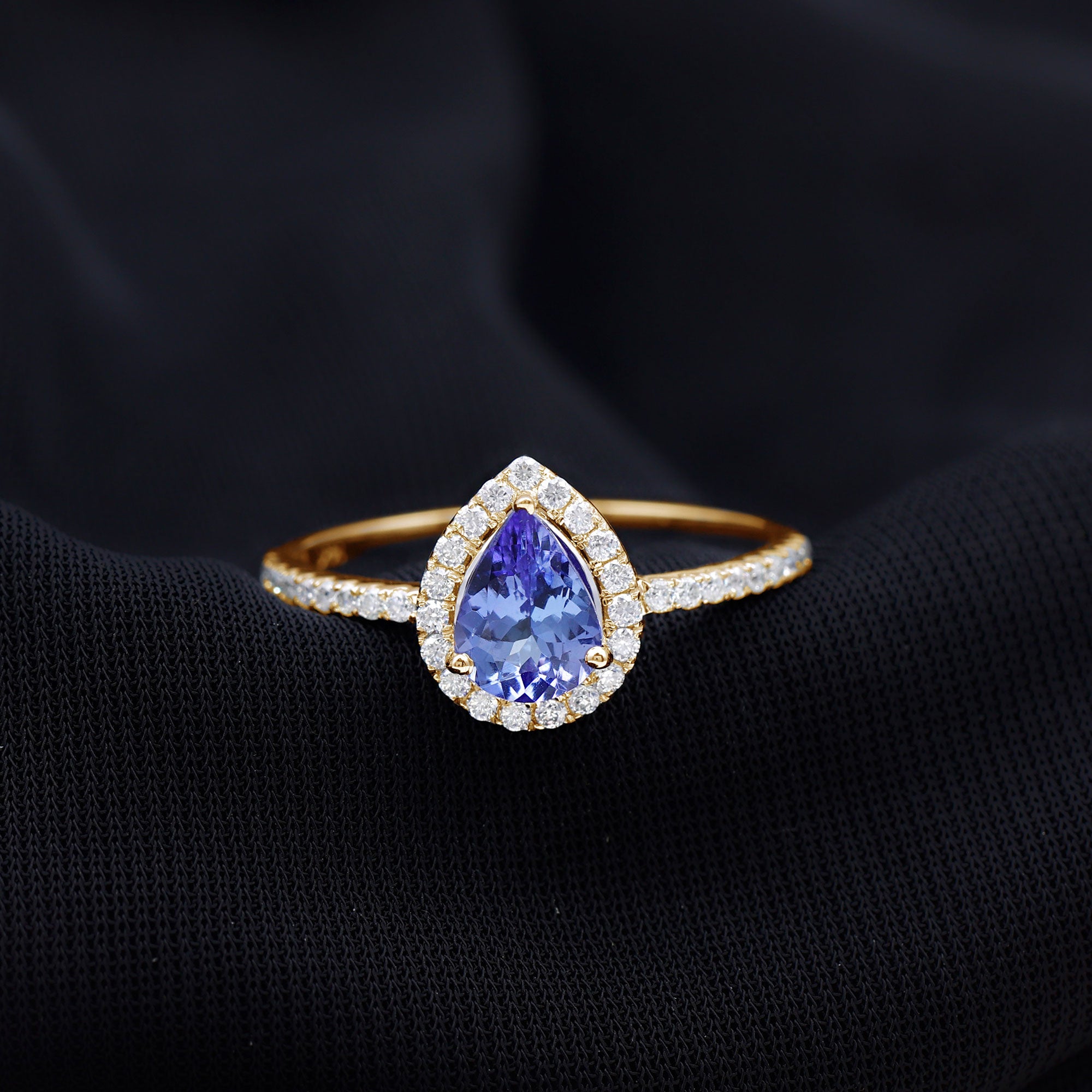 Halo Setting: A halo setting encircles the pear-shaped gem with smaller gemstones, enhancing its sparkle. The halo pattern can be of identical or different gemstones, usually round in shape. It is all about adding an intricate as well as luxurious touch to the gemstone and the overall ring design. In a pear-shaped diamond band, the accent of other gemstones, shining or colored, makes the center stone's shape more beautiful and adds meaning and brilliance to the piece.
