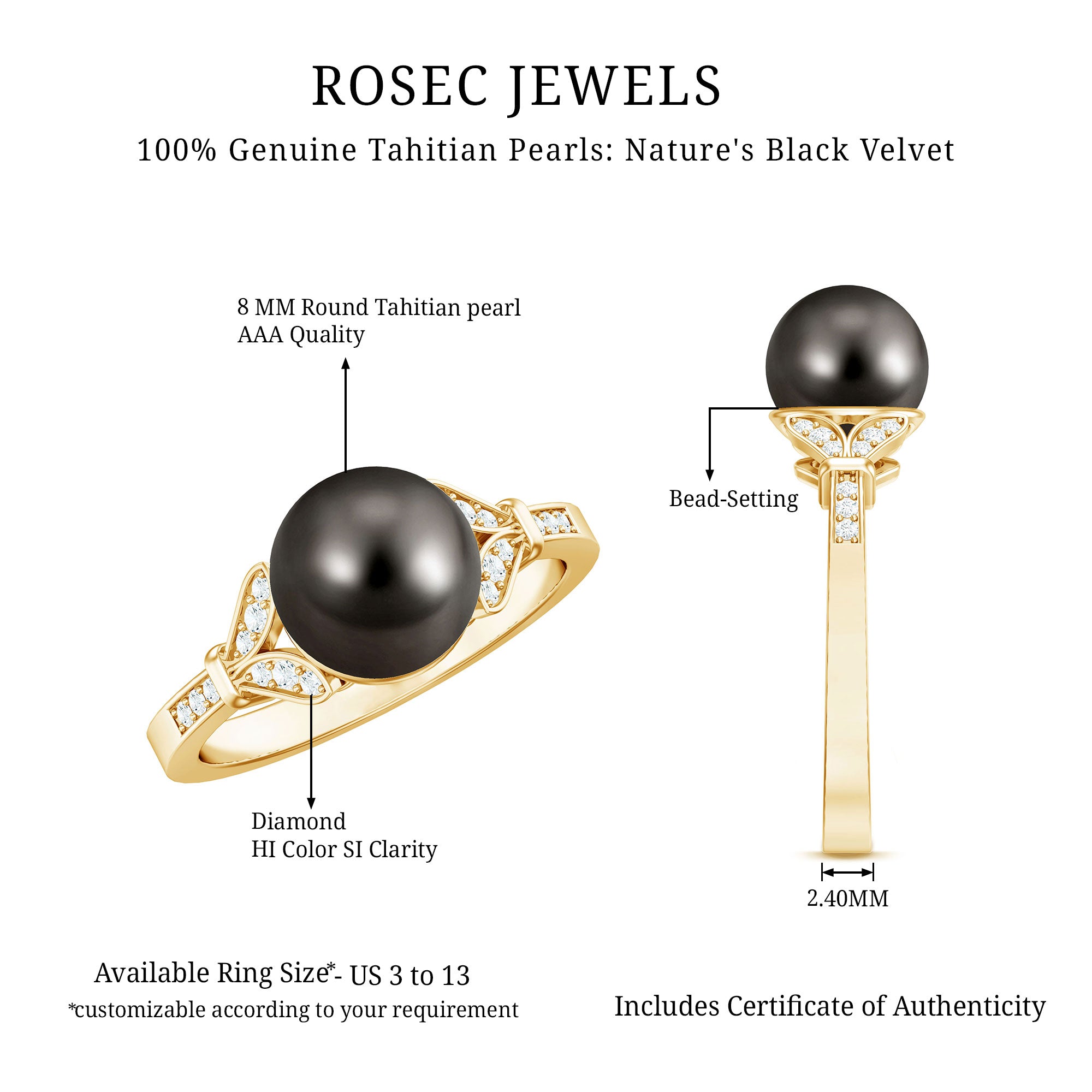 At Rosec Jewels, we specialize in crafting stunning freshwater pearl engagement rings, unique pearl wedding rings, pearl wedding bands, pearl engagement ring sets (even pearl bridal rings are all in rage), and so on, that highlight serene beauty. Our team of skilled artisans is dedicated to crafting pearl rings that cater to the distinct styles and tastes of women worldwide. We love to experiment with various shapes and sizes of freshwater pearls, along with precious metal embellishments and gemstones, resulting in breathtaking nature-inspired pearl rings, halo rings, and cocktail pearl rings that are perfect to celebrate your big day.