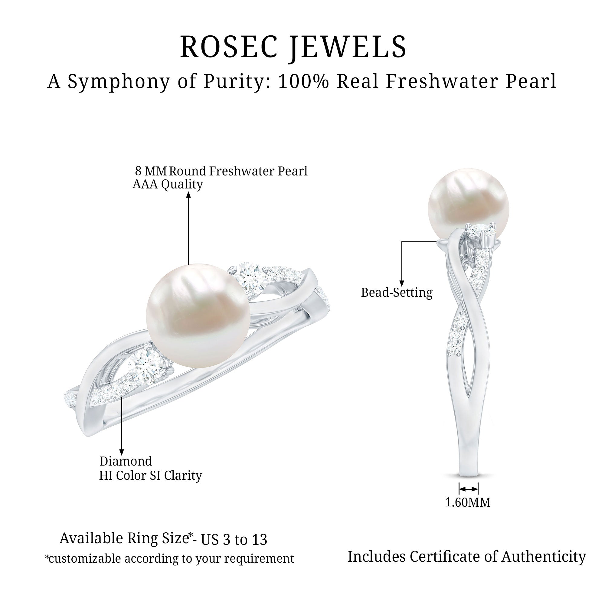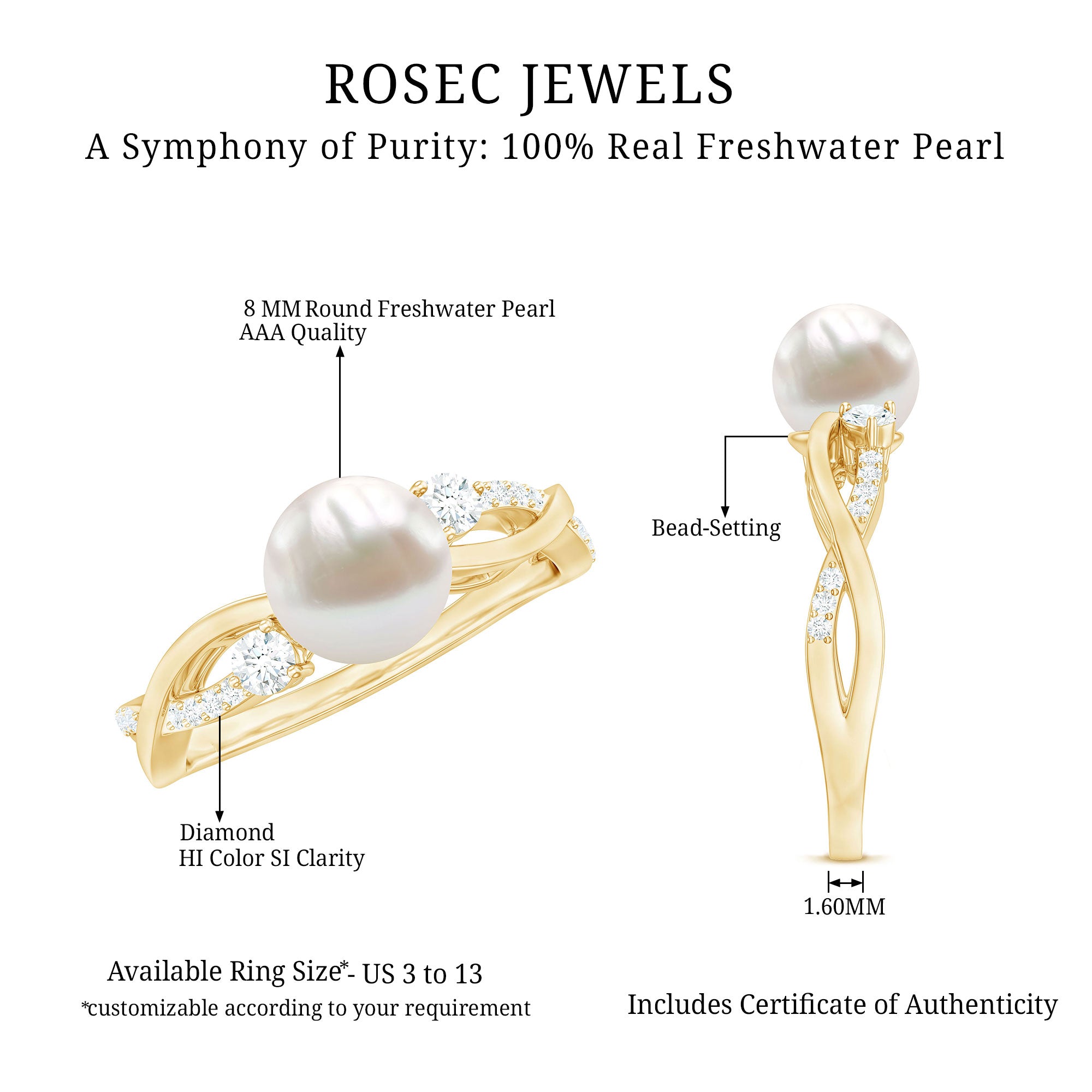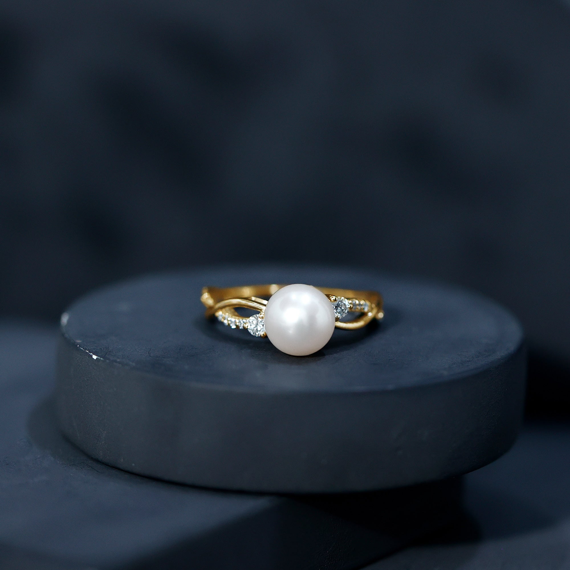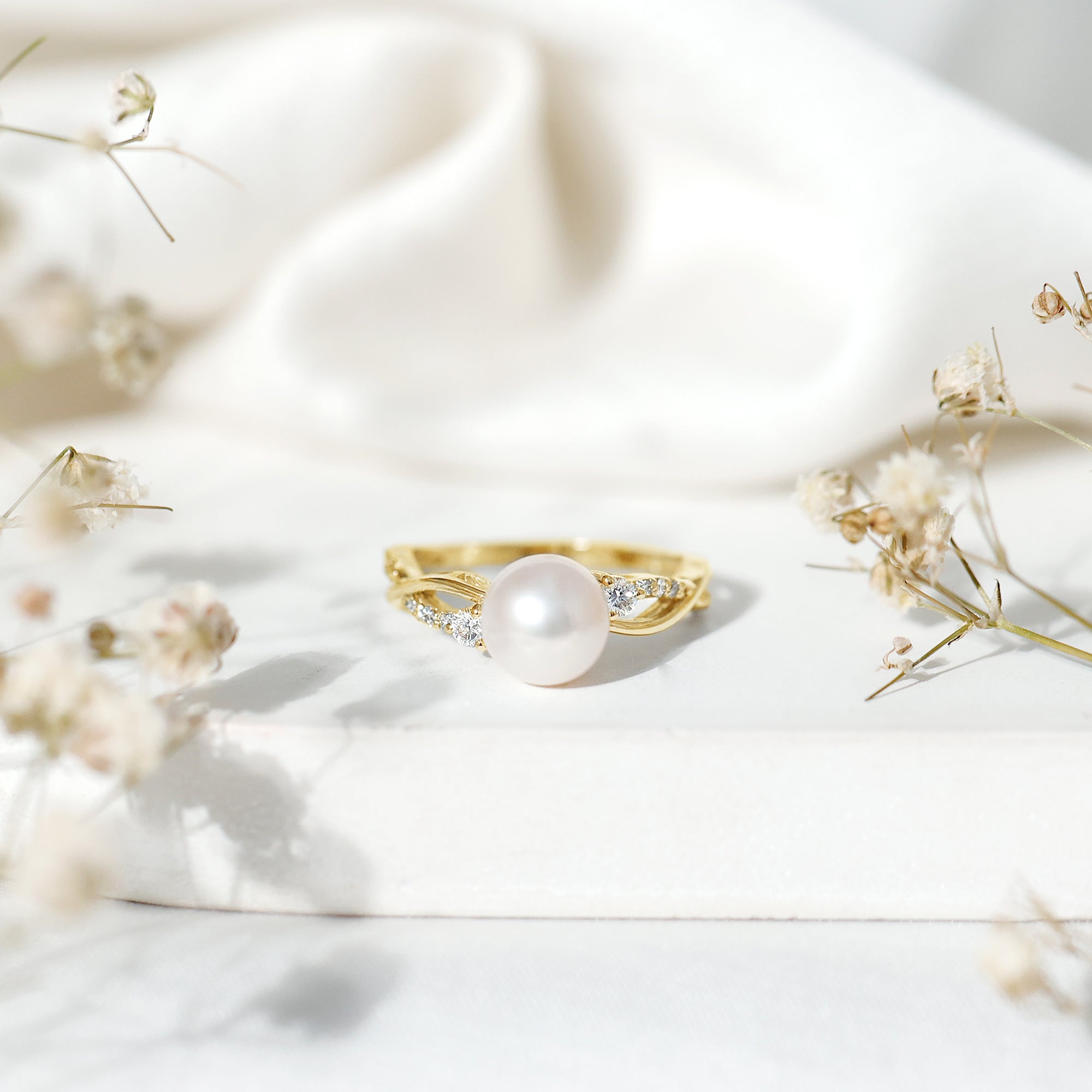 • Freshwater Pearl Crossover Rings: - A freshwater pearl diamond rings designed in yellow gold or white gold, uplifts its timeless charm. The crisscross shank is elaborated with small glistening diamonds, set in a shared prong setting.