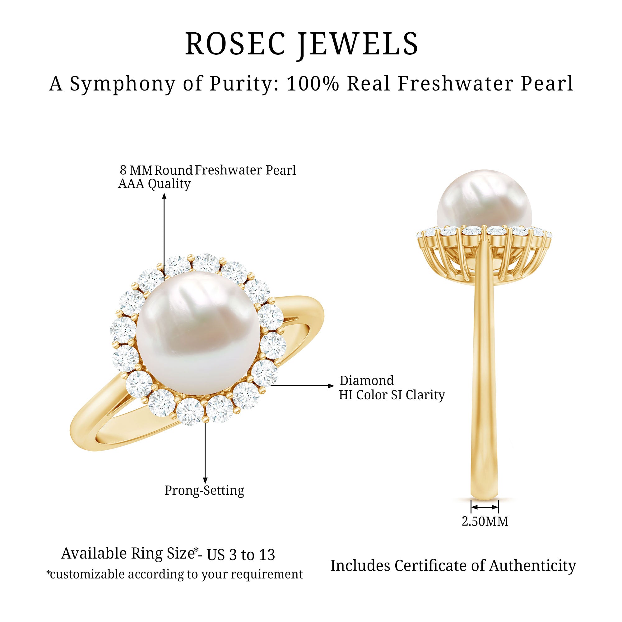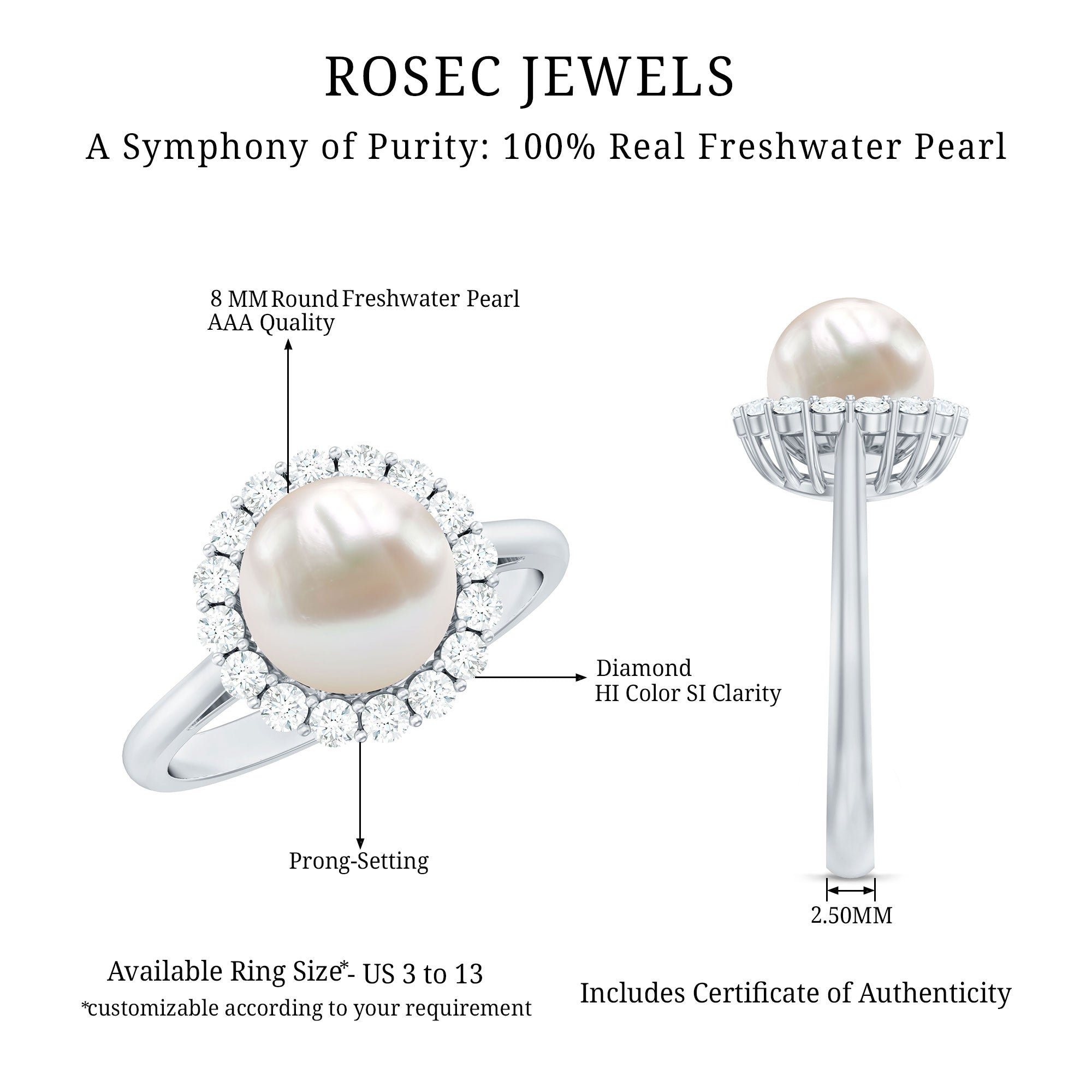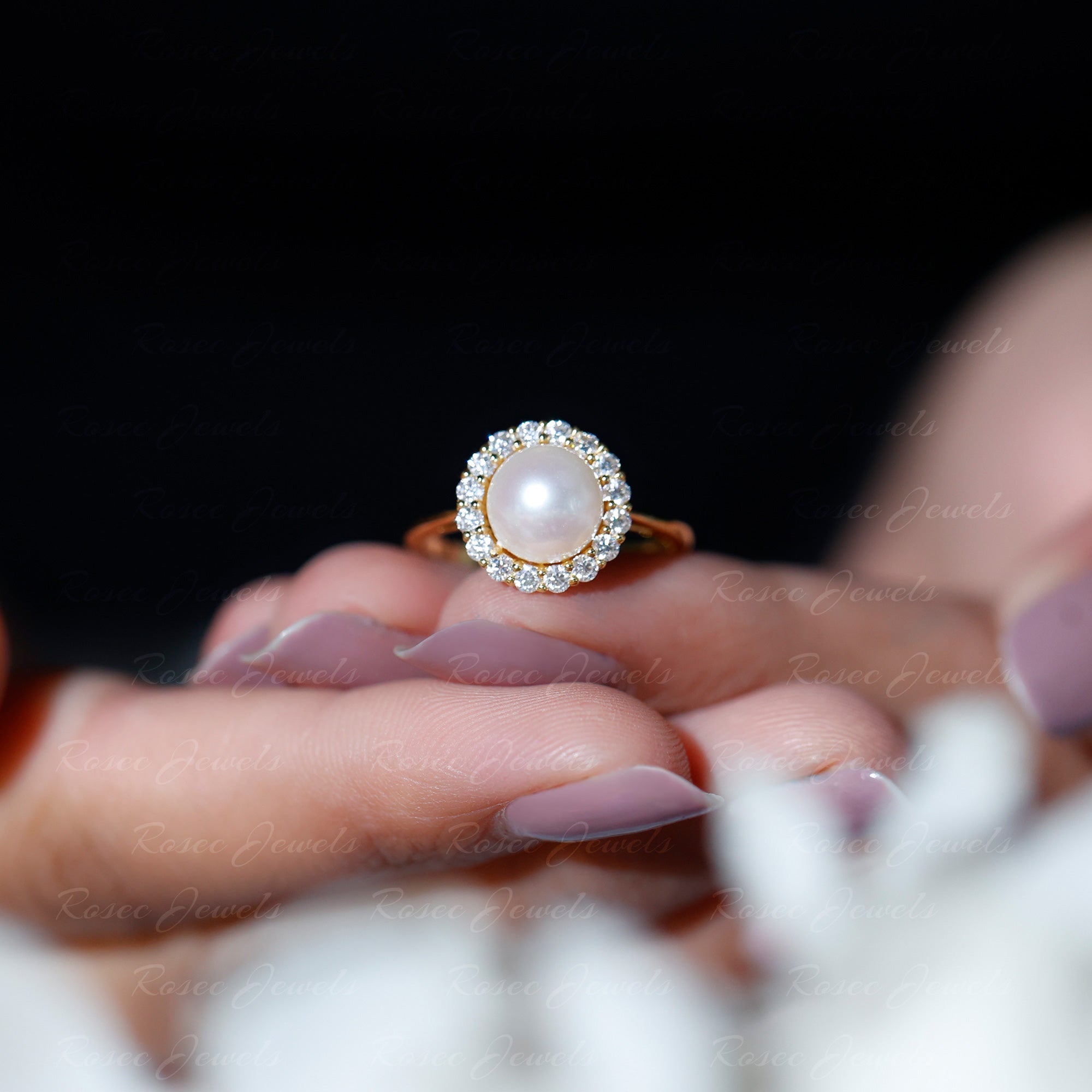 At Rosec Jewels, we specialize in crafting stunning freshwater pearl engagement rings, unique pearl wedding rings, pearl wedding bands, pearl engagement ring sets (even pearl bridal rings are all in rage), and so on, that highlight serene beauty. Our team of skilled artisans is dedicated to crafting pearl rings that cater to the distinct styles and tastes of women worldwide. We love to experiment with various shapes and sizes of freshwater pearls, along with precious metal embellishments and gemstones, resulting in breathtaking nature-inspired pearl rings, halo rings, and cocktail pearl rings that are perfect to celebrate your big day.