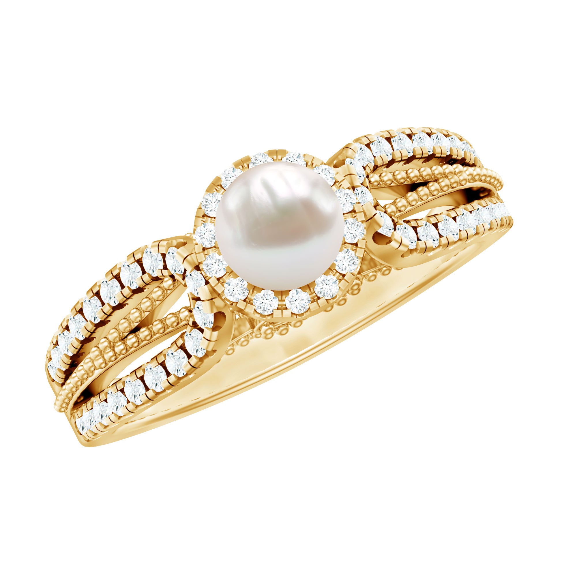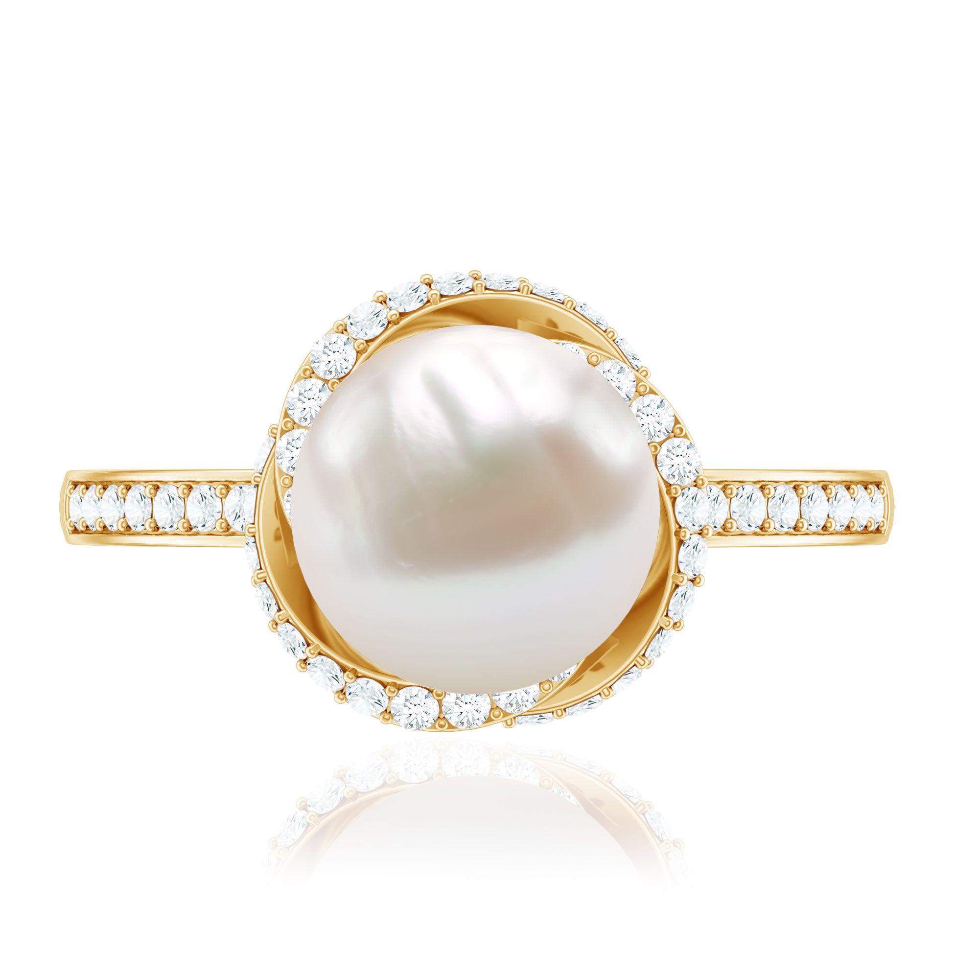 Freshwater Pearl Crossover Rings: - A freshwater pearl diamond rings designed in yellow gold or white gold, uplifts its timeless charm. The crisscross shank is elaborated with small glistening diamonds, set in a shared prong setting.