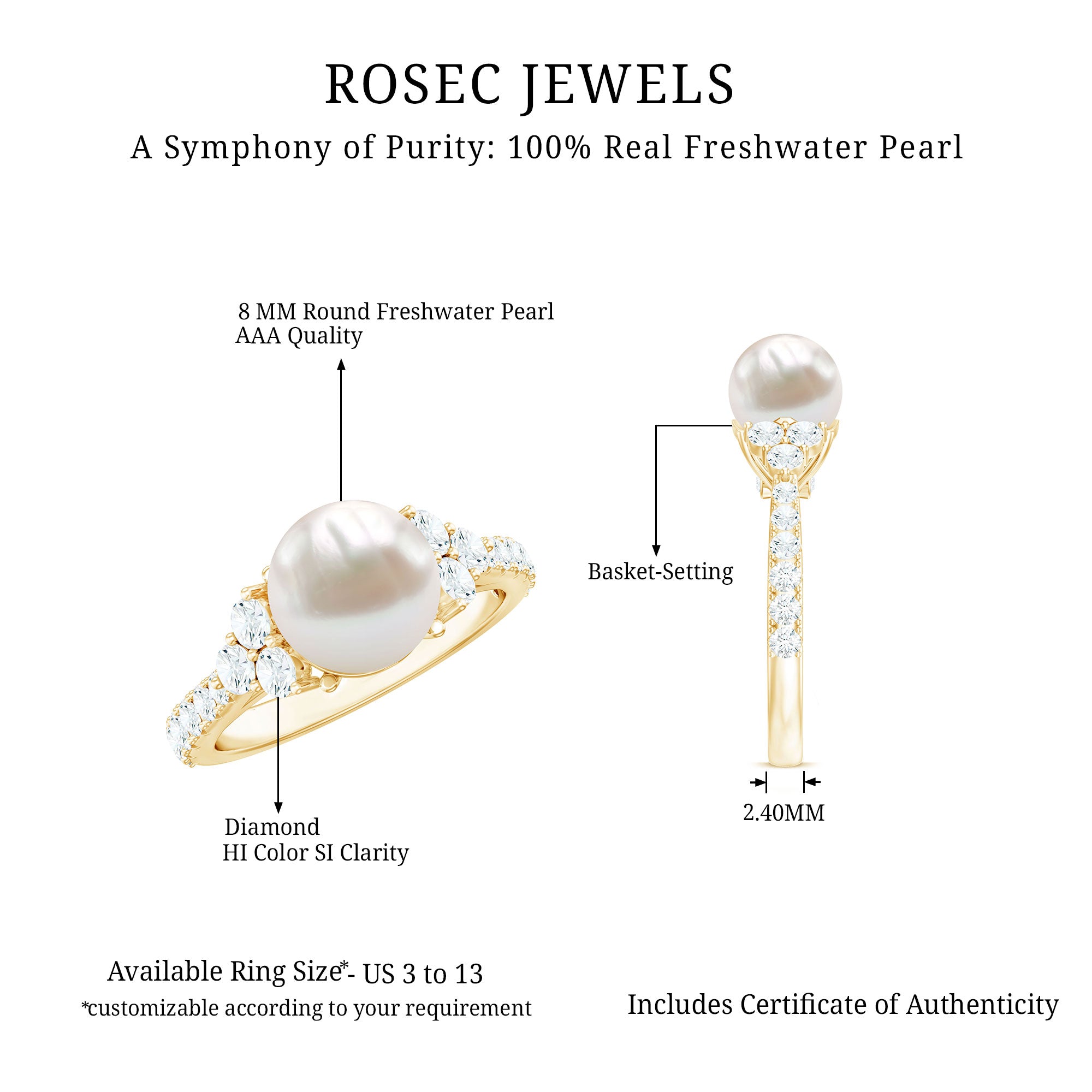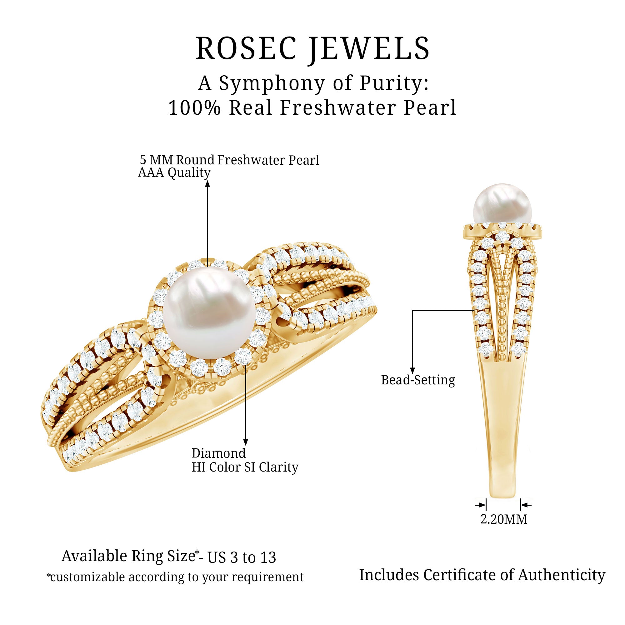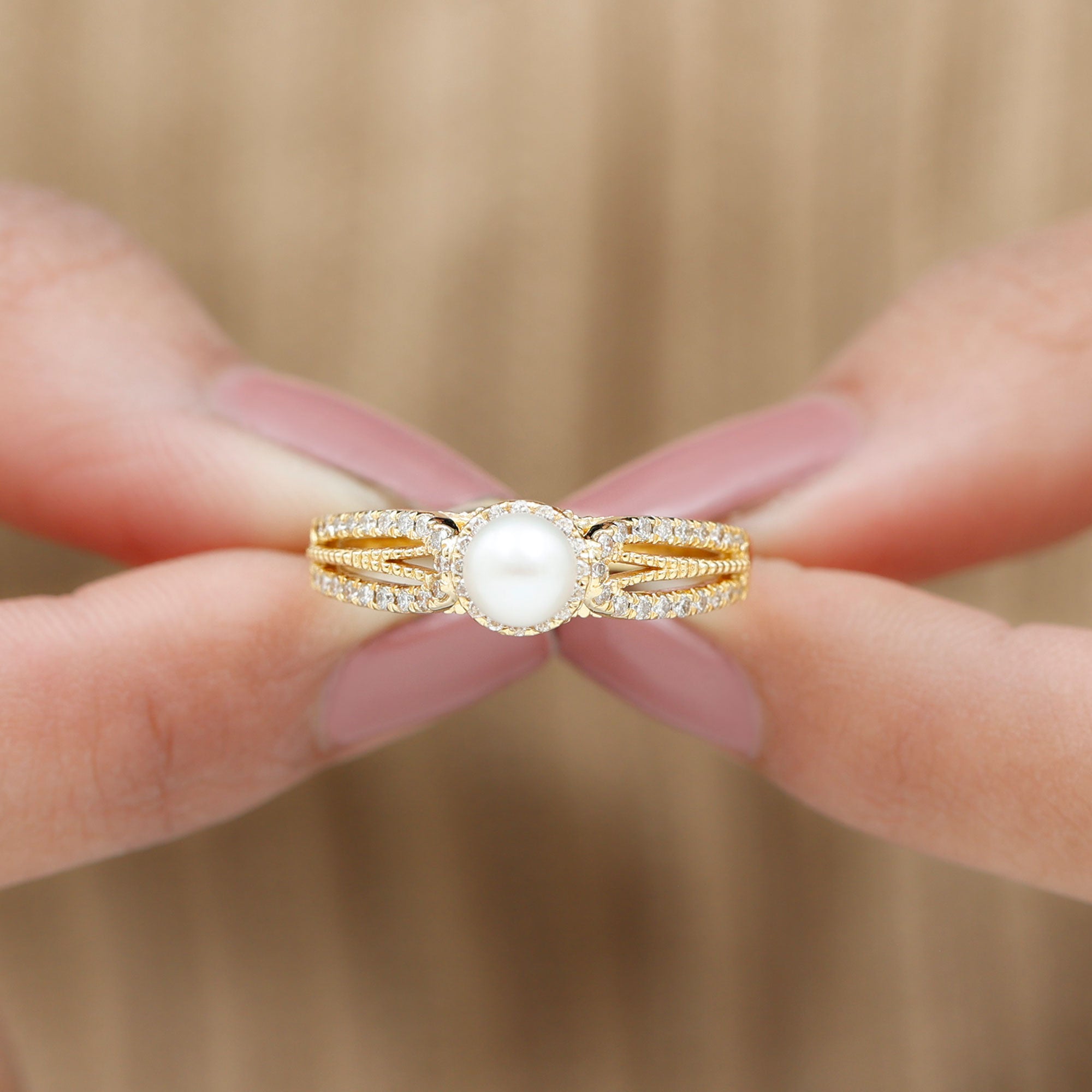 At Rosec Jewels, we specialize in crafting stunning freshwater pearl engagement rings, unique pearl wedding rings, pearl wedding bands, pearl engagement ring sets (even pearl bridal rings are all in rage), and so on, that highlight serene beauty. Our team of skilled artisans is dedicated to crafting pearl rings that cater to the distinct styles and tastes of women worldwide. We love to experiment with various shapes and sizes of freshwater pearls, along with precious metal embellishments and gemstones, resulting in breathtaking nature-inspired pearl rings, halo rings, and cocktail pearl rings that are perfect to celebrate your big day.