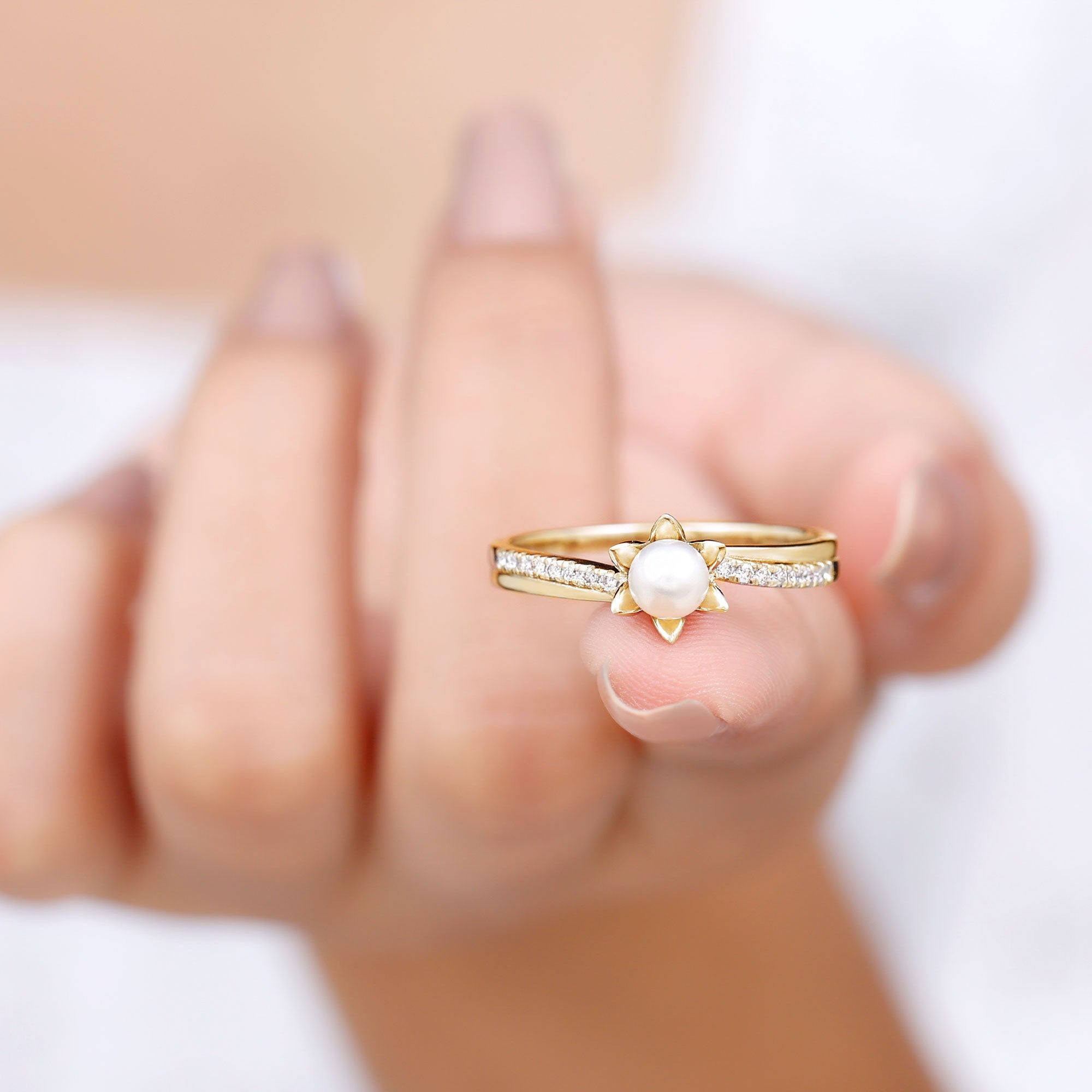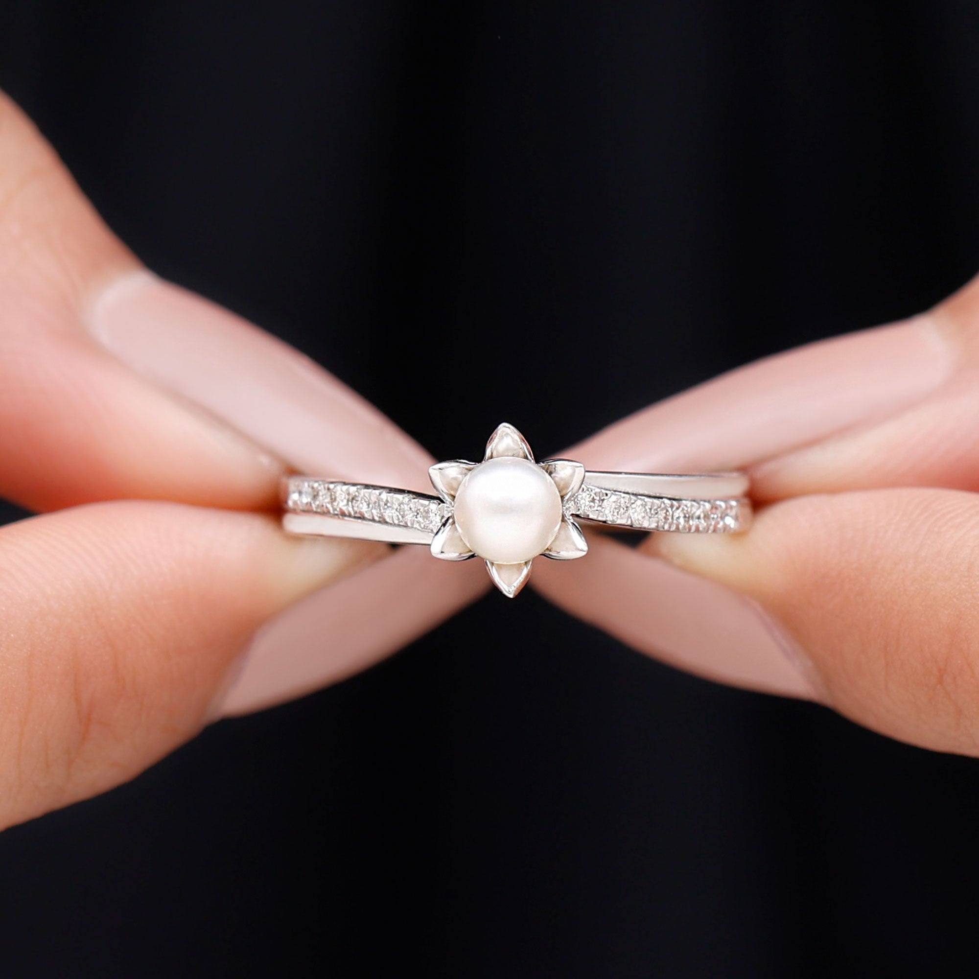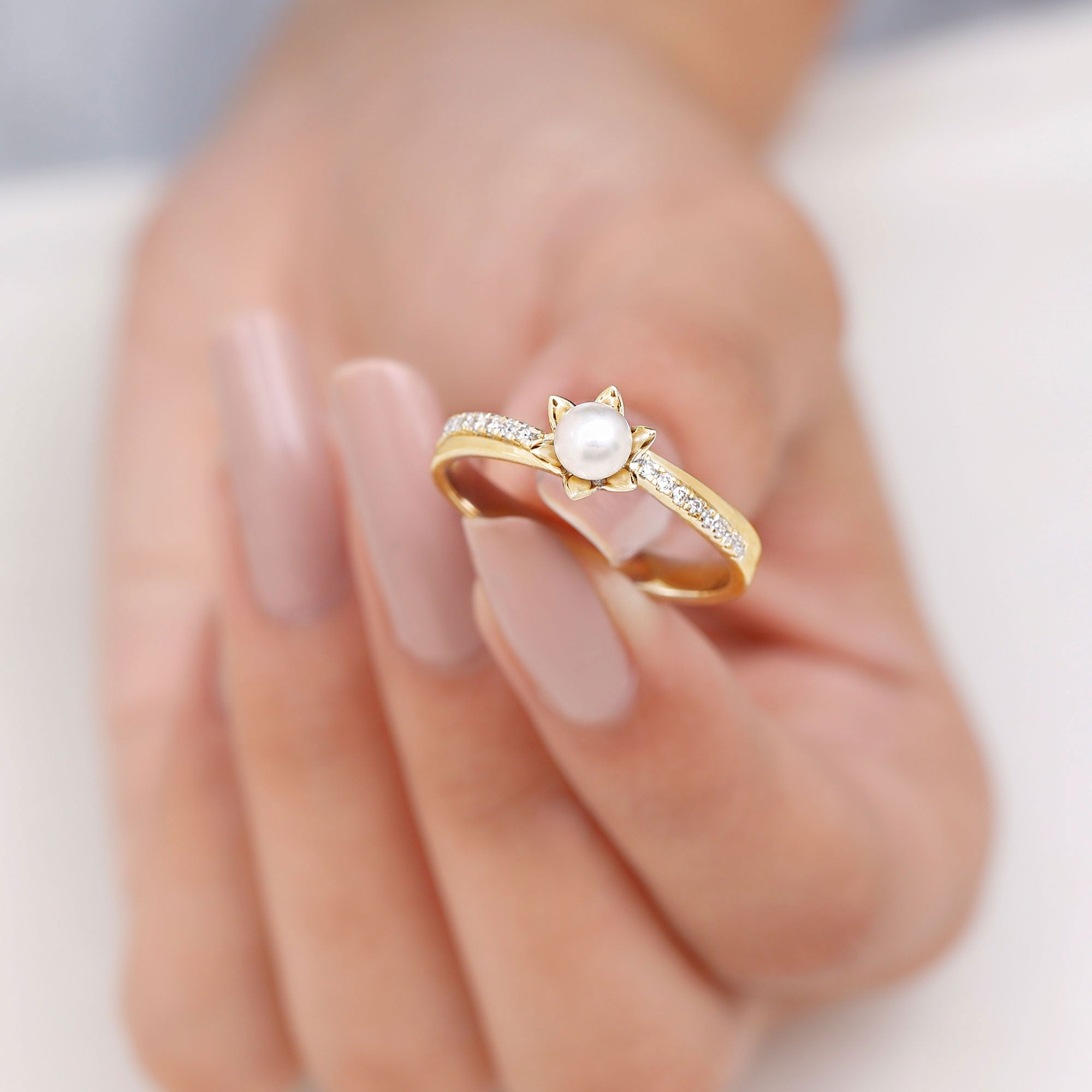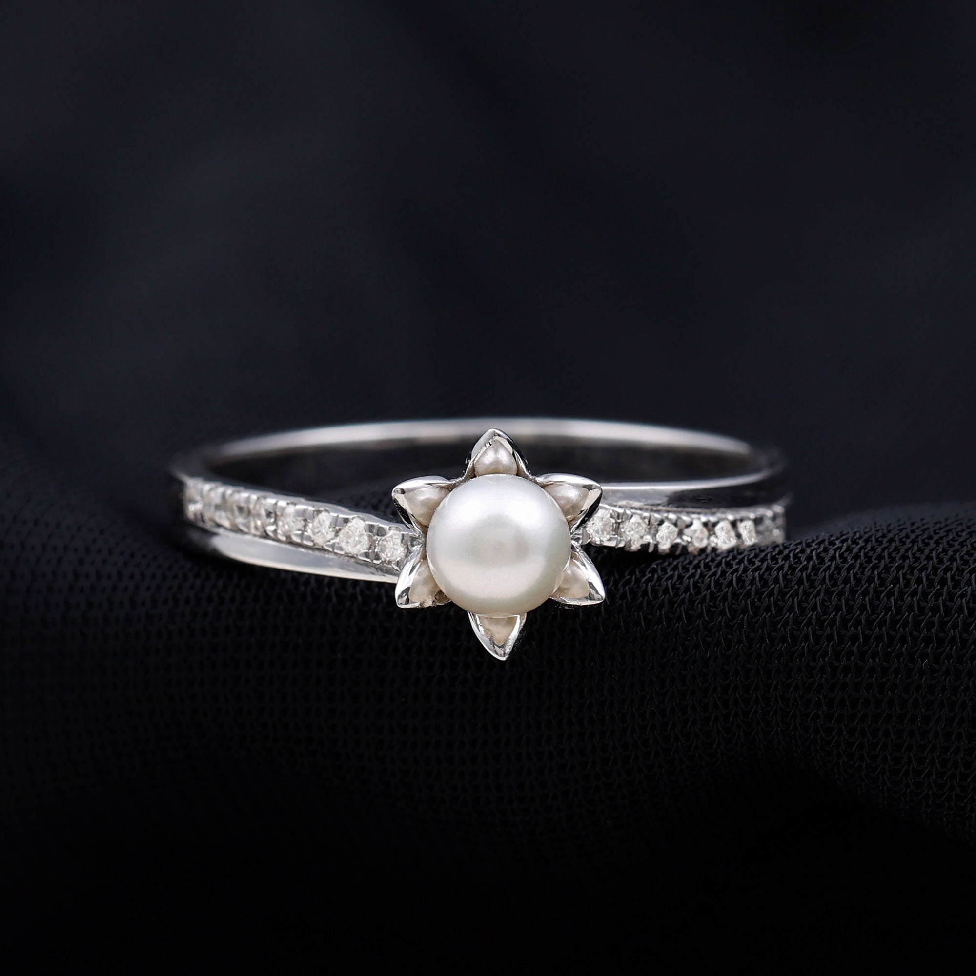 - Floral Pearl Ring: A Floral pearl ring is fashioned with a floral inspired design, often studded with a center stone that is further enhanced with a floral halo or has metal engraved with a floral design.