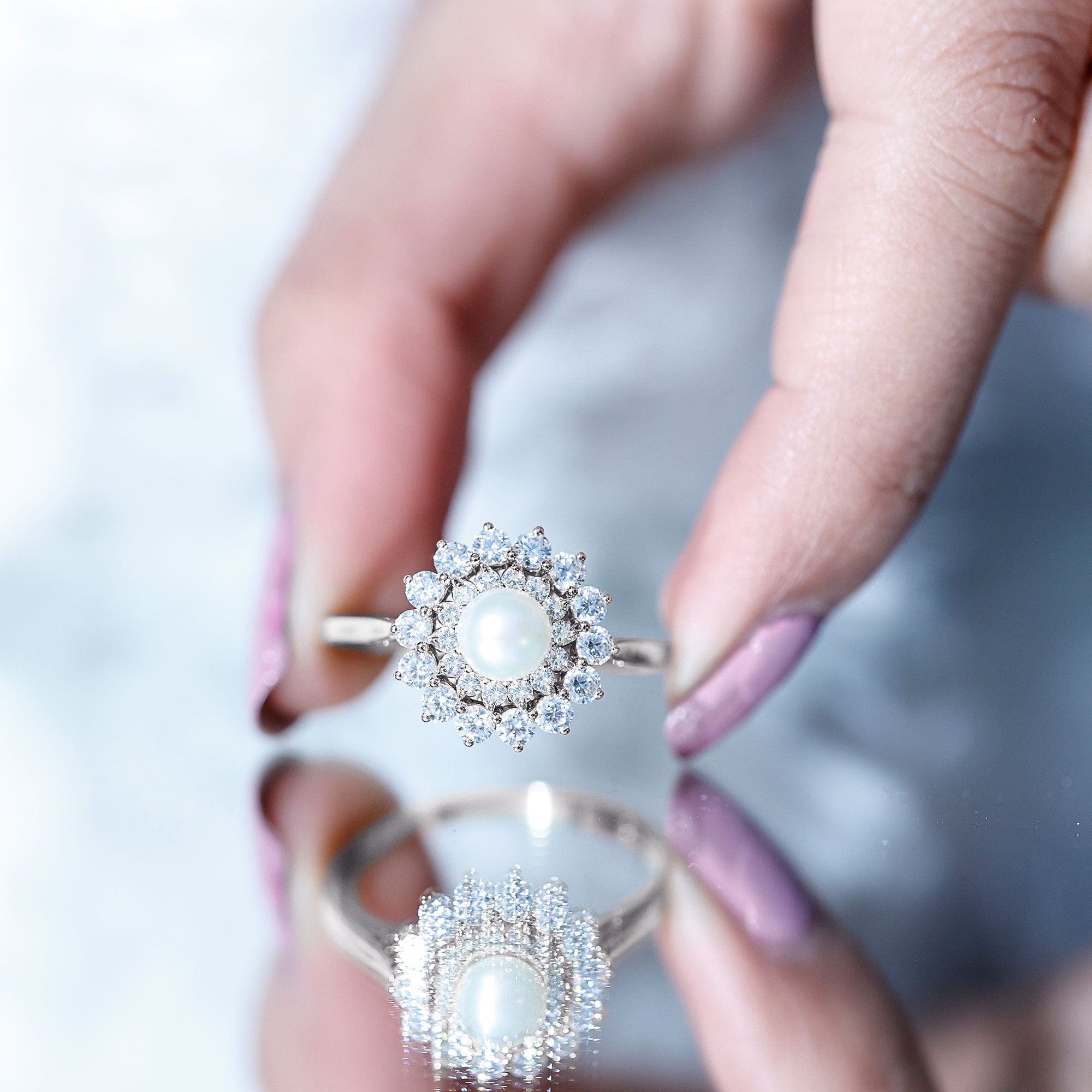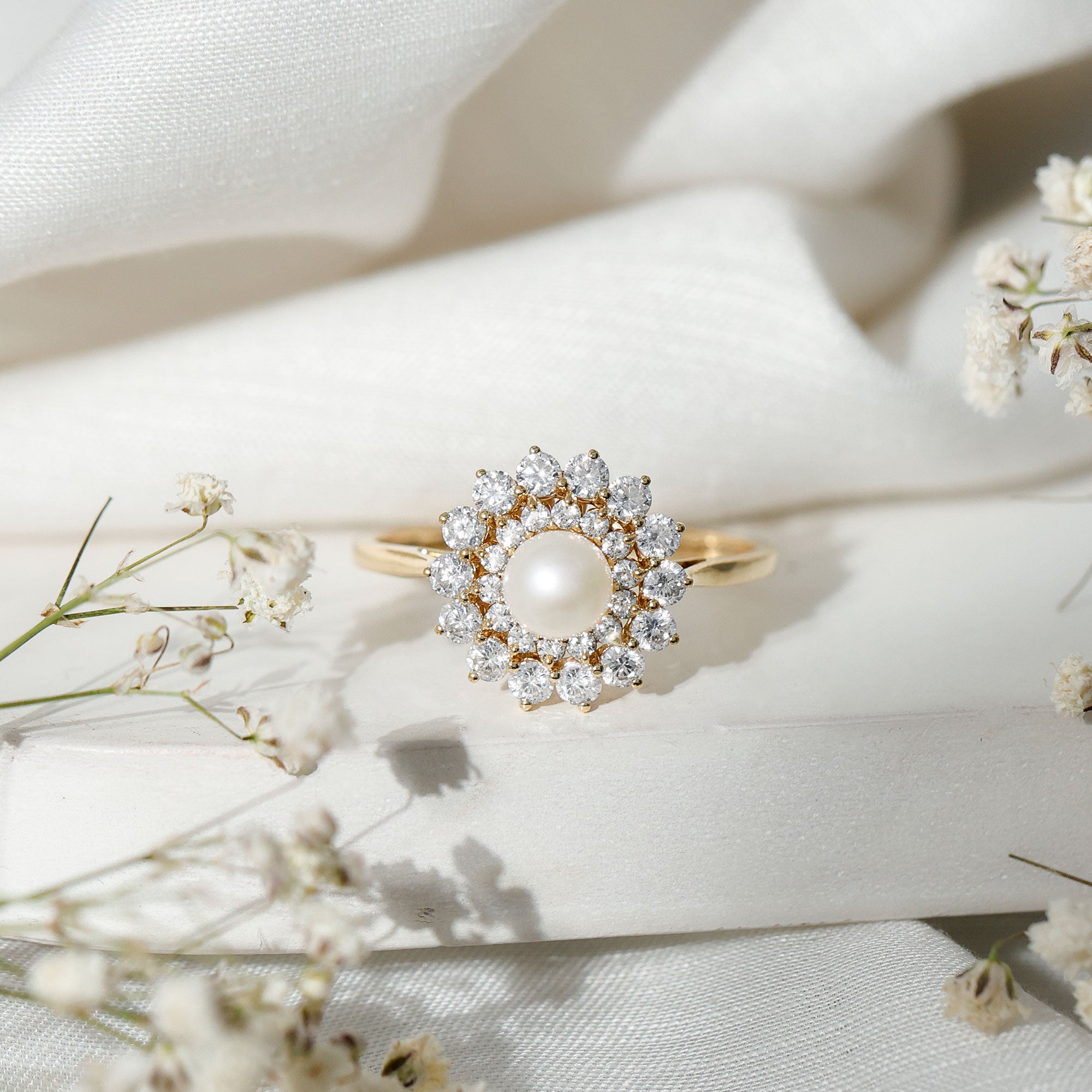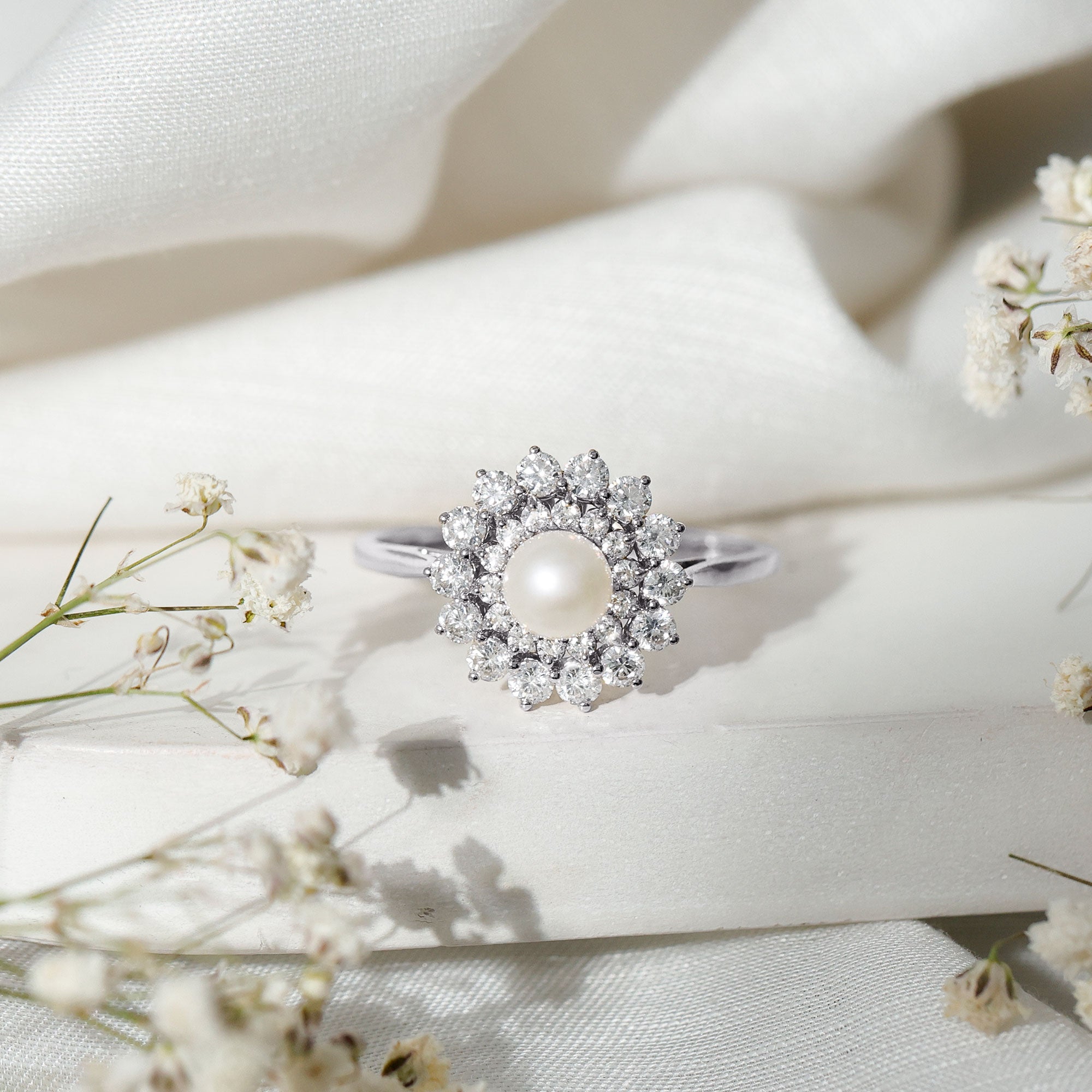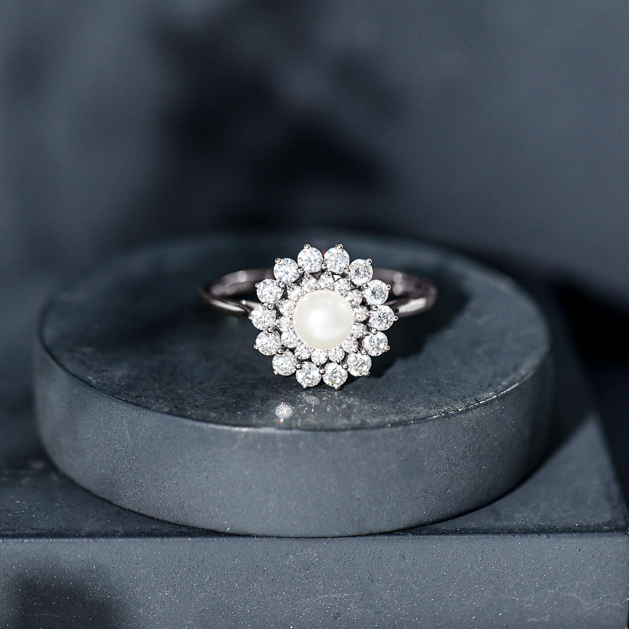 Freshwater Pearls Halo Rings: - each piece of freshwater pearl halo ring features a center attraction pearl that is securely encircled by small glittering diamonds or moissanite. This contrast maximizes the charm and elegance of the pearl, offering an enchanting visual impact.