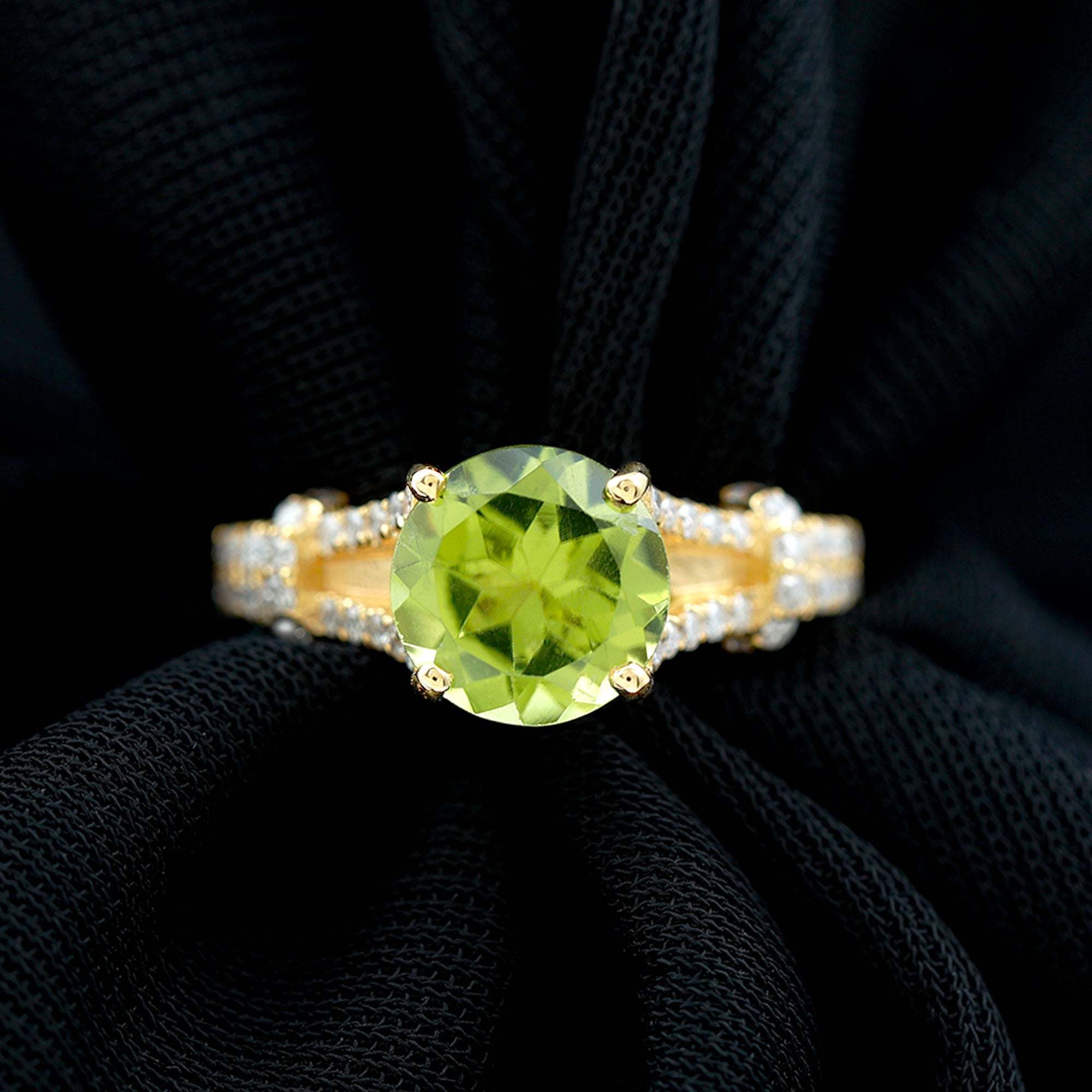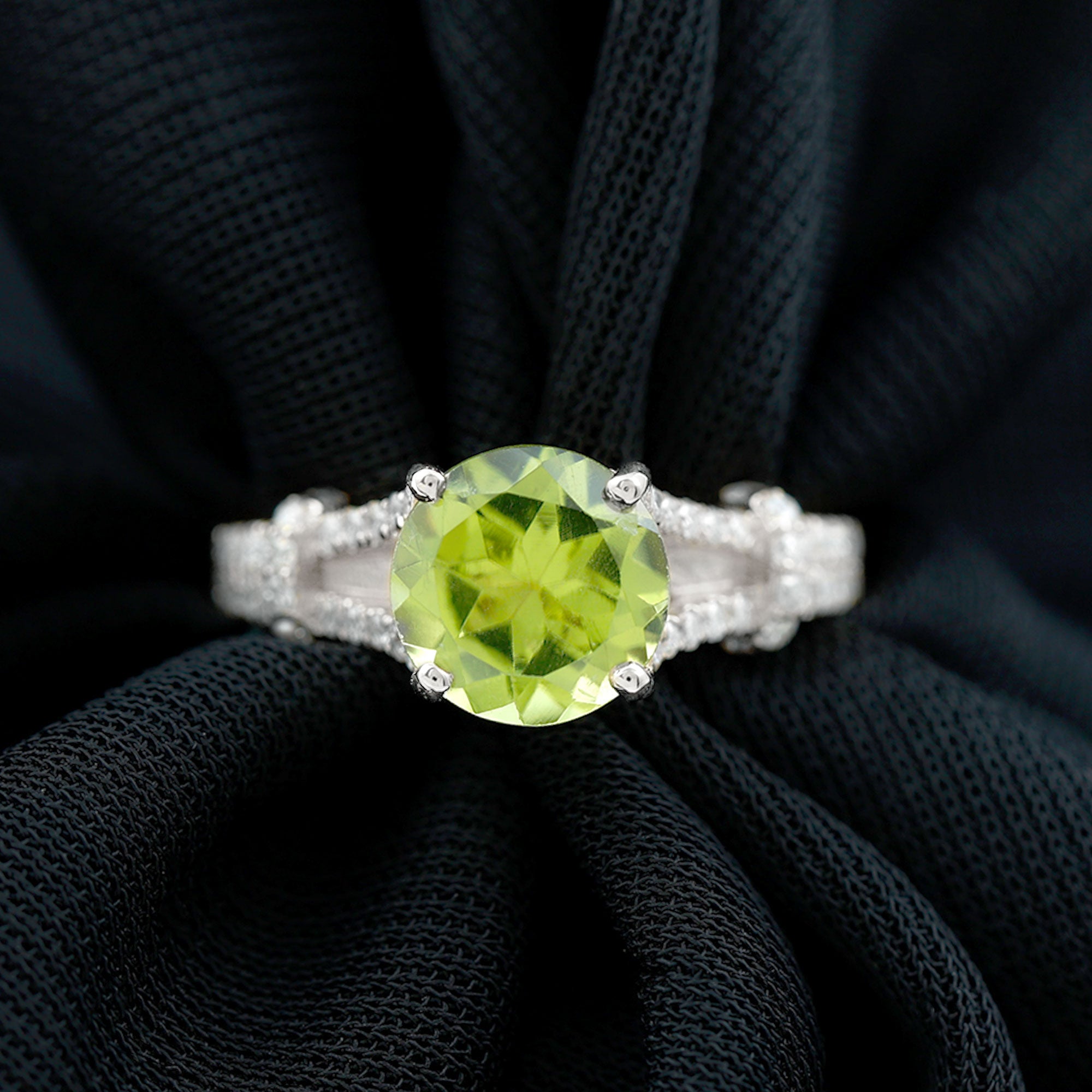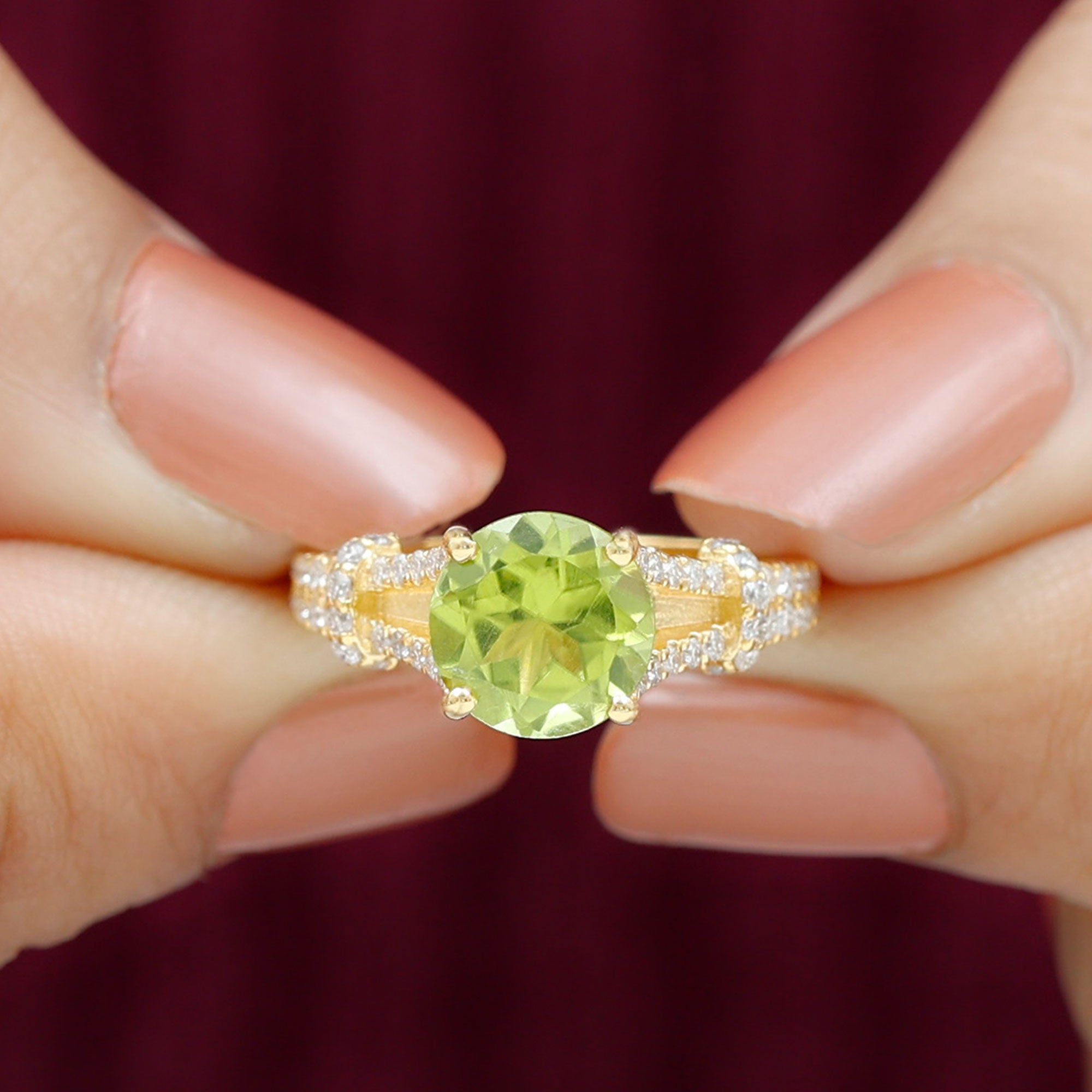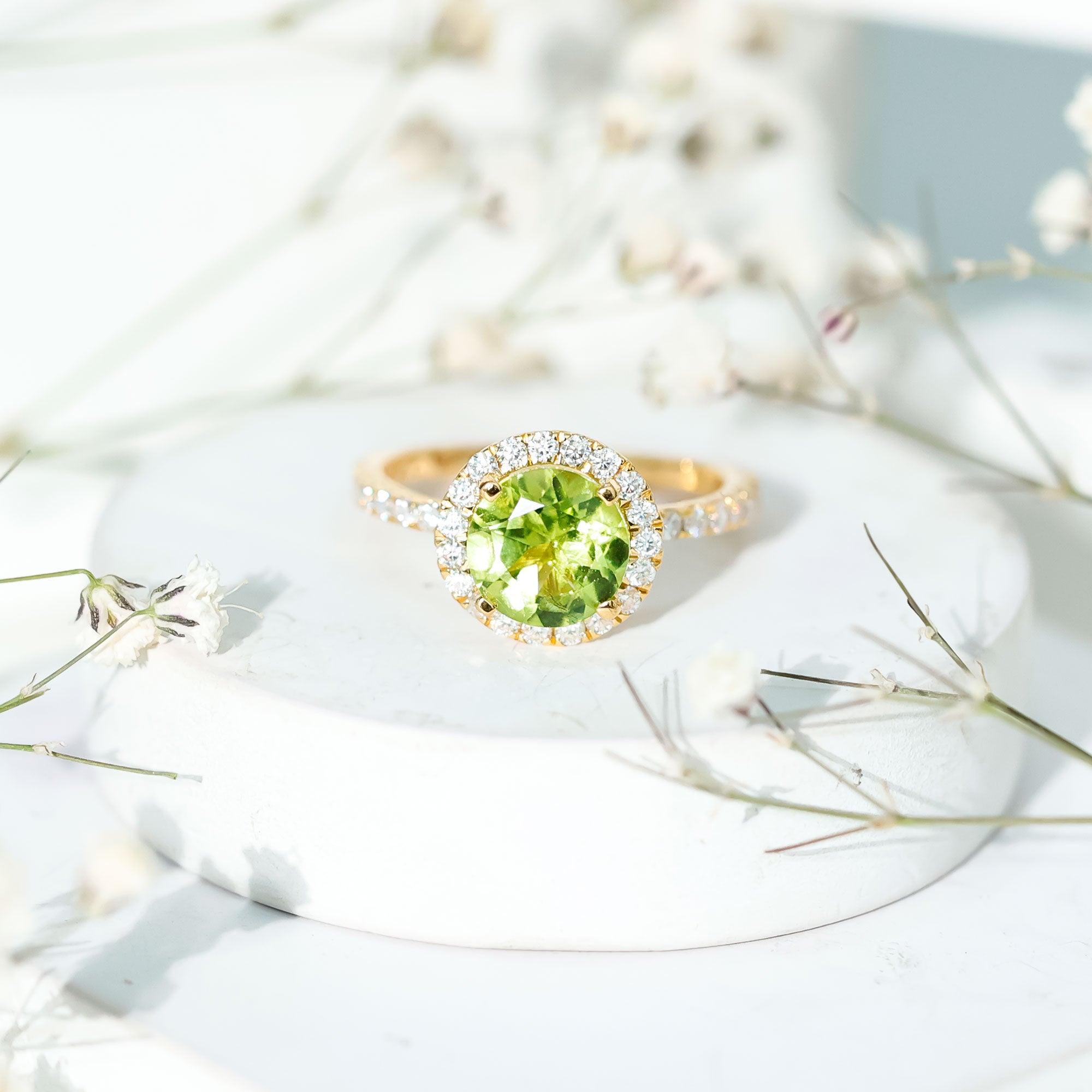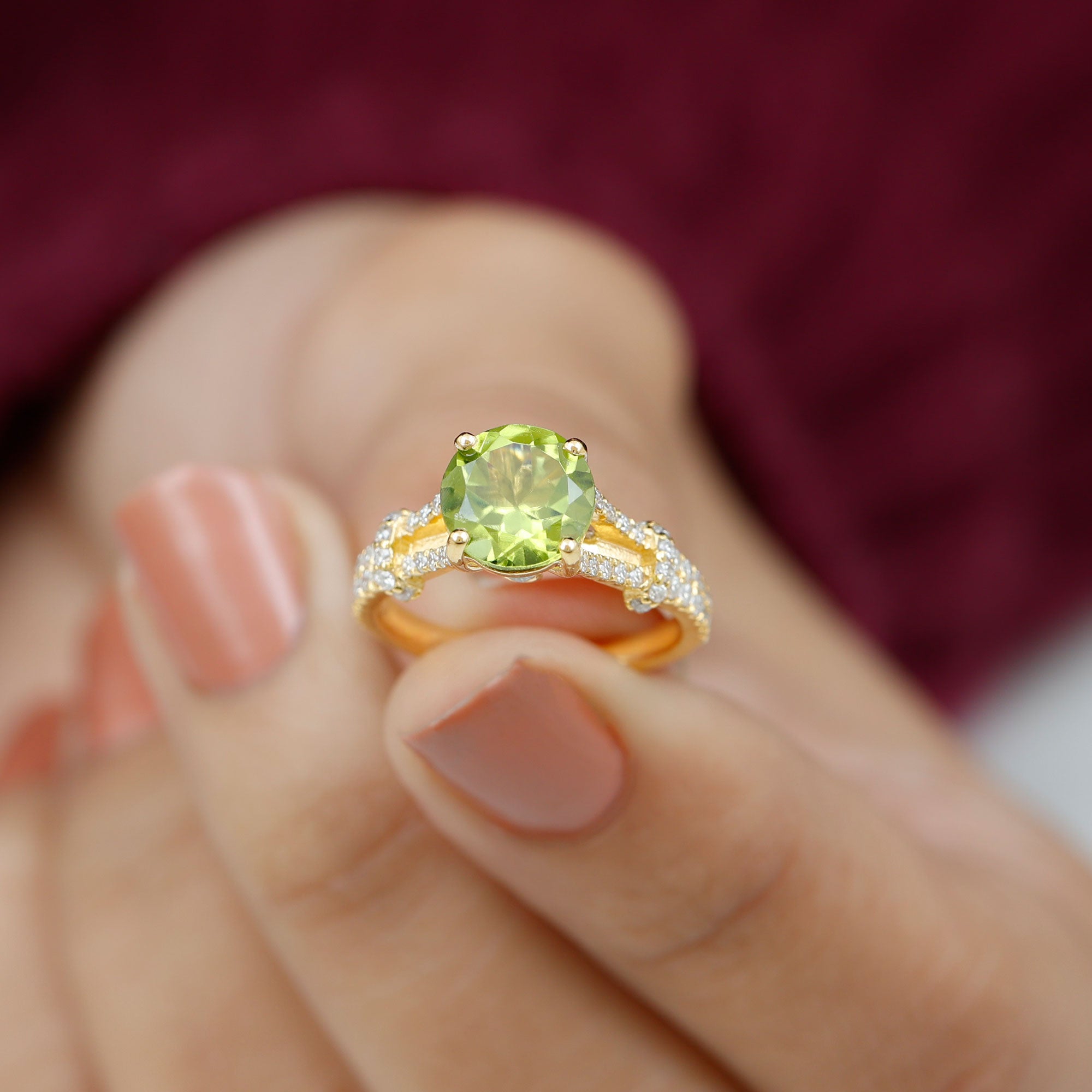 Held in high regard as one of the most classic Peridot Engagement Rings out there, it is characterized by a solo centerpiece of Peridot that steals the limelight. It can also be labeled as the most versatile ring style since the Peridot Solitaire offers you a sea of options in terms of aesthetics, be it the classic Round Peridot Rings offering a traditional aesthetic, the ones fashioned with Pear, Marquise, and Princess exuding an unconventional touch, or Asscher and Emerald Cut Peridot Rings for that perfect vintage vibe.