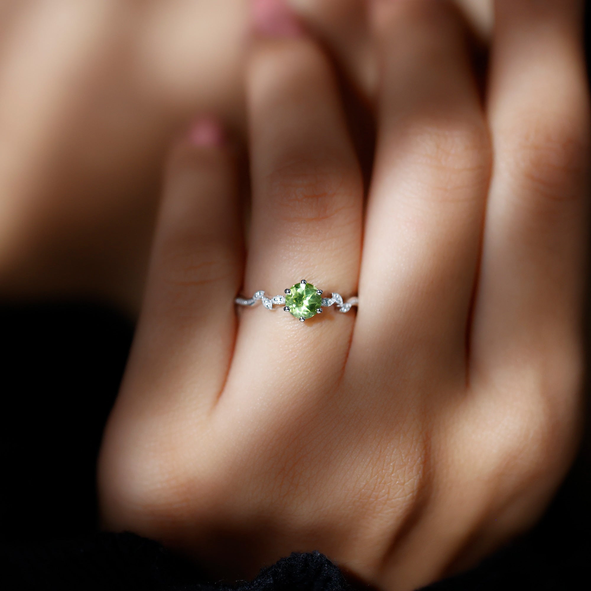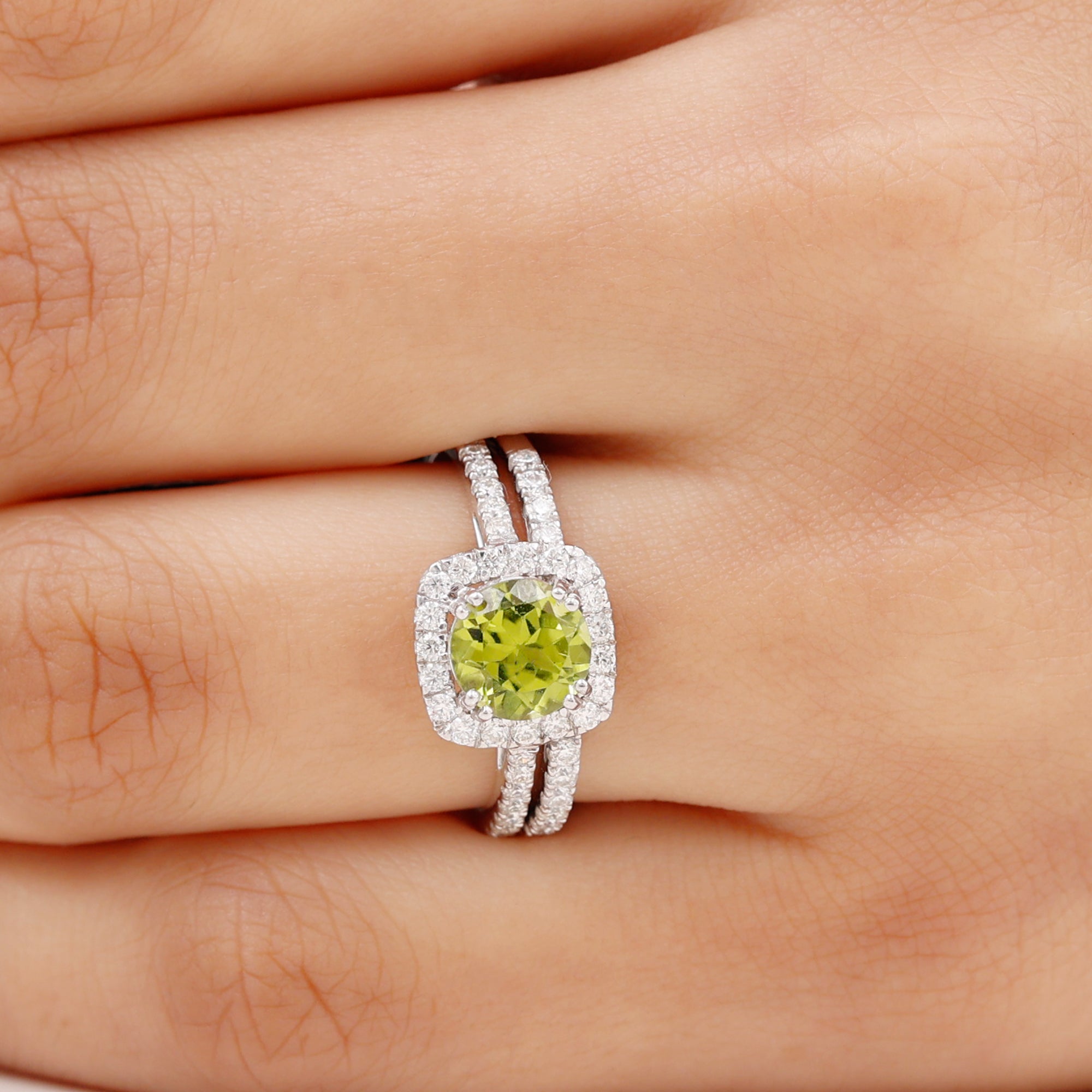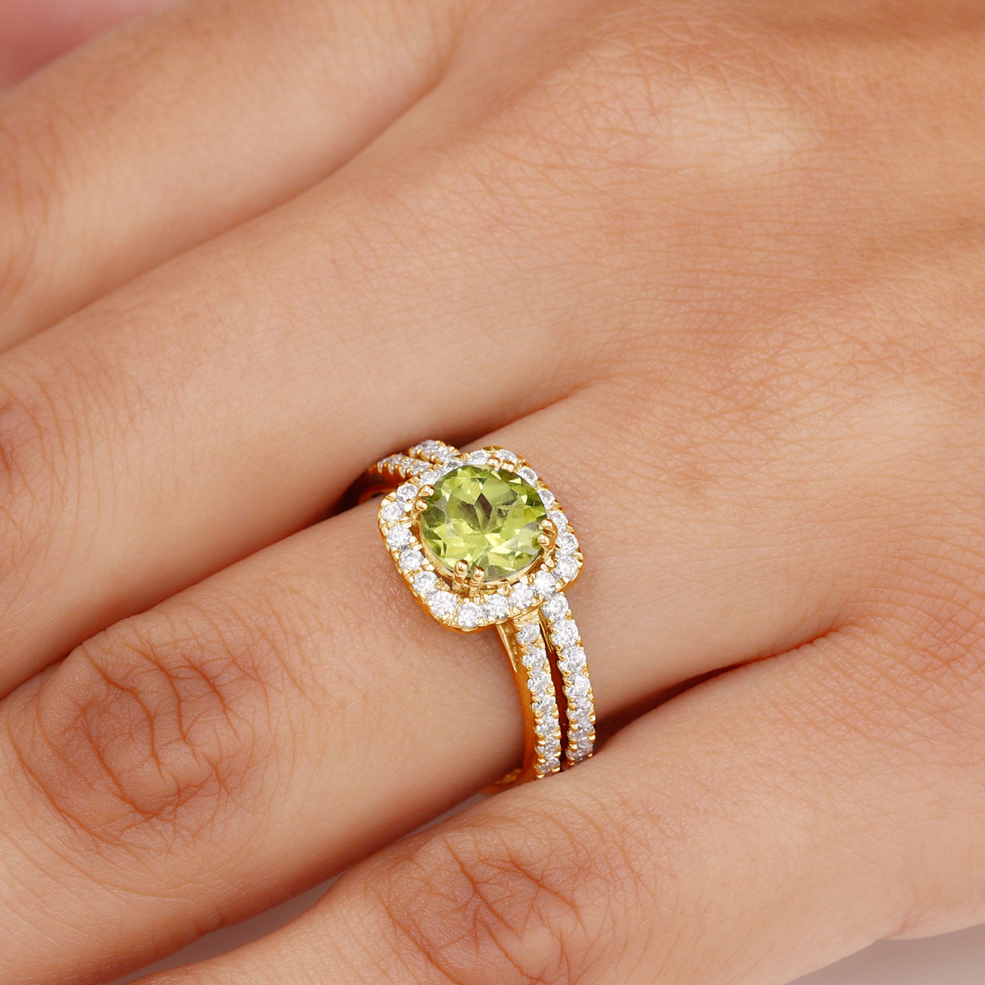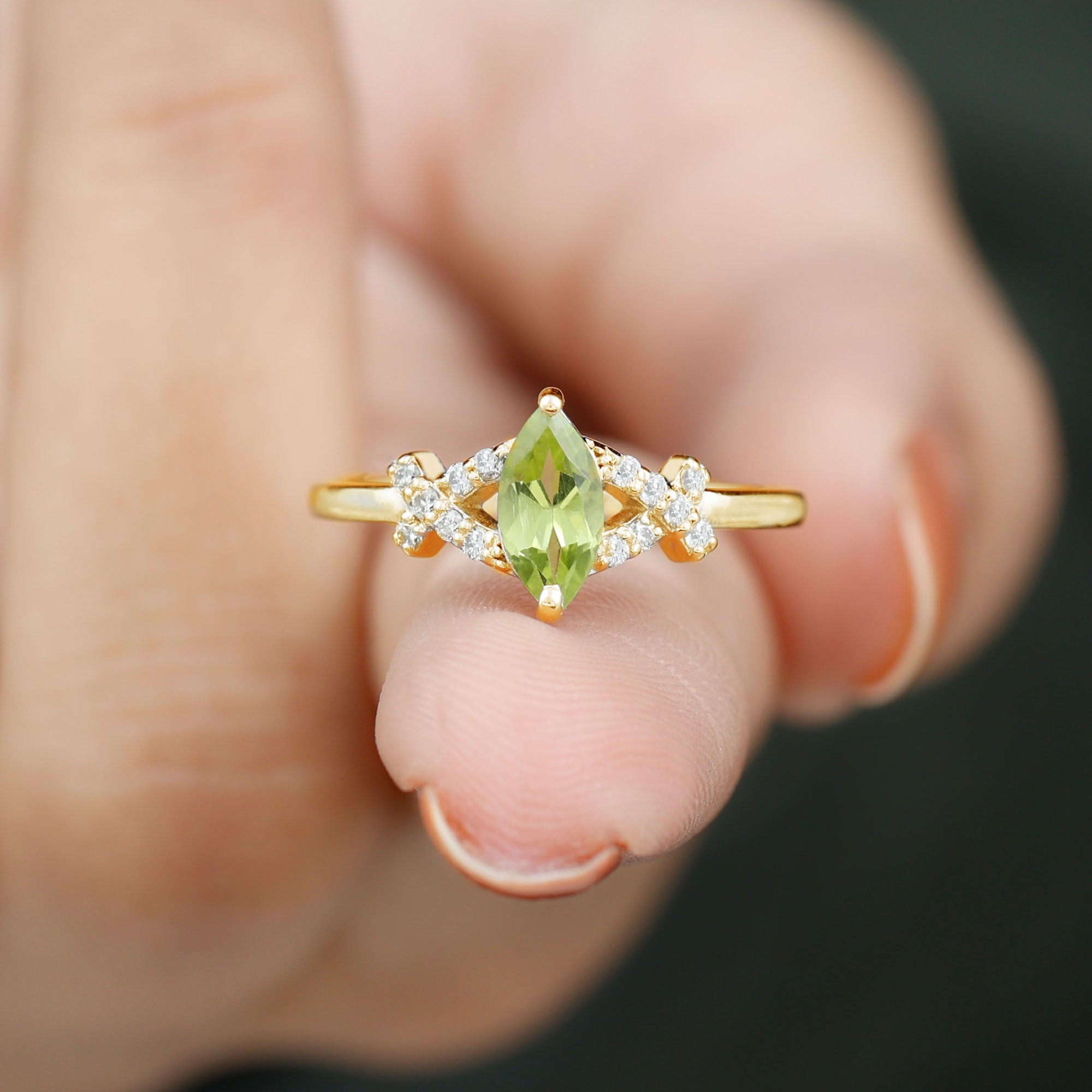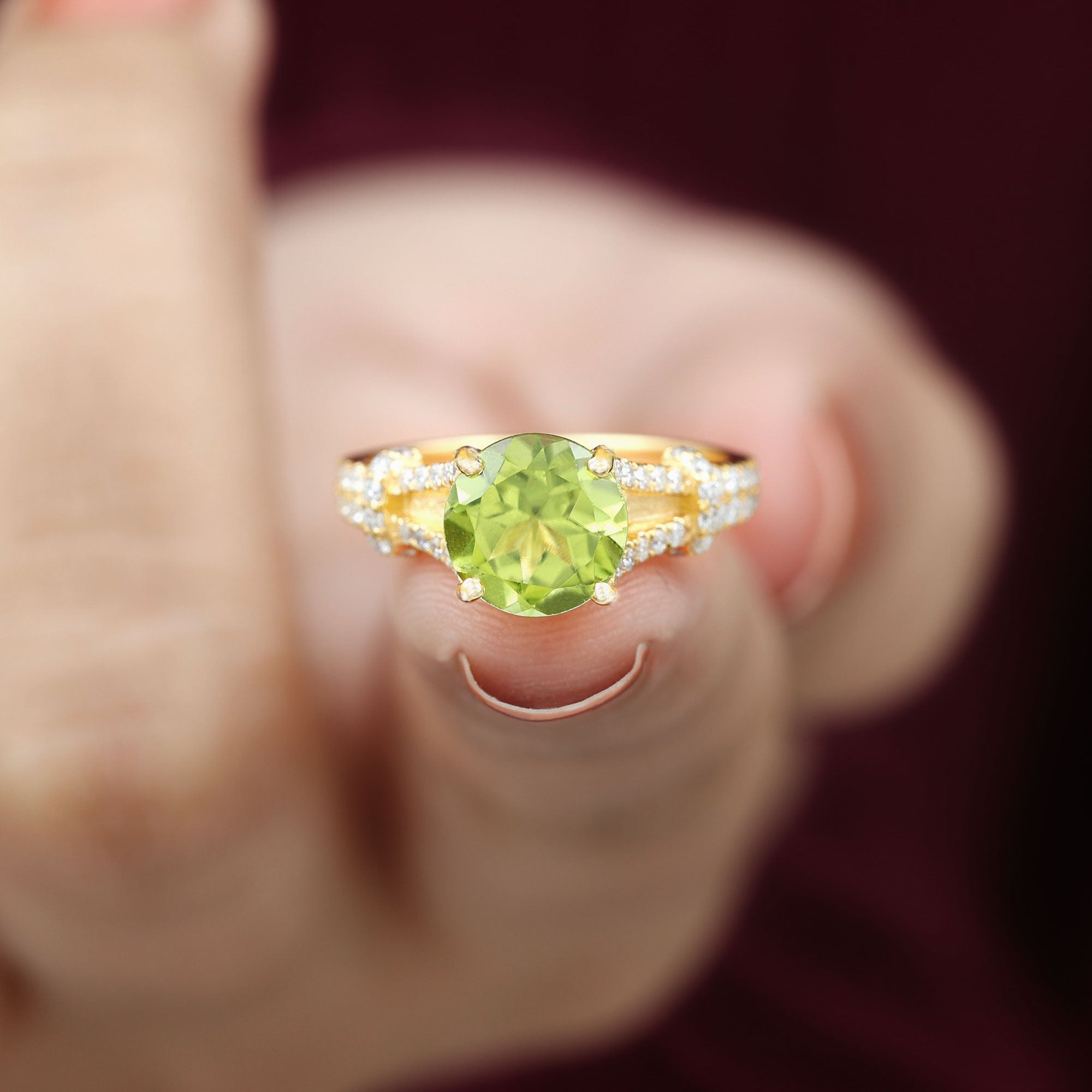 Held in high regard as one of the most classic Peridot Engagement Rings out there, it is characterized by a solo centerpiece of Peridot that steals the limelight. It can also be labeled as the most versatile ring style since the Peridot Solitaire offers you a sea of options in terms of aesthetics, be it the classic Round Peridot Rings offering a traditional aesthetic, the ones fashioned with Pear, Marquise, and Princess exuding an unconventional touch, or Asscher and Emerald Cut Peridot Rings for that perfect vintage vibe.