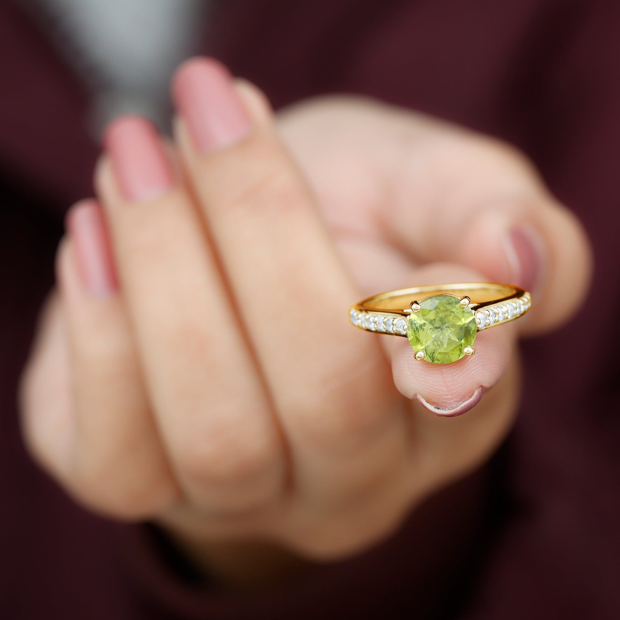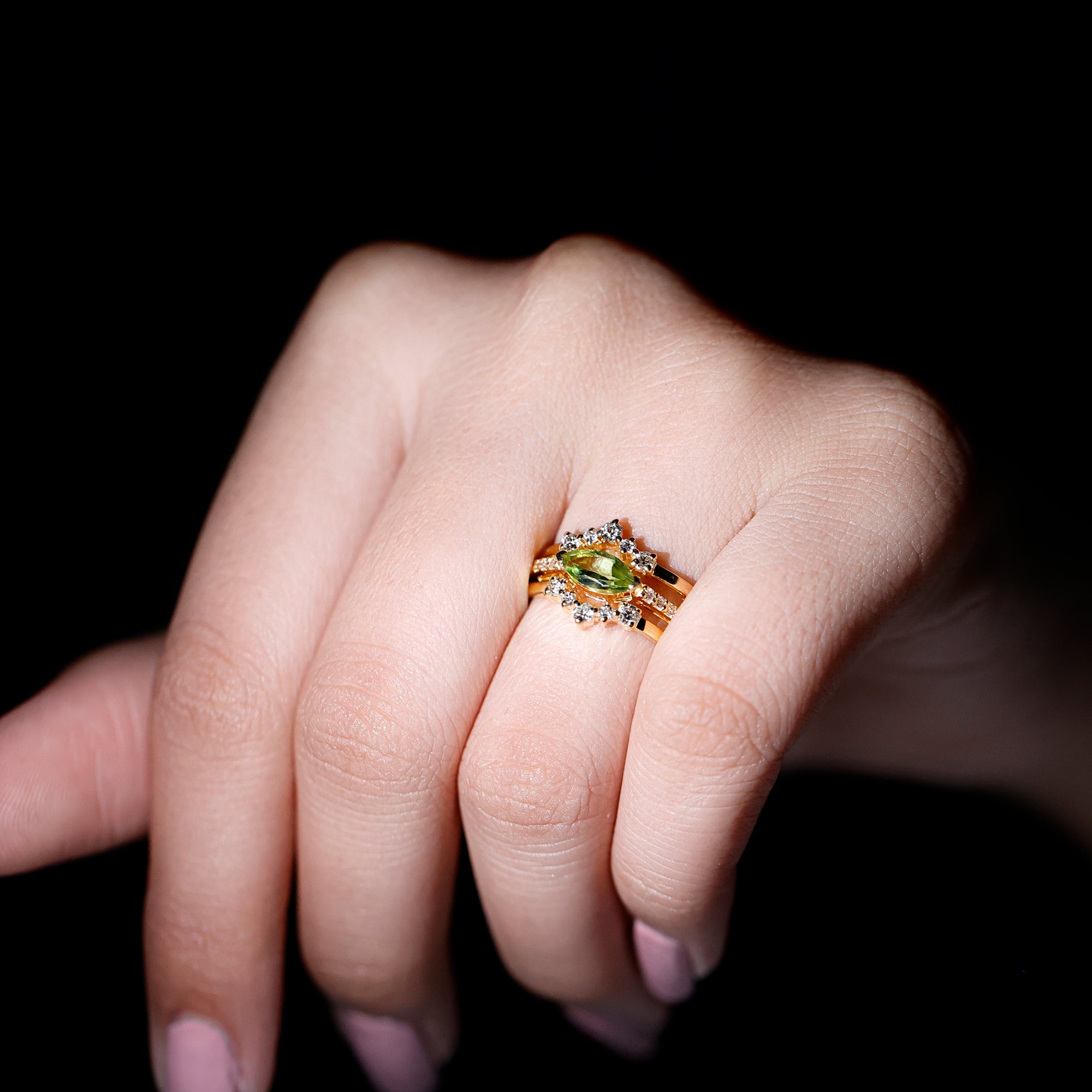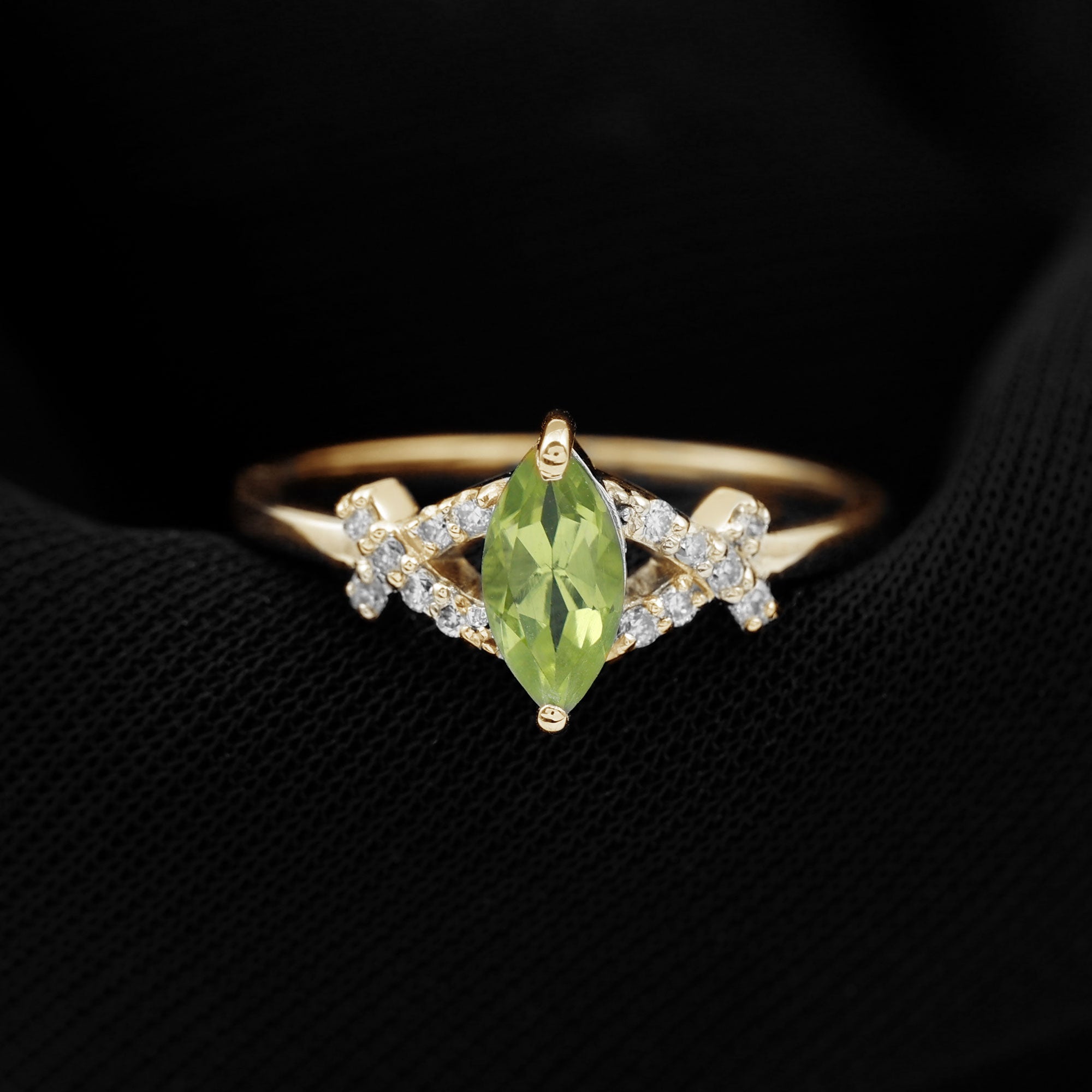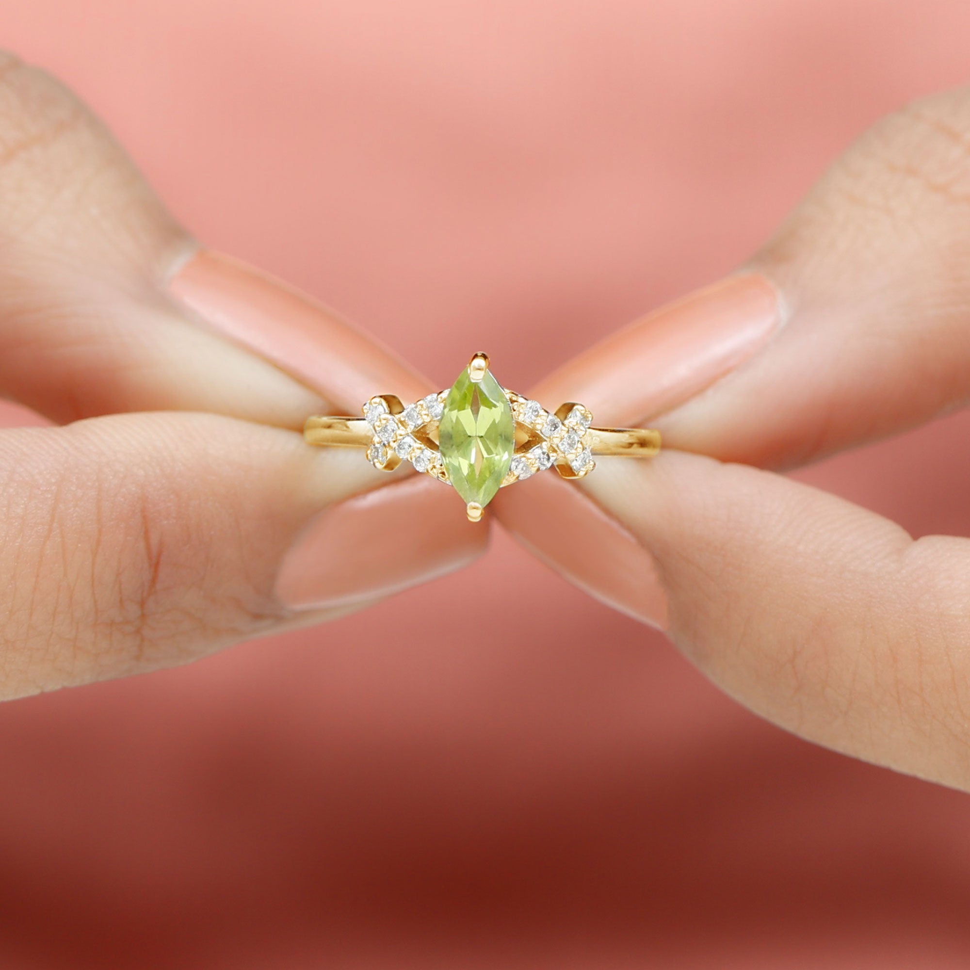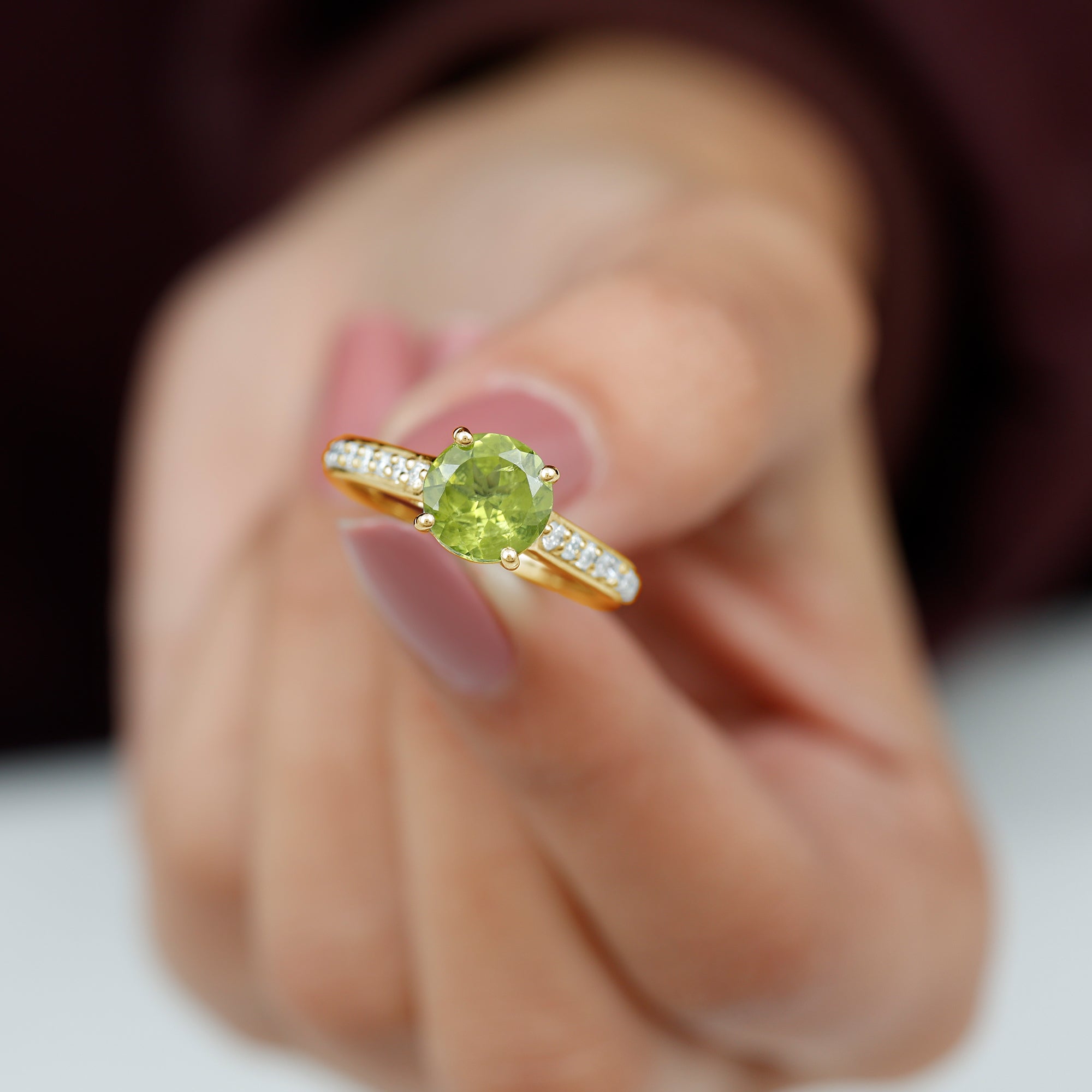 Held in high regard as one of the most classic Peridot Engagement Rings out there, it is characterized by a solo centerpiece of Peridot that steals the limelight. It can also be labeled as the most versatile ring style since the Peridot Solitaire offers you a sea of options in terms of aesthetics, be it the classic Round Peridot Rings offering a traditional aesthetic, the ones fashioned with Pear, Marquise, and Princess exuding an unconventional touch, or Asscher and Emerald Cut Peridot Rings for that perfect vintage vibe.