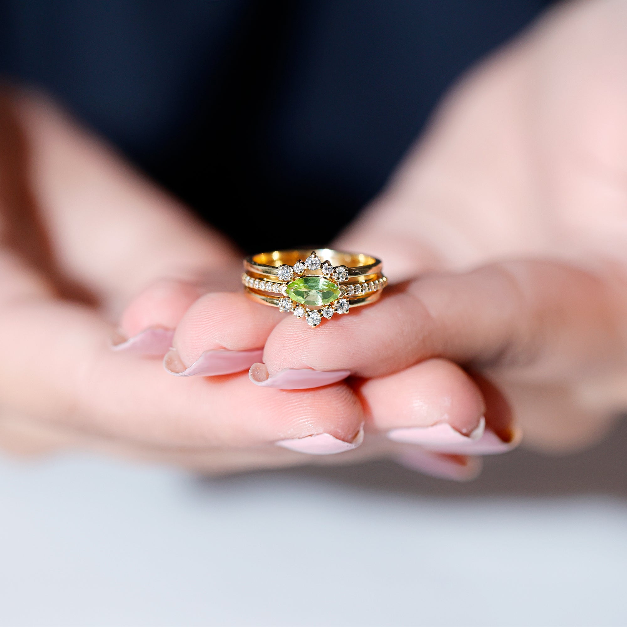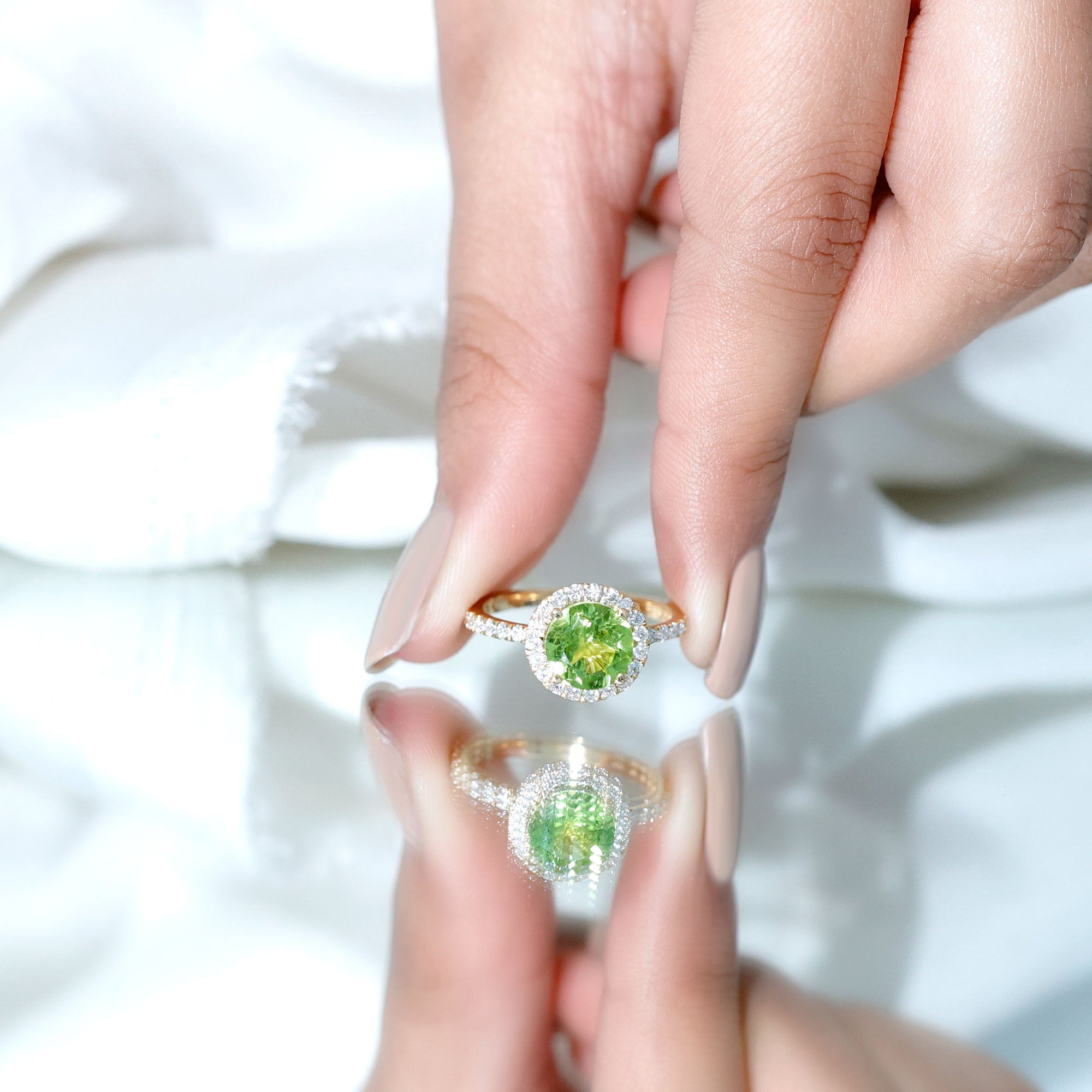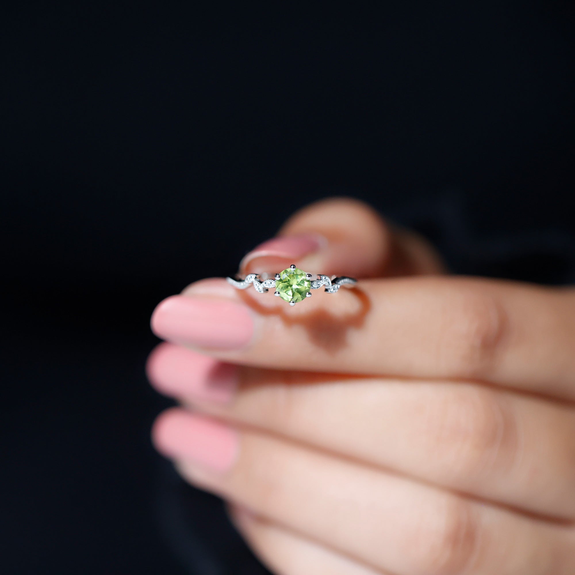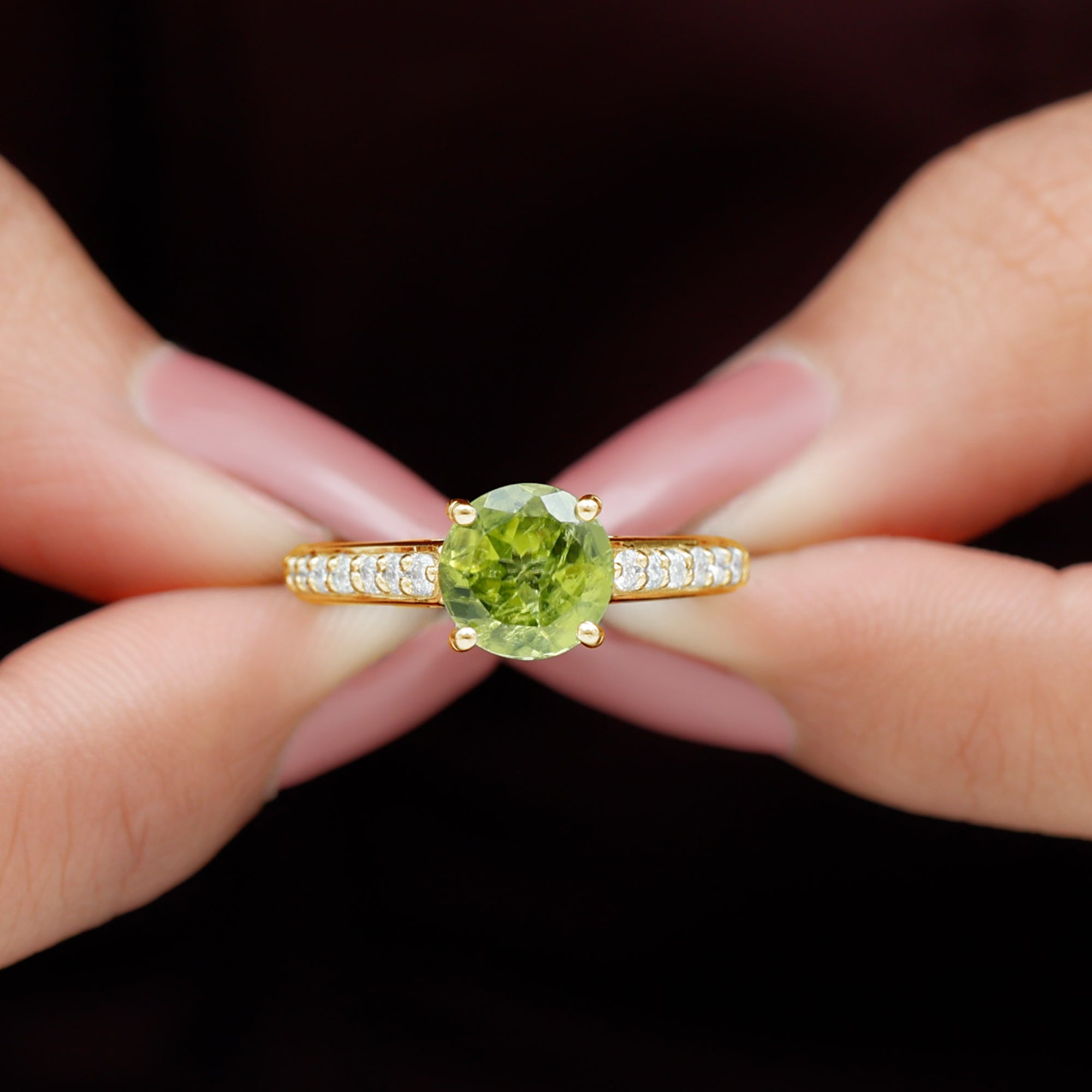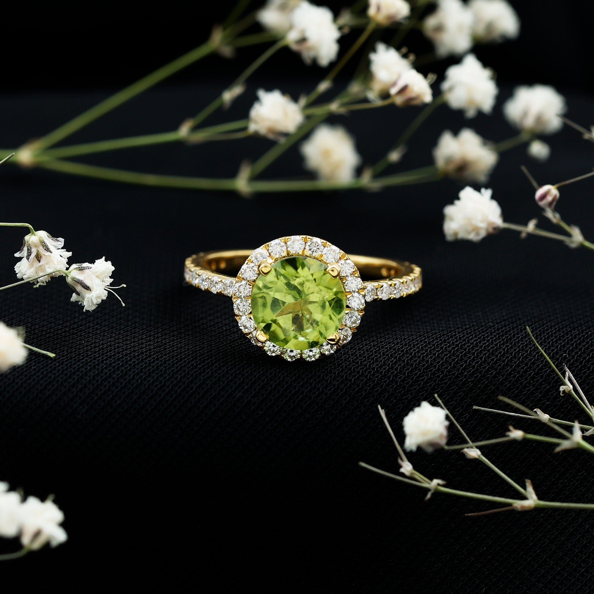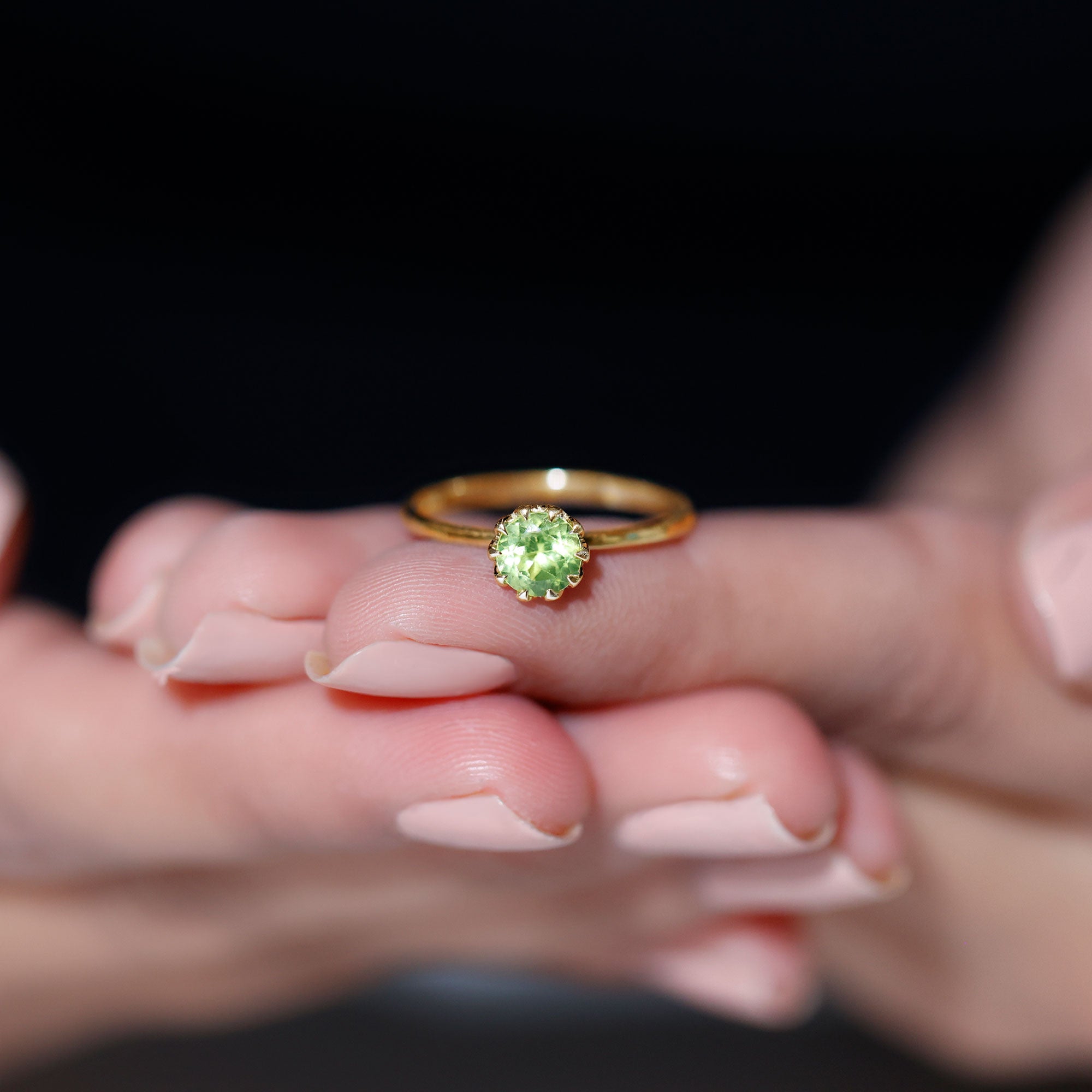 Held in high regard as one of the most classic Peridot Engagement Rings out there, it is characterized by a solo centerpiece of Peridot that steals the limelight. It can also be labeled as the most versatile ring style since the Peridot Solitaire offers you a sea of options in terms of aesthetics, be it the classic Round Peridot Rings offering a traditional aesthetic, the ones fashioned with Pear, Marquise, and Princess exuding an unconventional touch, or Asscher and Emerald Cut Peridot Rings for that perfect vintage vibe.
