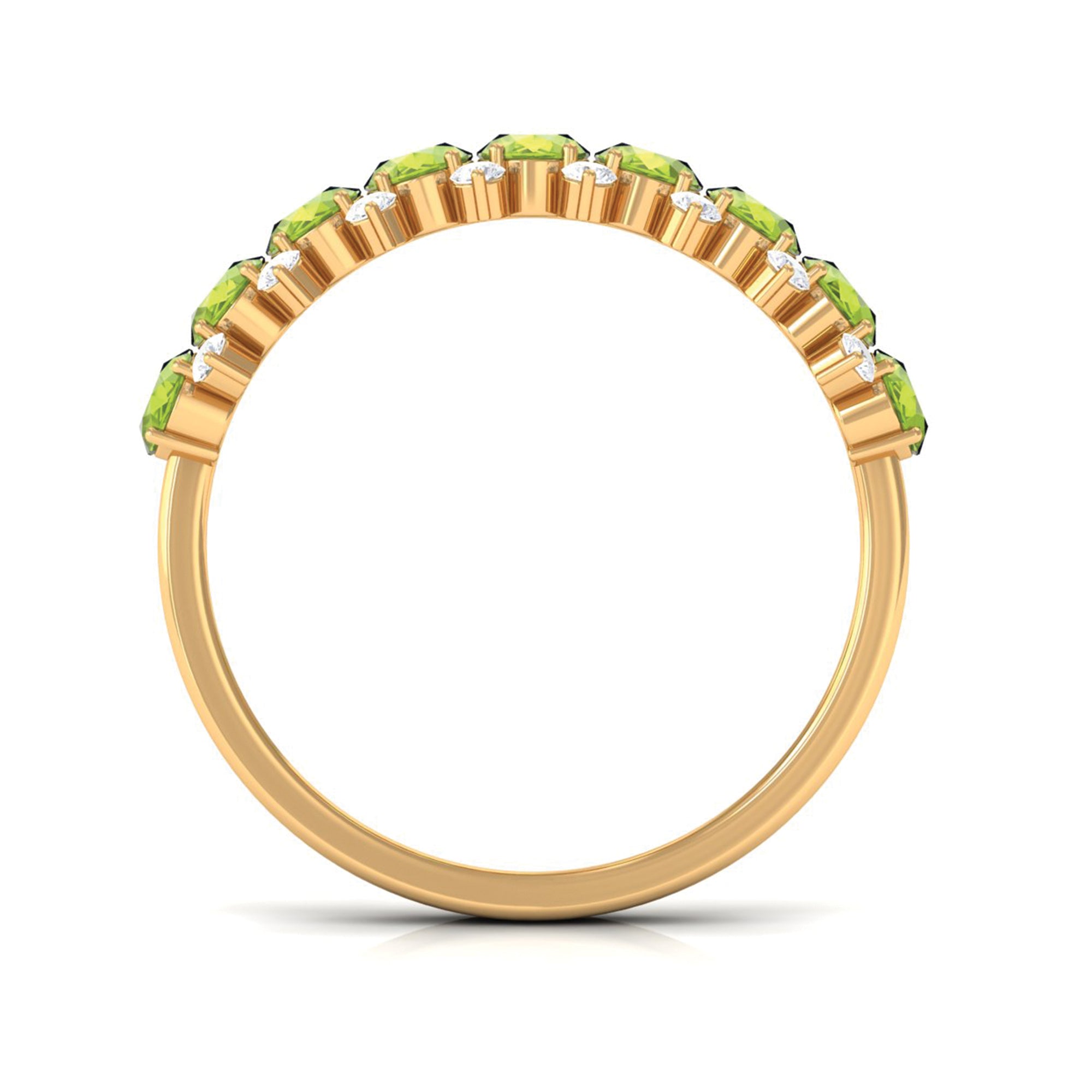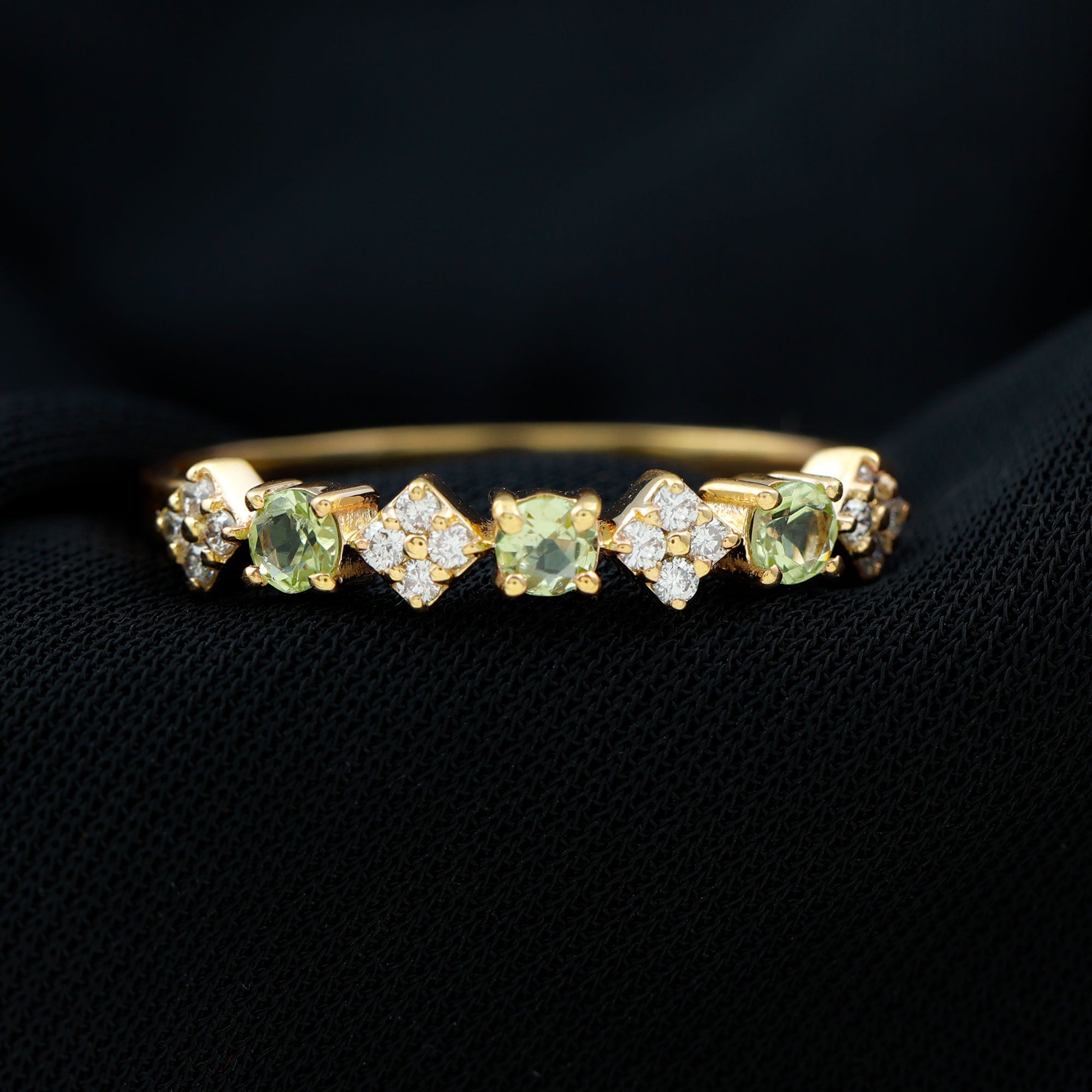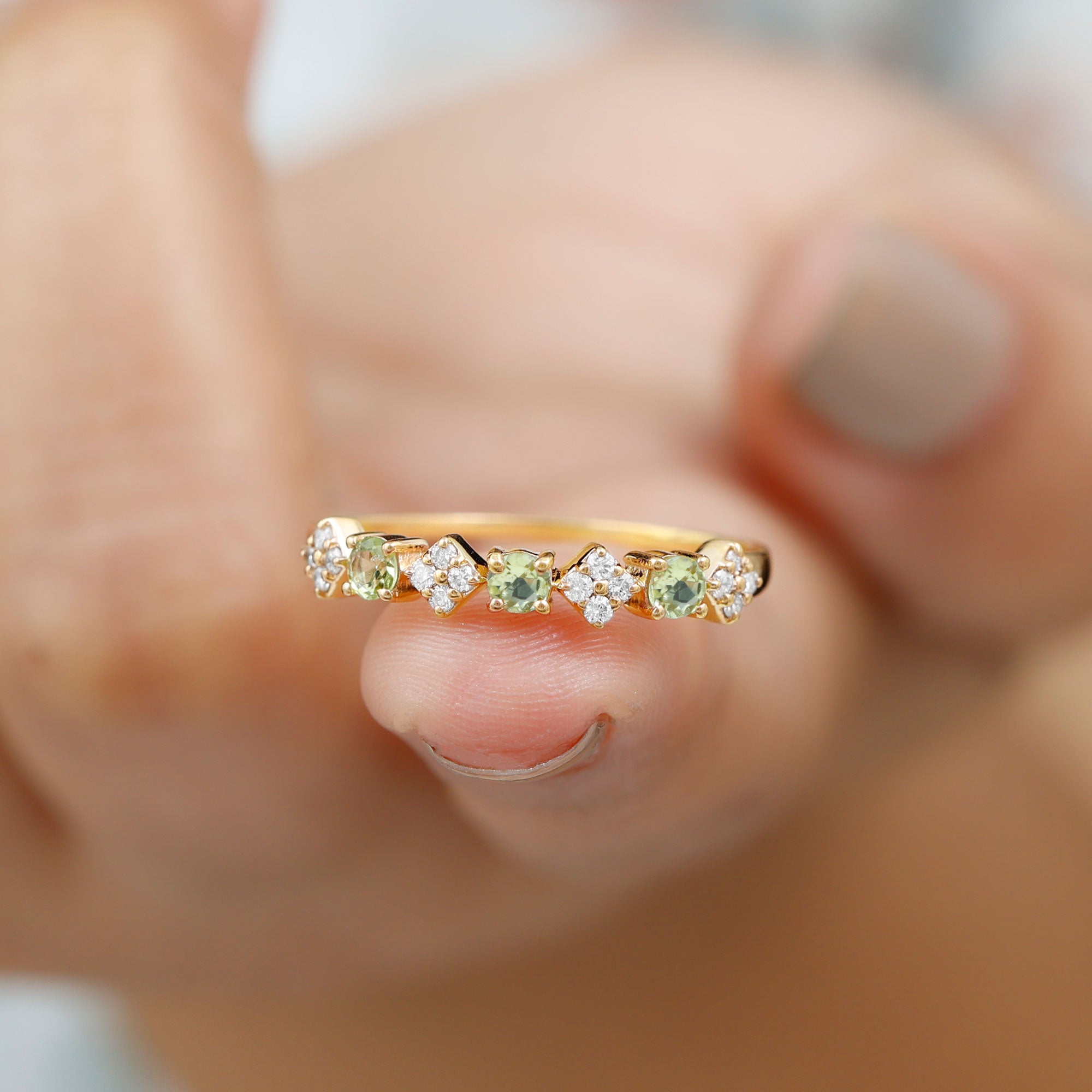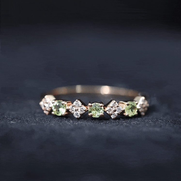 Aesthetically, a Peridot Wedding Ring is embedded with Peridots all over the Band. It could range from a classic Peridot band to a somewhat dramatic triple-row Peridot Band or Scattered Peridot and Diamond Ring. The versatile part is that it also makes for one of the most unique Peridot Stackable Rings. Symbolically, it is exchanged during the wedding vows to commemorate the union of two people forever.