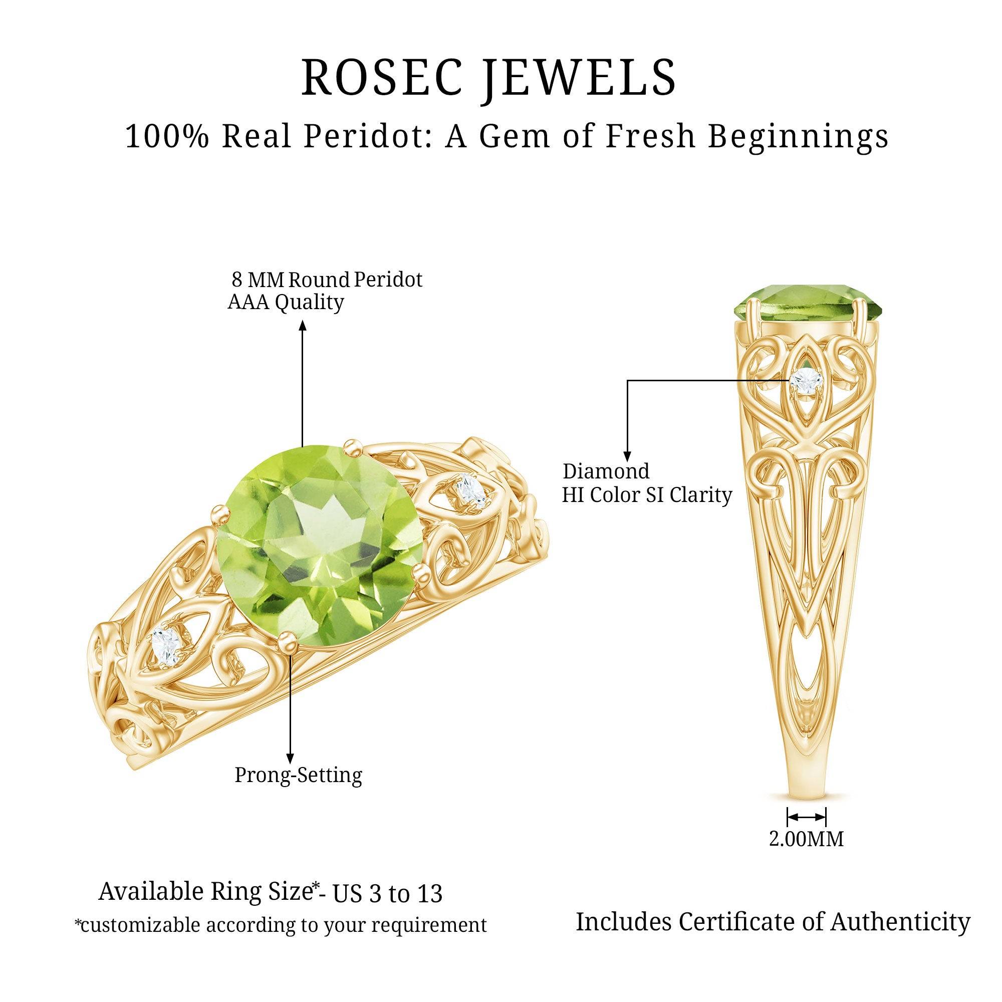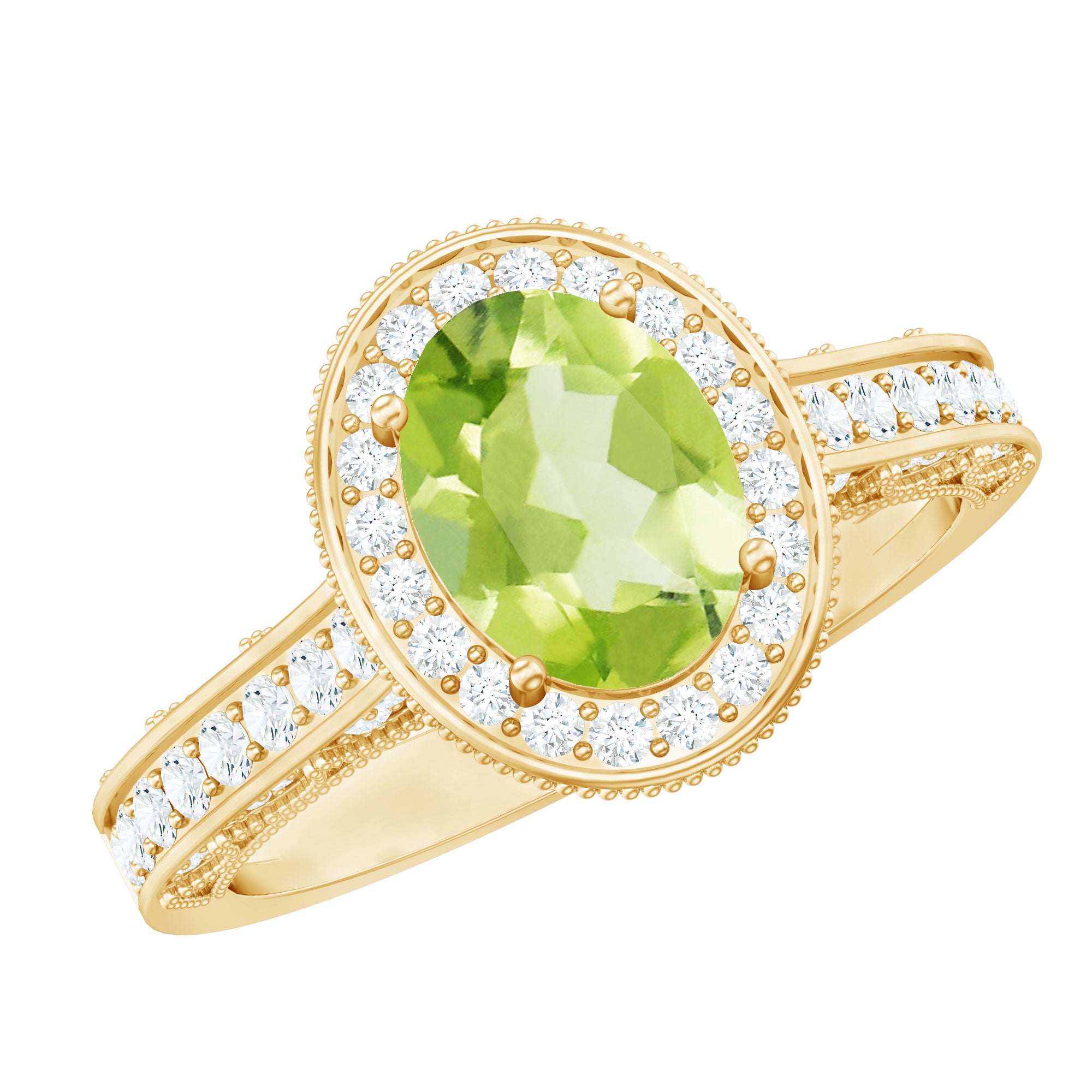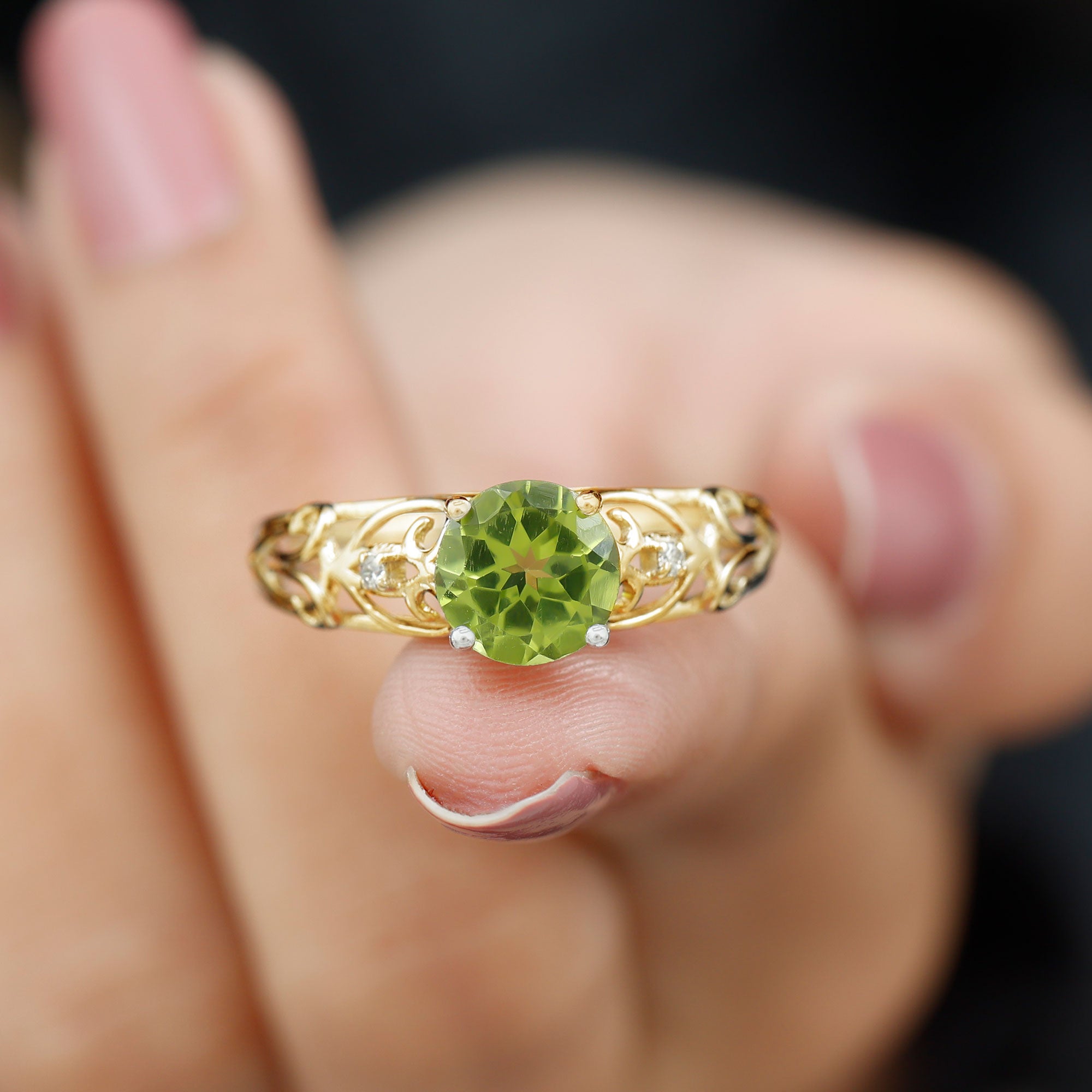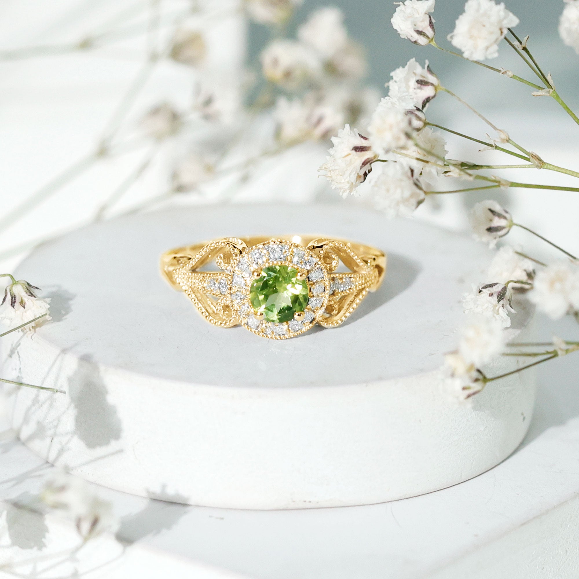 A Vintage-inspired Peridot Ring draws inspiration from the most significant designs from the Victorian, Edwardian, and Art Deco eras. It highlights the center stone of Peridot, which is beautified by antique engravings, milgrain and filigree details, and abstract art deco patterns. This Antique Peridot Ring oozes an old-world feel, which also makes it a highly desirable engagement ring for those who like their token of love to carry a story.