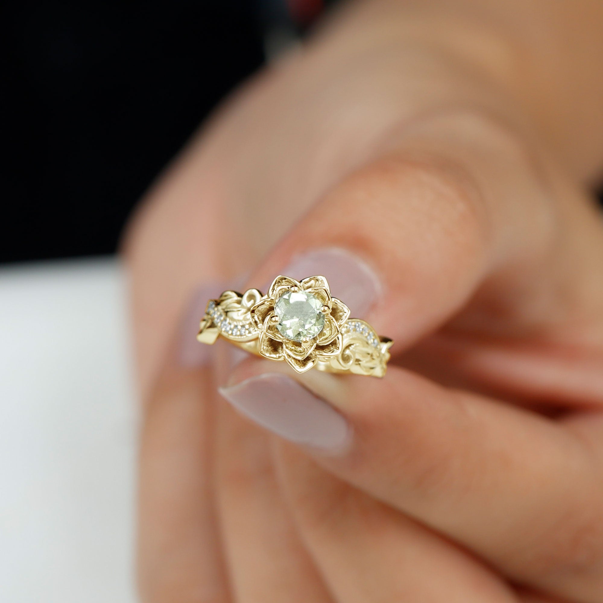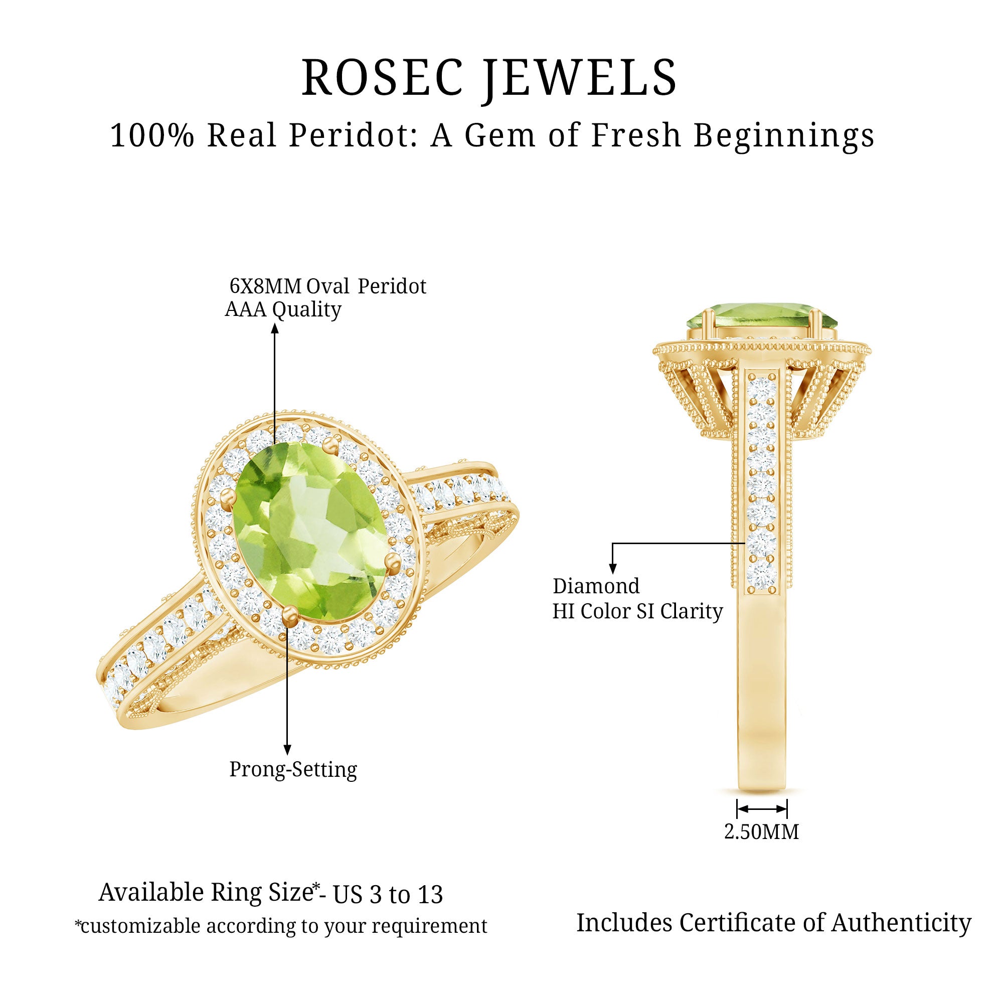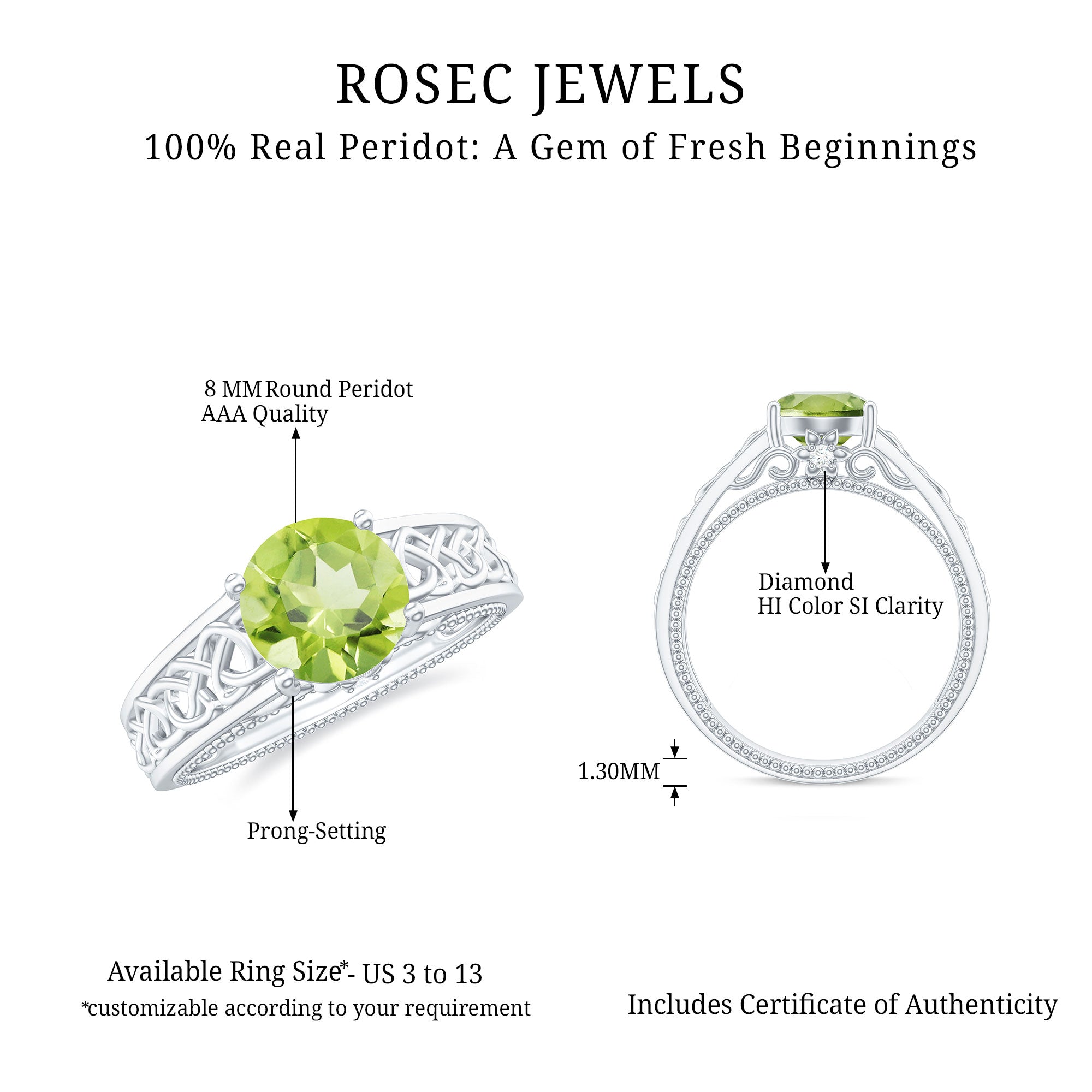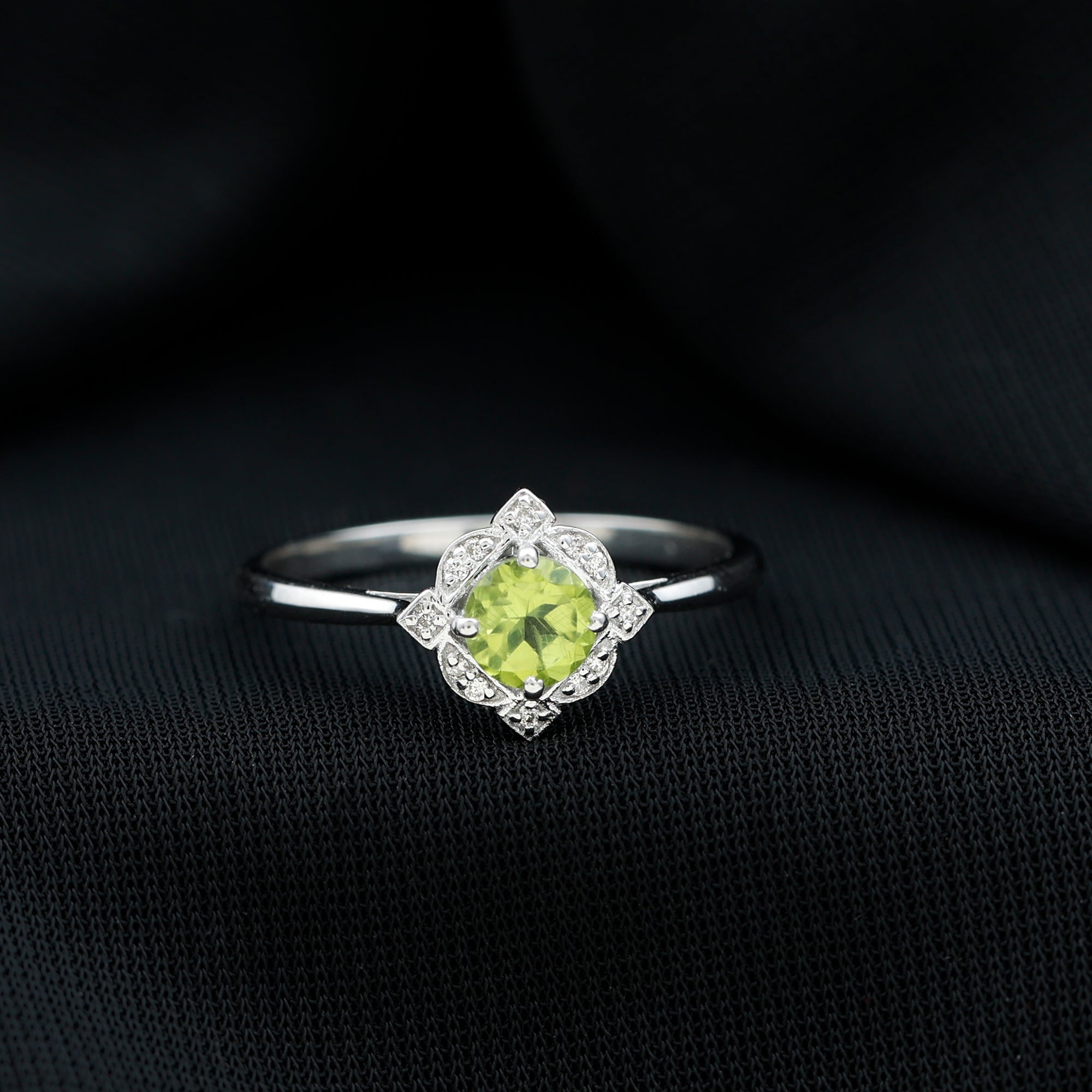 A Vintage-inspired Peridot Ring draws inspiration from the most significant designs from the Victorian, Edwardian, and Art Deco eras. It highlights the center stone of Peridot, which is beautified by antique engravings, milgrain and filigree details, and abstract art deco patterns. This Antique Peridot Ring oozes an old-world feel, which also makes it a highly desirable engagement ring for those who like their token of love to carry a story.