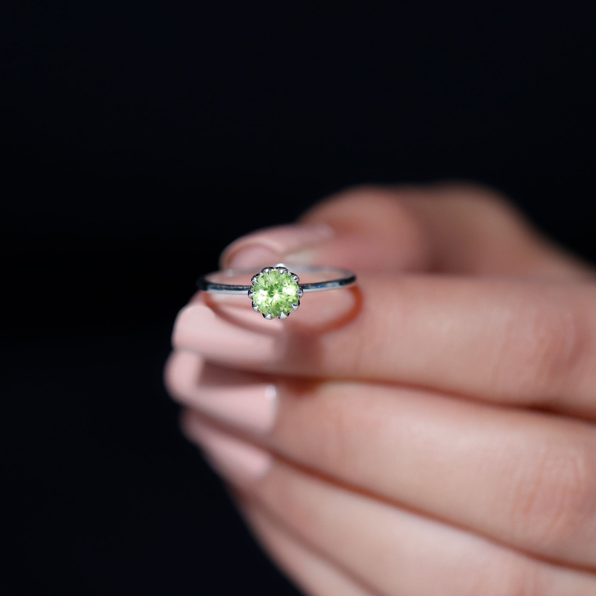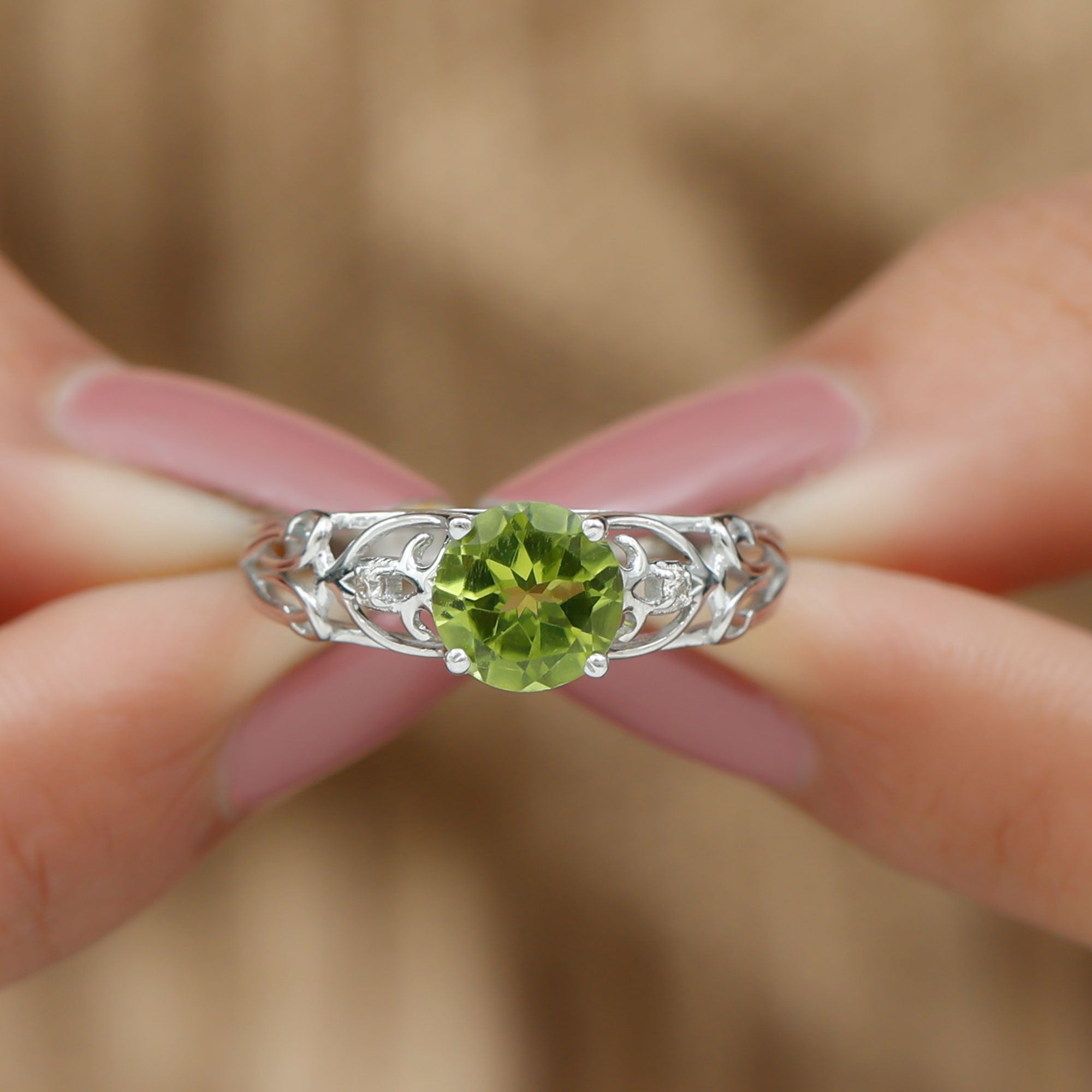 • Sterling Silver: A peridot silver ring is a perfect choice for those who enjoy the beauty of vibrant green gems with a striking sterling silver contrast, highlighting the gem’s lively green color.