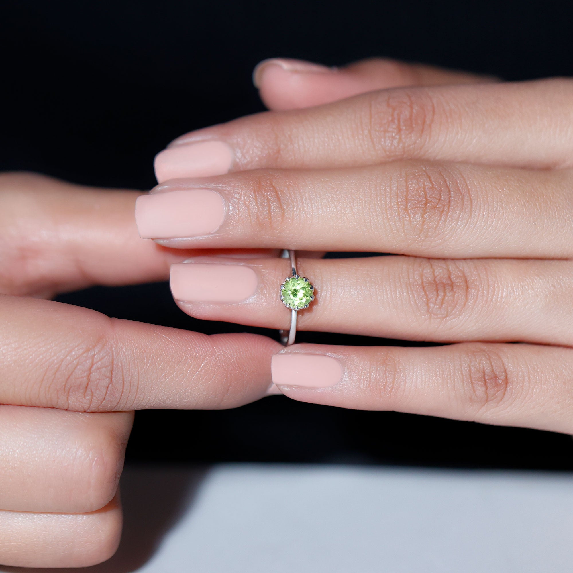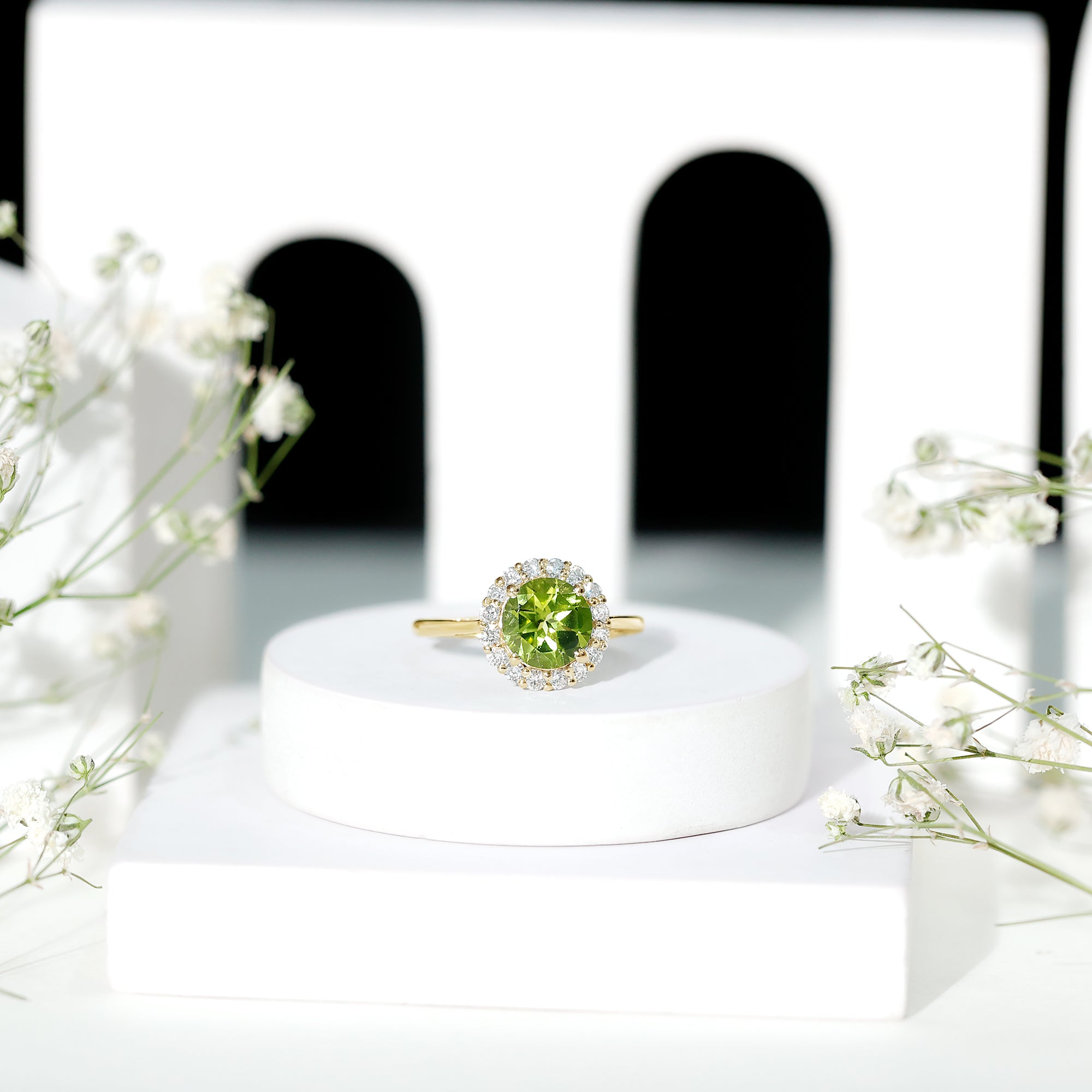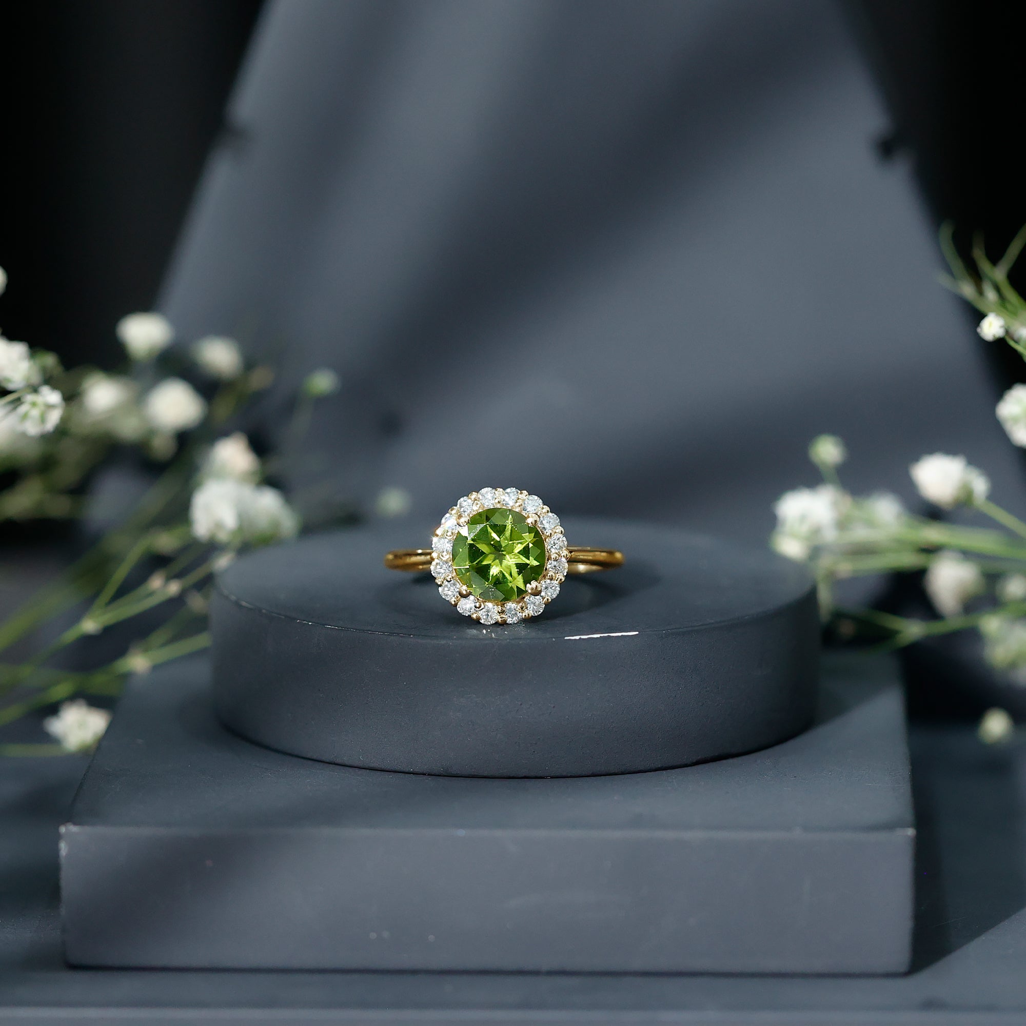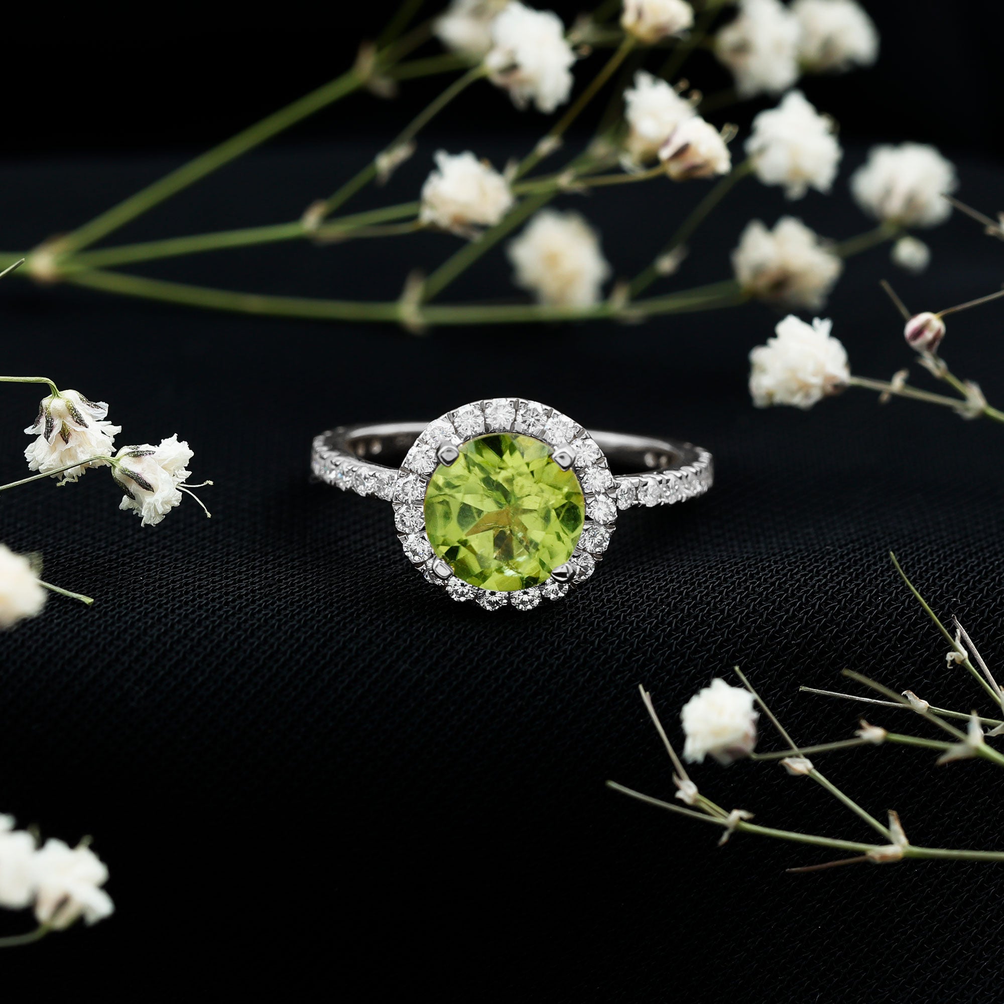 When the Centerpiece of Peridot is encircled with a shimmering row of Diamond/Moissanite (i.e., the Halo), it is termed a Peridot Halo Ring. Offering a unique touch to the otherwise classic Peridot Solitaire Ring, it highlights the center stone by making it appear bigger than its size. For those who are on the lookout for a Peridot and Diamond Ring, this Halo-style ring might end your hunt.