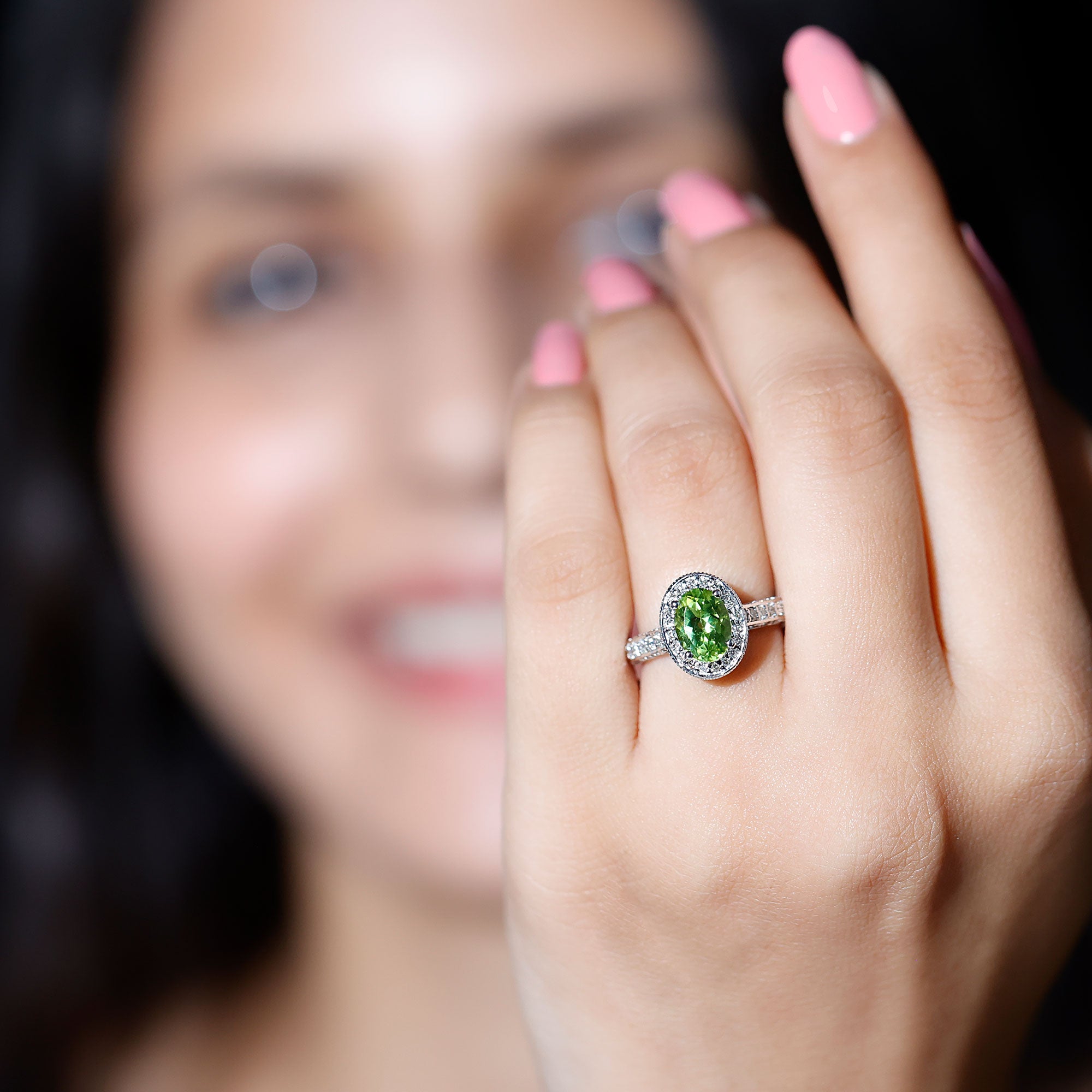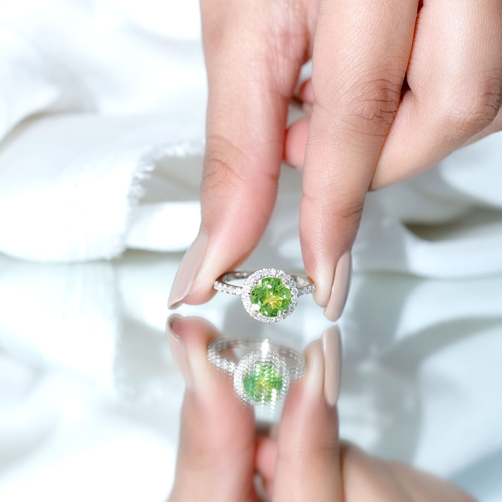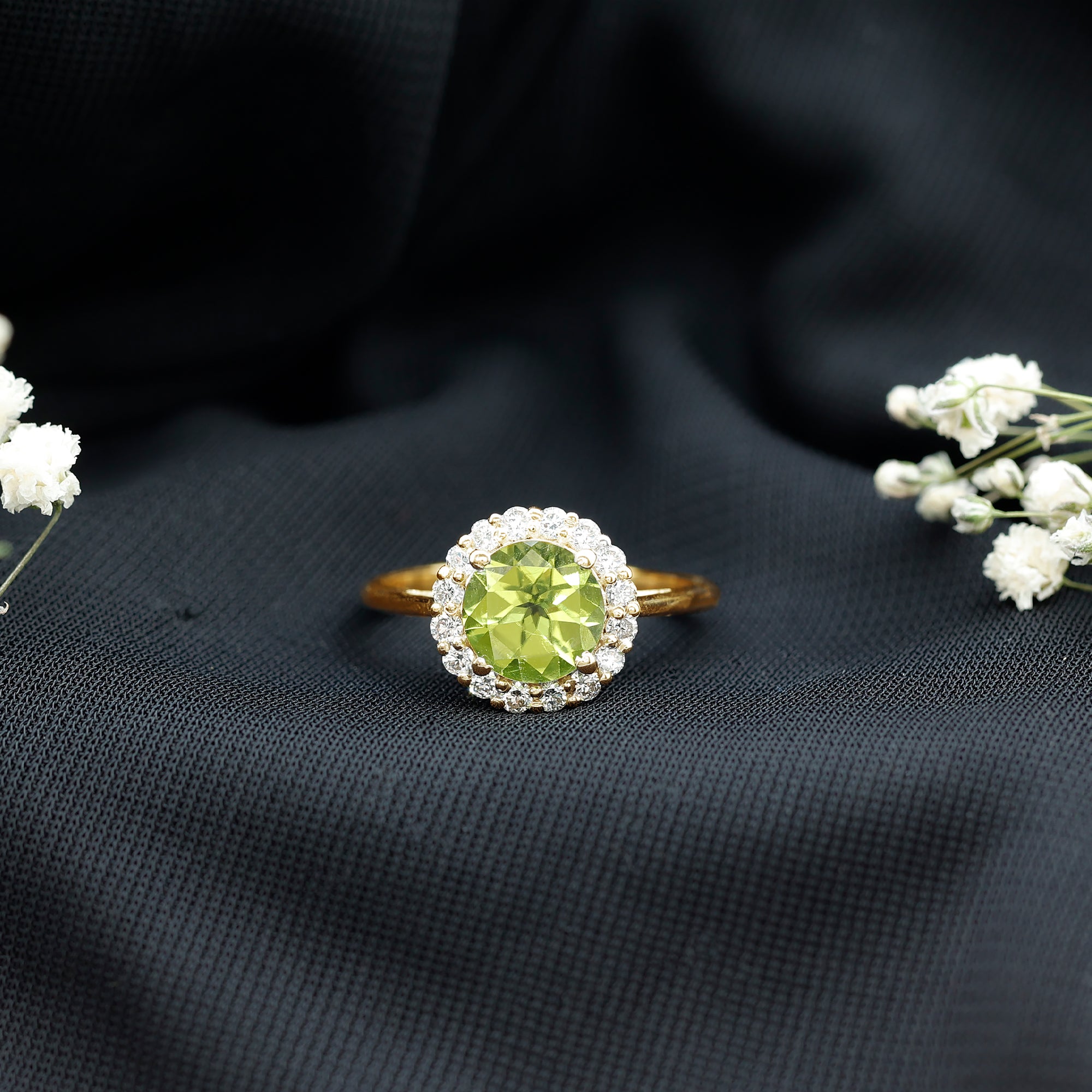 When the Centerpiece of Peridot is encircled with a shimmering row of Diamond/Moissanite (i.e., the Halo), it is termed a Peridot Halo Ring. Offering a unique touch to the otherwise classic Peridot Solitaire Ring, it highlights the center stone by making it appear bigger than its size. For those who are on the lookout for a Peridot and Diamond Ring, this Halo-style ring might end your hunt.