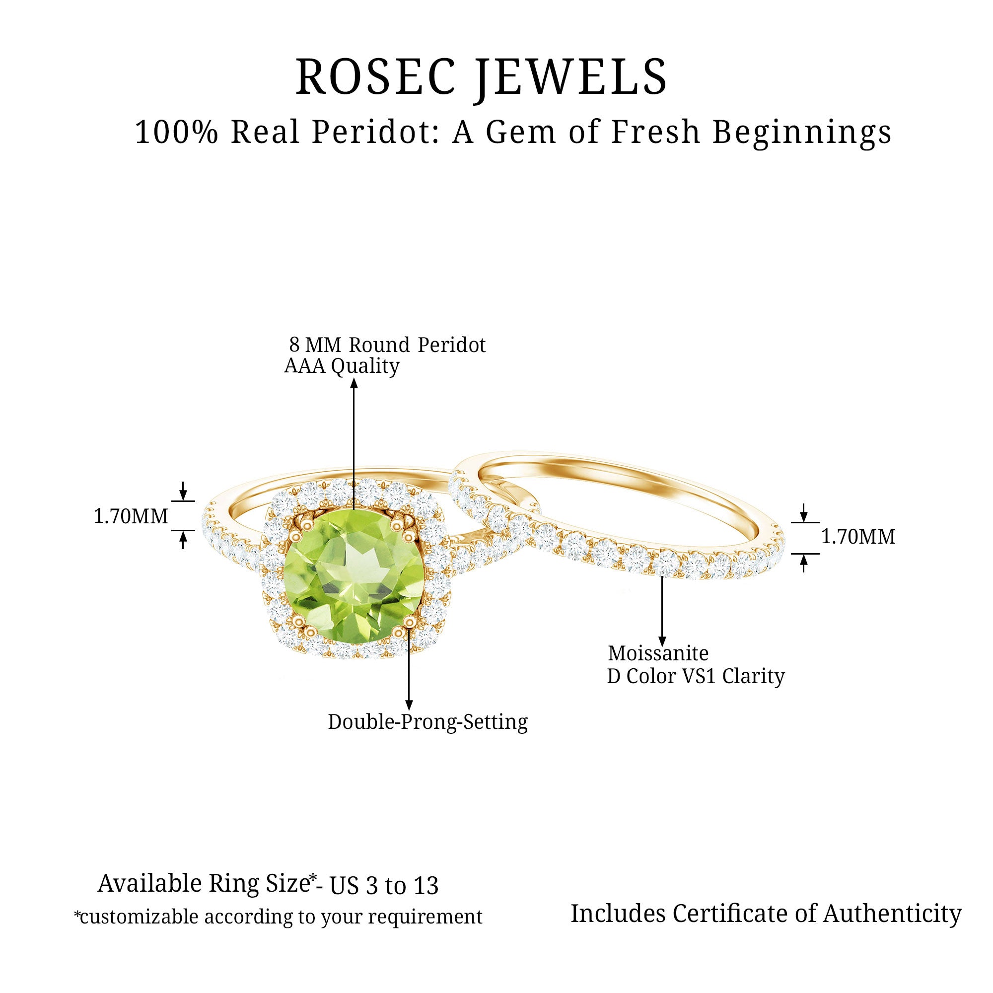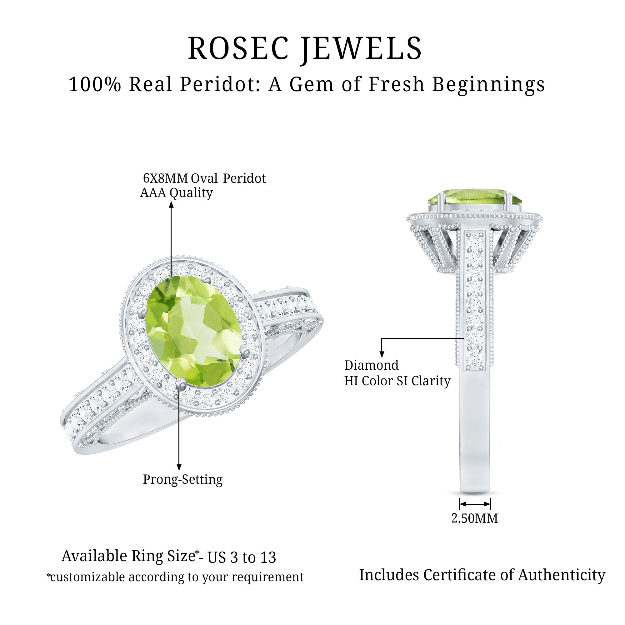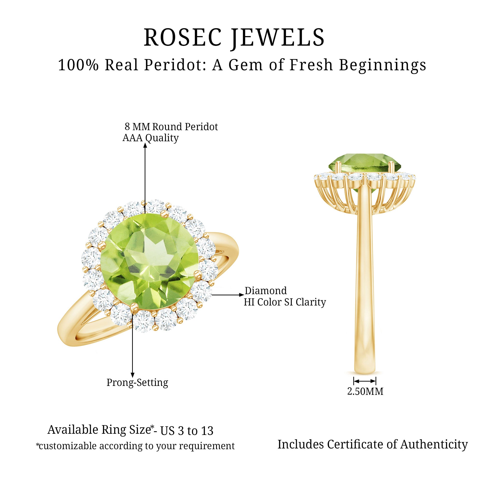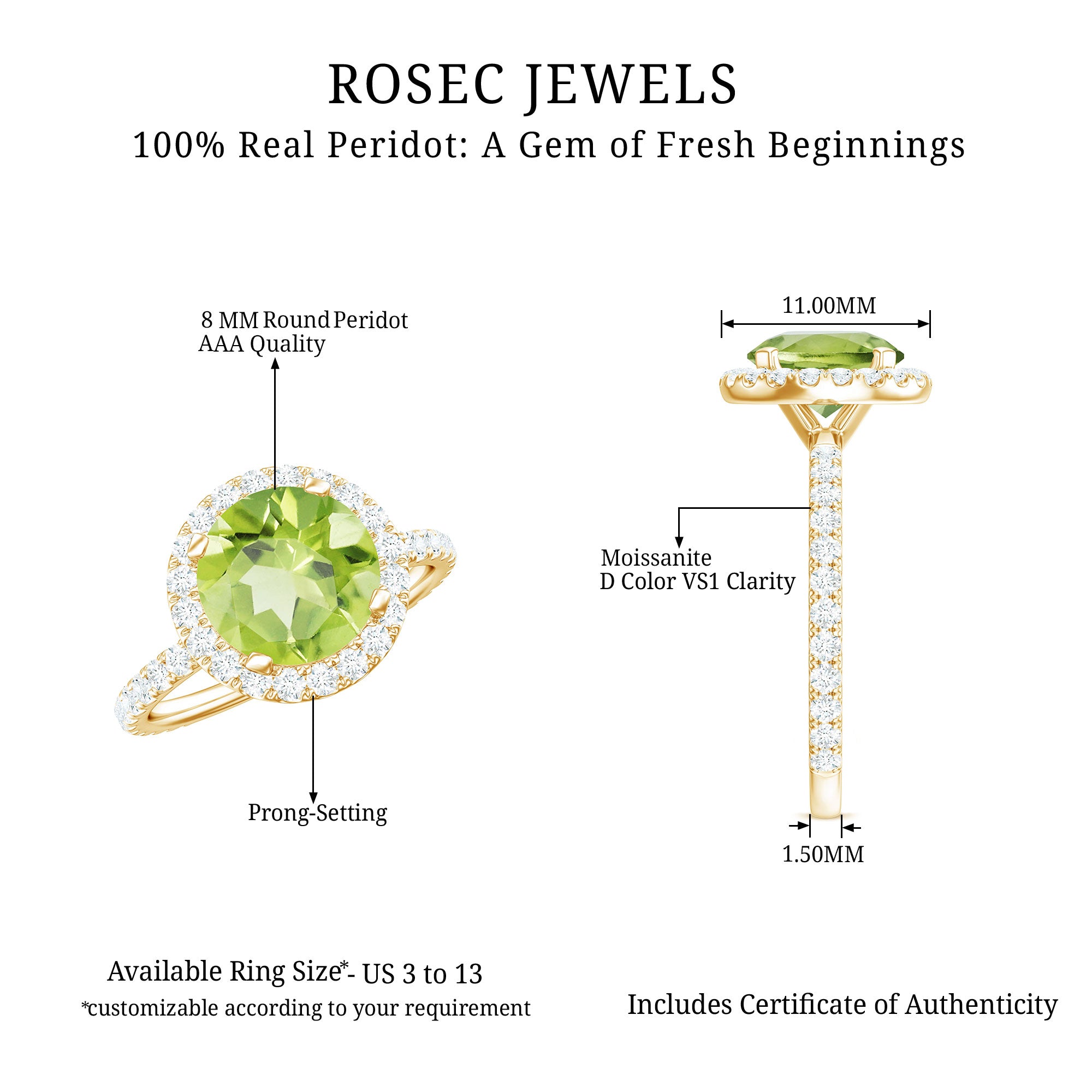 When the Centerpiece of Peridot is encircled with a shimmering row of Diamond/Moissanite (i.e., the Halo), it is termed a Peridot Halo Ring. Offering a unique touch to the otherwise classic Peridot Solitaire Ring, it highlights the center stone by making it appear bigger than its size. For those who are on the lookout for a Peridot and Diamond Ring, this Halo-style ring might end your hunt.