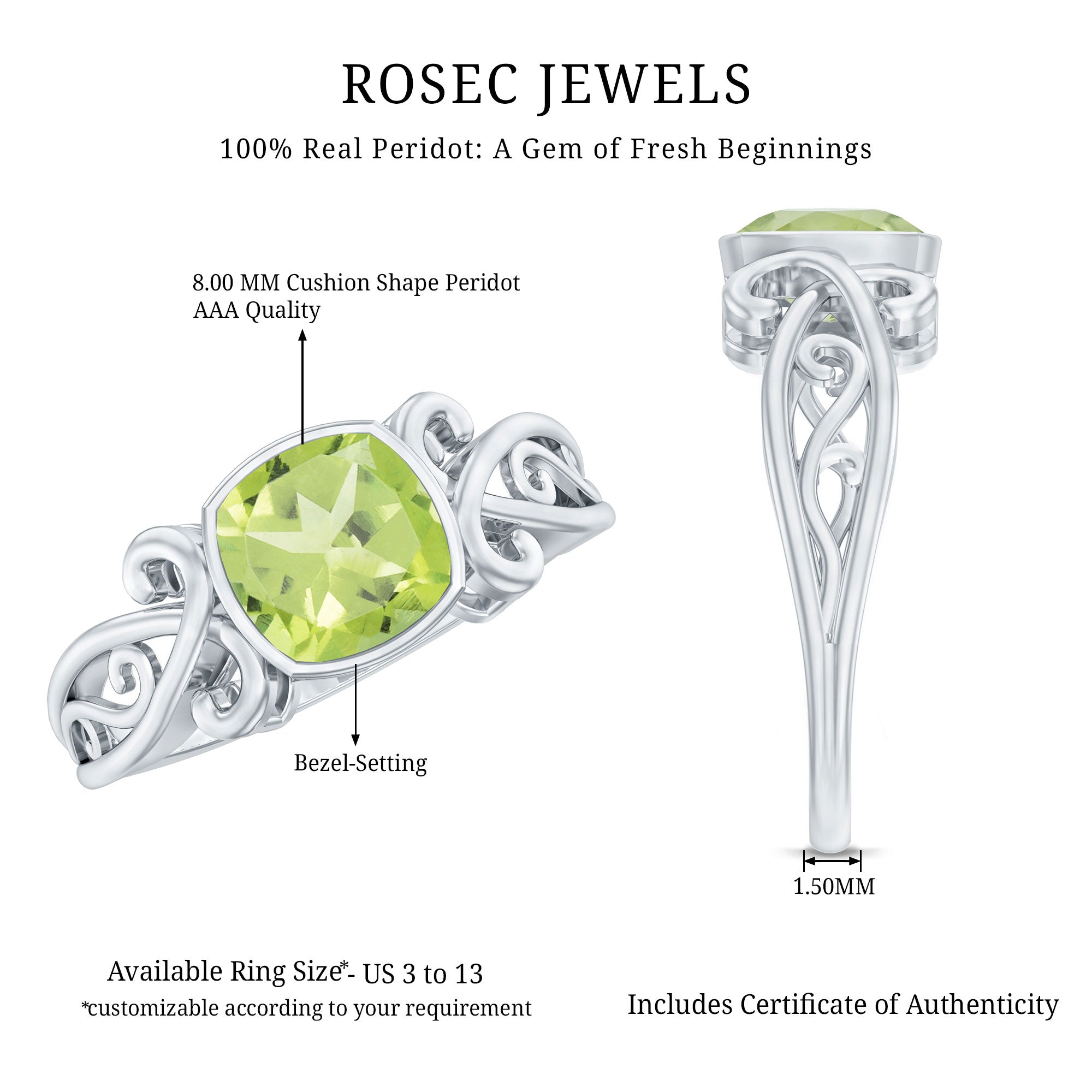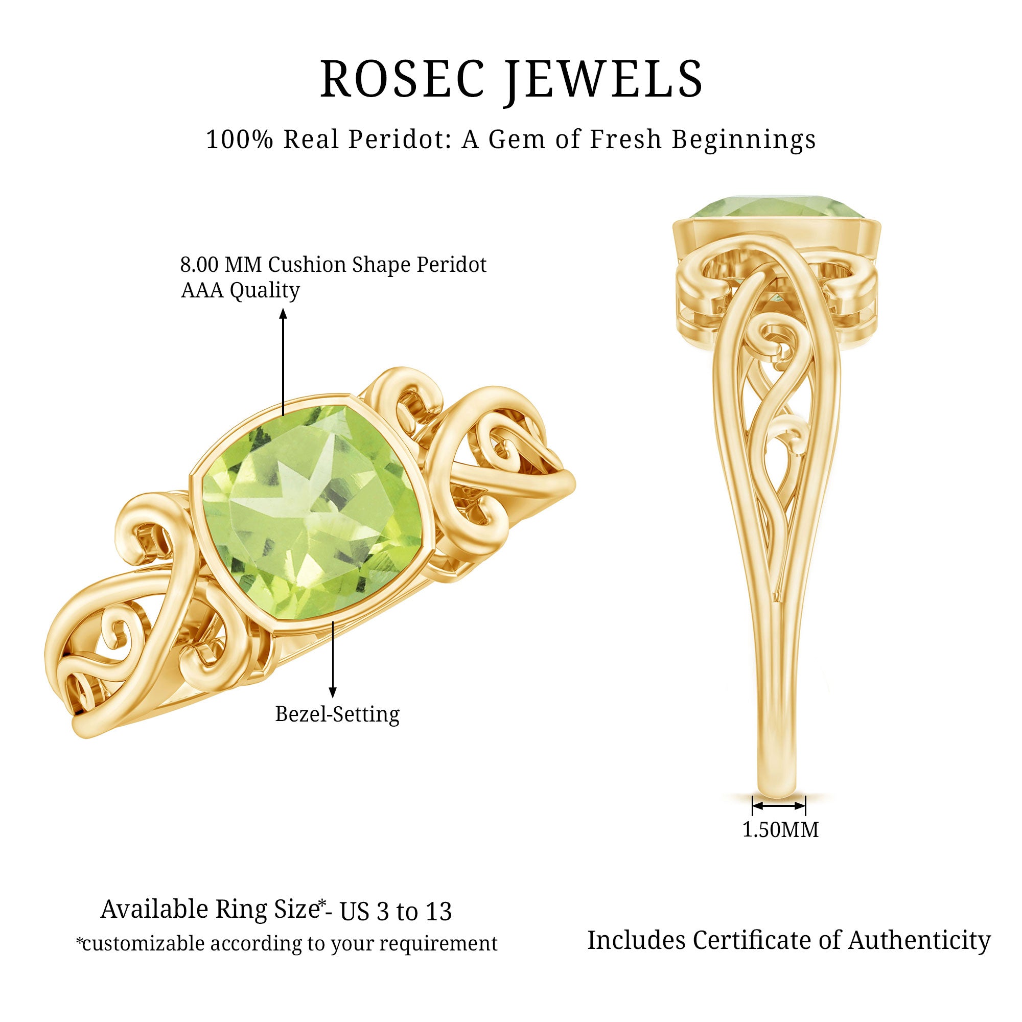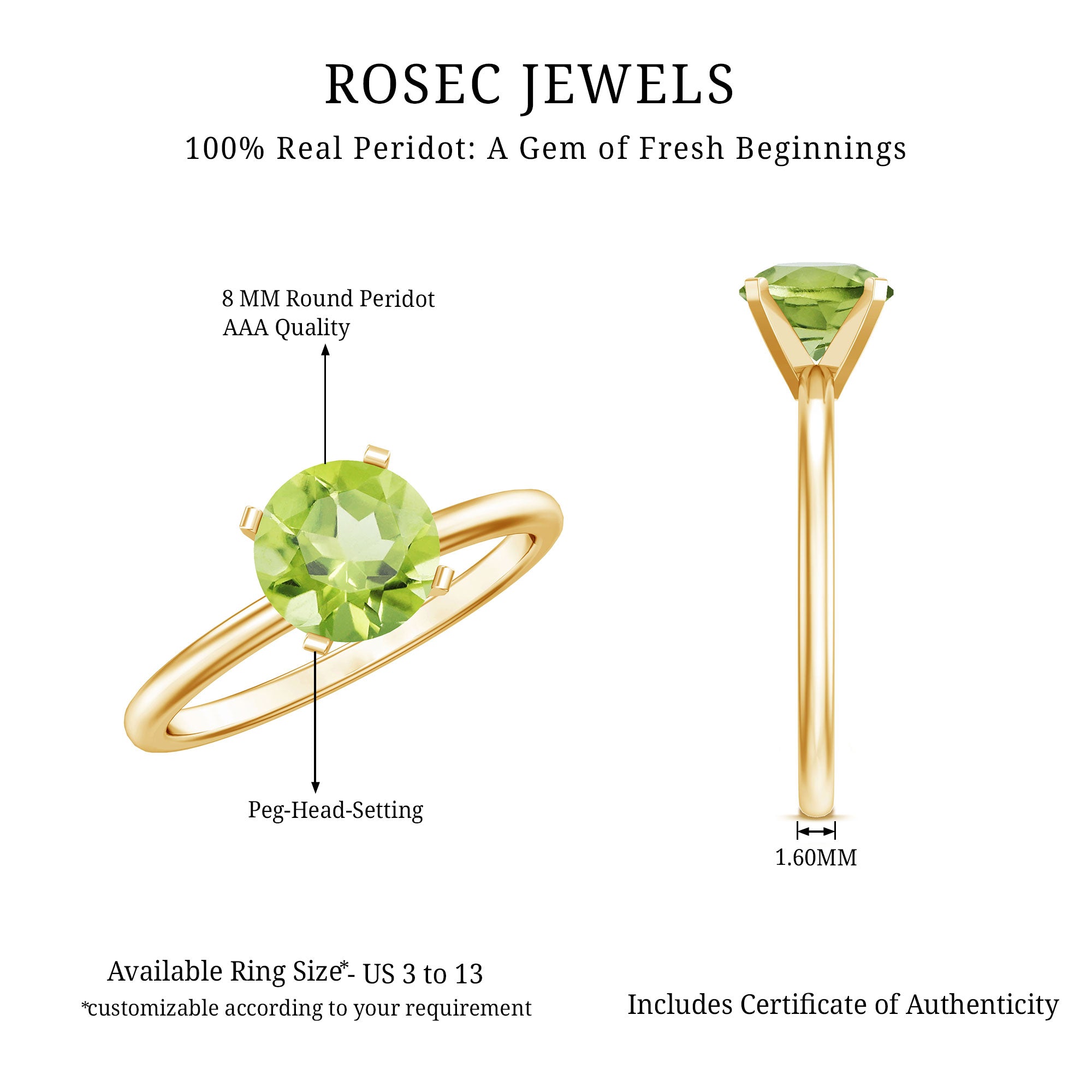 Rose Gold: A Rose Gold Peridot Ring appeals with its uniquely feminine aesthetic, which is a result of its subtle pinkish hue.