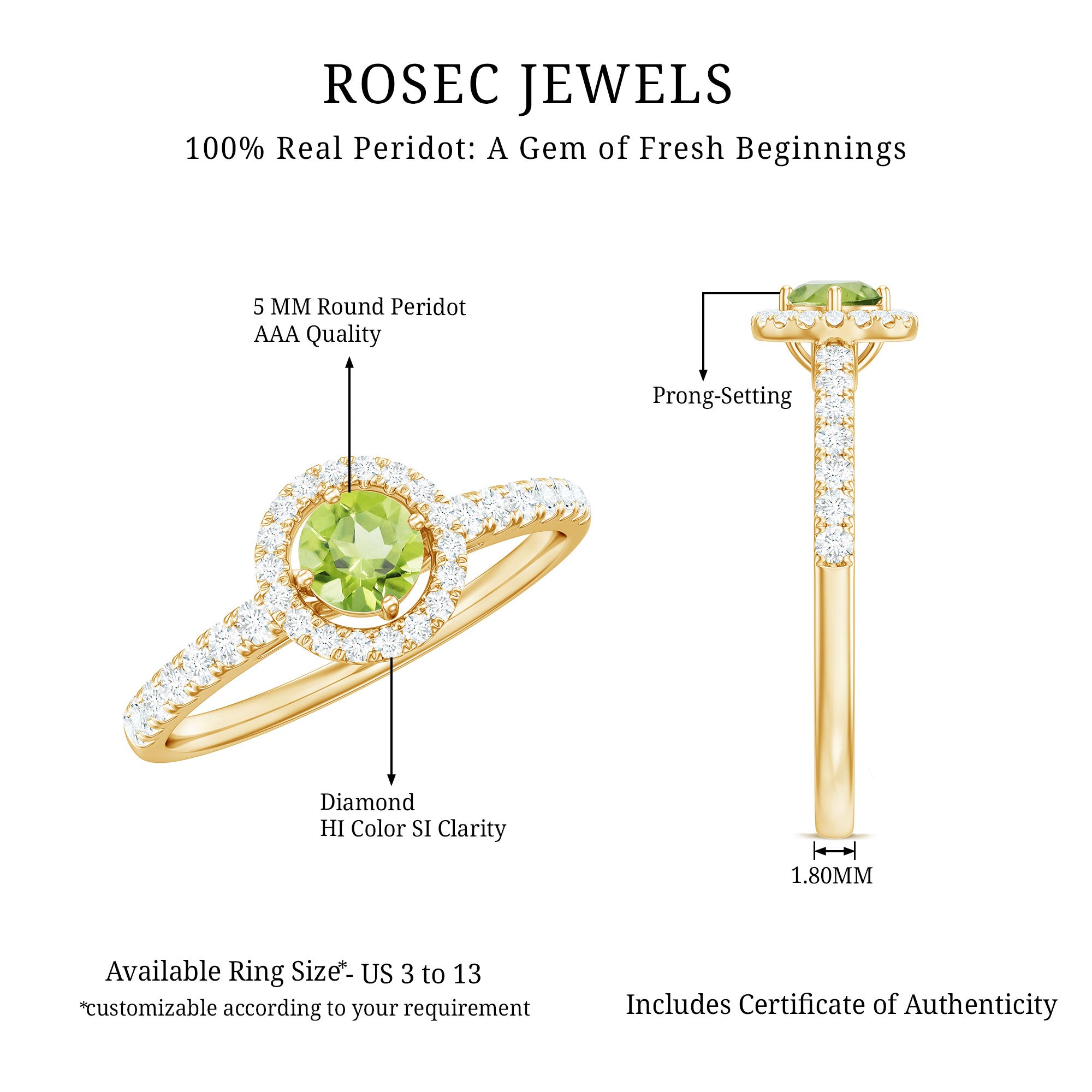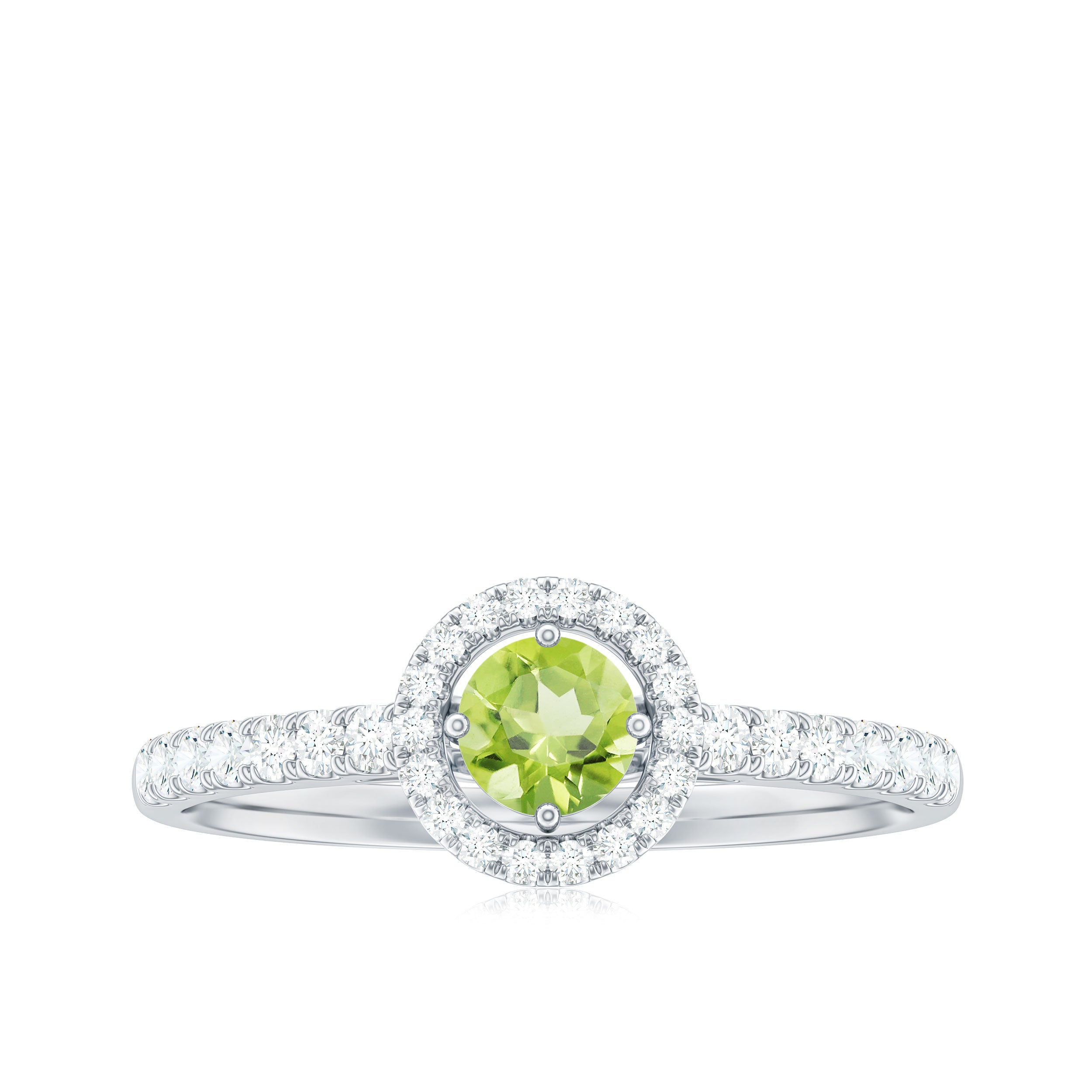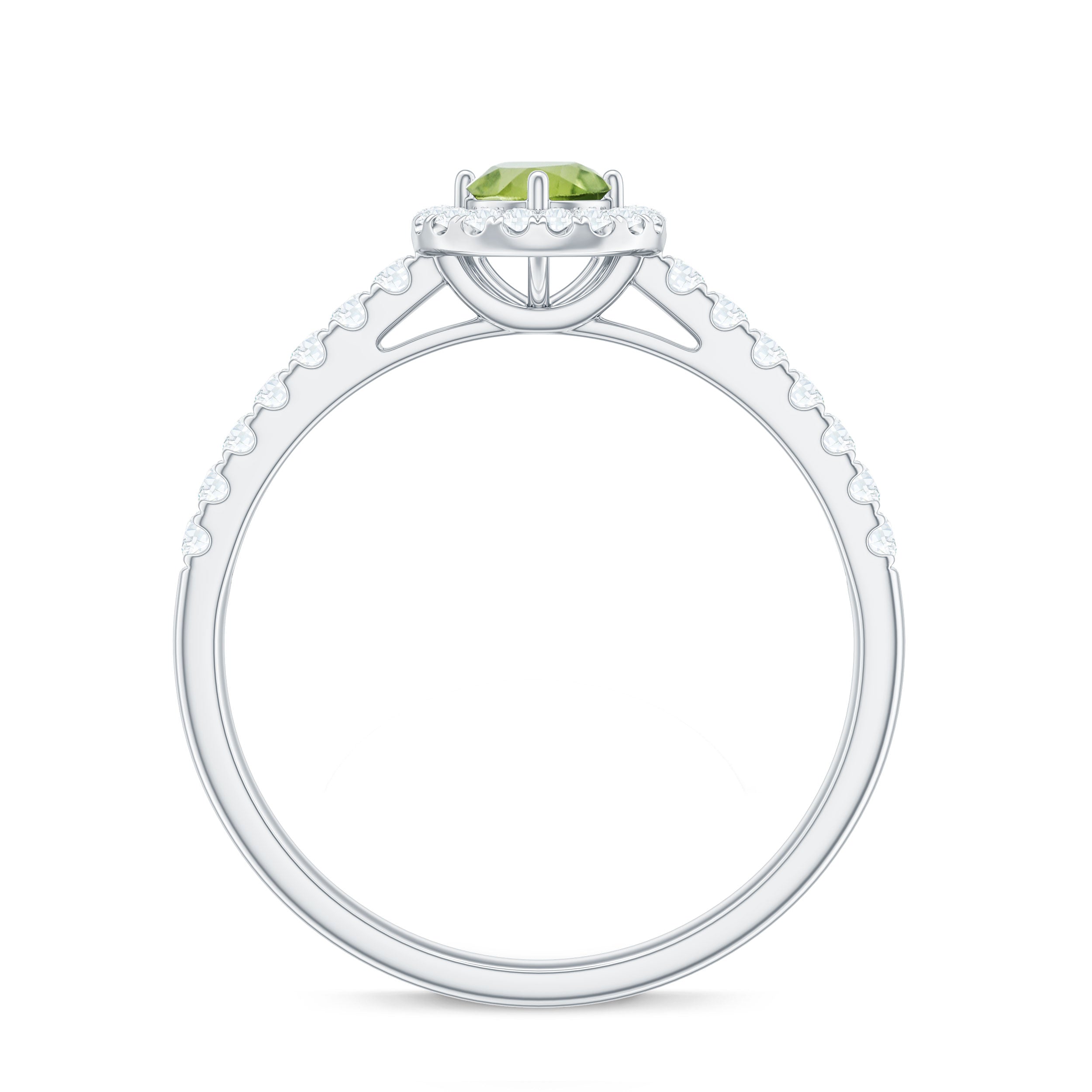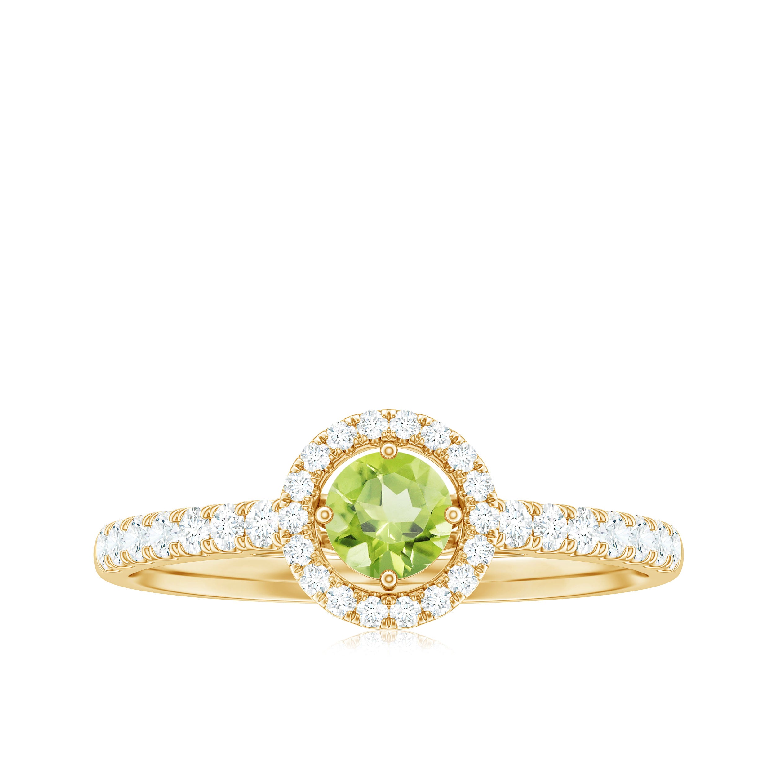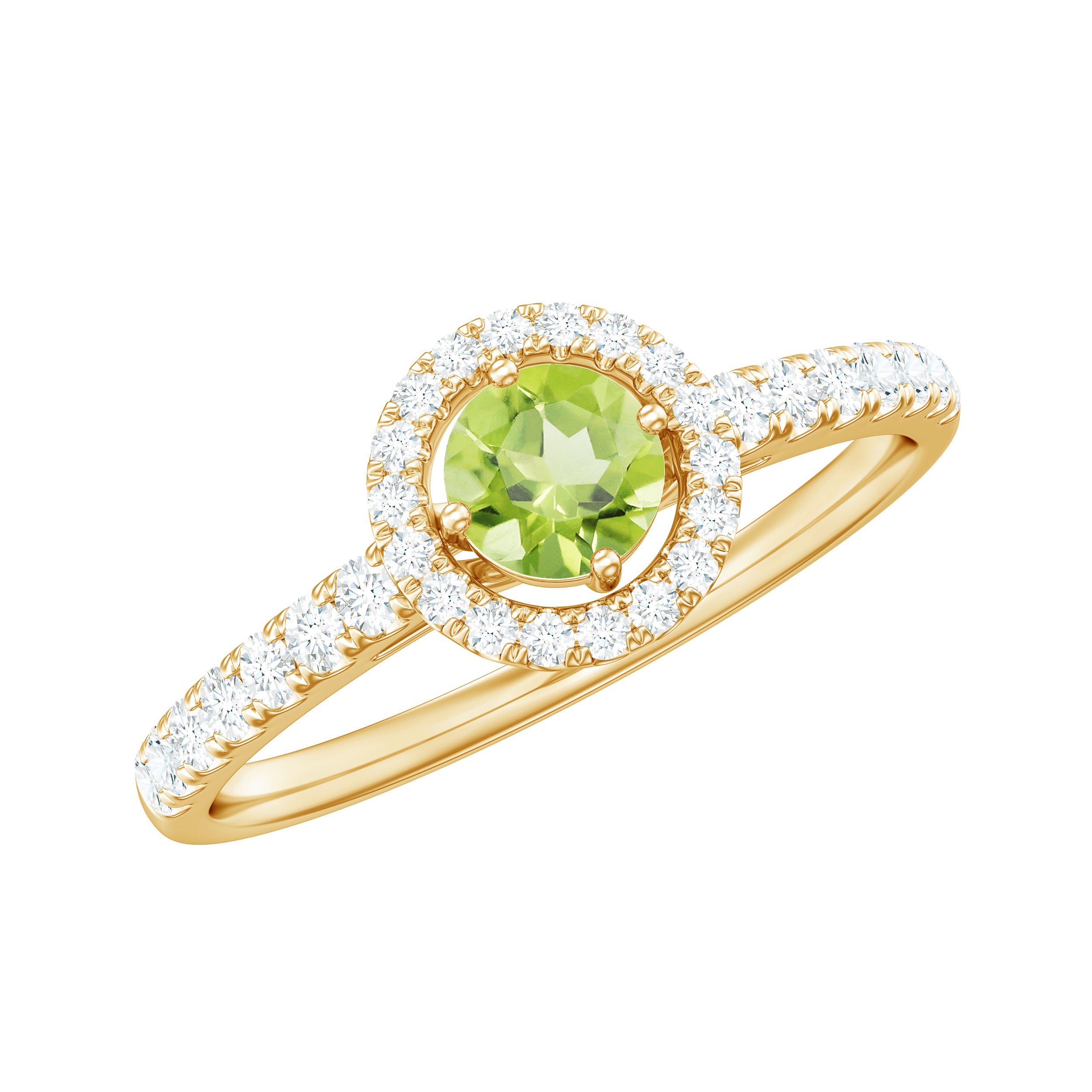When the Centerpiece of Peridot is encircled with a shimmering row of Diamond/Moissanite (i.e., the Halo), it is termed a Peridot Halo Ring. Offering a unique touch to the otherwise classic Peridot Solitaire Ring, it highlights the center stone by making it appear bigger than its size. For those who are on the lookout for a Peridot and Diamond Ring, this Halo-style ring might end your hunt.
