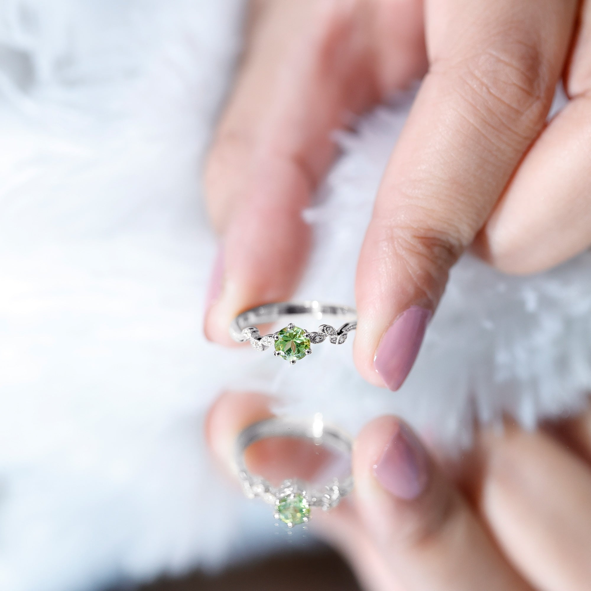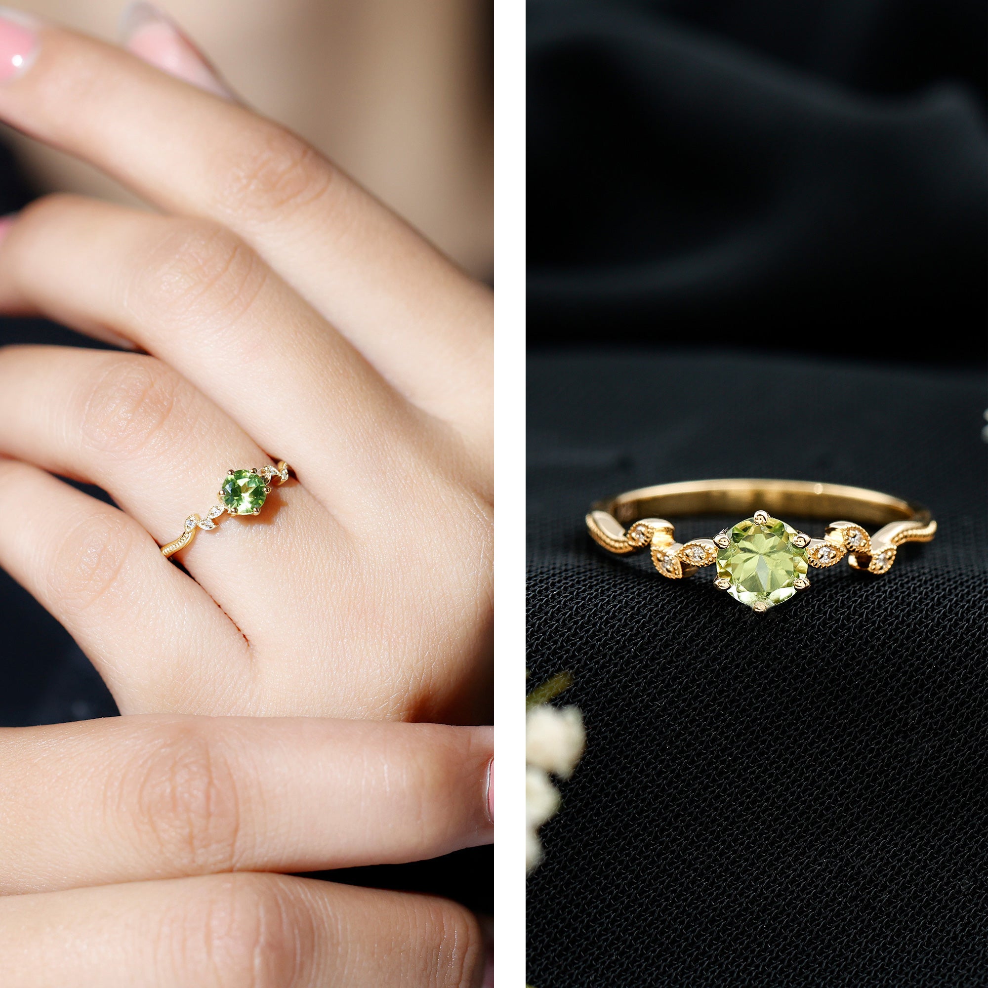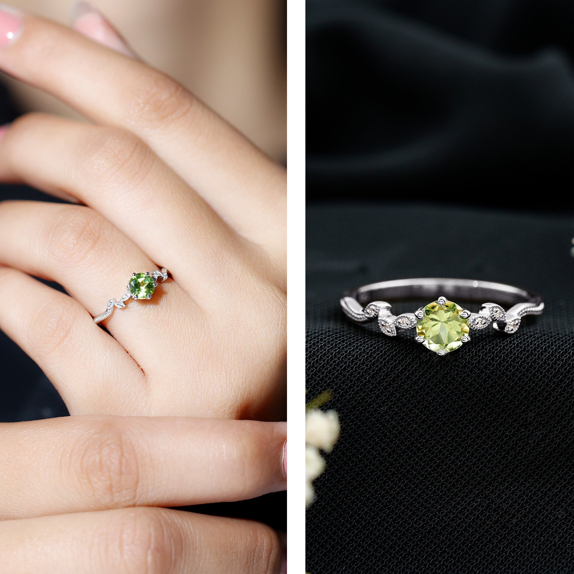 We only use 100% Natural Peridots, our peridots showcase a fascinating green hue and exceptional brilliance. You can choose from a wide range of ring styles like peridot solitaire rings, vintage peridot rings, and more for yourself or a loved one.