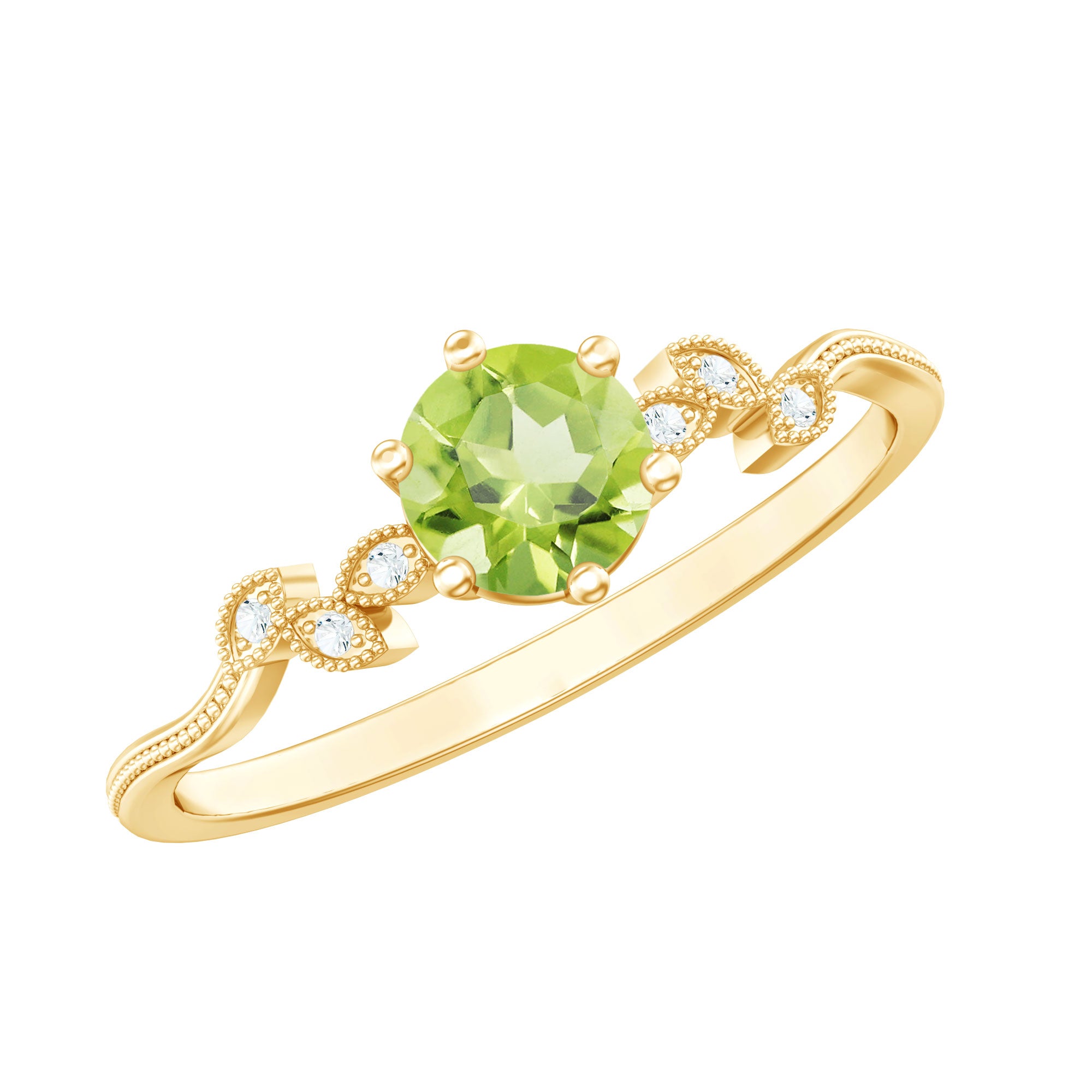 Held in high regard as one of the most classic Peridot Engagement Rings out there, it is characterized by a solo centerpiece of Peridot that steals the limelight. It can also be labeled as the most versatile ring style since the Peridot Solitaire offers you a sea of options in terms of aesthetics, be it the classic Round Peridot Rings offering a traditional aesthetic, the ones fashioned with Pear, Marquise, and Princess exuding an unconventional touch, or Asscher and Emerald Cut Peridot Rings for that perfect vintage vibe.