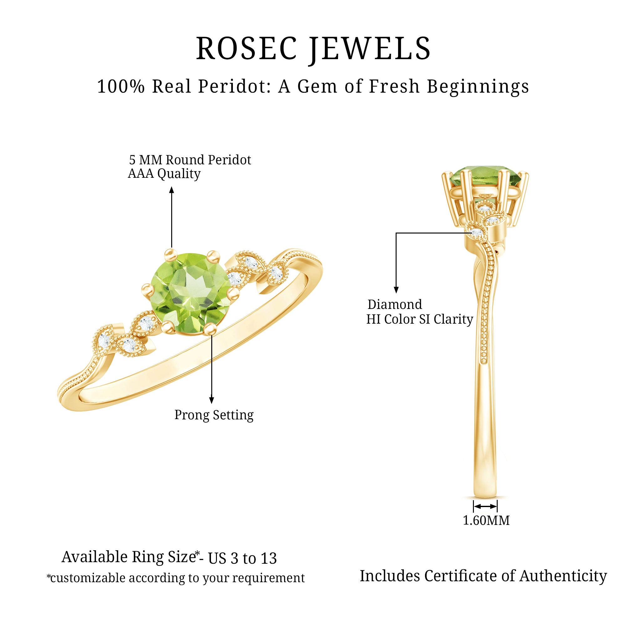 The tone of Gold: Under our collection, you’ll come across Peridot Birthstone Rings crafted in three tones of Gold: