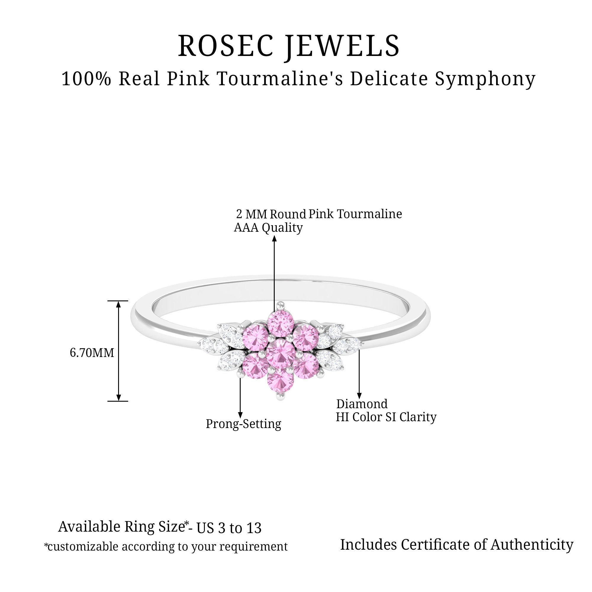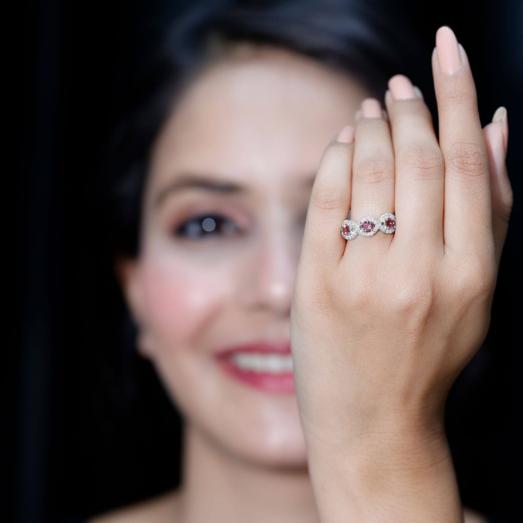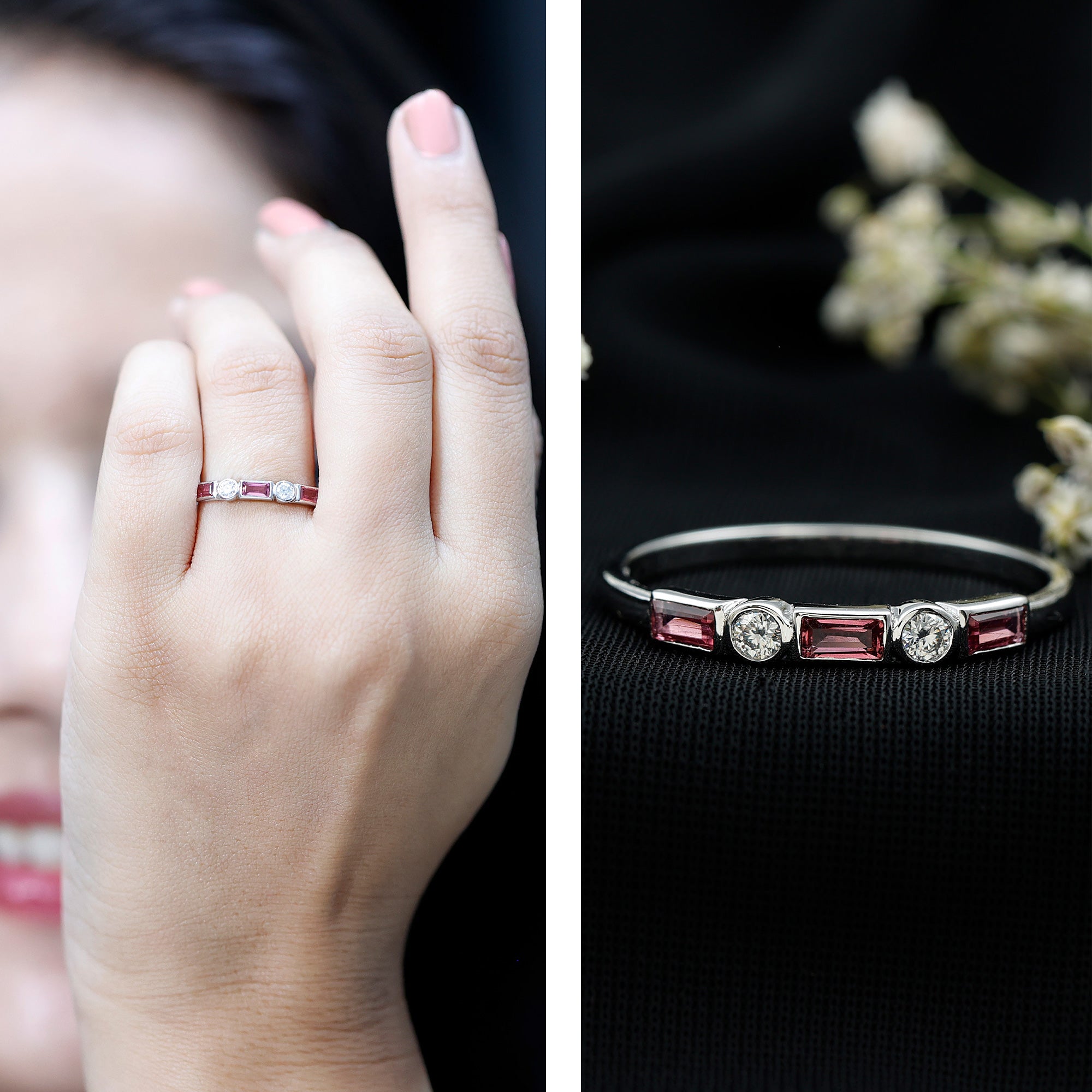 Unlike its specific symbolism, a Pink Tourmaline Promise Ring isn’t defined by a set style. It could be a Classic Pink Tourmaline Solitaire Ring that is relatively understated thanks to its dainty size of 4 MM. Or to lend a decorative visual appeal, it could be accentuated with side-stones of Diamond/Moissanite, floral or nature-inspired detailing, or even meaningful infinity motifs.