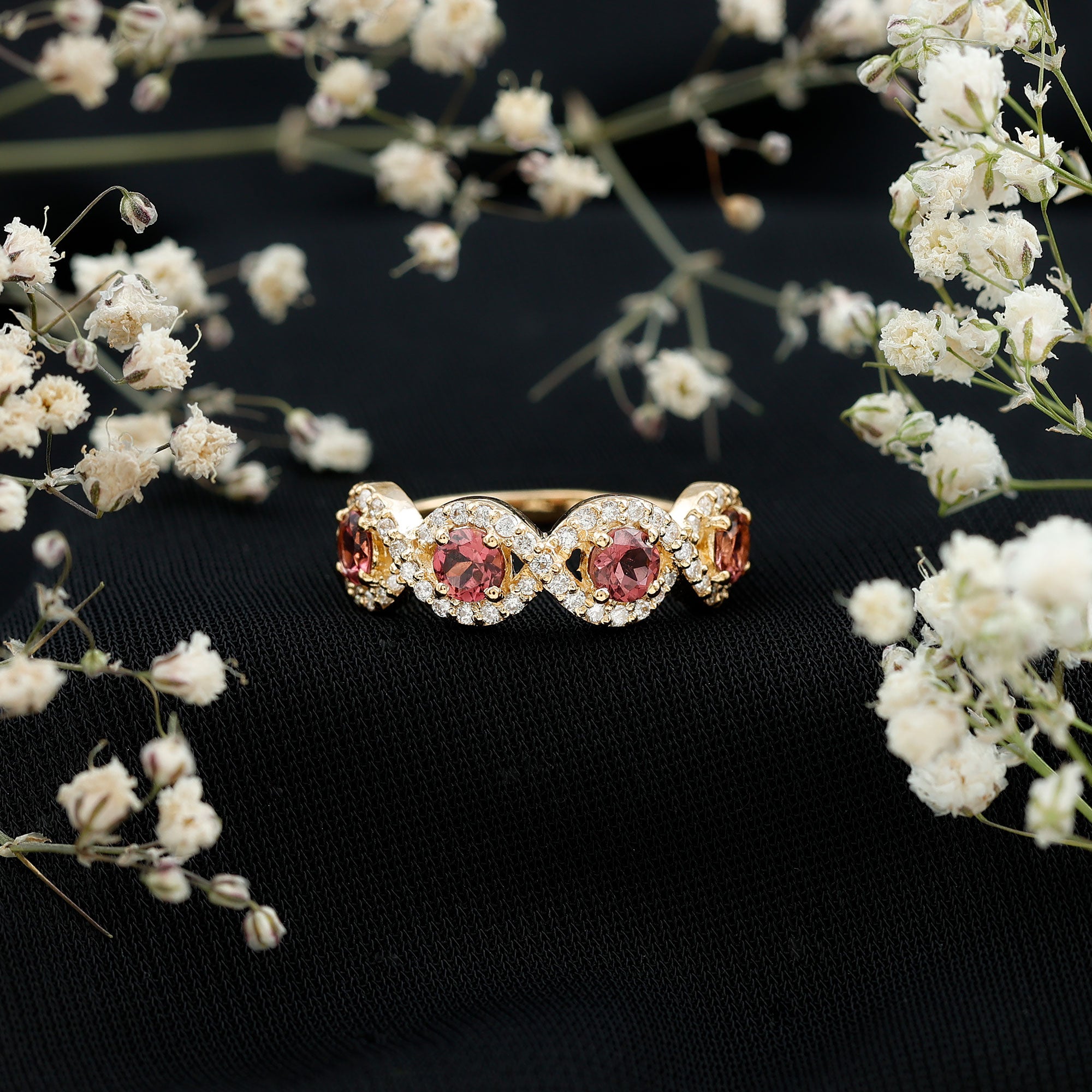 Similar to the eternity, a Pink Tourmaline Wedding Ring is adorned with identical-looking stones of Pink Tourmaline in an endless pattern. But the distinctive part is that thanks to the many styles it comes in, you’re facilitated with a world of options. It ranges from a Simple Pink Tourmaline Band Ring to ones decorated with Floating Halo, Vintage Detailings, or even a triple-row Pink Tourmaline Gold Ring.
