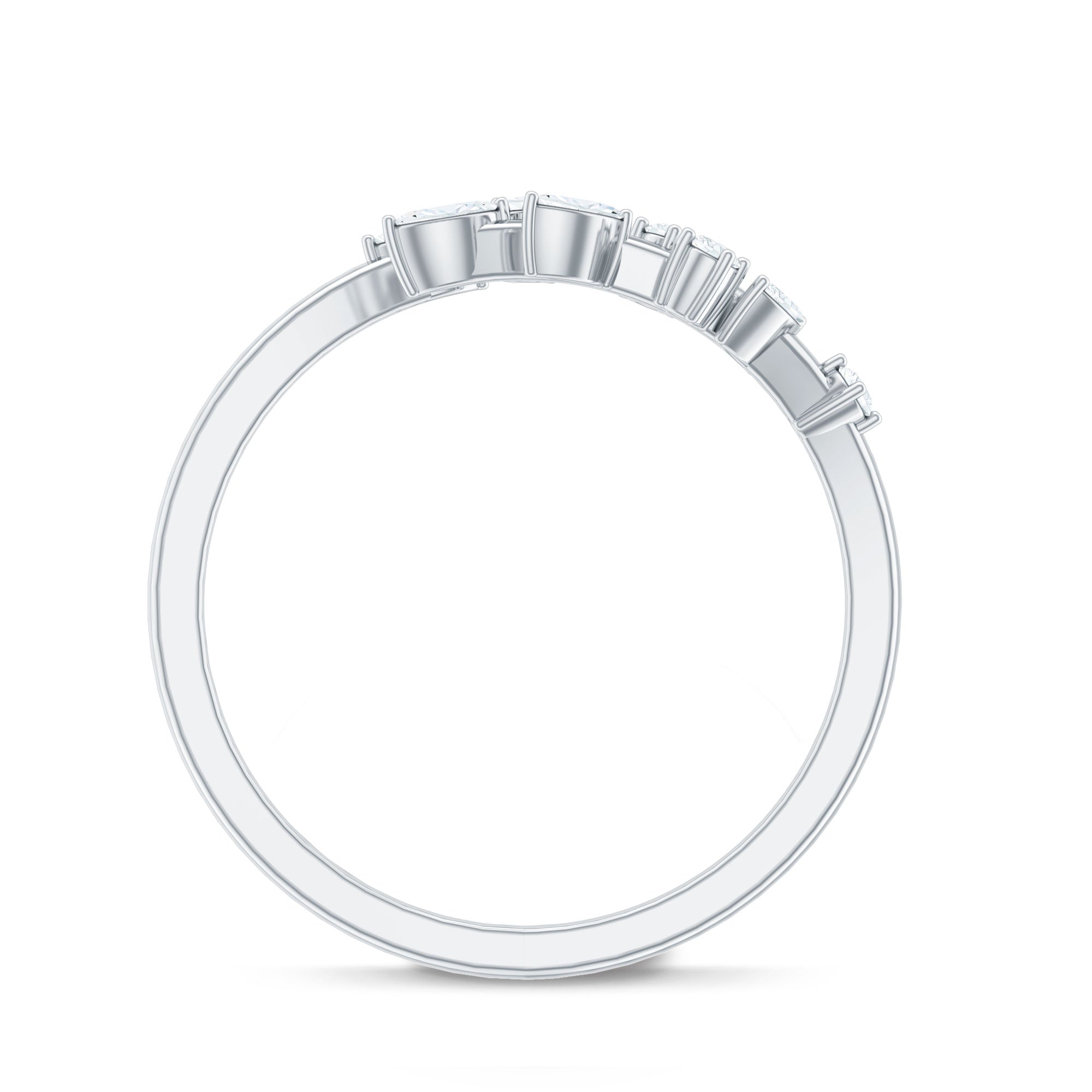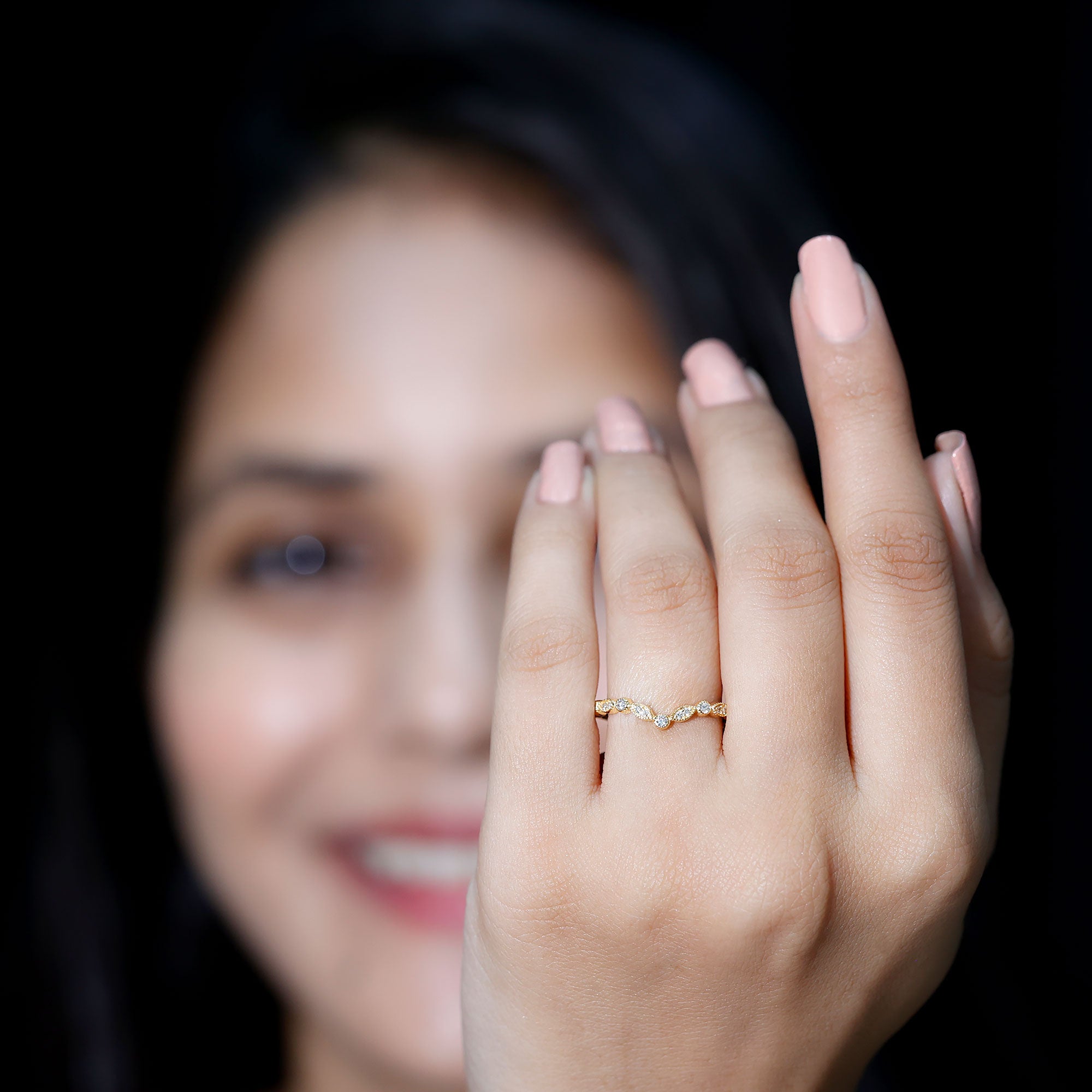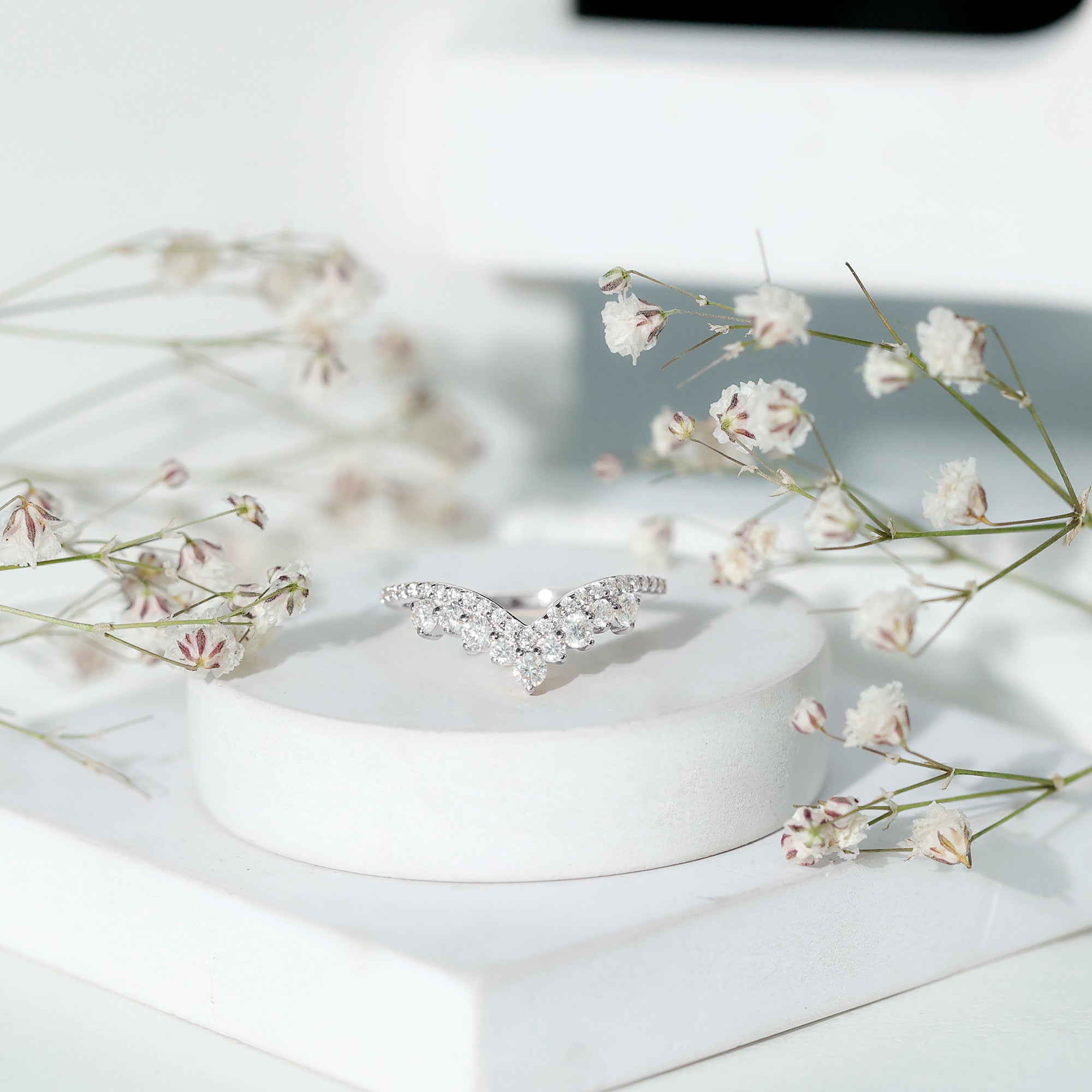 These V-shaped enhancers, commonly called wishbone rings, are designed with a stylish dip that fits around the center stone of other rings perfectly. Modern brides who love bold, stackable looks are choosing chevron moissanite ring enhancers.